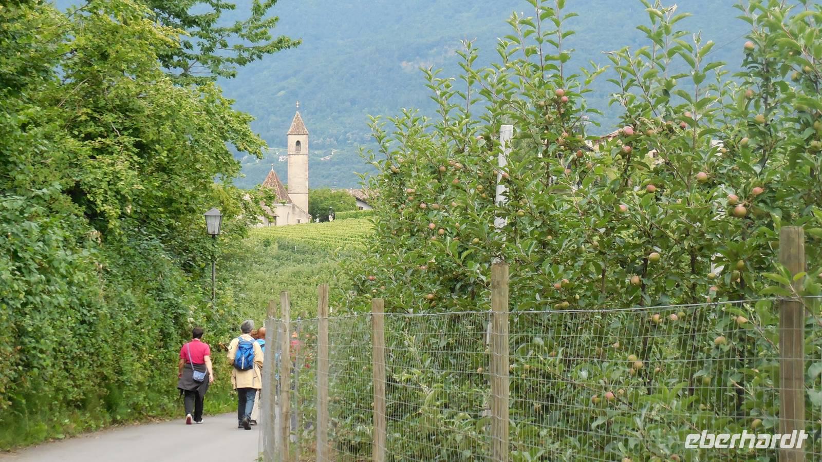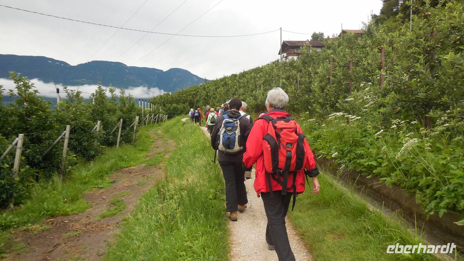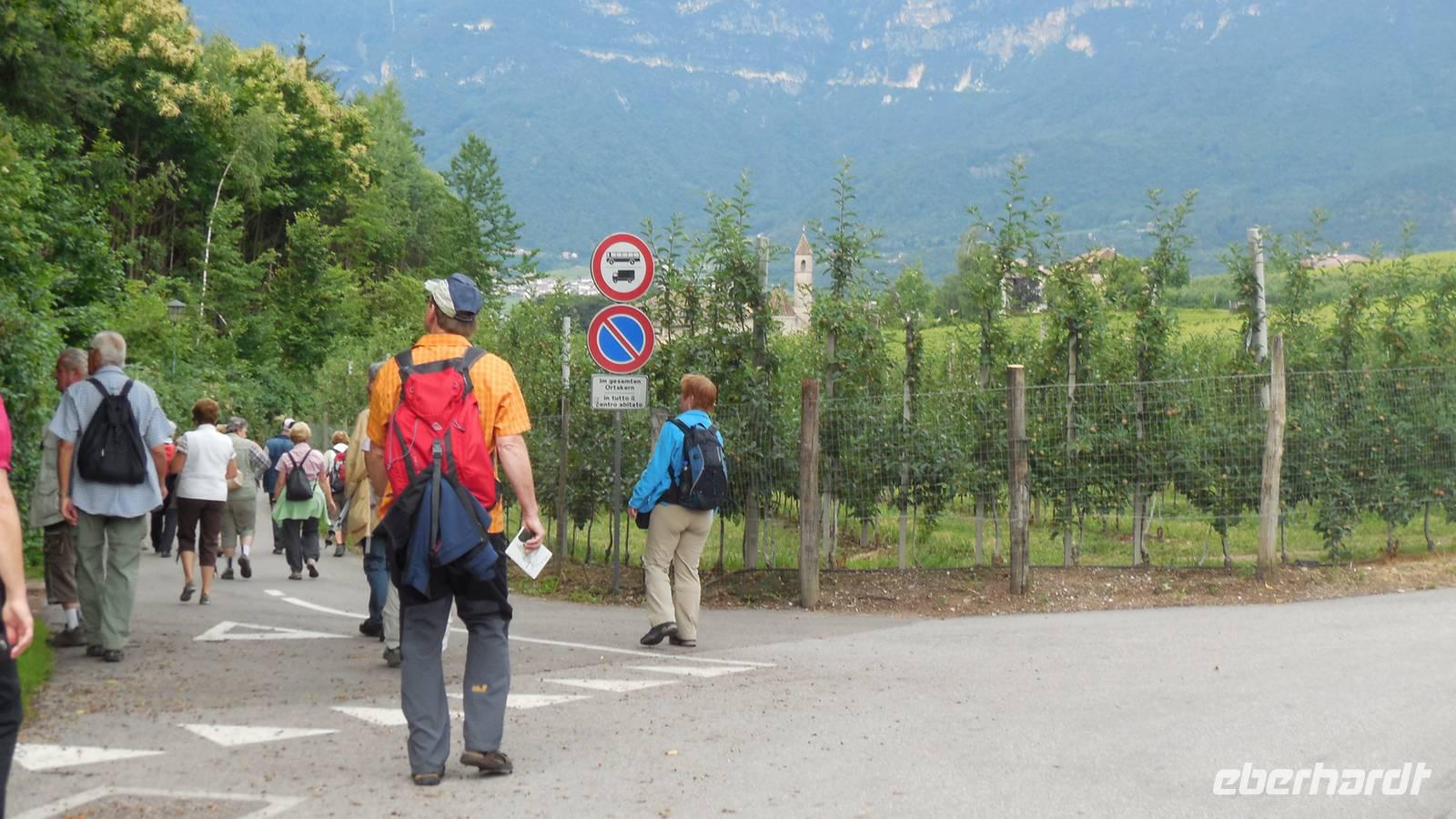 Zum ersten Wandertag fuhr uns Frank ins nahgelegene Örtchen Töll, von dem aus unsere heutige Tour startete. Der einfache und größtenteils flache Marlinger Waalweg war genau richtig als Auftakt für diese Woche. Durch die eindrucksvollen Apfelplantagen wanderten wir durch Wiesen und Weinberge bis nach Lana. Zwischendurch legten wir die eine oder andere Pause ein, bei der sich jeder etwas stärken und die Aussicht genießen konnte. Unser Ziel war Niederlana und die Besichtigung des berühmten Schnatterpeck-Flügelaltars. Der hiesige Kirchenführer Sepp erklärte uns ein paar wichtige Dinge zum Altar und wir konnten den beeindruckenden Flügel-Altar auf uns wirken lassen. Anschließend erwartete uns Frank an der Kirche, um uns zurück ins Hotel zu bringen. Den restlichen Nachmittag konnte jeder individuell verbringen. Am Abend erwartete uns wieder ein schmackhaftes Abendessen.