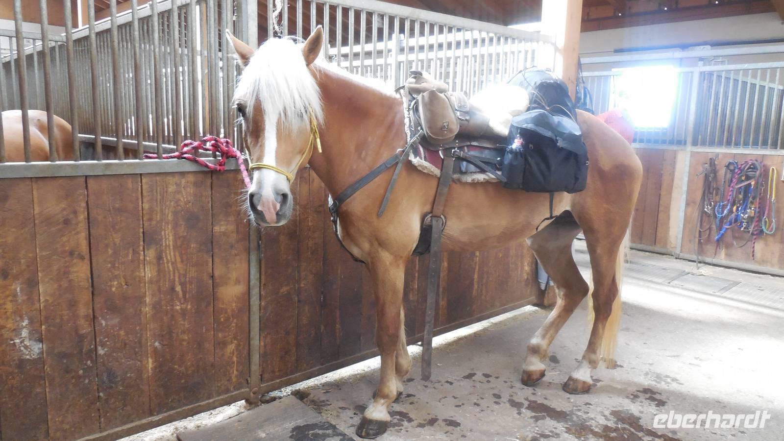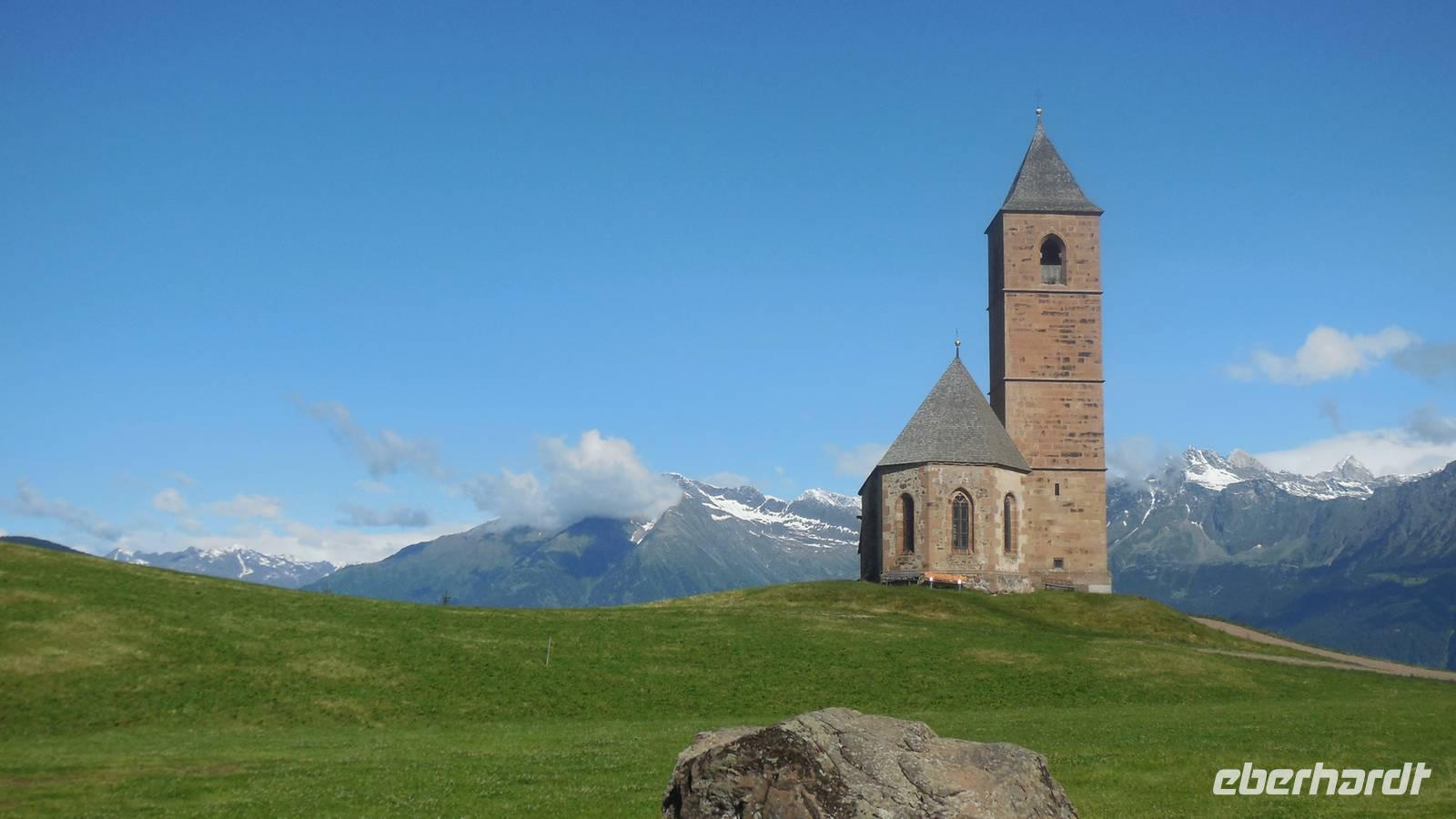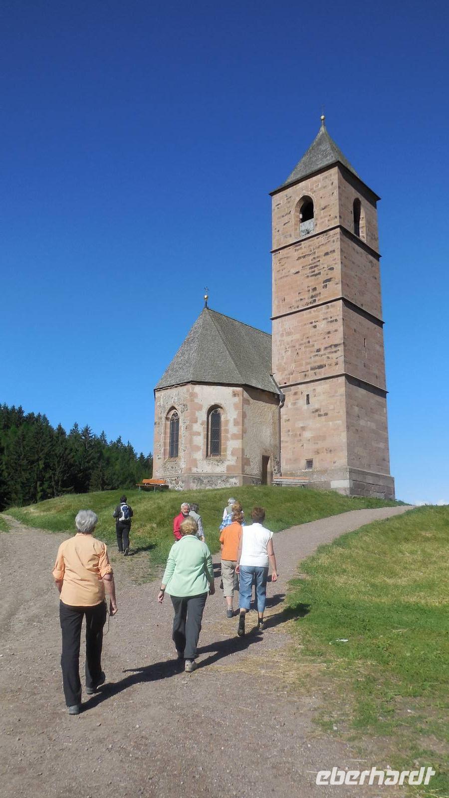 Von den Sonnenstrahlen wachgekitzelt, freuten wir uns heute auf die Wanderung ins Haflinger Gebiet. Toni düste gut gelaunt mit seiner Vespa um die Ecke und schon konnte es losgehen. Frank fuhr uns erst einmal nach Hafling. Dort besichtigten wir die hübsche Kirche zu St. Kathrein. Zusammen mit dem blauen Himmel und dem Bergpanorama ein tolles Motiv für ein Gruppenfoto. Natürlich durften auch die interessanten Erklärungen von Toni zur Geschichte nicht fehlen. Gleich wenige Meter daneben, gingen wir noch in den Stall um die Haflinger Pferde zu begutachten. Anschließend ging es weiter nach Vöran, wo unsere heutige Wanderung startete.Am Gasthof Alpenrose liefen wir erst einmal steil bergan und dann ein ganzes Weilchen durch den schönen Wald, bevor wir zum „Knottnkino" auf dem Rottenstein kamen. Dieser Porphyrfels der mit richtigen Kinosesseln ausgerüstet ist, bot uns einen atemberaubenden Blick auf das Burggrafenamt. Dann wanderten wir wieder bergan um dann wieder zur Leadneralm aufzusteigen. Dort verweilten wir einige Zeit um wieder die tiroler Spezialitäten zu genießen und uns etwas auszuruhen. Nach der Rast führte der Weg wieder abwärts zum Sattel und bevor wir unser Ziel, den Gasthof Grüner Baum, erreichten, verkosteten wir noch einen italienischen Grappa und stießen auf einen gelungenen Tag an. Am Abend wurden wir wieder vom Hotelteam verwöhnt.