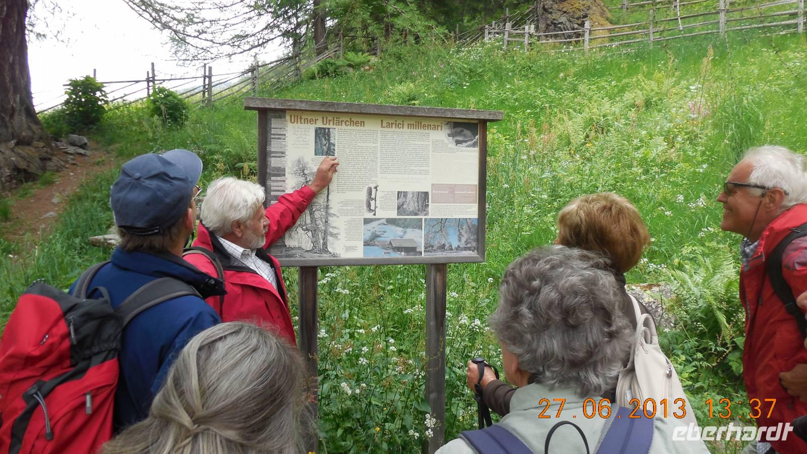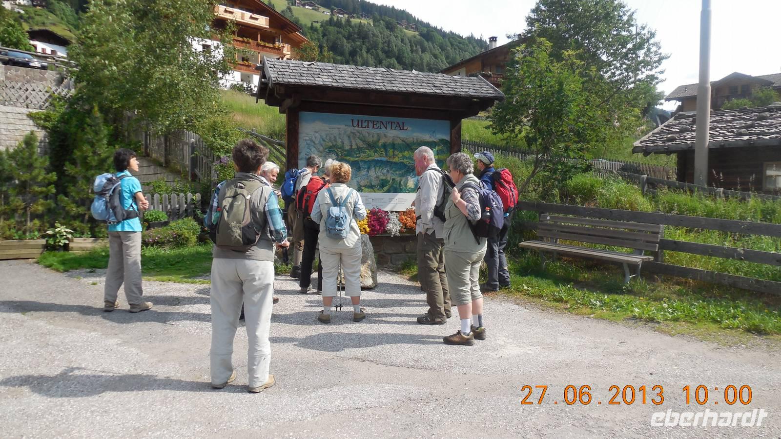 Die heutige Wanderung führte uns in das beschauliche Ultental. Frank chauffierte uns nach St. Nikolaus, von wo aus der Ultener Höfeweg beginnt. Auf dem Weg dahin versüßte Toni uns die Zeit mit einigen Informationen zu Land & Leuten, vor allem deren Sprache und Traditionen. Kaum hatten wir es uns versehen, waren wir auch schon angekommen. Der erste Teil war ein steiler Aufstieg an der kleinen Kirche vorbei auf den Ultener Höfeweg. Dieser ging größtenteils eben dahin und führte uns an den urigen ultenern Bauernhäusern vorbei. Zwischendurch legten wir auf einer grünen Wiese am Waldrand ein kleines Päuschen ein und freuten uns, dass uns das Wetter hold blieb. Dann ging es gut gelaunt weiter und wir kamen in St. Gertraud an. Dort überreichte mir Toni einen selbstgebastelten Blumenkranz, auch zur Freude meiner Reisegäste und der übrigen Touristen im Ultental. In der Lärchenschenke, die direkt an den Ur-Lärchen liegt, kehrten wir ein und genossen wieder ein tiroler Süppchen oder einen Heidelbeerstrudel. Nun ging der restliche Wanderweg leicht von der Hand und wir waren wieder in St. Nikolaus angekommen. Dort holte uns Frank wieder ab und wir konnten auf der Rückfahrt ins Hotel bei einem Kaffee oder Cappuchino entspannen. Den Abend ließen wir wieder bei einem leckeren Menü ausklingen.