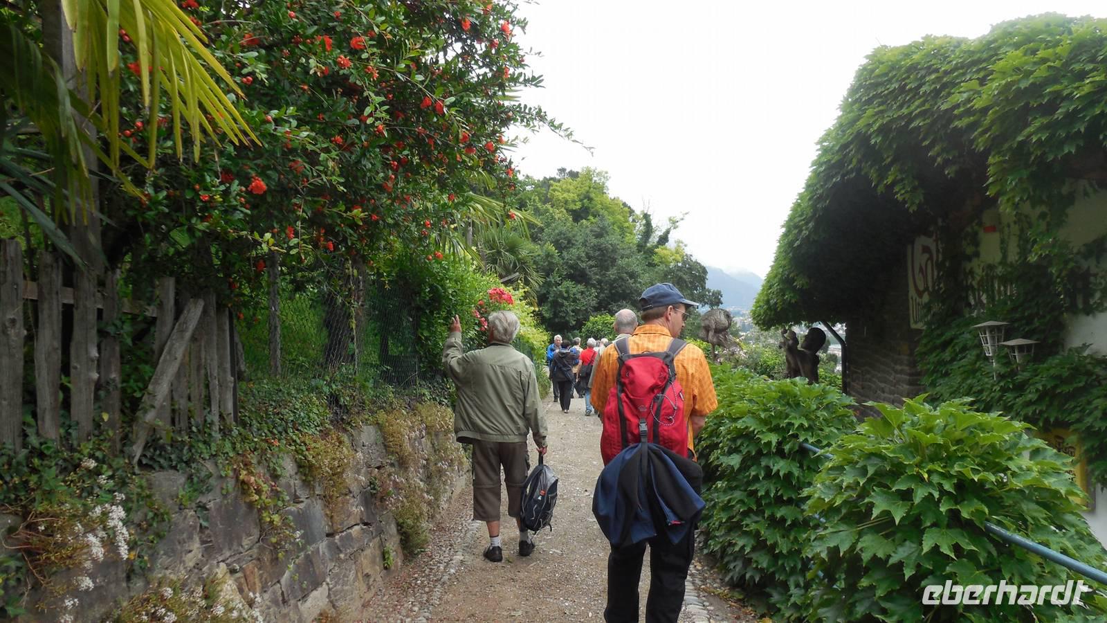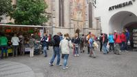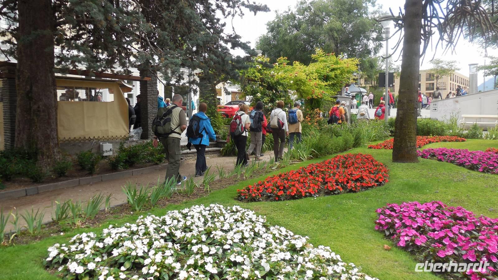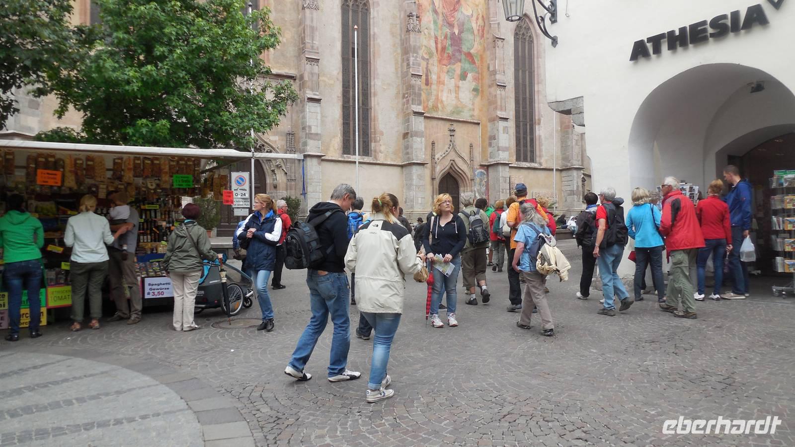 Den letzten gemeinsamen Wandertag mit Toni ließen wir gemütlich angehen und frühstückten erst einmal in aller Ruhe. Als Toni dann, gut gelaunt wie immer, im Hotel ankam, ging es auch schon los. Der Weg war nicht weit, denn als erstes wollten wir den Meraner Wochenmarkt besuchen, der immer freitags stattfindet. Jeder konnte individuell für sich über den Markt schlendern oder das Treiben aus sicherer Entfernung beobachten. Anschließend fuhr uns Frank nur wenige Kilometer weiter zur Laurinstraße, dem Ausgangspunkt unseres heutigen längeren Spazierganges. Nachdem wir die Anhöhe überwunden hatten, ging der Tappeiner-Wanderweg eben dahin. Links und rechts konnten wir interessante Gewächse begutachten und deren Früchte verkosten. Vom Tappeinerweg liefen wir der Gilf-Promenande und anschließend der Sommerpromenade entlang. Kaum hatten wir uns es versehen, waren wir auch schon wieder im Zentrum der Kurstadt Meran angekommen. Traditionell kehrten wir alle gemeinsam im Forst-Brauhaus ein um uns für den kleinen Stadtrundgang mit Toni zu stärken. In der Kirche St. Barbara erklärte uns Toni dann Wissenswertes zur Religion in Südtirol und beantwortete unsere Fragen. Wir bummelten noch durch die beschaulichen Gassen und anschließend hatte jeder für sich Zeit die Stadt auf eigene Faust zu erkunden. Doch zuvor verabschiedeten wir uns von unserem Toni, der uns alle zur Zufriedenheit „sein Land" gezeigt hat - und ich glaube einige werden nicht das letzte Mal in Südtirol gewesen sein. Bei Tiroler Schinken und Wein ließen wir diesen schönen Tag noch einmal Revue passieren.