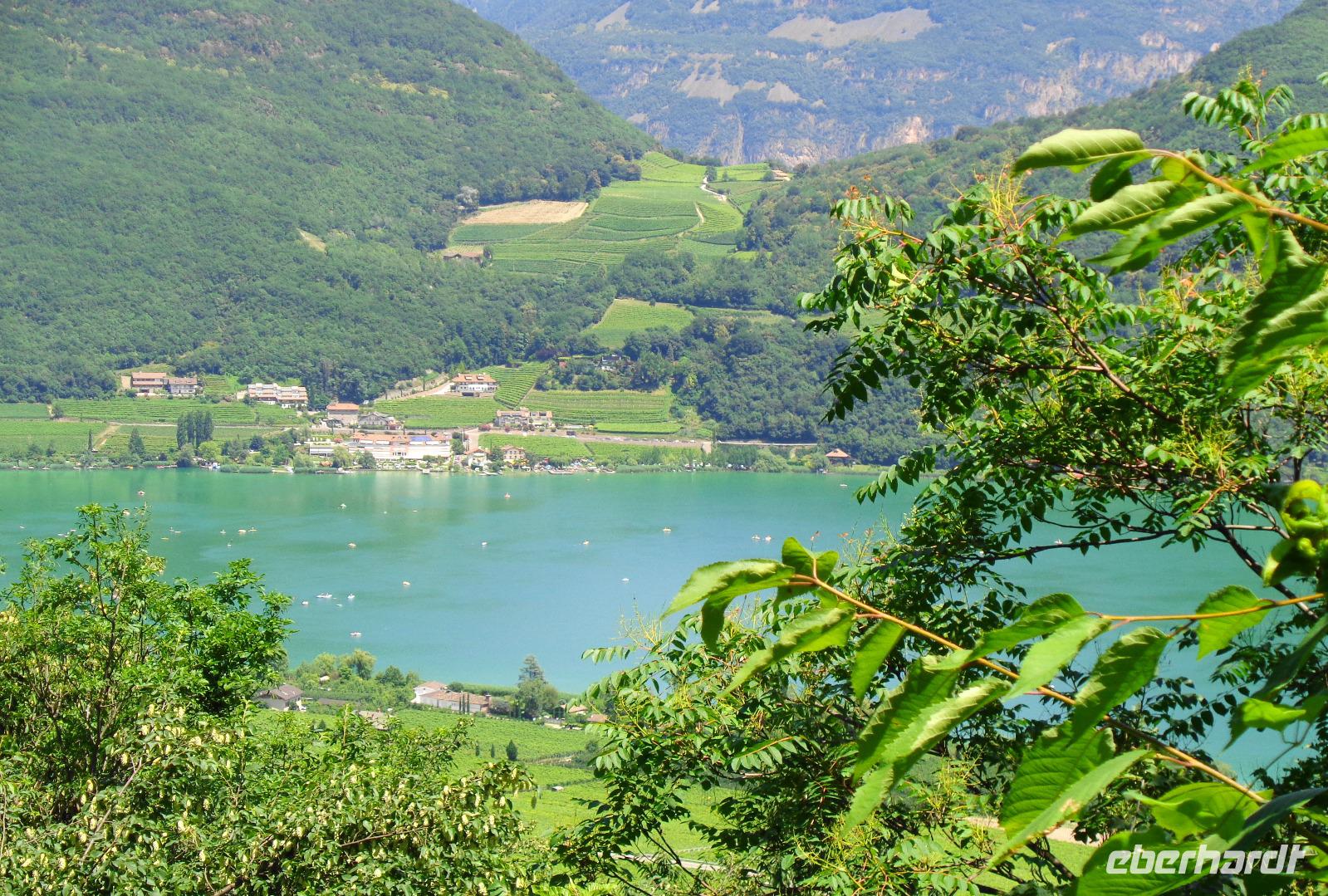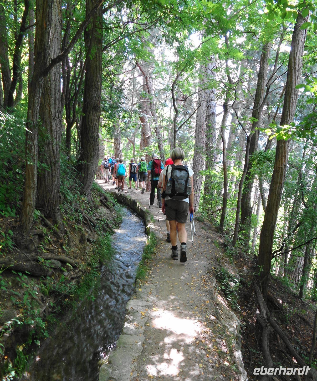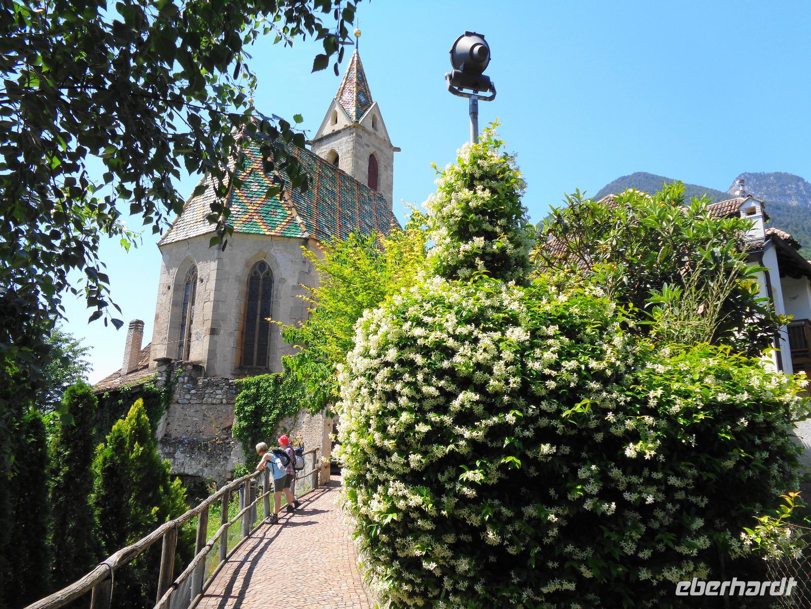 Erwartungsvoll machten wir uns heute auf zu unserer ersten Wanderung. Bei herrlichem Wetter starteten wir oberhalb von Kaltern auf dem Friedensweg in Richtung Altenburg. Auf angenehm schattigen Waldwegen erreichten wir das erste Highlight des Tages, die wildromantische Rastenbachklamm. Mit ihren Wasserfällen, den efeubewachsenen Bäumen und umgestürzten, verwitternden Stämmen ist sie ein beeindruckendes Naturdenkmal. Manche Passagen auf dem steinigen, zum Teil steilen Weg waren durchaus eine Herausforderung für die Trittsicherheit der Teilnehmer. In Altenburg, der höchstgelegenen Fraktion von Kaltern, genehmigten wir uns auf 612 m Höhe ein schmackhaftes Mittagsmahl auf der schattigen Terrasse des Gasthofs Sonnegghof. Bevor wir uns endgültig auf den Rückweg machten, statteten wir noch der kleinen gotischen Kirche St. Vigilius mit ihrem schönen Flügelaltar einen Besuch ab. Der Rückweg führte uns über den Nusstalweg, der uns immer wieder herrliche Ausblicke auf den Kalterer See bot, bis nach St. Josef am Kalterer See. In einem der Cafés am See genehmigen wir uns noch die ein oder andere kühle Erfrischung, bevor uns unser Bus zurück zum Hotel brachte.