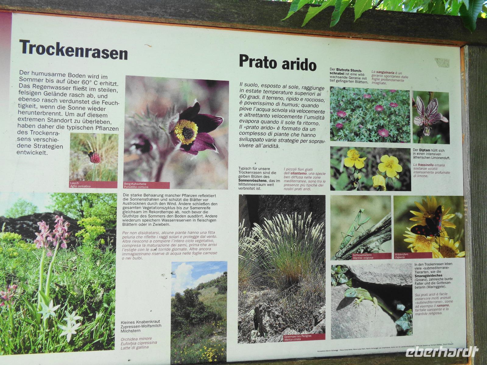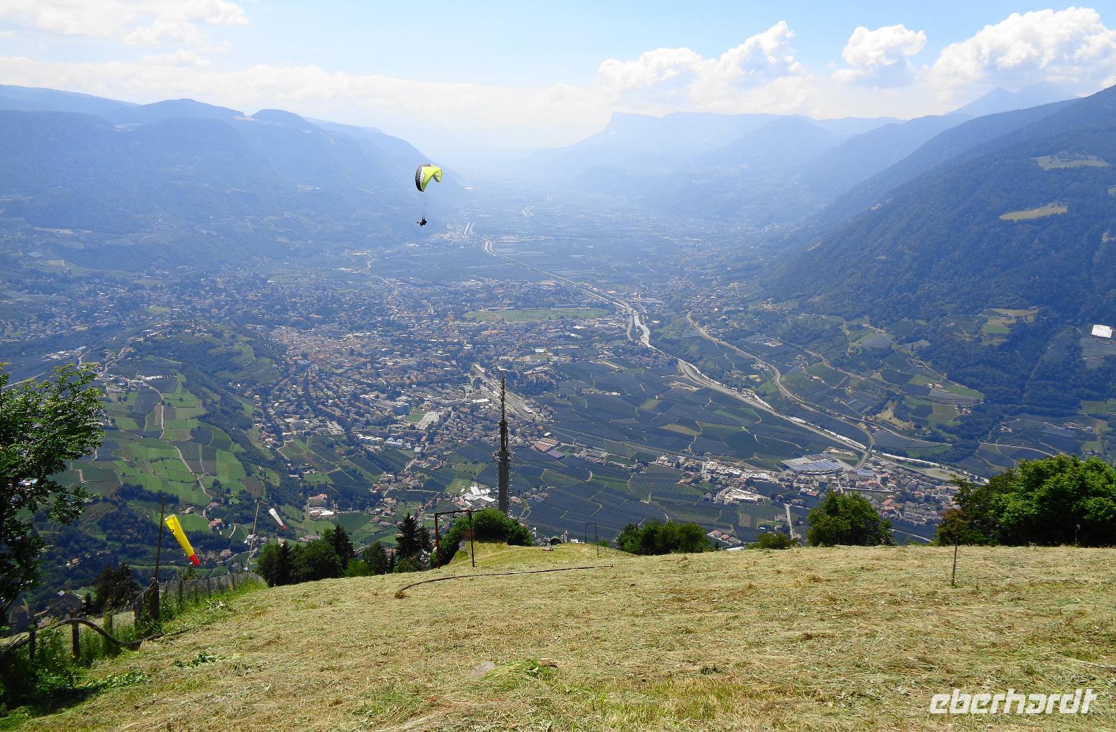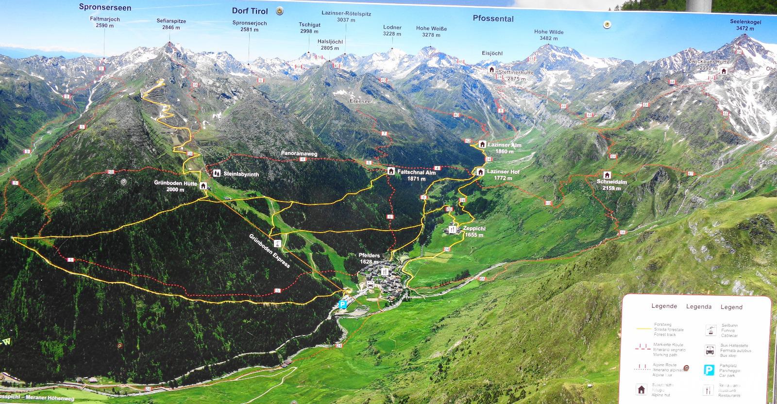 Da wir heute keinen Bus zur Verfügung hatten, starteten wir von unserem Hotel aus mit dem Linienbus ins Zentrum von Meran. Mit dem Sessellift fuhren wir weiter von Meran nach Dorf Tirol und wieder mit dem Linienbus zur Talstation der Seilbahn Hochmuth. An der Bergstation ließen wir den traumhaften Fernblick nach Süden auf Meran und weiter in Richtung Bozen auf uns wirken.