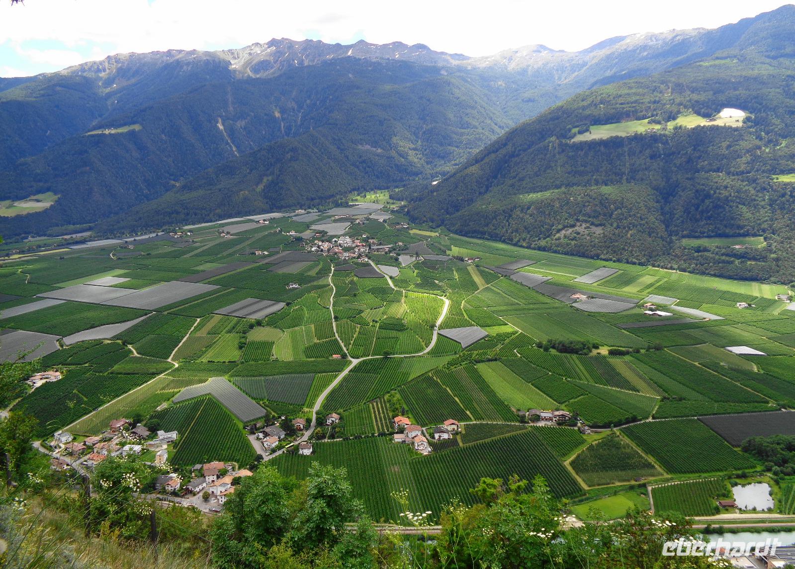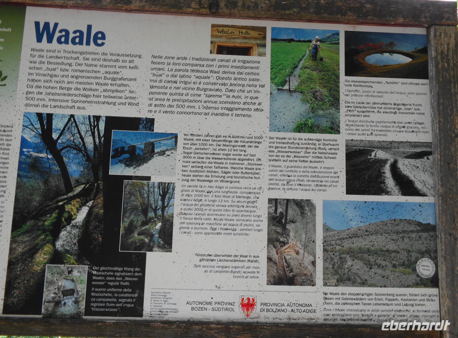 Unser Weg führte uns heute in den Vinschgau. In Kastelbell starteten wir auf dem Schnalser Waalweg in Richtung Schloss Juval. Vom Weg aus boten sich uns immer wieder herrliche Ausblicke ins Etschtal und auf die gegenüberliegenden Berge. Das uralte Bewässerungssystem der Waale prägt die ganze westliche Landeshälfte Südtirols. Sie wurden schon im 13. Jhdt. Von den Bauern zur Bewässerung im Obst- und Weinbau angelegt. Heute erfreuen sich die Waalwege großer Beliebtheit als Wanderwege. Hier wird auch Wasser vom Schnalstaler Gletscher abgeleitet und über den Schnalser Waal für die Landwirtschaft nutzbar gemacht. Noch heute melden die „Waalschellen" dem Waaler, wenn der Wasserfluss unterbrochen ist. Die Mittagspause genossen wir im urigen Schlosswirt von Juval, dessen Verpächter Reinhold Messner ist, bei typischer Südtiroler Hausmannskost.