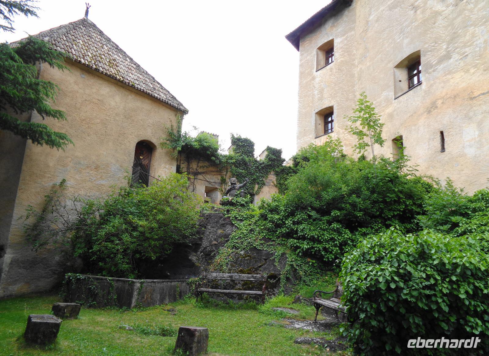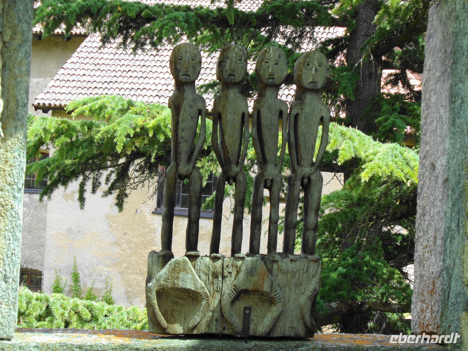 Gut gestärkt ging es nach der Pause hinauf zum Schloss Juval. Einige Gäste ließen sich einen Besuch des MMM (Messner Mountain Museum) nicht nehmen. Das MMM Juval, im gleichnamigen Privatschloss Reinhold Messners untergebracht, ist dem Mythos Berg gewidmet. Hier konnten wir unter fachkundiger Führung eine bunte Mischung an persönlichen Erinnerungsstücken und Besitztümern des berühmten Extrembergsteigers bewundern. Dazu zählen seine umfangreiche Abenteuer-Bibliothek und Tibetika-Sammlung, eine Bildergalerie zu den heiligen Bergen der Welt, die Maskensammlung aus fünf Kontinenten und sein Expeditionskeller. Gemeinsam machten wir uns anschließend auf den wegen der vielen Höhenmeter anstrengenden Weg zurück ins Tal. Einige Gäste bevorzugten es, den komfortablen Shuttlebus zu nehmen. In Unterstell, im Café mit angeschlossenem Verkaufsladen von Reinhold Messner, trafen beide Gruppen wieder zusammen.