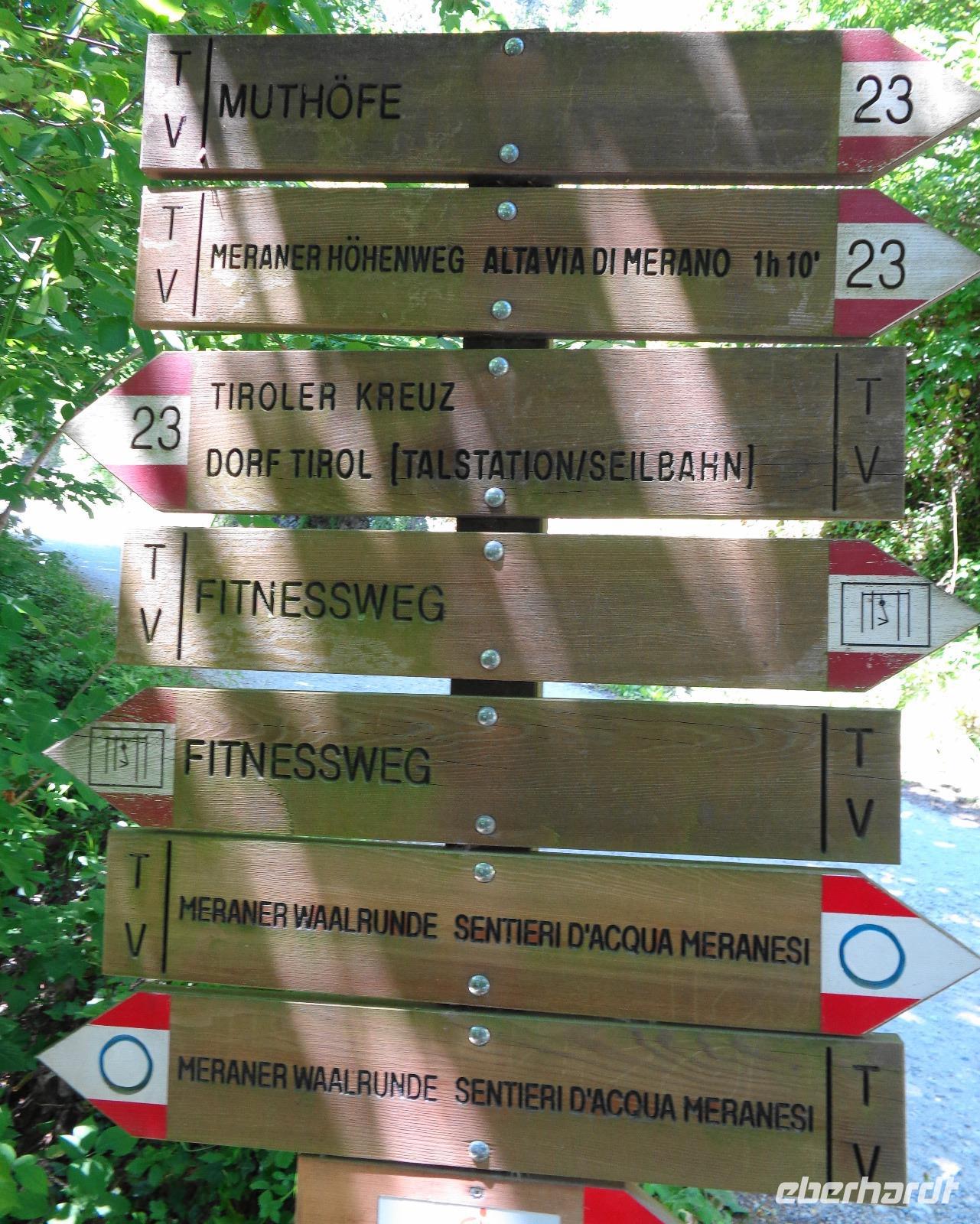 Auch heute teilte sich unsere Gruppe wieder auf: die fittesten Wanderer nahmen mit Kurt den teilweise ausgesetzten und daher etwas anspruchsvollen Hans-Frieden-Felsenweg zur Leiteralm und wanderten anschließend über Vellau nach Dorf Tirol. Der Rest der Gruppe wanderte mit mir über die Muthöfe und das Tiroler Kreuz nach Dorf Tirol, immer das herrliche Panorama im Blick. Leider hatte der Gasthof Tiroler Kreuz Ruhetag und so machten wir uns nach einer kurzen Verschnaufpause wieder auf den Weg. Vorbei an Schloss Auer erreichten wir über den Apfelweg Dorf Tirol, wo wir uns endlich das wohlverdiente verspätete Mittagessen schmecken ließen. Nach einem Besuch der Dorfkirche schlenderten wir über die hübsche Promenade zur Bushaltestelle und fuhren mit dem Linienbus zurück nach Meran.