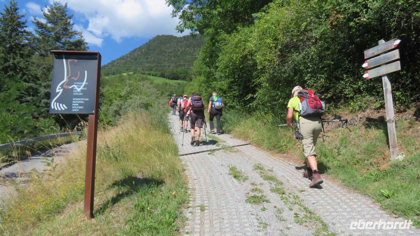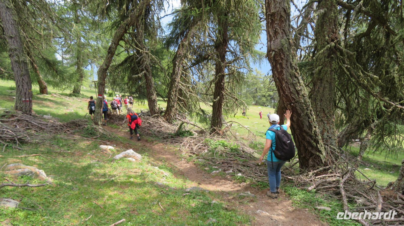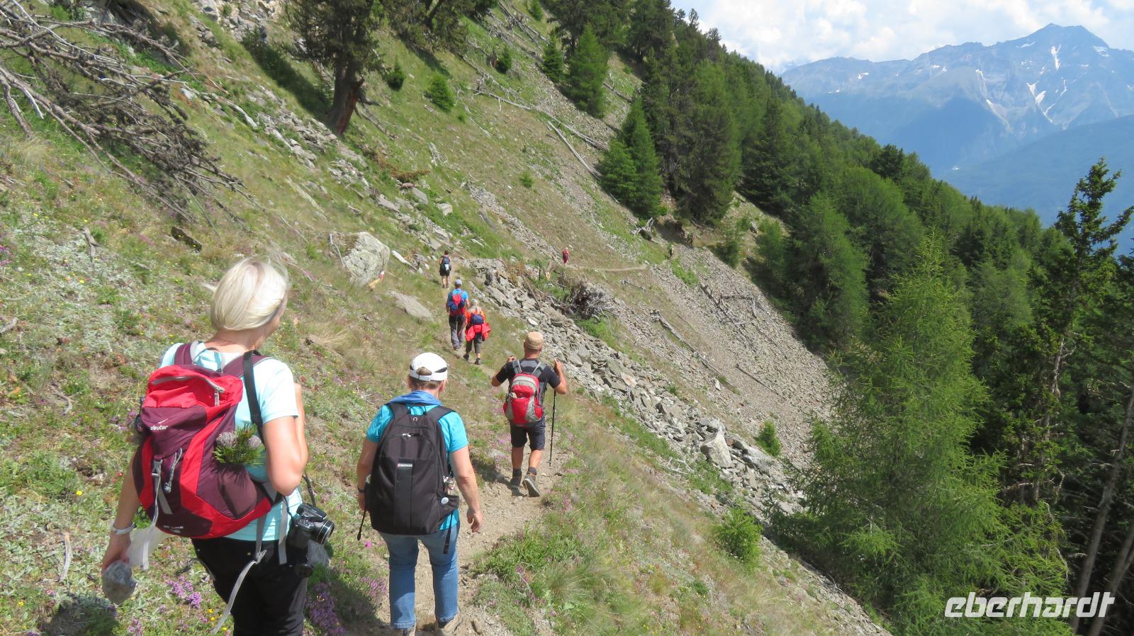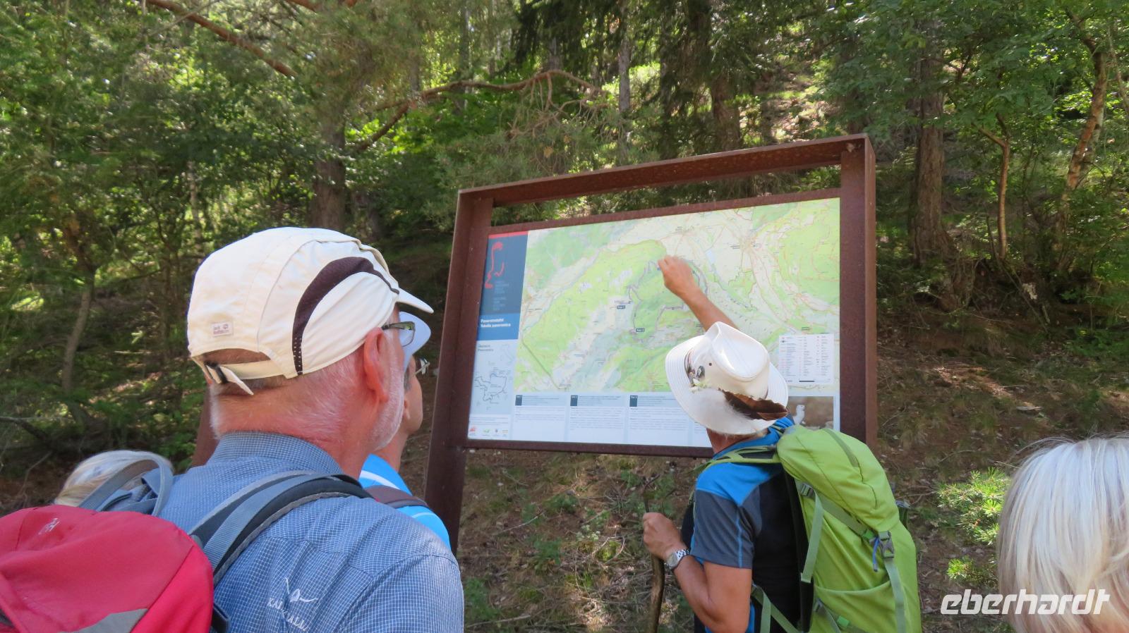Wenn die Sonne lacht, dann lacht auch unser Wanderherz. Gut gelaunt werden wir heute mit dem Bus nach Prad am Stilfserjoch chauffiert. Dort besuchen wir als erstes das Nationalparkhaus aquaprad, in dem uns Walter die einheimische Fischfauna erläutert. Und es gibt auch genügend Exemplare in riesigen Aquarien in live zu bestaunen. Nachdem wir genug Fische gesehen hatten, zieht es uns aber nun wieder hinaus an die frische Luft und in die Berge. Nach dem ersten steileren Anstieg geht es durch den schattigen Wald und wir freuen uns über die frische Brise des Vinschgauer Windes. Bei Temperaturen von 25 Grad und mehr ist das eine richtige Wohltat!