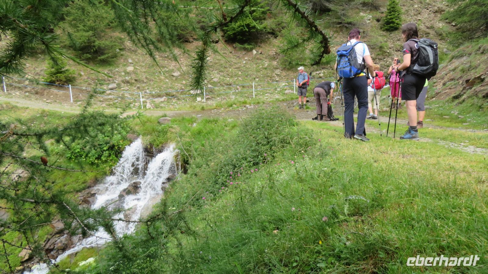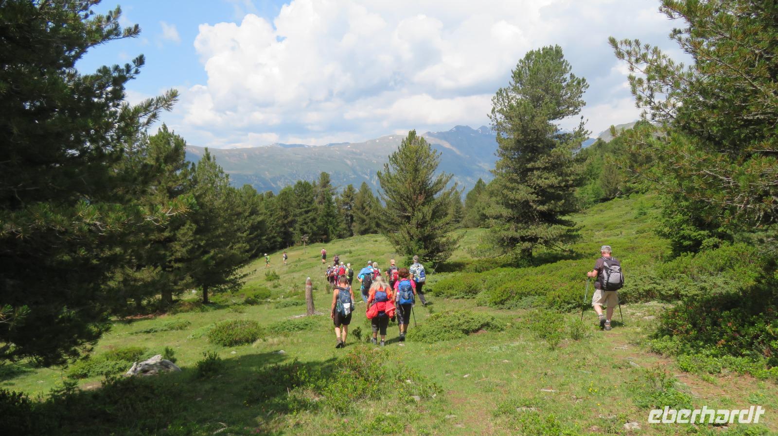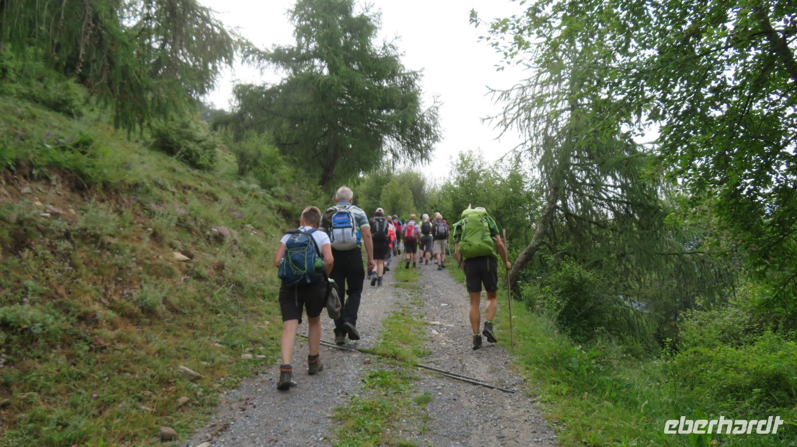 Wenn die Sonne lacht, dann lacht auch unser Wanderherz. Gut gelaunt werden wir heute mit dem Bus nach Prad am Stilfserjoch chauffiert. Dort besuchen wir als erstes das Nationalparkhaus aquaprad, in dem uns Walter die einheimische Fischfauna erläutert. Und es gibt auch genügend Exemplare in riesigen Aquarien in live zu bestaunen. Nachdem wir genug Fische gesehen hatten, zieht es uns aber nun wieder hinaus an die frische Luft und in die Berge. Nach dem ersten steileren Anstieg geht es durch den schattigen Wald und wir freuen uns über die frische Brise des Vinschgauer Windes. Bei Temperaturen von 25 Grad und mehr ist das eine richtige Wohltat!