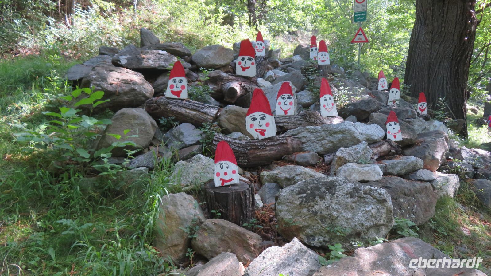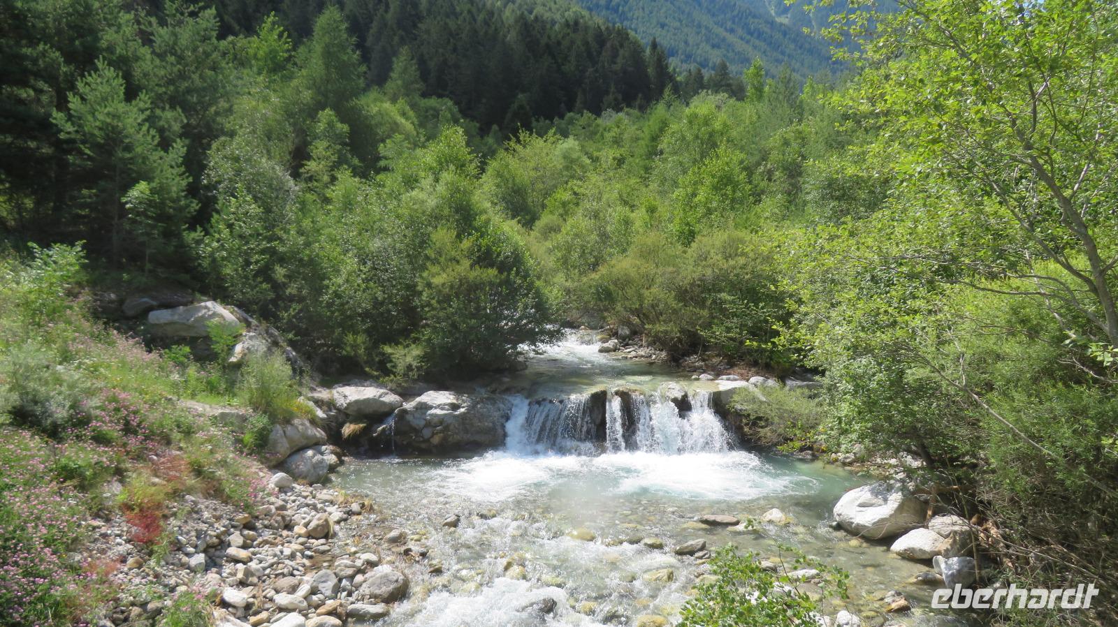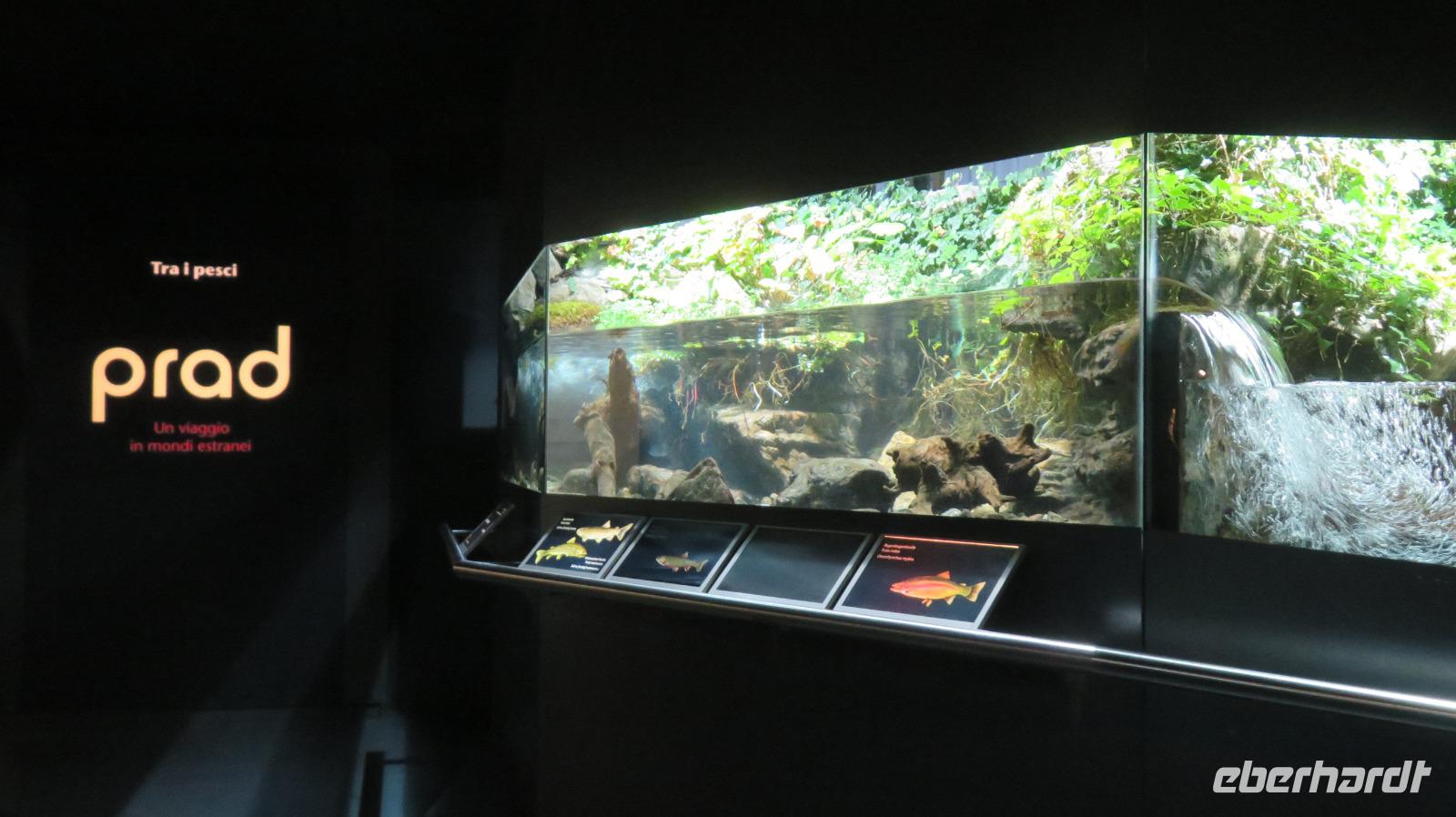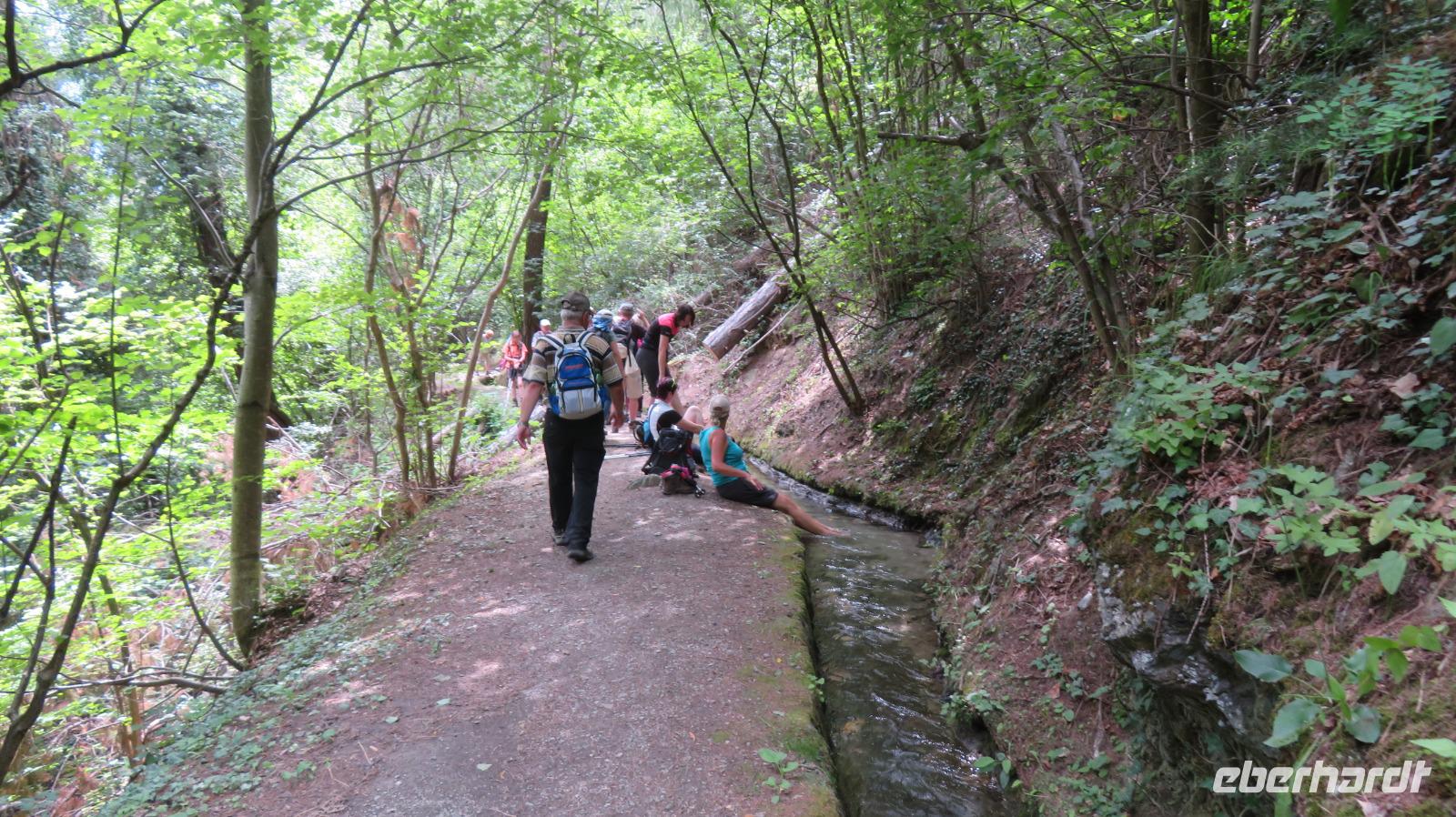 Wenn die Sonne lacht, dann lacht auch unser Wanderherz. Gut gelaunt werden wir heute mit dem Bus nach Prad am Stilfserjoch chauffiert. Dort besuchen wir als erstes das Nationalparkhaus aquaprad, in dem uns Walter die einheimische Fischfauna erläutert. Und es gibt auch genügend Exemplare in riesigen Aquarien in live zu bestaunen. Nachdem wir genug Fische gesehen hatten, zieht es uns aber nun wieder hinaus an die frische Luft und in die Berge. Nach dem ersten steileren Anstieg geht es durch den schattigen Wald und wir freuen uns über die frische Brise des Vinschgauer Windes. Bei Temperaturen von 25 Grad und mehr ist das eine richtige Wohltat!