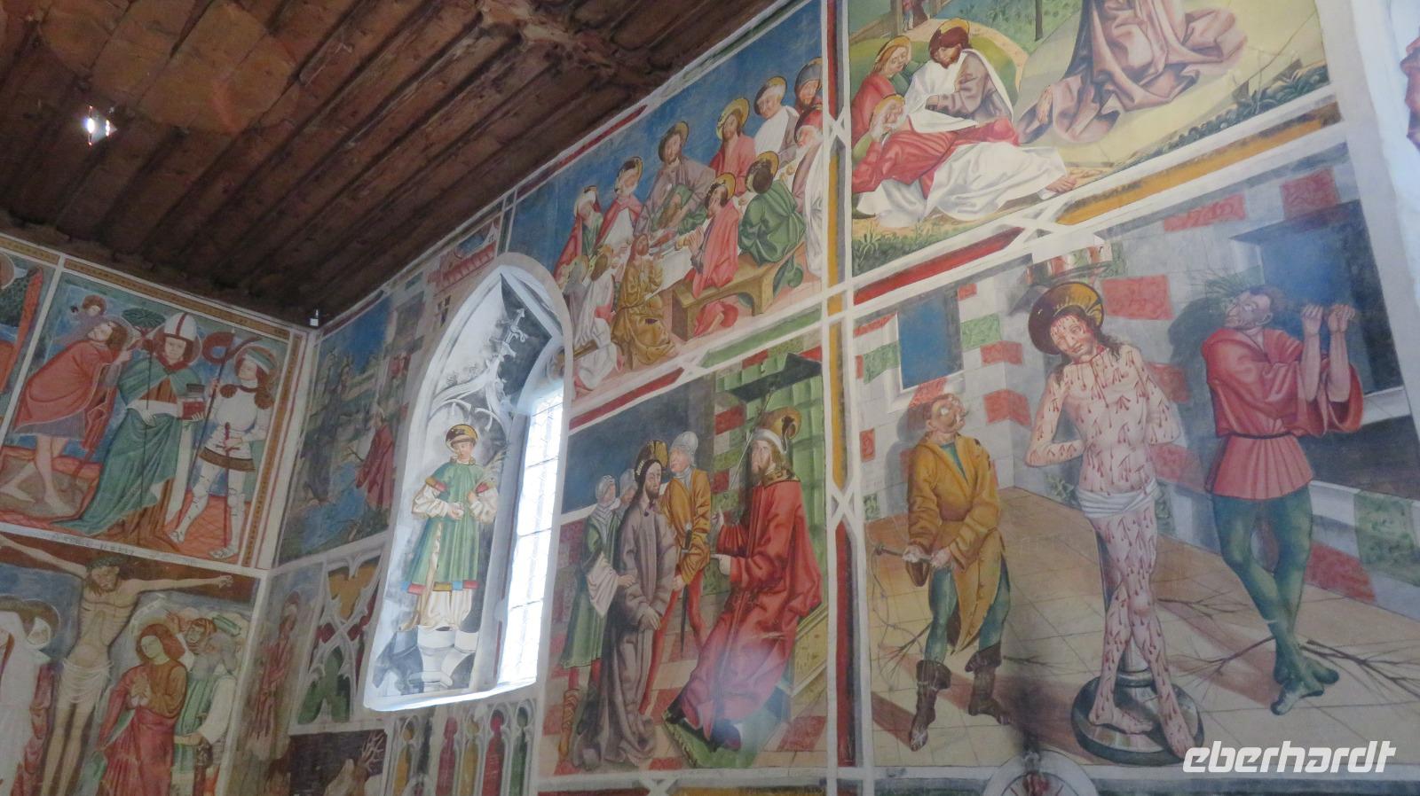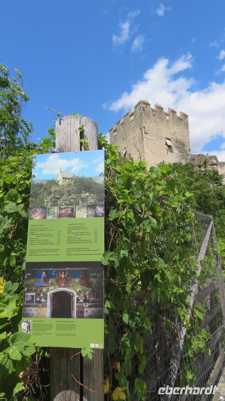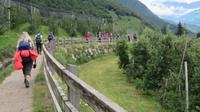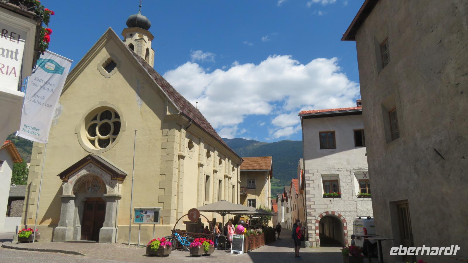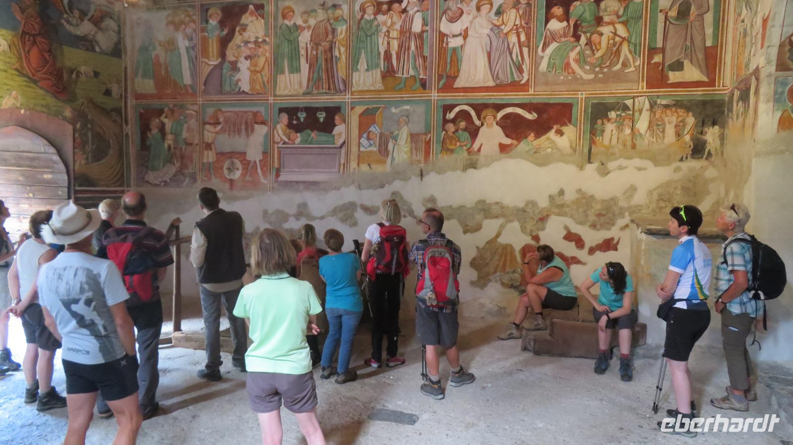 Nach der gestrigen, langen Anreise freuen wir uns heute bei strahlendem Sonnenschein auf den ersten Wandertag. Gut gefrühstückt, schnüren wir die Wanderschuhe und treffen unseren hochmotivierten Wanderleiter Walter, unverkennbar mit dem Tiroler Hut und einer Feder, vor dem Hotel. Wir laufen ein kleines Stück durch das schöne Örtchen Schlanders, das mit seinen knapp 6000 Einwohnern der Hauptort des Vinschgaus ist. Dann geht es durch Apfelplantagen in Richtung der Burgruine Obermontani. Wir stoppen immer mal wieder, damit uns Walter an seinem umfassenden Wissen, sowohl geschichtlich als auch was die Flora und Fauna angeht, teilhaben lassen kann. Wir genießen den schattigen Teil der Wanderung entlang des Waalweges „Rautwaal". Dann können wir sie endlich in voller Größe sehen, wie sie umgeben von satten Wäldern über dem Tal thront: die Burgruine Obermontani, welche 1228 von Albert II. von Tirol als Trutzburg gegen die Churer Bischöfe errichtet wurde. Außerdem wurde hier die Original Handschrift des Nibelungenliedes gefunden. Ein kleines Stückchen weiter steht die Burgkapelle St. Stephan. Nachdem wir eine ausgiebige und sehr erholsame Mittagspause im Grünen gemacht haben, dürfen wir diese Kapelle besichtigen. Sie wird auch die „Sixtinische Kapelle vom Vinschgau" genannt. Und Walter hat uns nicht zu viel versprochen! Die Malereien im Innenraum sind sensationell und wurden vor einigen Jahren gereinigt. Jede einzelne Szene ist mit viel Liebe zum Detail gemalt und gefüllt mit einer tiefen Geschichte. Nach einer kurzen Führung durch den „Kapellmeister" wagen wir den Abstieg zum „Kräuterschlössl" in Goldrain. Wir werden entführt in eine Welt der Kräuter, die hier mit viel Liebe und Arbeit gezogen, gezüchtet und zu hochwertigen Produkten weiterverarbeitet werden. Ein paar der fertigen Waren wandern dann geradewegs in unser Handgepäck...entweder als Mitbringsel für die Lieben zu Hause oder zum Selbstgenießen. Mit dem Zug geht es nun zurück und schon nach wenigen Minuten Fahrtzeit kommen wir an. Am Abend werden wir wieder bei einem leckeren Menü verköstigt.