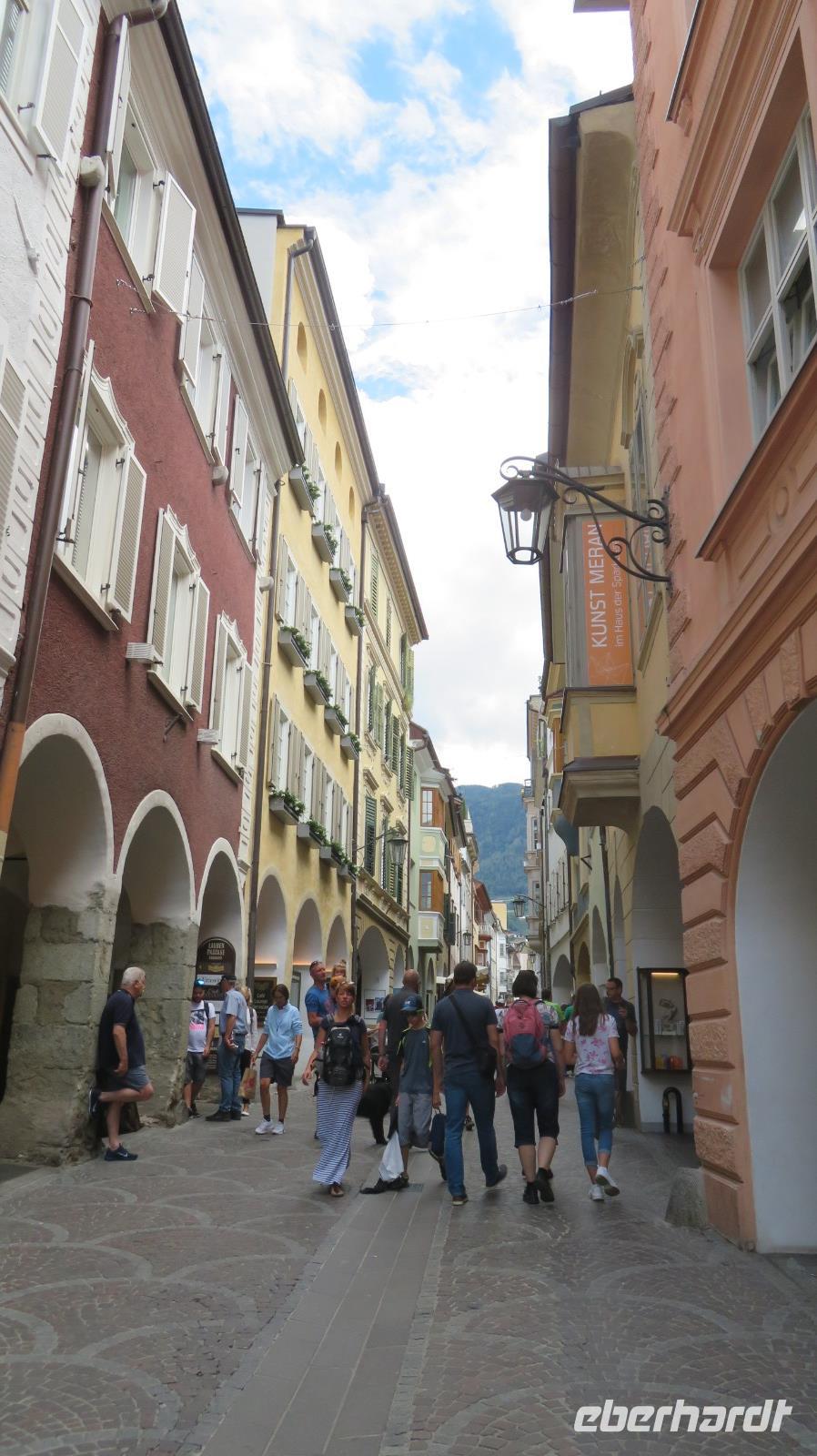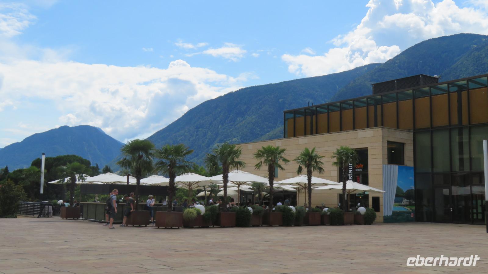 Nachdem es die ganze Nacht geregnet hat, verzogen sich die Wolken pünktlich zum Frühstück. Heute geht es etwas früher los, da wir zuerst mit dem Zug nach Töll bei Partschings zum Ausgangspunkt unserer Wanderung fahren. Nach einer dreiviertel Stunde geht es heute mit leichter Wanderausrüstung entlang des Algunder Waalweges. Die Wolken hängen noch mystisch im Tal und so langsam kämpft sich auch die Sonne durch. Immer wieder stoppen wir auf diesem gemütlichen Spazierweg um den tollen Ausblick ins Etschtal und in die Stadt Meran zu genießen. Zwischendurch passieren wir satte Obstwiesen, laufen durch Weintraubentunnel und je weiter wir nach Meran kommen, desto mehr Palmen, Zypressen und Ölbäume zieren unseren Weg. Vom Algunder Waalweg gehen wir nun entlang des Tappeinerweges, der nach Franz Tappeiner benannt wurde. Hier wird es schon etwas lebendiger, einige Lokale laden zum Verweilen ein, aber wir gehen zielstrebig in Richtung Meraner Zentrum. Hier hat nun jeder Zeit zur freien Verfügung: ob durch die Gassen bummeln, die Sehenswürdigkeiten wie das Kurhaus oder die Pfarrkirche entdecken oder auch in einem der vielen Café´s das bunte Treiben zu beobachten - es war für Jeden etwas dabei und so vergeht die Zeit wie im Fluge bis wir uns wieder am Bahnhof treffen. Auf der fast einstündigen Fahrt ins Hotel erzählen wir uns nun von unseren Erlebnissen.