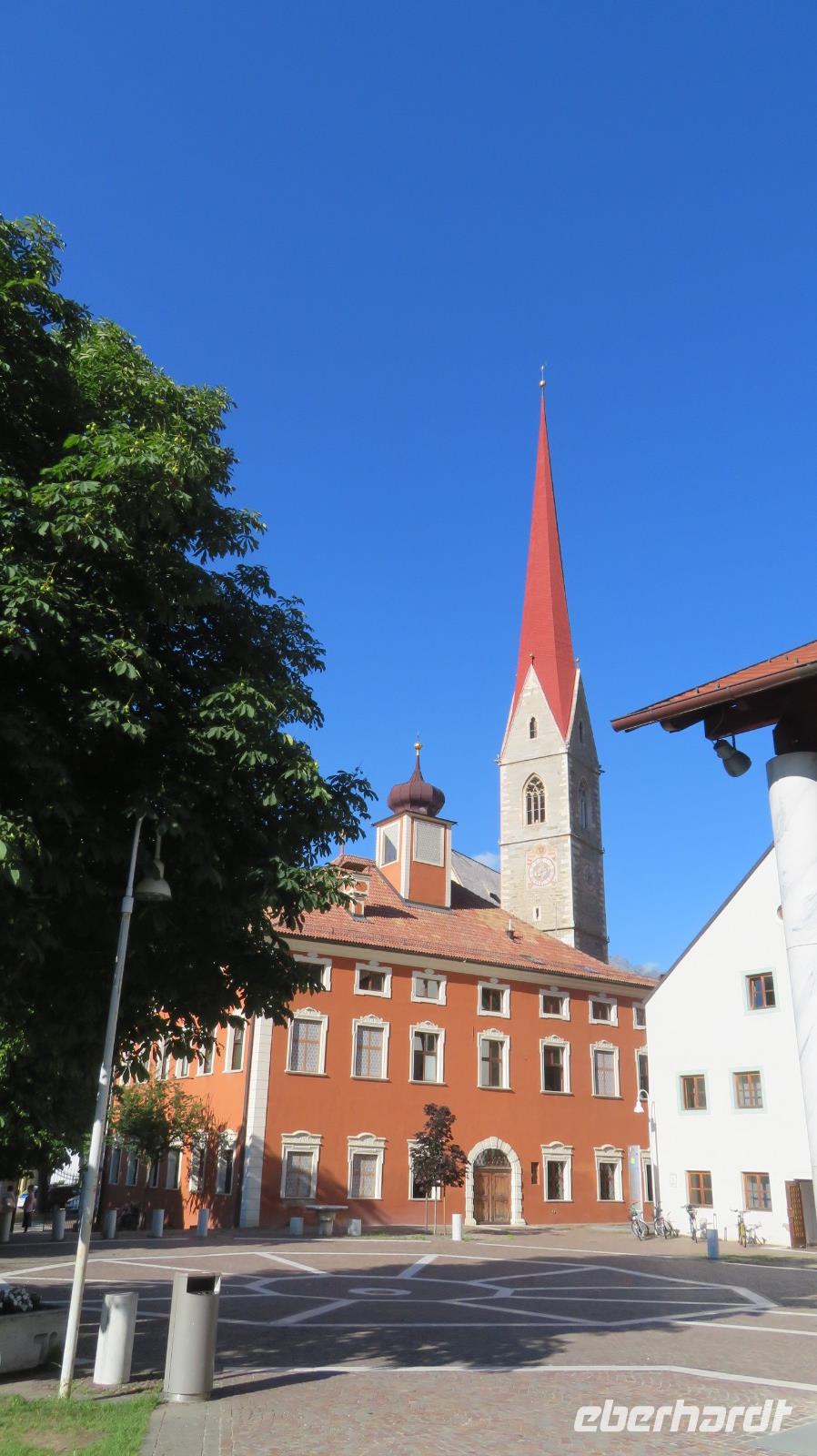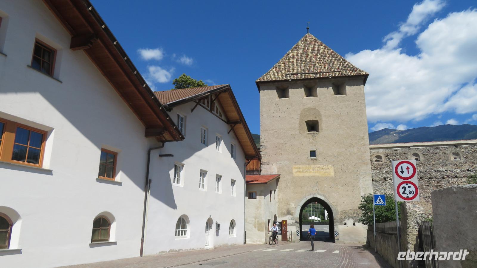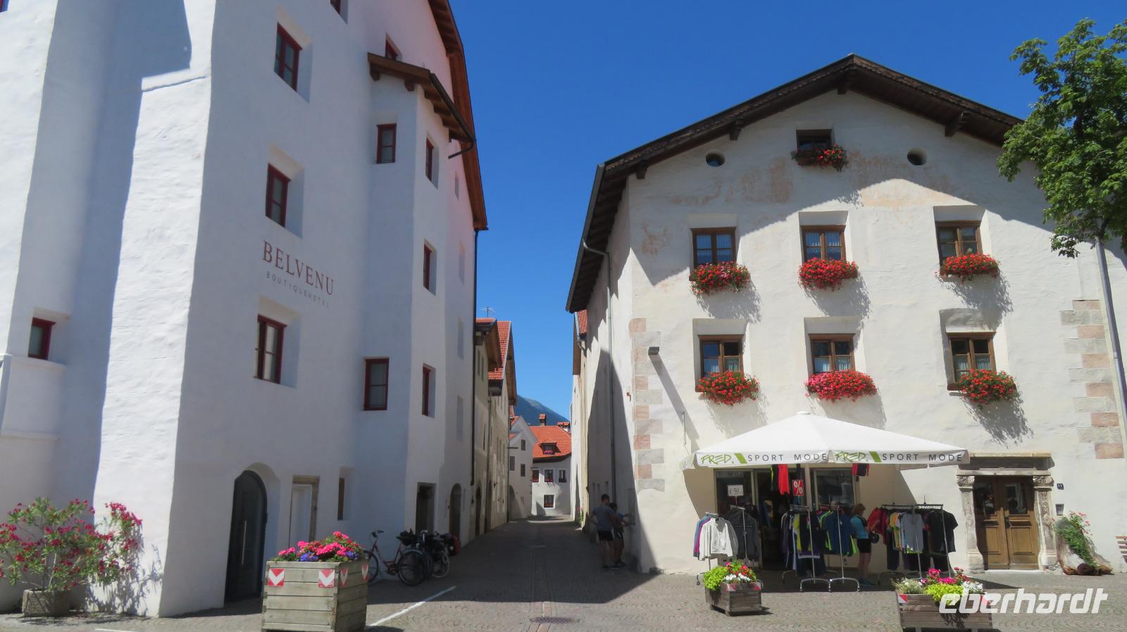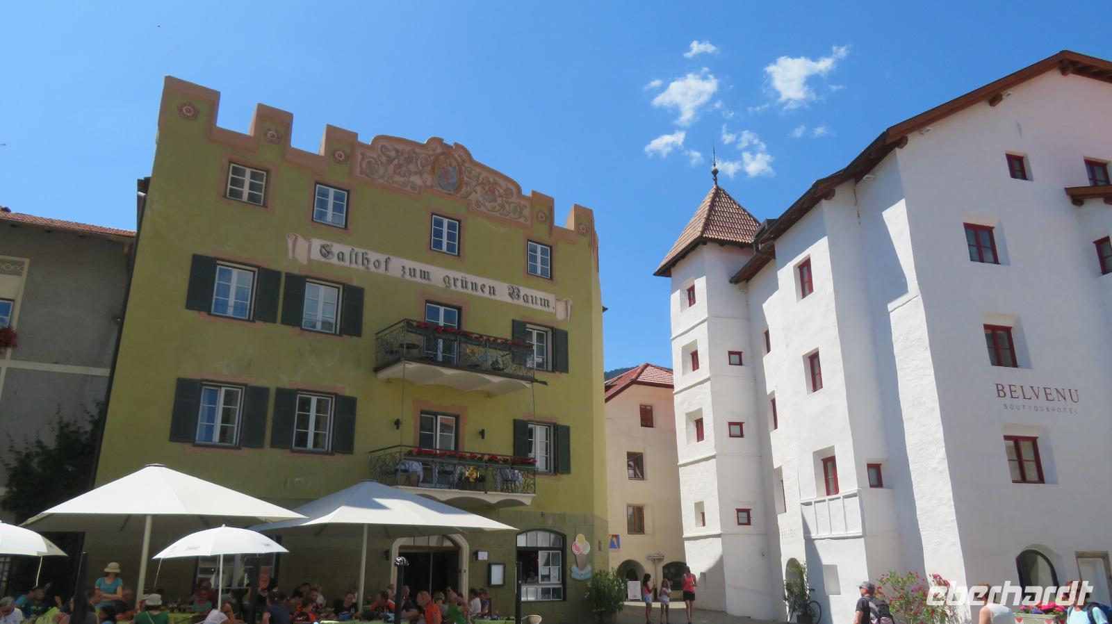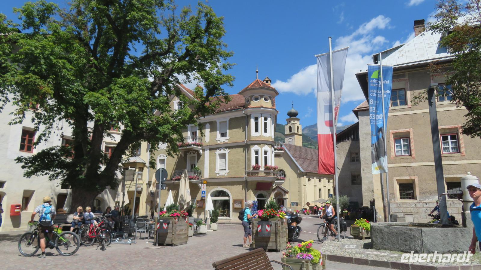 Wieder aus dem Wald hinaus können wir von Weitem bereits eine tolle Burgruine erkennen: das Castello Montechiaro oberhalb von Lichtenberg. Eine tolle Kulisse, die eine Menge Fotomotive bietet und mit dem Vinschgauer Panorama eine sensationelle Kombination ist! Das wussten schon die damaligen Burgherren zu schätzen, die gern das ganze Vinschgau und die benachbarte Churburg von Schluderns im Blick haben wollten. Weiter geht es nun wieder durch Wald und Wiesen, über Stock und Stein bis wir einen schattigen Platz für unsere Jause nutzen. Auch Walters „Promenadenmischung" darf natürlich nicht fehlen. Nun geht es fröhlich noch den Waldweg weiter bis zum Asphaltweg der ins Tal hinunter ins Mittelalterstädtchen Glurns führt. Mit nicht einmal 900 Einwohnern ist sie eine der kleinsten Städte in den Alpen. Beeindruckend sind die vollständig erhaltenen Stadtmauern mit seinen drei Stadttoren: dem Tauferser, dem Malser und dem Schludernser Tor. Wir schlendern durch die kleinen malerischen Gassen und Winkel, werfen einen Blick in die Frauenkirche und genießen den ganz besonderen Charme dieses Örtchens bei einem leckeren hausgemachten Eis. Anschließend wandern wir noch ein kleines Stück zur PUNI Destillerie, die seinen Namen vom gleichnamigen Fluss hat. Dort werden wir in die Kunst des Whiskys brennen eingeweiht: vom Mälzen, Maischen, Gären, Reifen und Abfüllen der Produkte. Natürlich darf eine Verkostung zweiter Sorten nicht fehlen. Aufgeheitert geht es nun wieder mit dem Bus zurück nach Schlanders, wo uns am Abend wieder ein köstliches Abendessen erwartet.