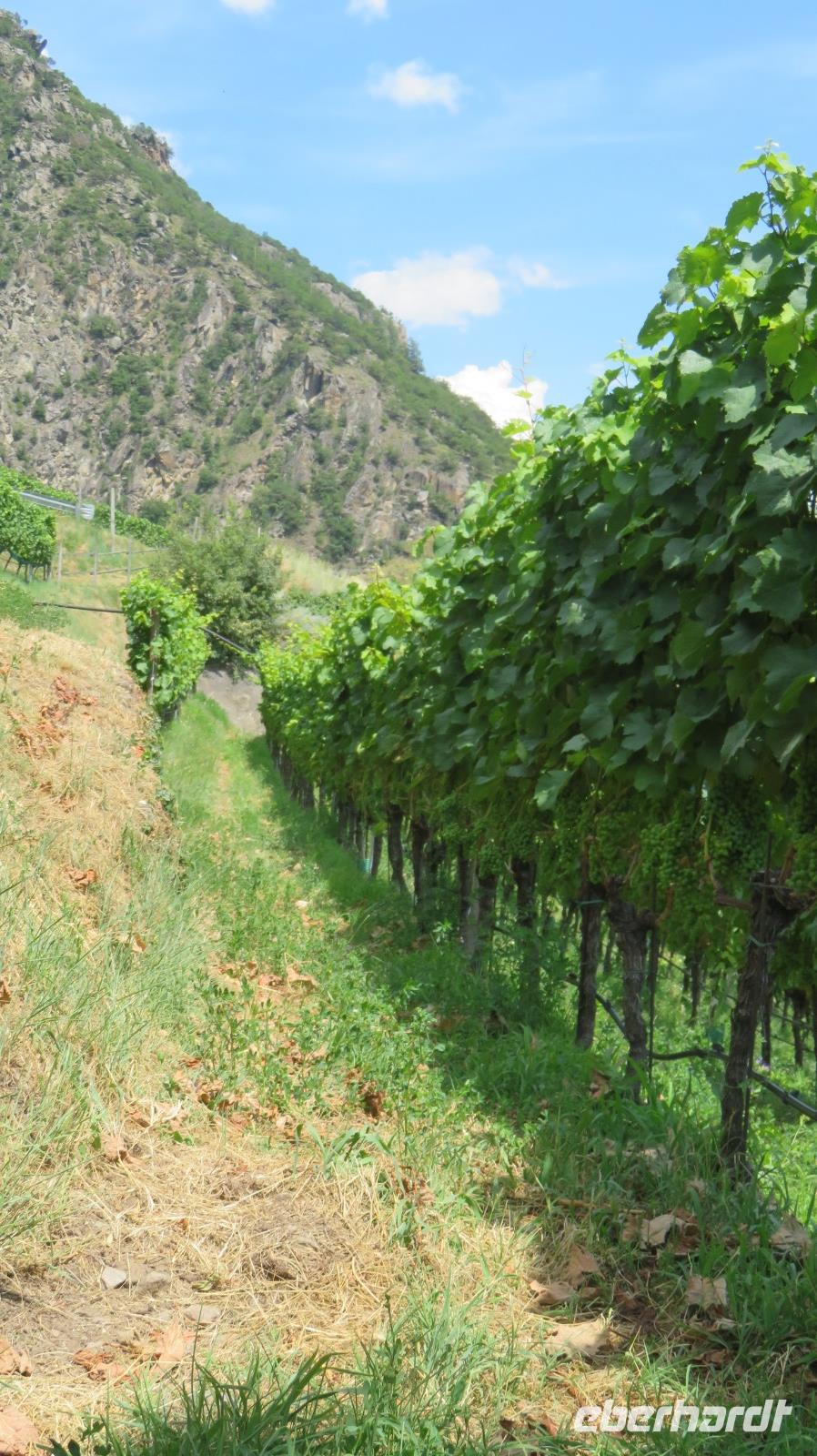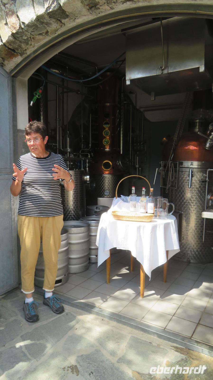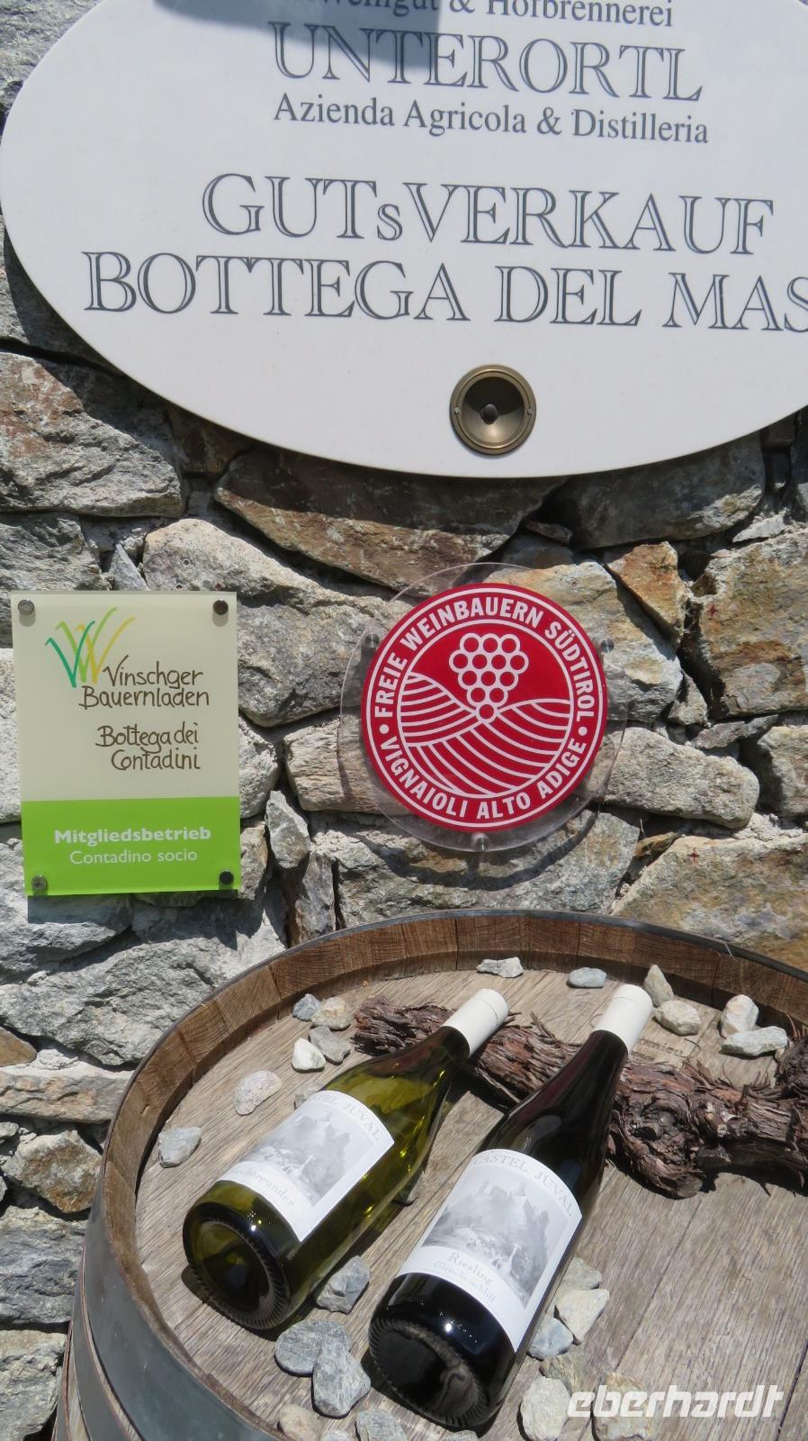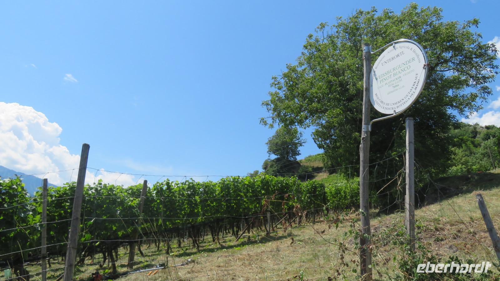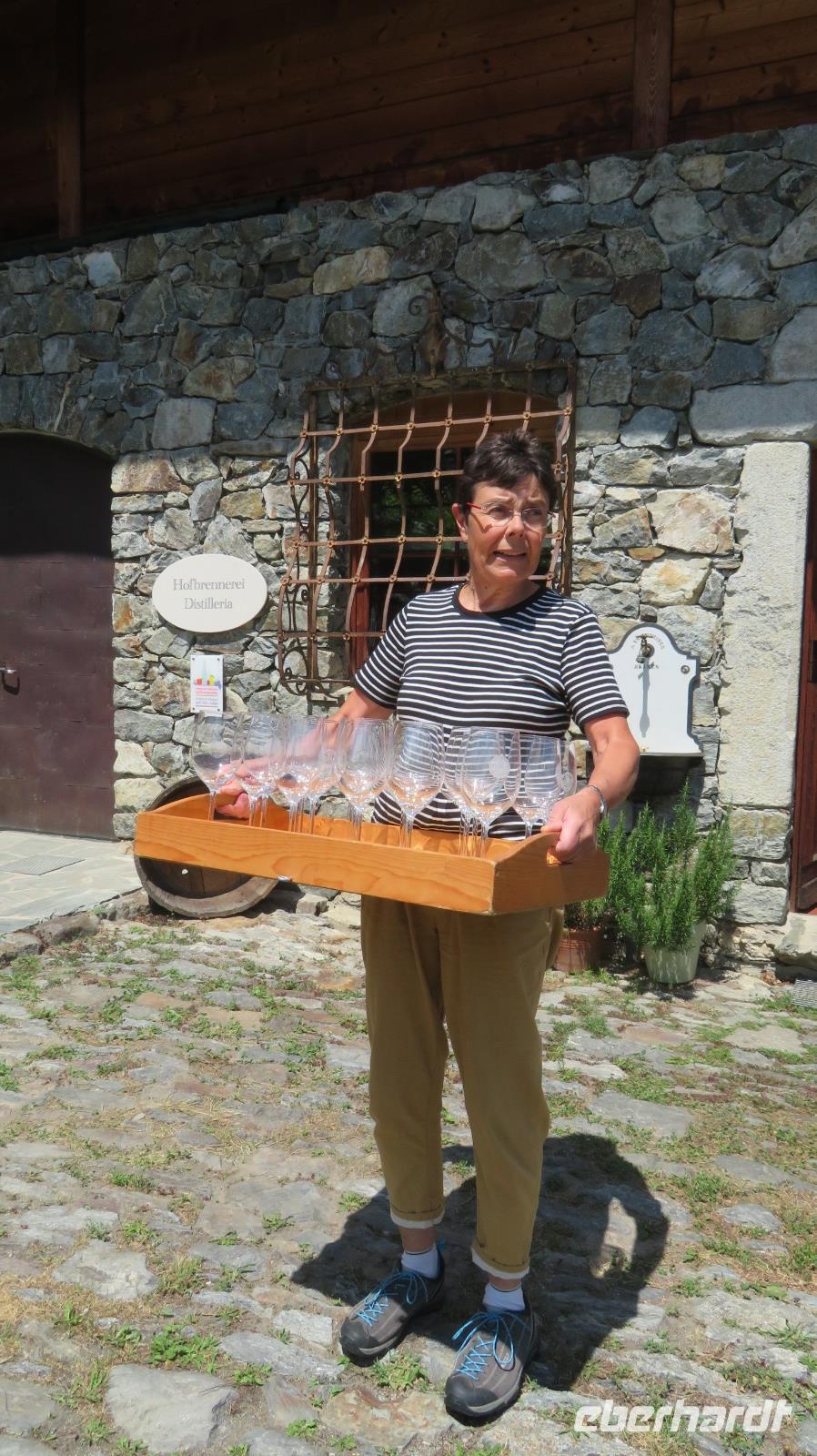 Auch heute ist uns der Wettergott wieder hold! Bei strahlendem Sonnenschein laufen wir frisch ausgeruht und gestärkt zum Bahnhof, um nach Kastelbell zu fahren. Der Ort ist bekannt für seine Schlösser und Ansitze. Das Schloss Kastelbell begrüßt uns schon kurz nach der Ankunft mit dem Zug und natürlich darf ein Foto nicht fehlen. Aber unser Ziel heute ist das Schloss Juval, ein Privatschloss von Reinhold Messner, das das gleichnamige Museum beherbergt. Dieses ist dem Mythos Berg gewidmet, aber leider ist es im Juli nicht zugänglich. Wir steigen erst einmal vom Ort Kastelbell hinauf an unzähligen Rebhängen vorbei zum Schnalser Waalweg. Dieser führt gemütlich im „kühlen" schattigen Wald entlang und wir können immer wieder einen fantastischen Blick hinunter ins Tal erhaschen. Die vielen Weinfelder sehen von oben aus wie viele aneinander gereihte Quadrate. Plätschert der Waal streckenweise wie ein kleiner unschuldiger Bach vor sich hin, so tobt er etwas weiter wie ein reißender Fluss den Wald hinunter. Er schenkt uns aber immer wieder die gewünscht Abkühlung zwischendurch, wobei sich der ein oder andere am liebsten auch mal hinein gesetzt hätte :-). Nach einem kurzen, steileren Aufstieg sind wir nun endlich oben am Schloss Juval und nutzen ein schönes Picknickplätzchen für unsere Rast. Aber auch der geöffnete Burgschank lädt zum Verweilen ein. Gut gestärkt geht es nun serpentinenförmig wieder der Straße entlang hinunter - denn unser Ziel ist das Weingut Unterortl. Links und rechts sehen wir schon die vielen Weinhänge, die dann mit viel Mühe und Herzblut zum edlen Tropfen verarbeitet werden. Gisela ist hier die Hauschefin und wir erleben eine sehr interessante Führung direkt zwischen den Weinreben. Jeder bekommt ein Glas und mit dem Körbchen, das gefüllt ist mit 3 verschiedenen Weißweinen und einem Saft, ziehen wir los. Mit dem unglaublichen Panorama im Hintergrund schmeckt der Wein gleich doppelt gut. Wir erfahren nebenbei eine Menge über die Herstellung, Verarbeitung und den Alltag mit dem 7h großen Land, das zum Weingut gehört. Wieder am Haus angekommen, geht es nun in den Weinkeller und in die kleine Destillerie. Vom Destillieren haben wir ja bei PUNI Whisky schon etwas gelernt und sind schon etwas vorgebildet. Nun verkosten wir auch noch einen Grappa oder wer es nicht so „straff" mag, einen Likör. Nun sind die Beine etwas schwerer, aber es geht ja nur noch bergab bis nach Staben. Dort am Bahnhof angekommen, fahren wir nun wieder gut gelaunt nach Schlanders. Am Abend können wir bei einem leckeren Pizza-Abend von den hausgemachten Lieblingssorten überzeugen. In der Konzertmuschel gibt es zudem ein Konzert des hiesigen Blasorchesters, das wir uns natürlich nicht entgehen lassen!