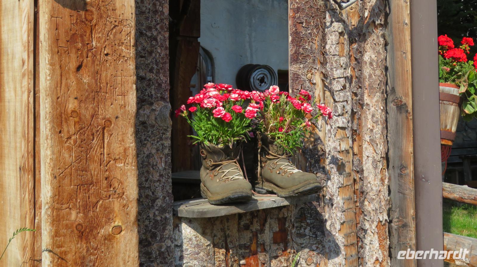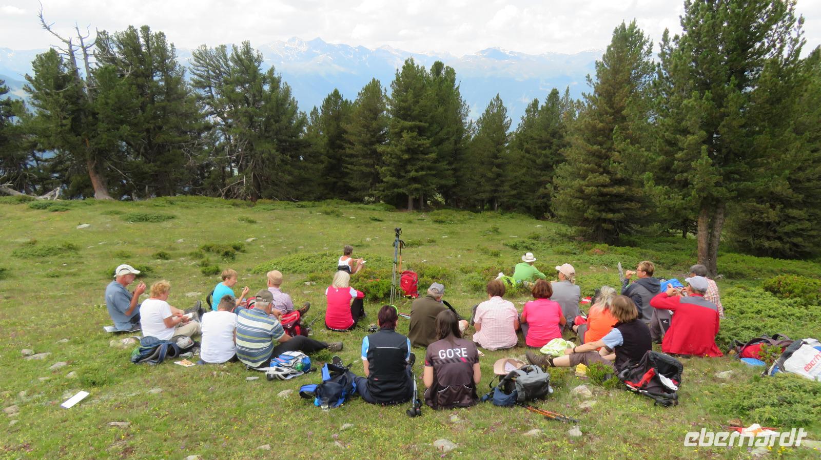 Heute haben wir Großes vor! Die anspruchsvollste und längste Wanderung der Reise steht auf dem Programm. Für das geplante Freiluftpicknick verteile ich vor dem Start erst einmal alle Utensilien: tiroler Speck und Schinken, Bergkäse, Tomaten, saure Gurken und natürlich dürfen auch Wein, Vinschger Brot und ein Likörchen nicht fehlen. Aber das müssen wir uns erst verdienen! Nachdem wir mit dem Bus in Tanas, einem kleinen Bergdorf angekommen sind, geht es auch schon los. Allmählich wandern wir auf einem schönen, breiten Waldweg hinauf bis zur Dörfler-Stierhütte, an der wir bereits über 700 Höhenmeter geschafft haben. Dort können wir kurz verschnaufen und vor allem den grandiosen Ausblick genießen. Die Wiesen duften herrlich nach Kräutern, wie Thymian, Engelwurz und Schafgarbe. Nun geht es weiter einmal auf und ab den Hang entlang hinaus in Richtung Köpfelplatte. Kurz nach dem höchsten Punkt unserer Wanderung auf 2400 Höhenmetern machen wir unsere wohlverdiente Rast. Wir stärken uns an unserem tollen Waldbuffet und halten bei der unglaublichen Kulisse kurz Inne. Die Ruhe wird nur von einem „Wer will noch einen Kirschlikör?" gestört, aber bevor es weiter geht, probieren wir auch diesen :-). Nachdem wir nun etwas weiter abgestiegen sind, erreichen wir die Köpfelplatte und wandern hinunter bis zum Vinschgauer Höhenweg. Wer gedacht hat, dass alle Aufstiege geschafft sind, hat sich getäuscht. Auch hier mussten wir nochmal die Zähne zusammenbeißen und einige Höhenmeter überwinden. Am Unterfrinighof vorbei erreichten wir nun endlich den lang ersehnten Zielpunkt, den Gasthof Paflur in Tanas, den wir erstmal stürmten, um uns bei einer Holunderschorle oder einem Radler zu erfrischen! Hut ab, liebe Wanderfreunde vor über 1000 erklommenen Höhenmeter rauf und wieder runter auf einer Strecke von sagenhaften 20 Kilometern. Da hatten wir uns unser Abendessen redlich verdient!