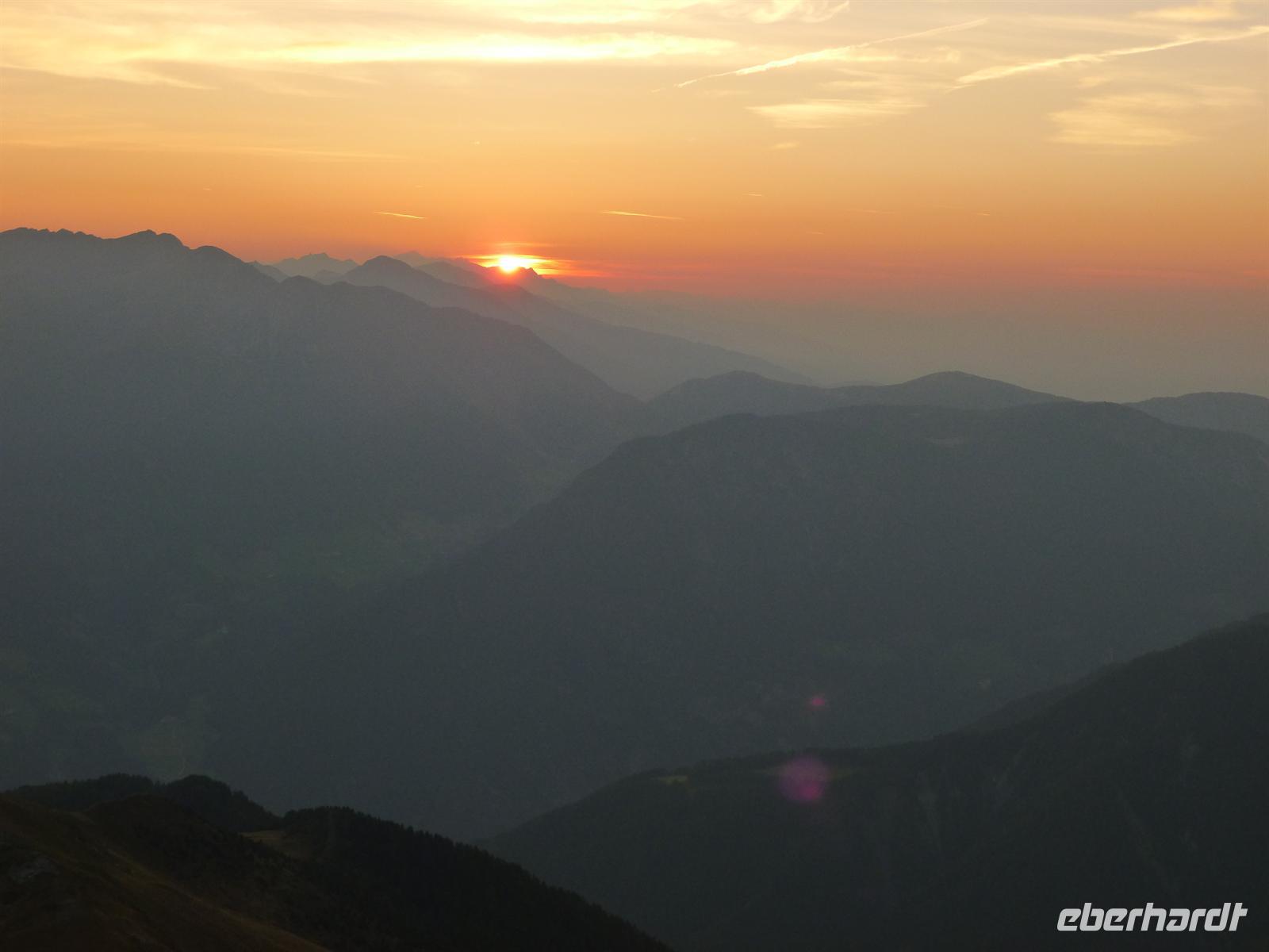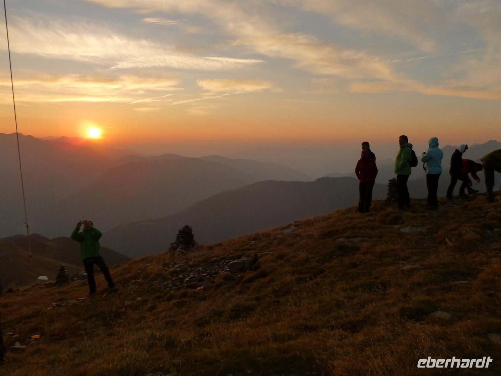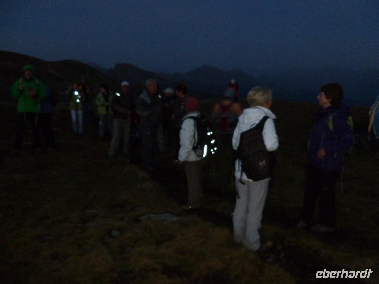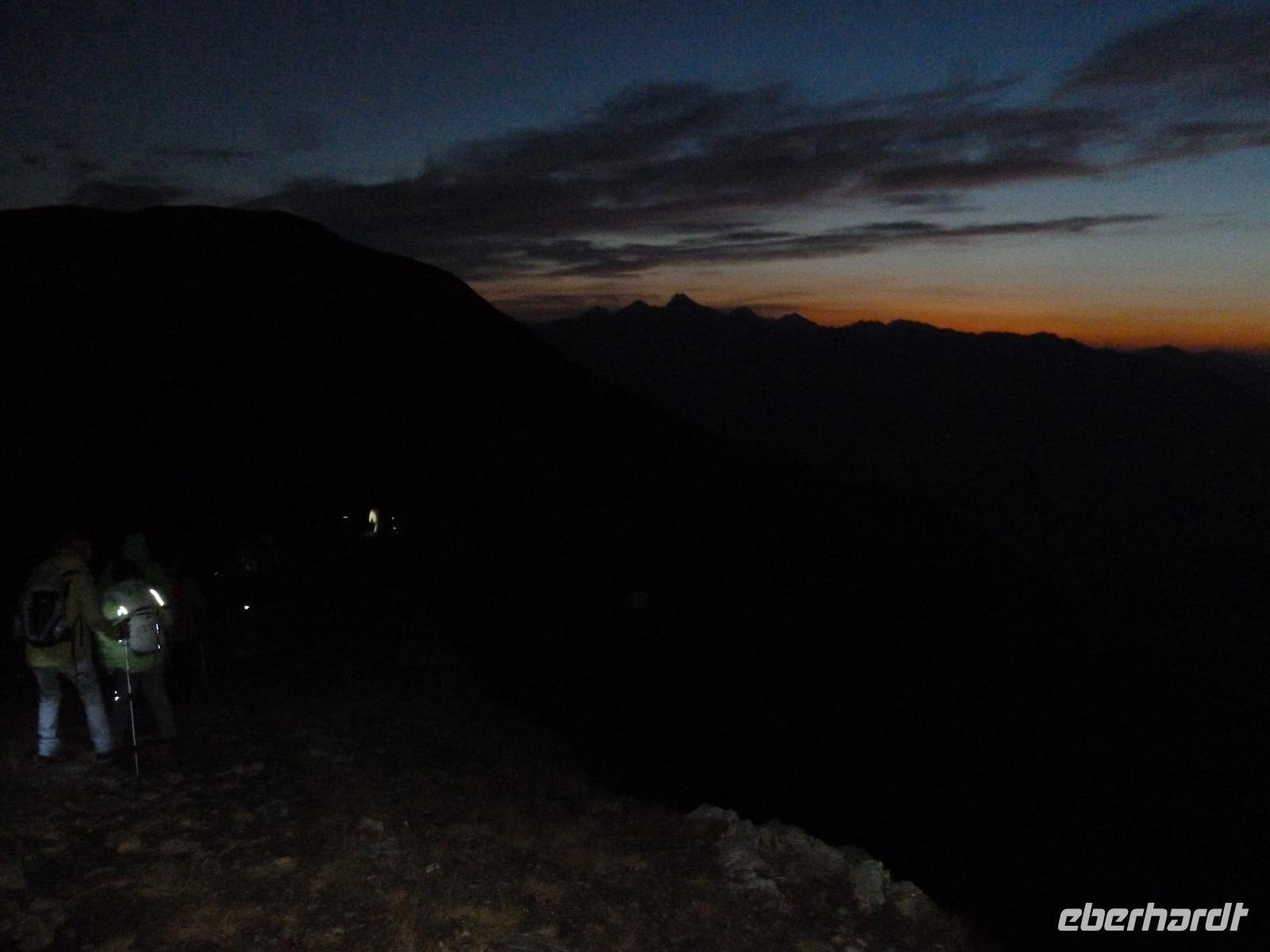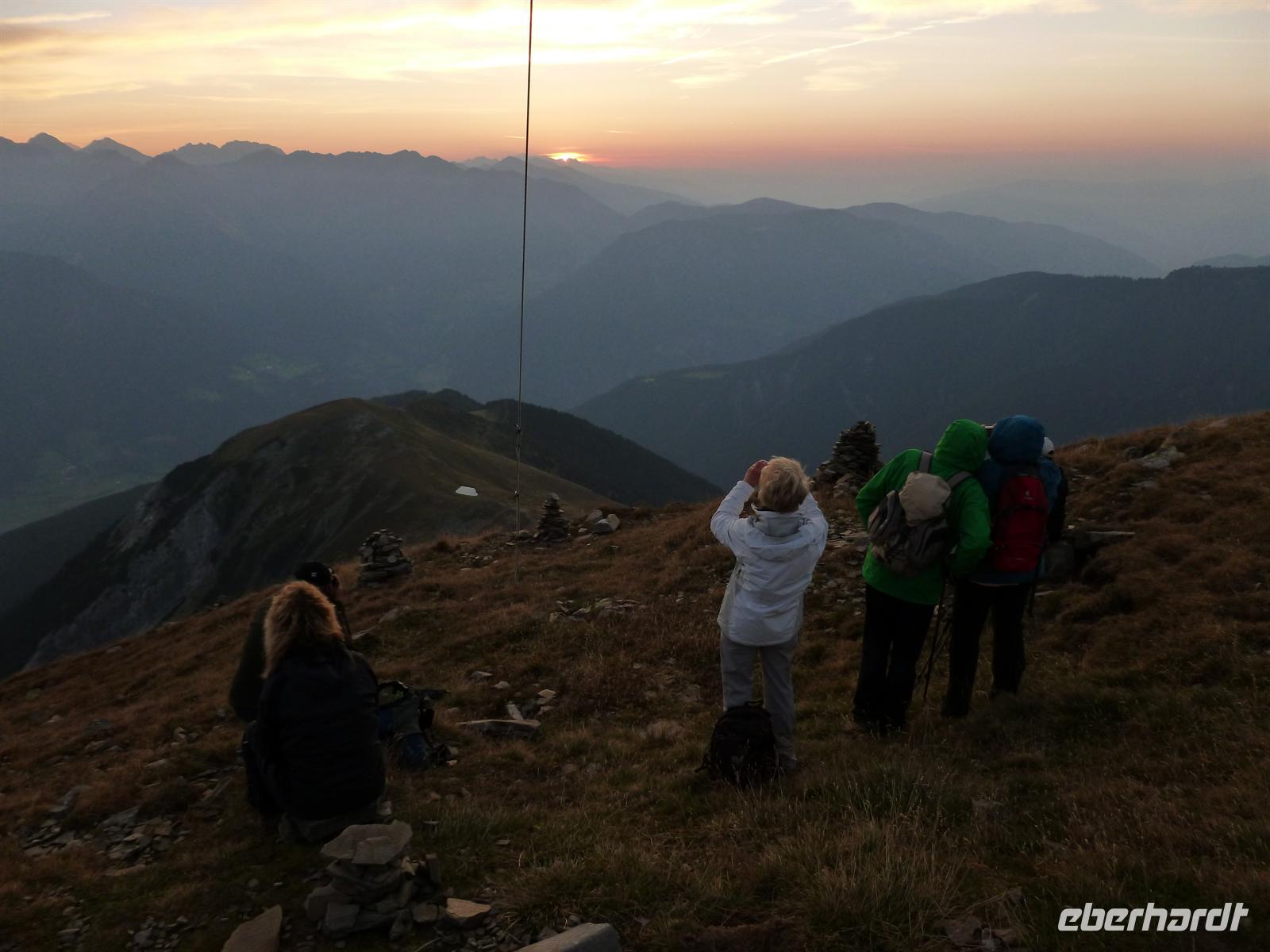 Nachdem alle früh schlafen gegangen waren, wurden wir bereits um 4.15 Uhr geweckt um uns zur Sonnenaufgangswanderung auf den 2244m hohen Zinseler bereit zu machen. Wir fuhren mit Siggi zum Penseler Joch um von dort aus die 400 Höhenmeter zu überwinden. Warm eingepackt und mit Taschenlampen ausgerüstet marschierten wir durch die Nacht - vom Sternenhimmel und dem Mond begleitet. Entgegen unserer Erwartungen war es ein wolkenloser Morgen und nach und nach verfärbte sich der Himmel in warme Rottöne. Gut gelaunt kamen wir nach einer guten Stunde Gehzeit auf dem Gipfel an und feierten dies traditionell mit einem Bergschnaps, der uns bei 6 Grad Außentemperatur gut einheizte. Dann konnten wir langsam den aufsteigenden roten Ball am Horizont beobachten und einfach nur die Ruhe genießen.