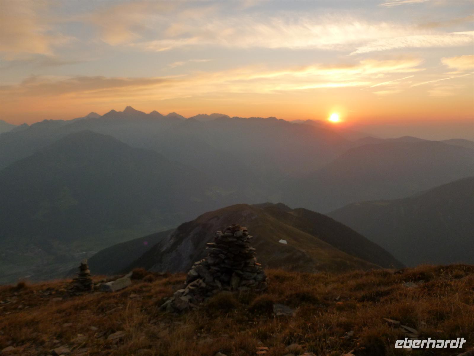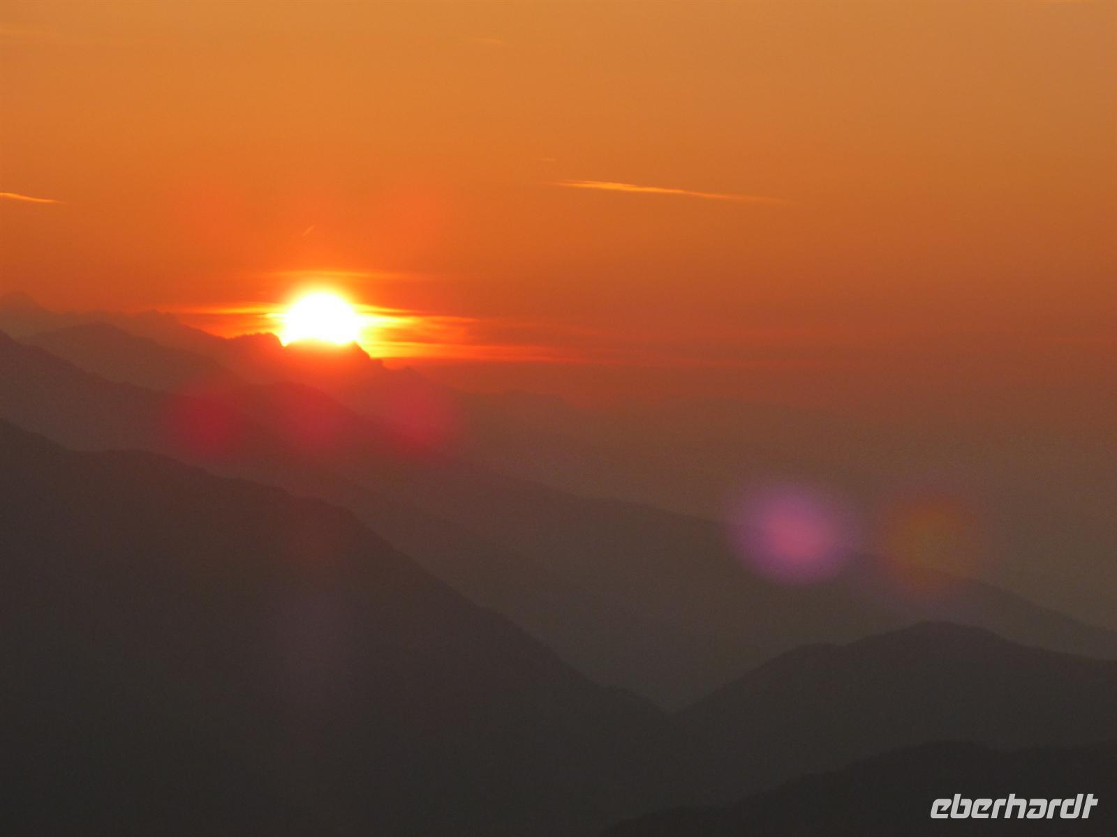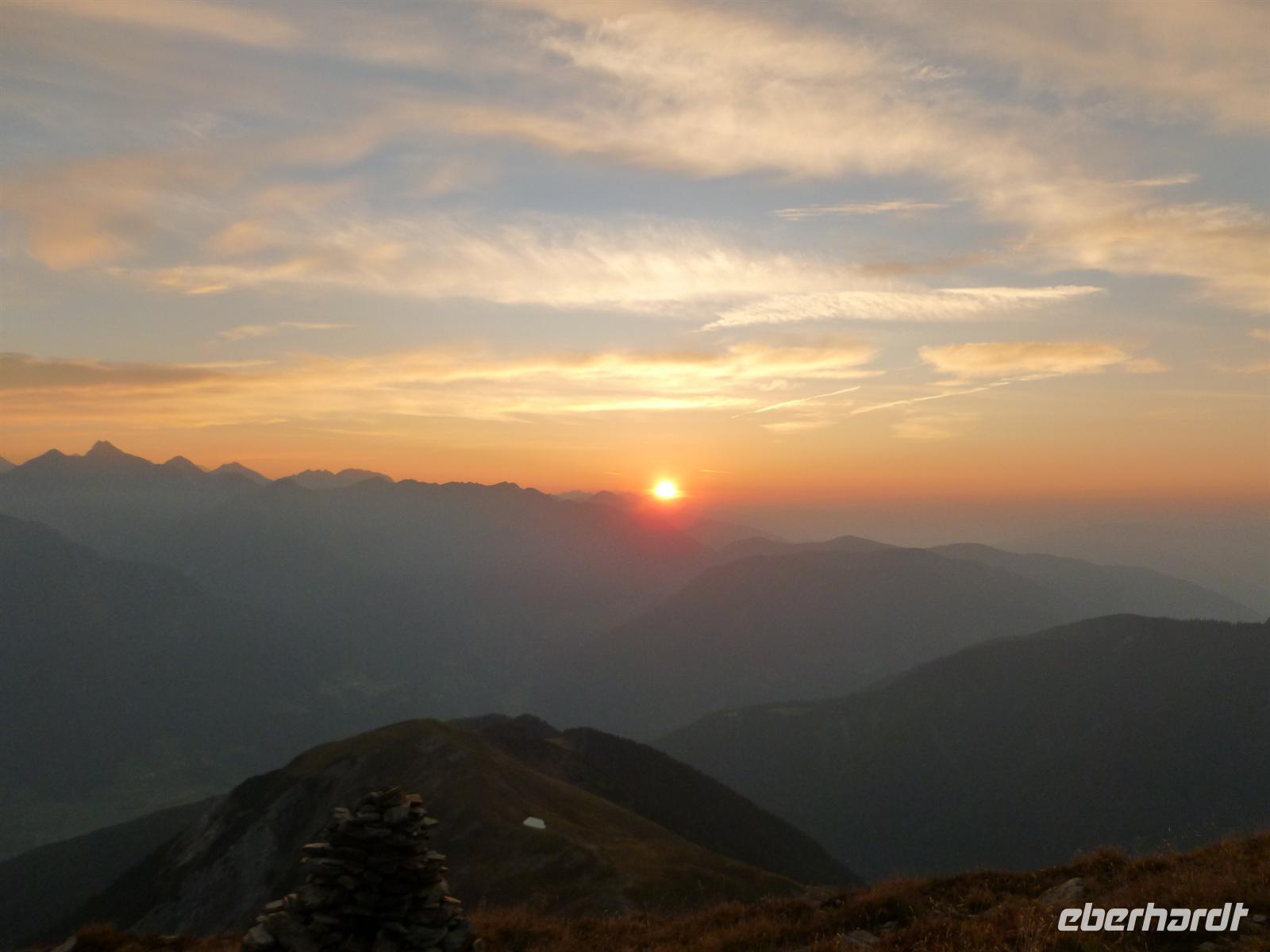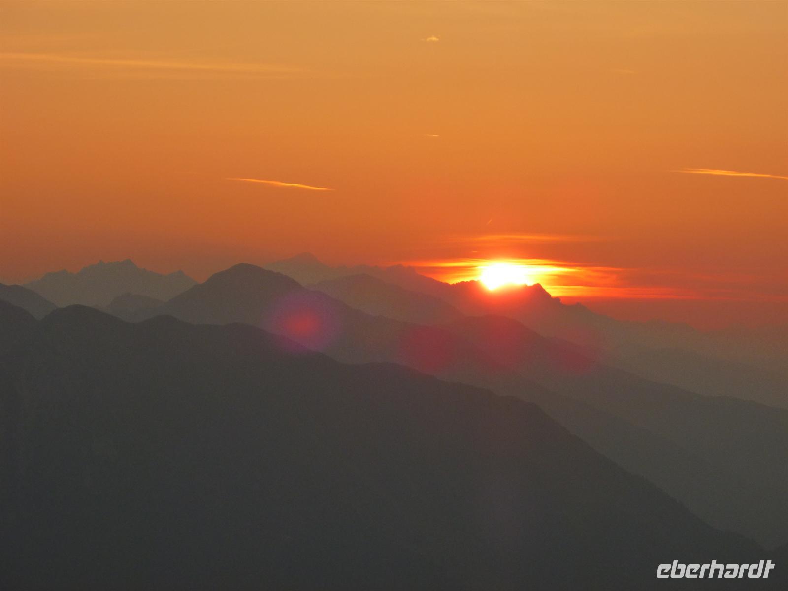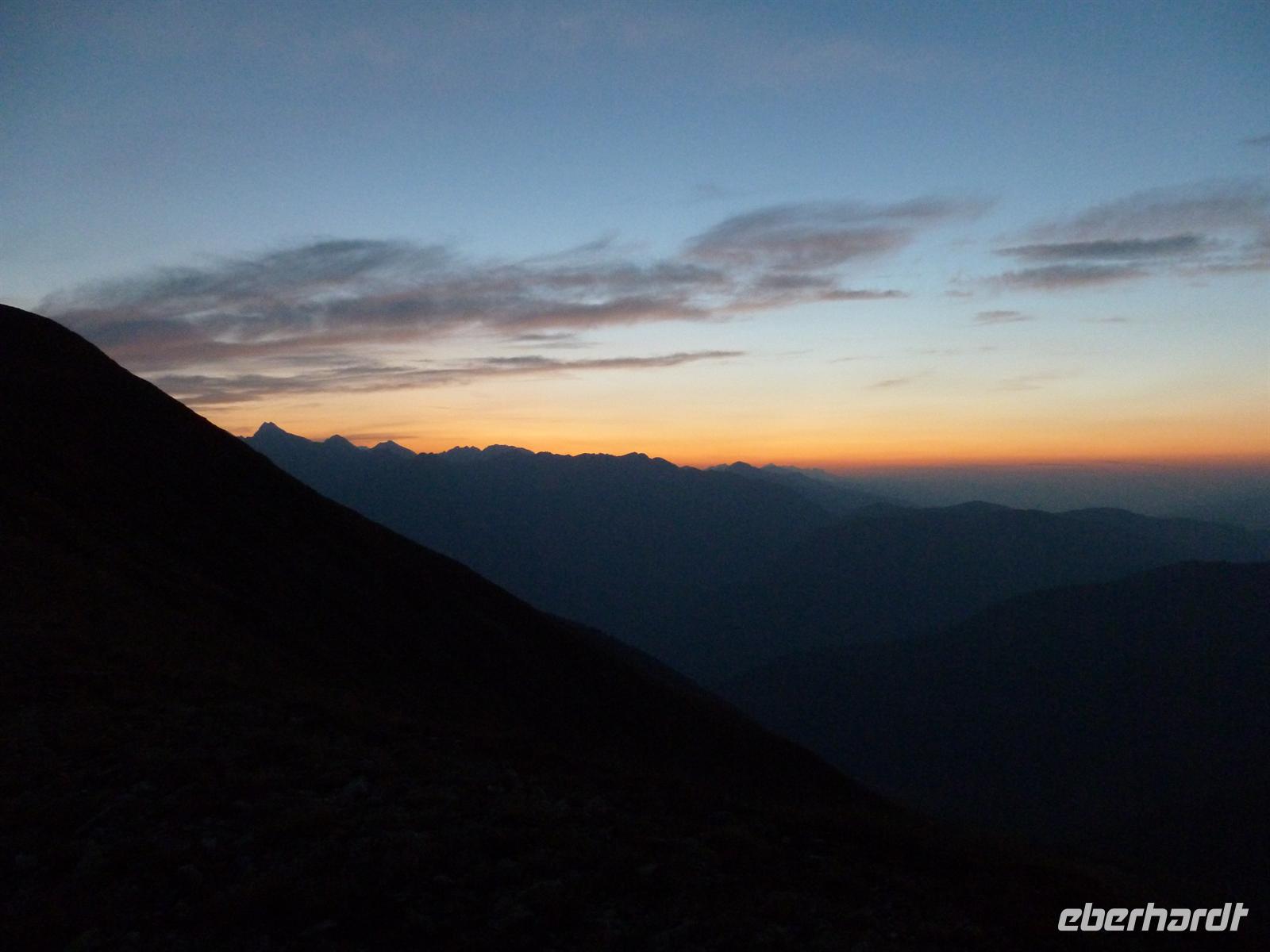 Nachdem alle früh schlafen gegangen waren, wurden wir bereits um 4.15 Uhr geweckt um uns zur Sonnenaufgangswanderung auf den 2244m hohen Zinseler bereit zu machen. Wir fuhren mit Siggi zum Penseler Joch um von dort aus die 400 Höhenmeter zu überwinden. Warm eingepackt und mit Taschenlampen ausgerüstet marschierten wir durch die Nacht - vom Sternenhimmel und dem Mond begleitet. Entgegen unserer Erwartungen war es ein wolkenloser Morgen und nach und nach verfärbte sich der Himmel in warme Rottöne. Gut gelaunt kamen wir nach einer guten Stunde Gehzeit auf dem Gipfel an und feierten dies traditionell mit einem Bergschnaps, der uns bei 6 Grad Außentemperatur gut einheizte. Dann konnten wir langsam den aufsteigenden roten Ball am Horizont beobachten und einfach nur die Ruhe genießen.
