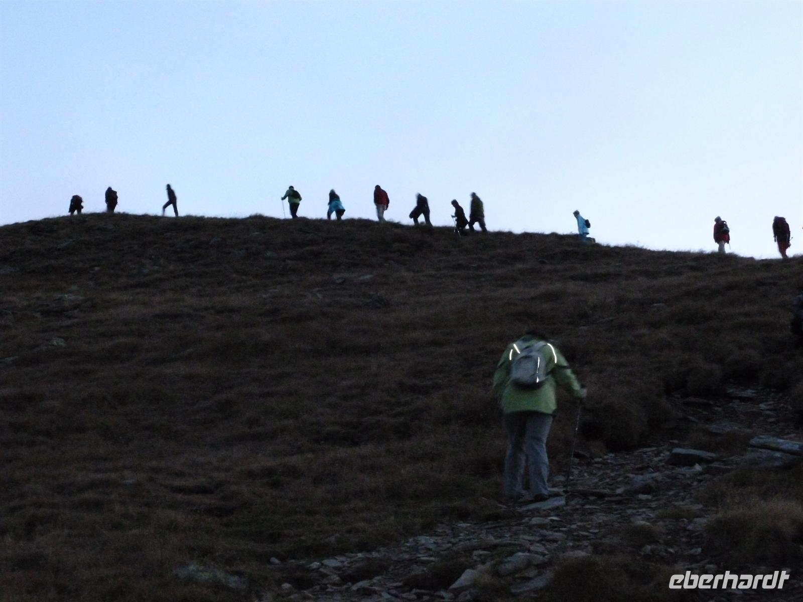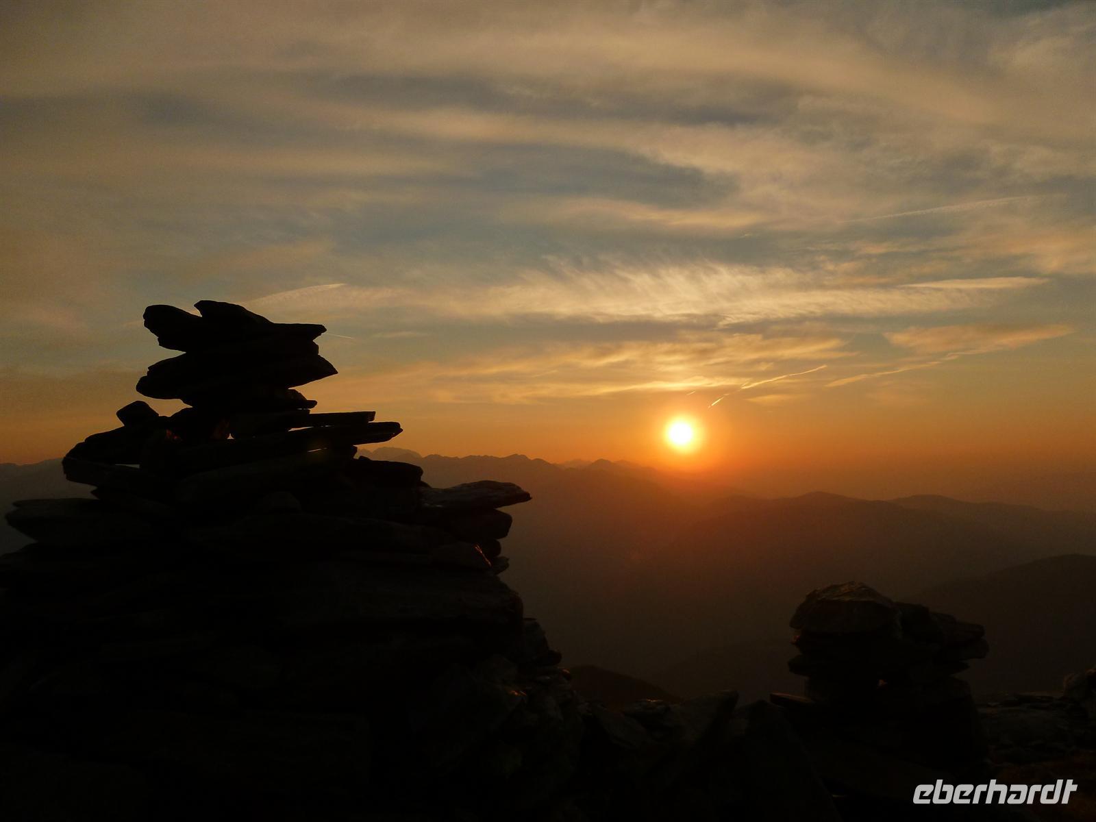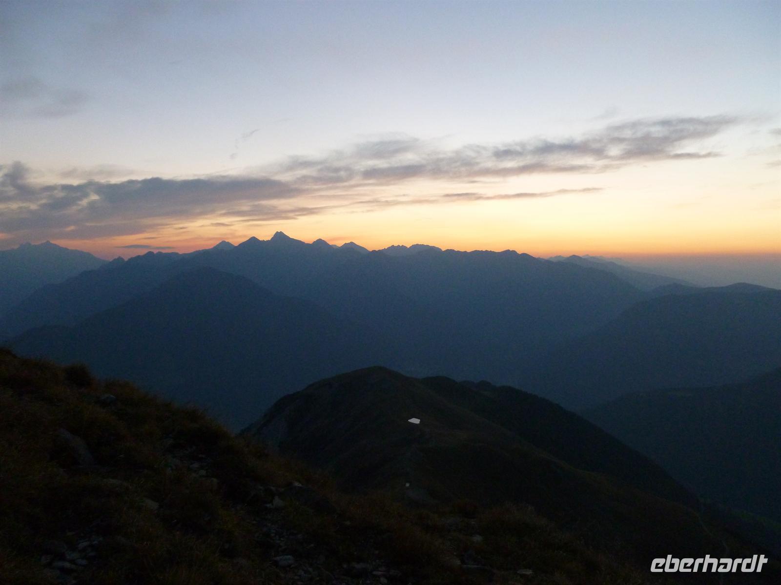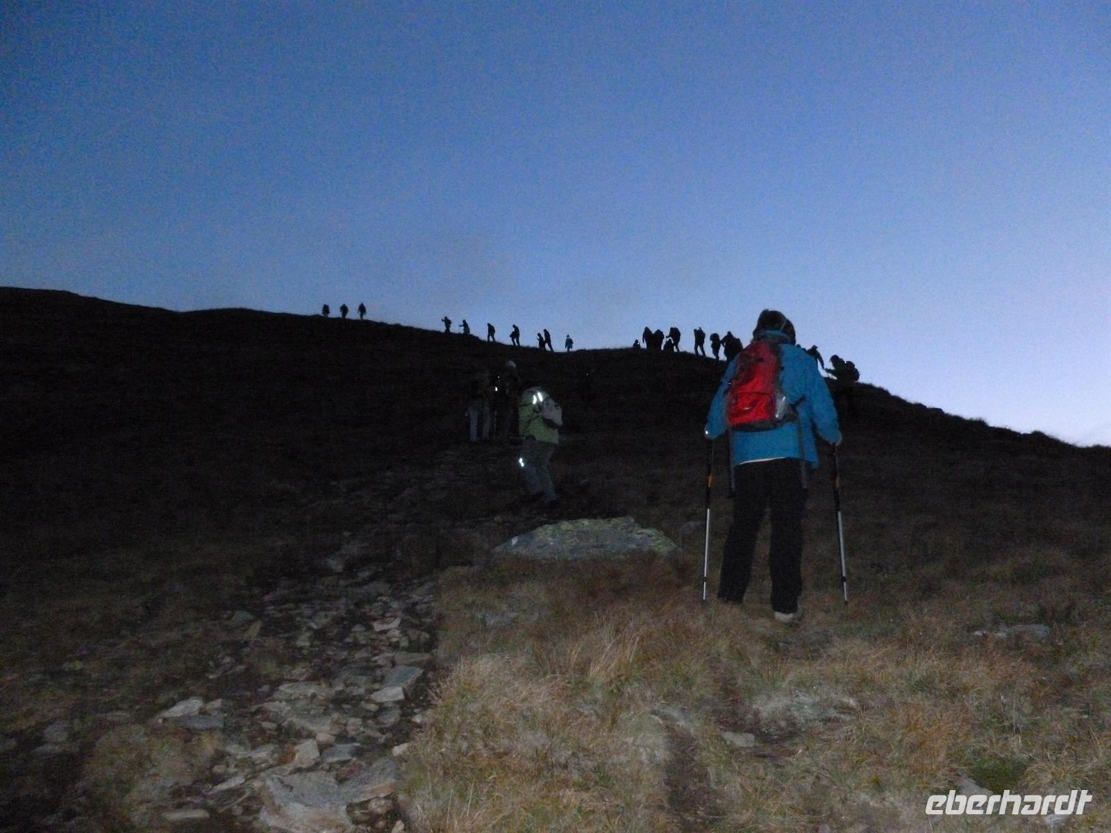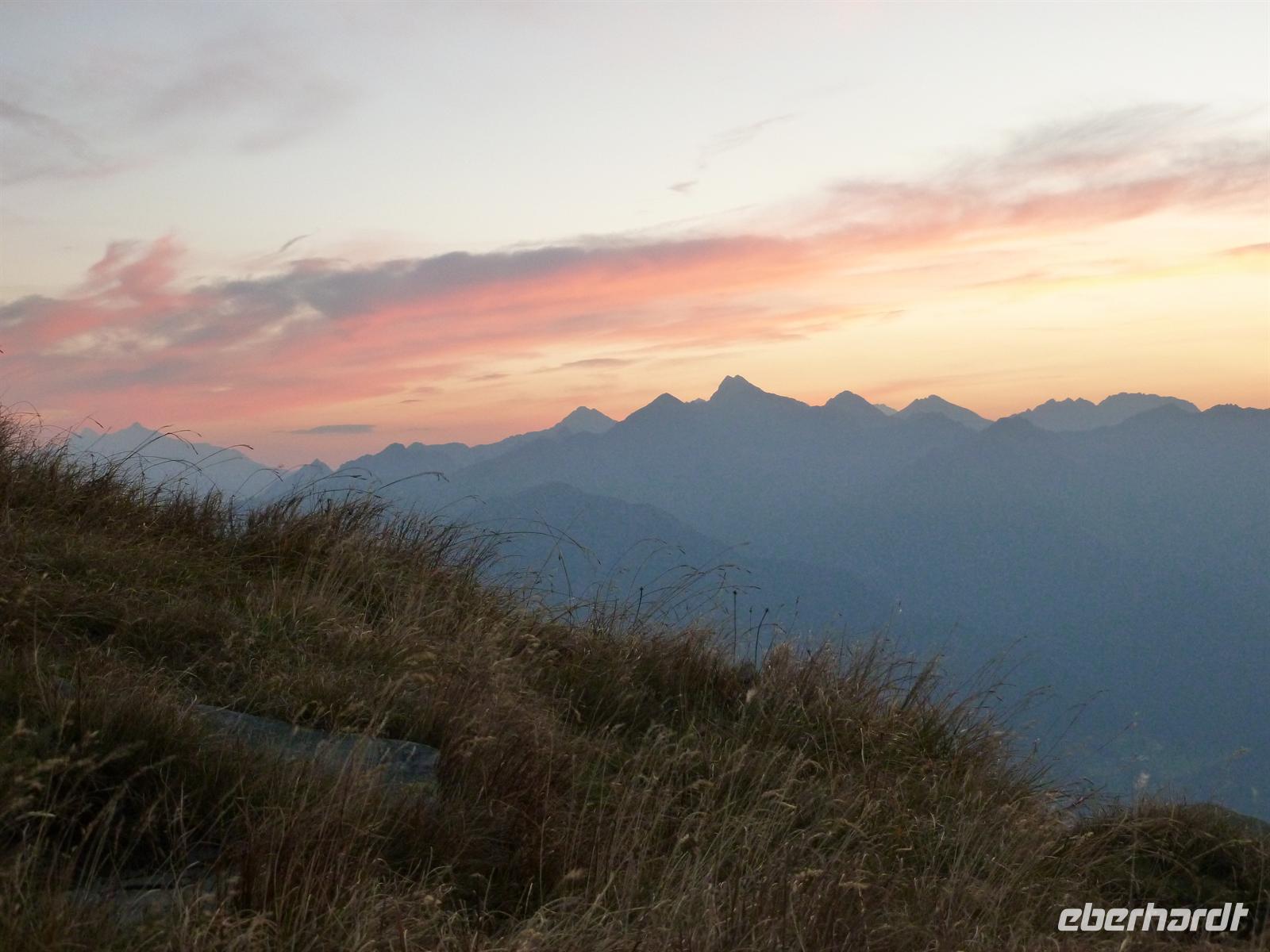 Nachdem alle früh schlafen gegangen waren, wurden wir bereits um 4.15 Uhr geweckt um uns zur Sonnenaufgangswanderung auf den 2244m hohen Zinseler bereit zu machen. Wir fuhren mit Siggi zum Penseler Joch um von dort aus die 400 Höhenmeter zu überwinden. Warm eingepackt und mit Taschenlampen ausgerüstet marschierten wir durch die Nacht - vom Sternenhimmel und dem Mond begleitet. Entgegen unserer Erwartungen war es ein wolkenloser Morgen und nach und nach verfärbte sich der Himmel in warme Rottöne. Gut gelaunt kamen wir nach einer guten Stunde Gehzeit auf dem Gipfel an und feierten dies traditionell mit einem Bergschnaps, der uns bei 6 Grad Außentemperatur gut einheizte. Dann konnten wir langsam den aufsteigenden roten Ball am Horizont beobachten und einfach nur die Ruhe genießen.