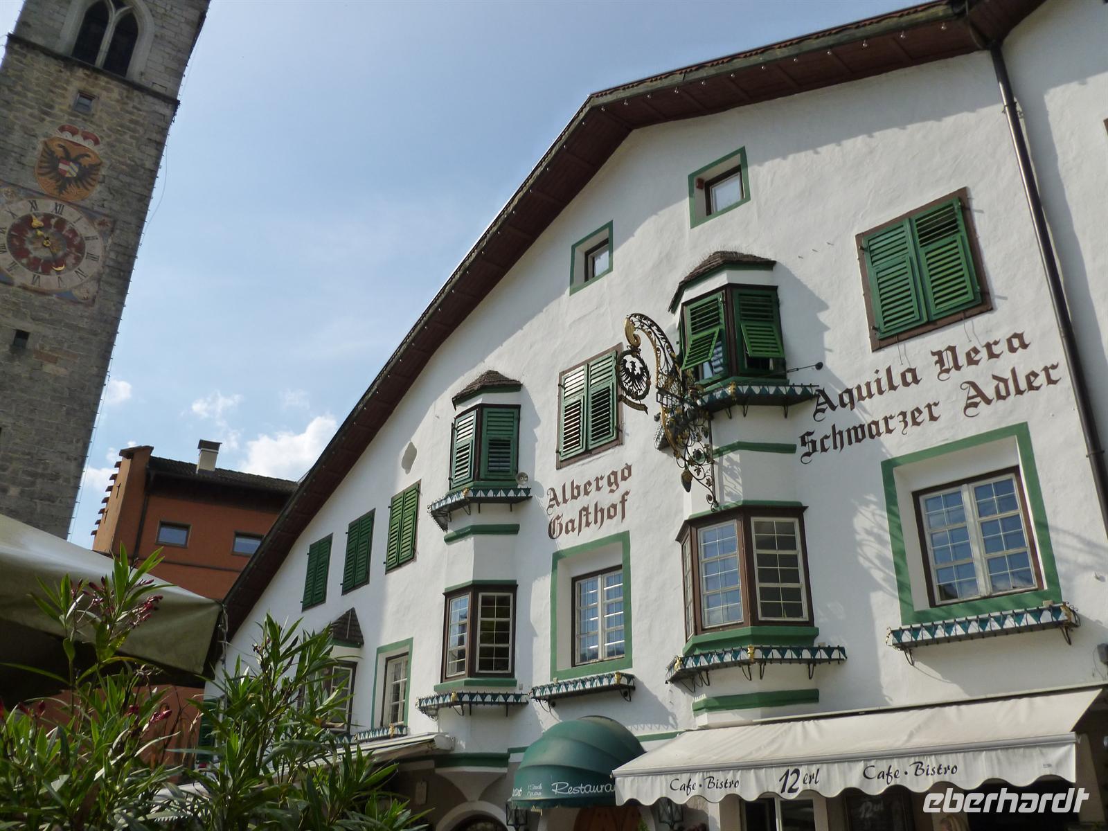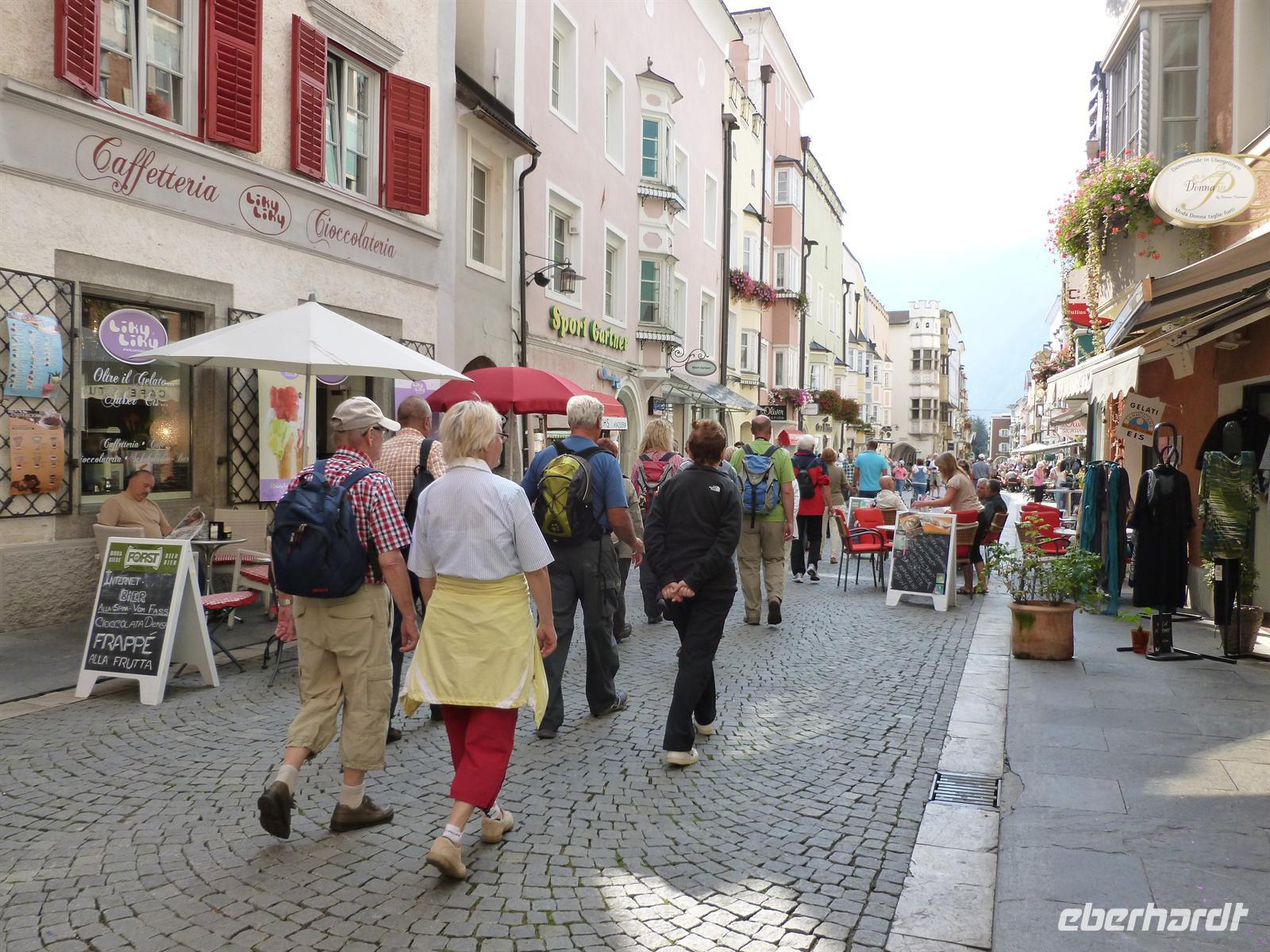 Natürlich durfte auch ein Eintrag ins Gipfelbuch und ein Gruppenfoto nicht fehlen. Dann ging es wieder bergab und auch die Bergziegen wünschten uns einen guten Morgen. Langsam schlich sich ein leichtes Hungergefühl ein, aber zum Glück hatten Klaus und Joachim bereits das Frühstück am Fuße des Zinselers vorbereitet. Frischer Kaffee, Brötchen, Wurst, Marmelade - es war alles da, was das Herz begehrte. Anschließend fuhren wir noch einmal hoch zum Penser Joch um ein paar Fotos zu schießen, bevor es wieder zurück ins Hotel ging. Nach einer kurzen Erfrischungspause, fuhren wir nach Sterzing, um dort mit Siggi einen kleinen Rundgang zu unternehmen. Wir sahen die hübschen, engen Gassen, deren Häuser alle verzierte Erker hatten. Außerdem konnten wir das Rathaus und den Ratssaal besichtigen. Durch den Zwölferturm hindurch, der die Altstadt von der Neustadt trennt, konnten wir weitere kleine Einkaufs- und Einkehrmöglichkeiten entdecken. Anschließend hatte jeder noch etwas Zeit für sich, bis Klaus uns bis nach Stange chauffierte. Von dort wanderten wir genussvoll durch die Gilfenklamm, deren Wassermassen wir eindrucksvoll hinabstürzen sahen. Zurück am Bus ging es auch schon wieder ins Hotel, wo uns Familie Wieser mit lecker Kuchen und Kaffee erwartete. Was für ein schöner, erlebnisreicher Tag! Nun hieß es Beine hochlegen oder noch eigene Entdeckungen im Ort machen. Jeder hatte es sich redlich verdient!
