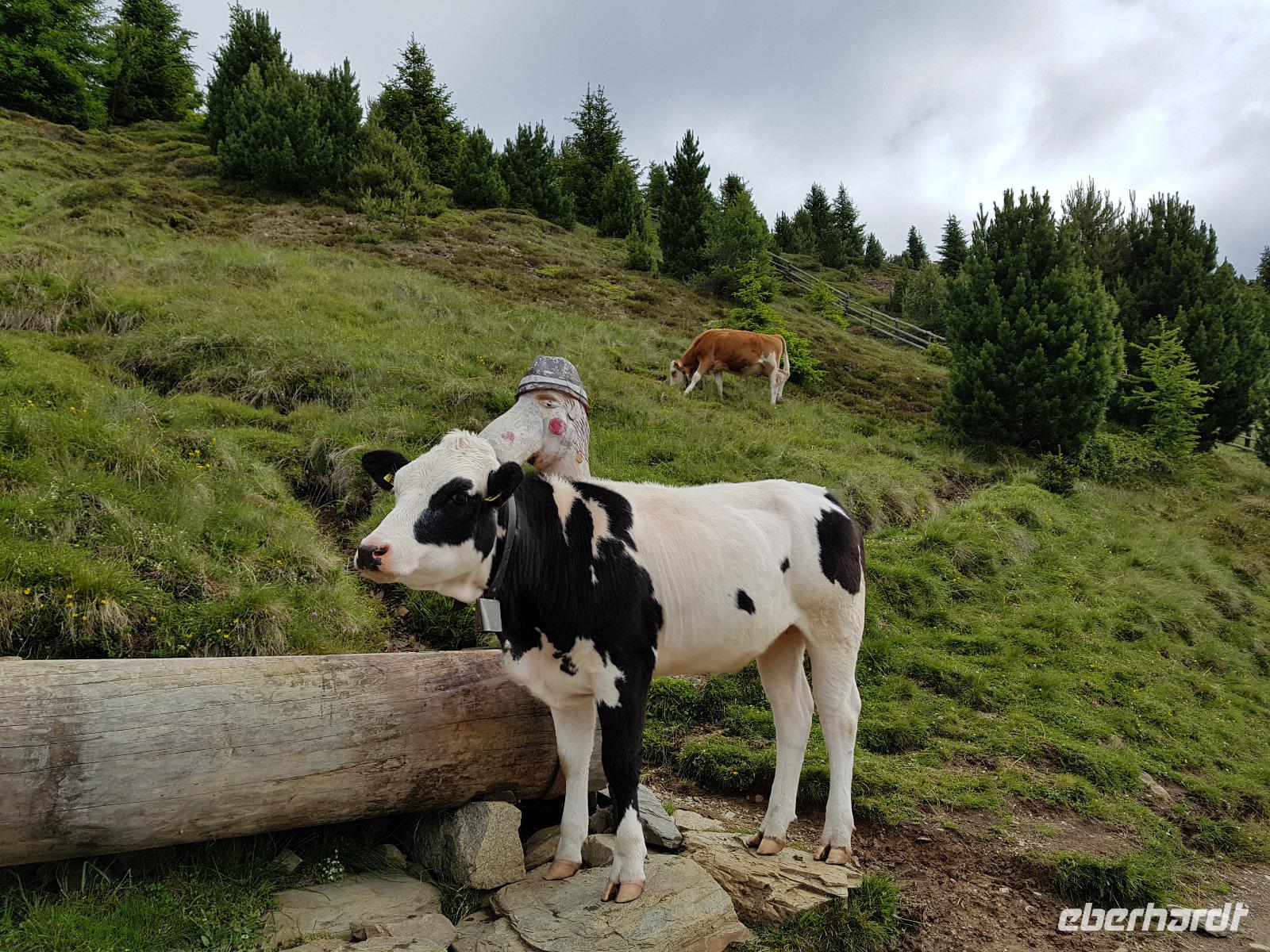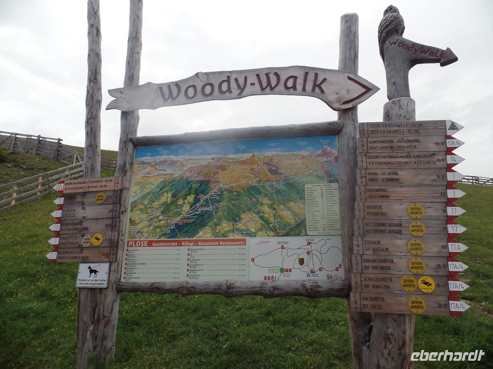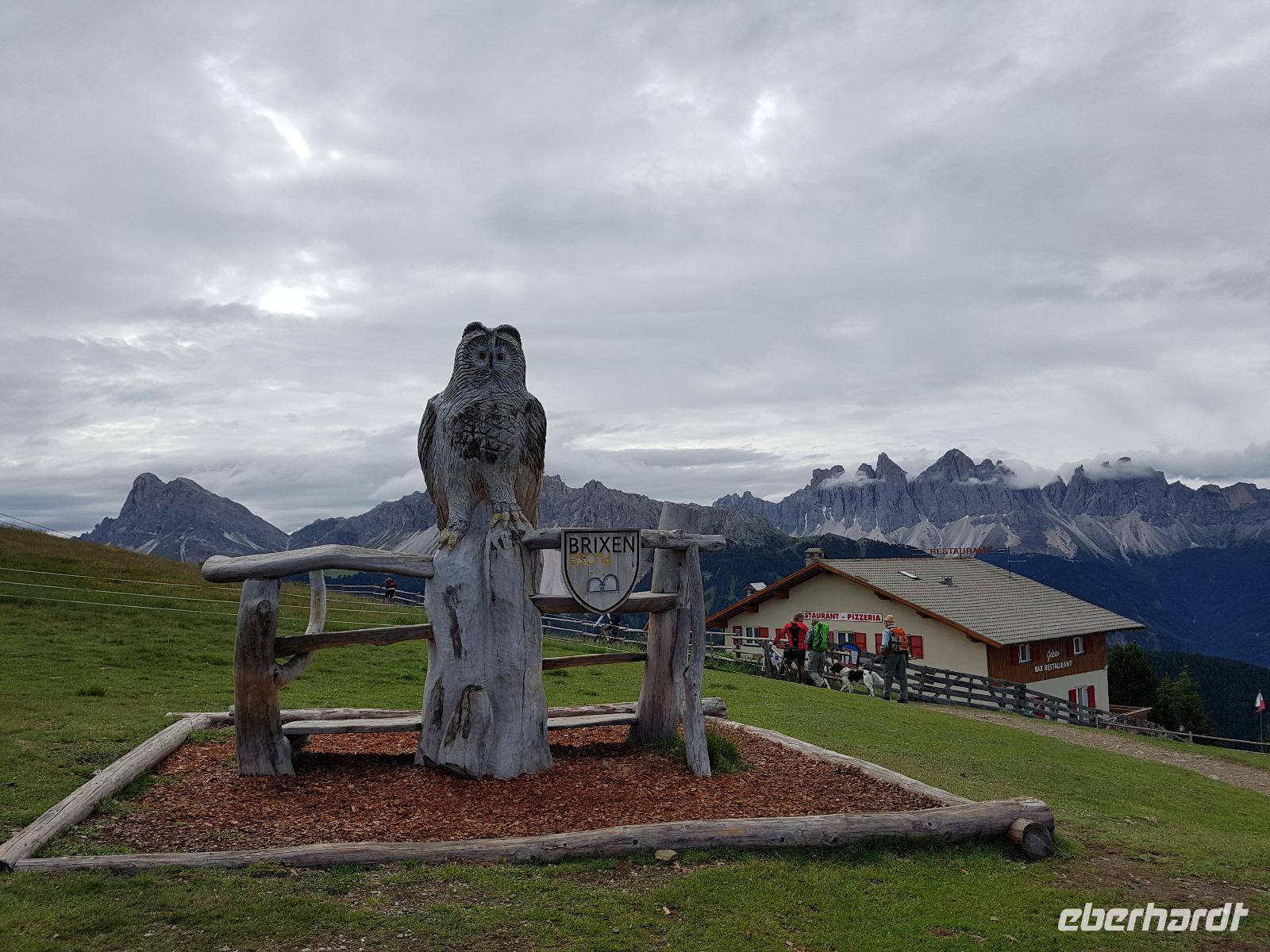 Letzte Woche hatte es hier nur fast immer geregnet aber wir haben Glück mit dem Wetter und so wird die Woche bleiben;) Um 7 Uhr werden uns täglich die Glocken von der Kirche aufwecken, um uns zu sagen, dass ein neuer Tag beginnt;) Zu unserem ausgiebigen und reichhaltigen Frühstück im Hotel brachten viele von uns unsere Dosen, um dort unsere Lunchpakete für die Wanderung selbst zurecht zu machen und mitzunehmen. Das ist sehr angenehm. Es fehlt an nichts. Um 9 Uhr machten wir los und auf der Busfahrt informierte uns jeden Tag unser einheimischer Wanderführer Siegfried über Land und Leute. Dank diesen interessanten Informationen verging täglich die Fahrt ganz gemütlich. Nach ca. 12 km erreichten wir unseren heutigen Ausgangspunkt Kreuztal, das schon auf 2.050 Meter Meereshöhe liegt. Unser erste Wandertag führte,uns auf die Plose, den Hausberg hoch oberhalb der alten Bischofsstadt Brixen, die wir am Nachmittag als Überraschung besichtigen werden. Wir müssten mit dem Seilbahn hoch fahren da der Bus könnte dieses Jahr nicht bis nach oben fahren. Nach einer kurzen Toilettenpause hier oben in Kreuztal starteten wir ca. 10.45 Uhr unsere heutigen Wanderung. Wir wanderten durch den Erlebnispark "Woodywalk" auf dem Dolomiten Panoramaweg. Wir laufen in gemütlicher Wanderung eine Stunde bis um 11.40 Uhr und erreichten die Rossalm. Hier bei der Skihütte legten wir eine erste Pause ein für Kaffe, Bier oder einfach nur Toilette. Einige von uns verkosteten schon heute hier frische Buttermilch aus eigener Herstellung.