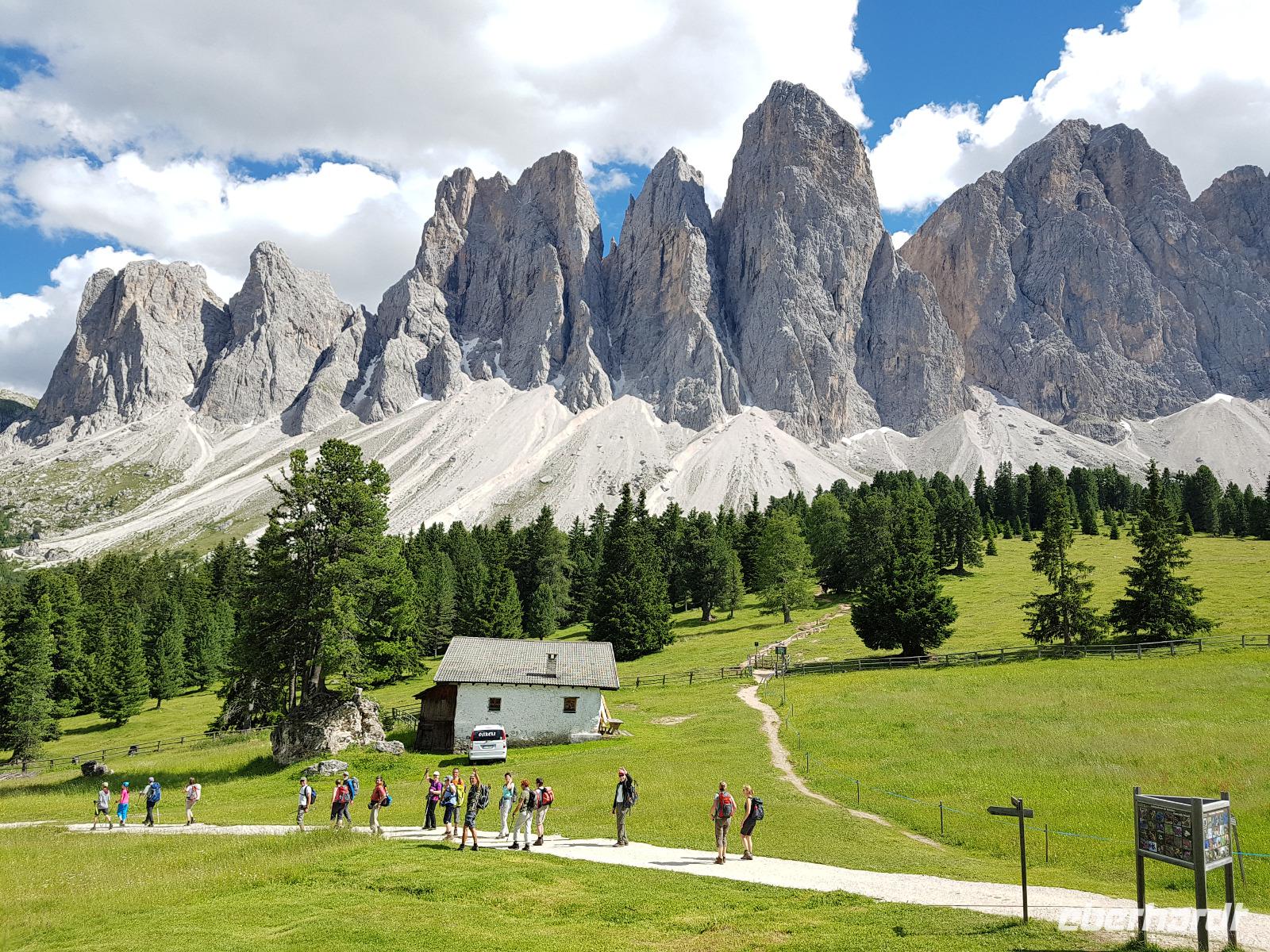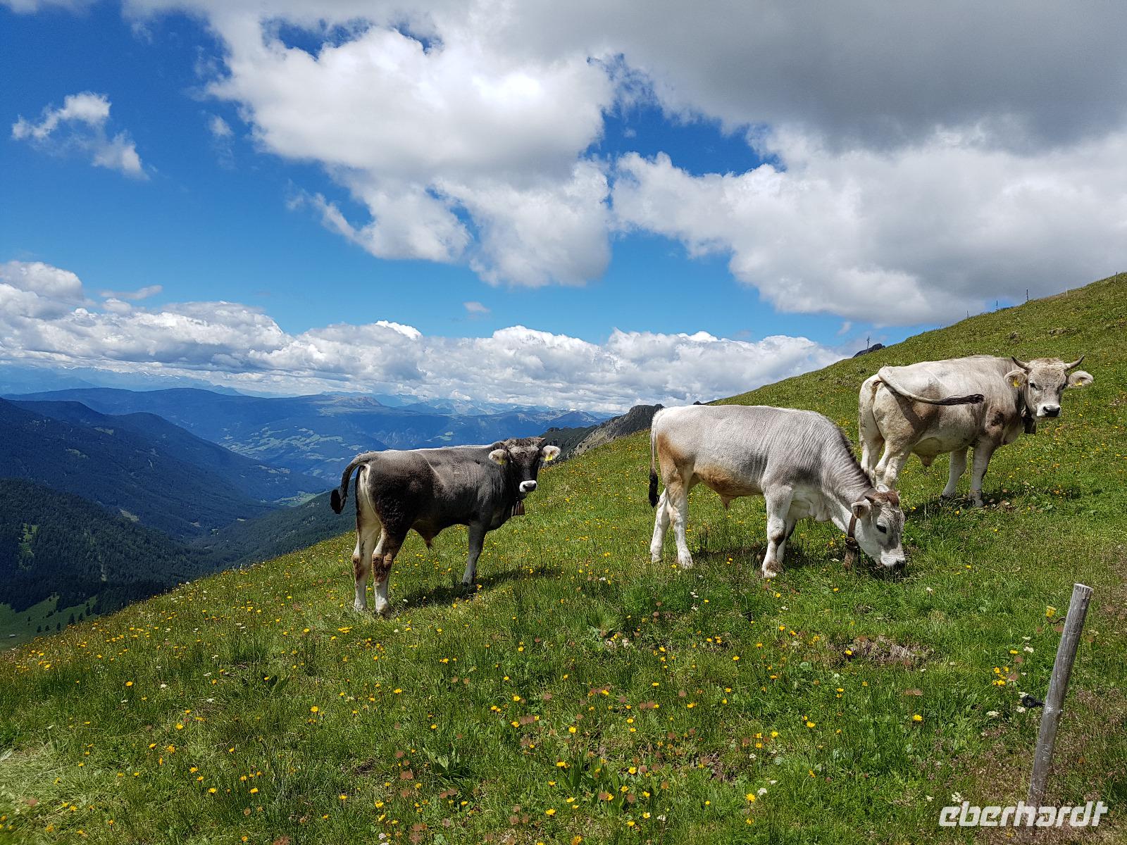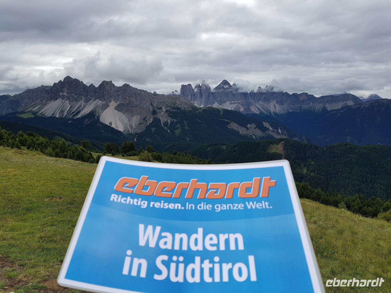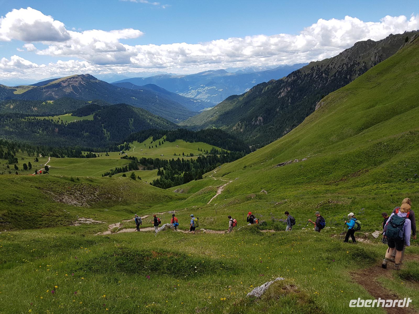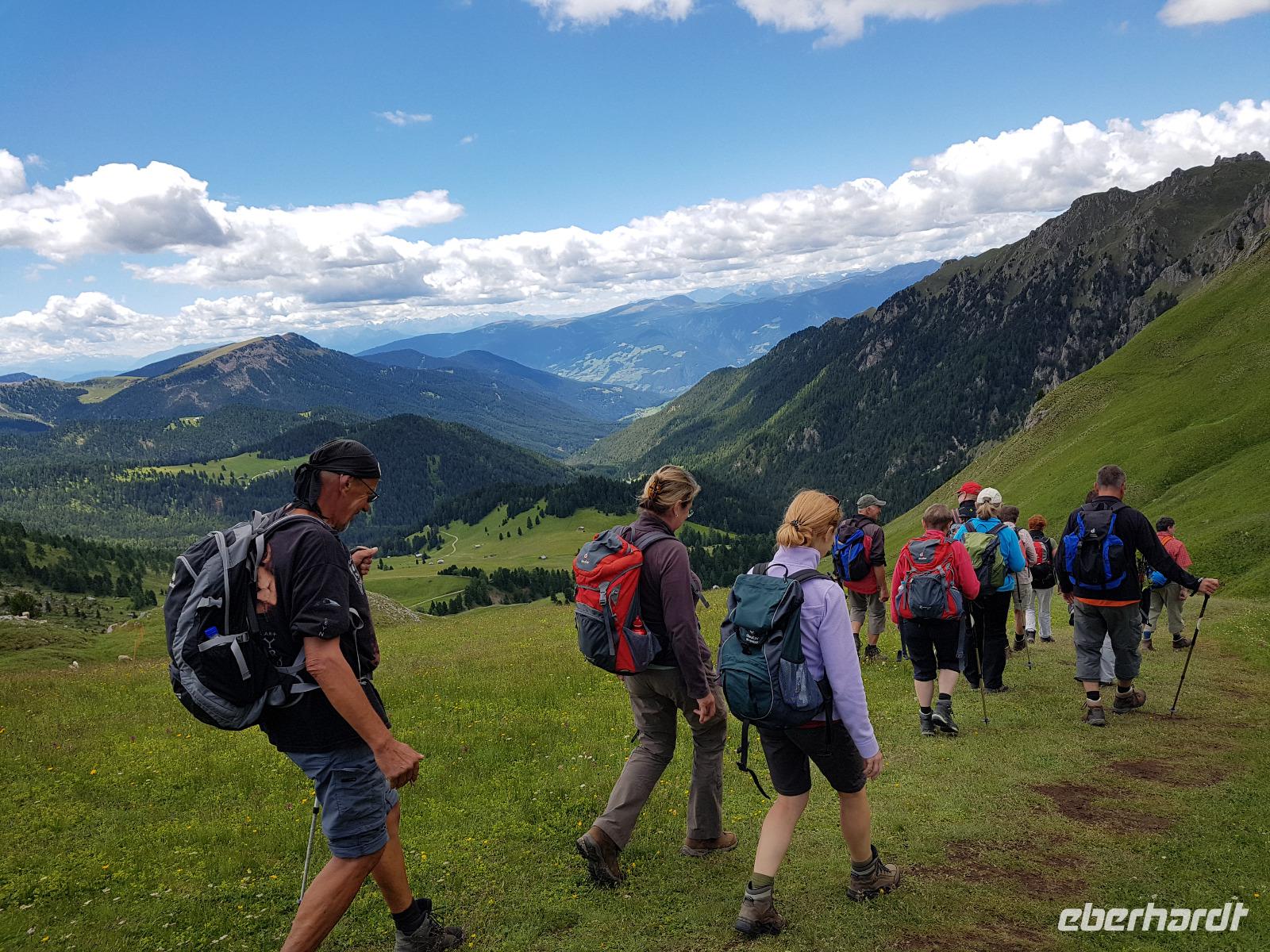 Von der Gableralm ging es weiter auf dem Panoramaweg, dann der beeindruckende Abstieg über sanfte und saftige Bergwiesen mit einem herrlichen Blick auf die Aferer Geisler Spitzen und mit Blick zu den Nordabstürzen des Peitlerskofles und der Tiefblick hinunter ins Eisacktal. Am Nachmittag erreichten wir auf unserer Runde die "Schatzeralm", wo wir auf der Terrasse vor dem Hintergrund der Aferer Geisler Spitzen einen Kaffee tranken. Um ca. 15 Uhr kamen wir an der Skihütte (1.900 Meter) an, wo Busfahrer Christoph auf uns wartete und uns wieder in Empfang nahm. Die erste Wanderung heute war einfach majestätisch und wurde von allen bequem geschafft. Die Strecke ist im Reiseablauf der Gäste als einfach bis moderat bezeichnet und so war es auch. 15,2 Kilometer - 4,5 Stunden - 21.712 Schritte- 280 Meter Aufstieg und 430 Meter Abstieg. Herrlich!