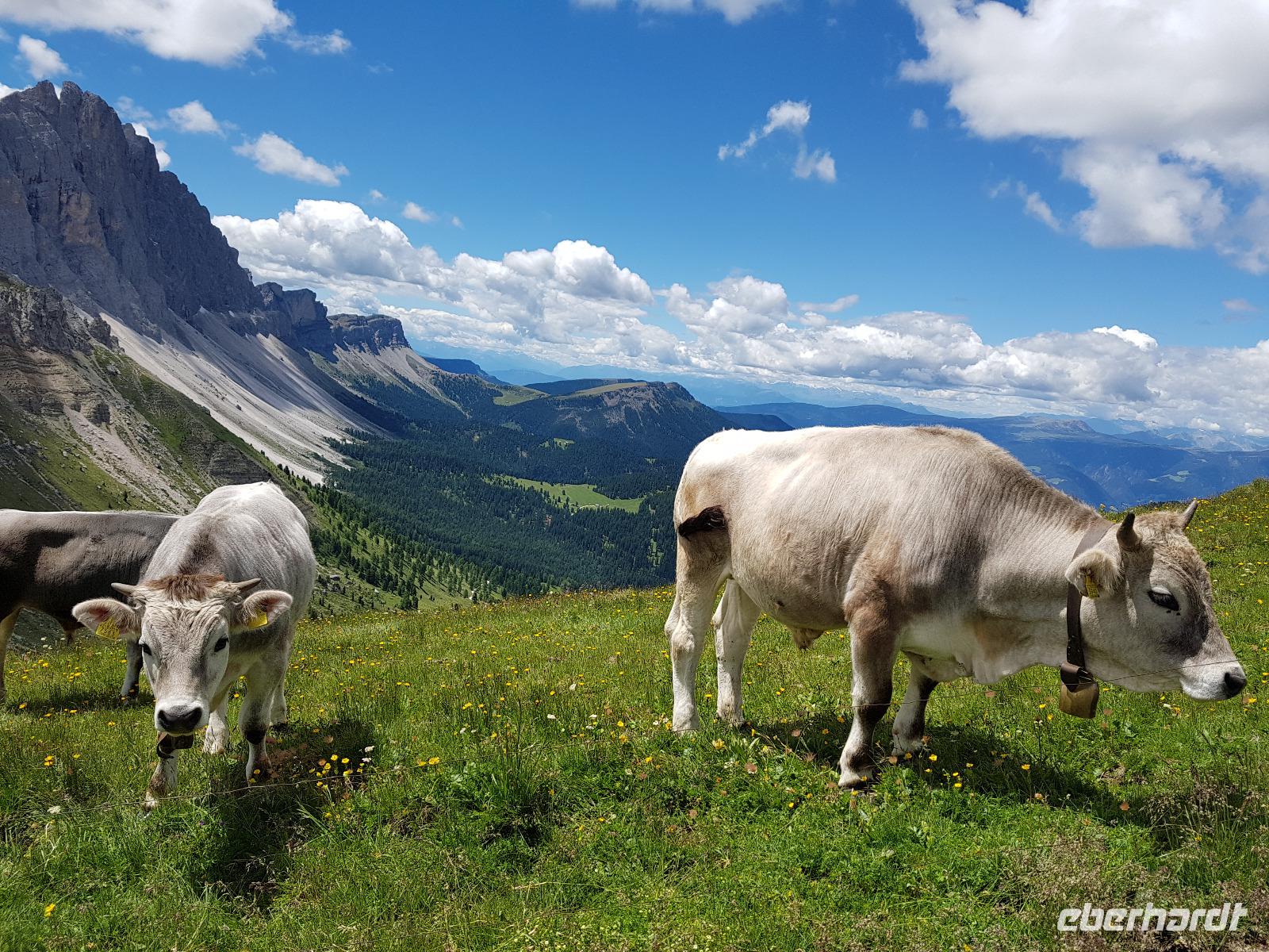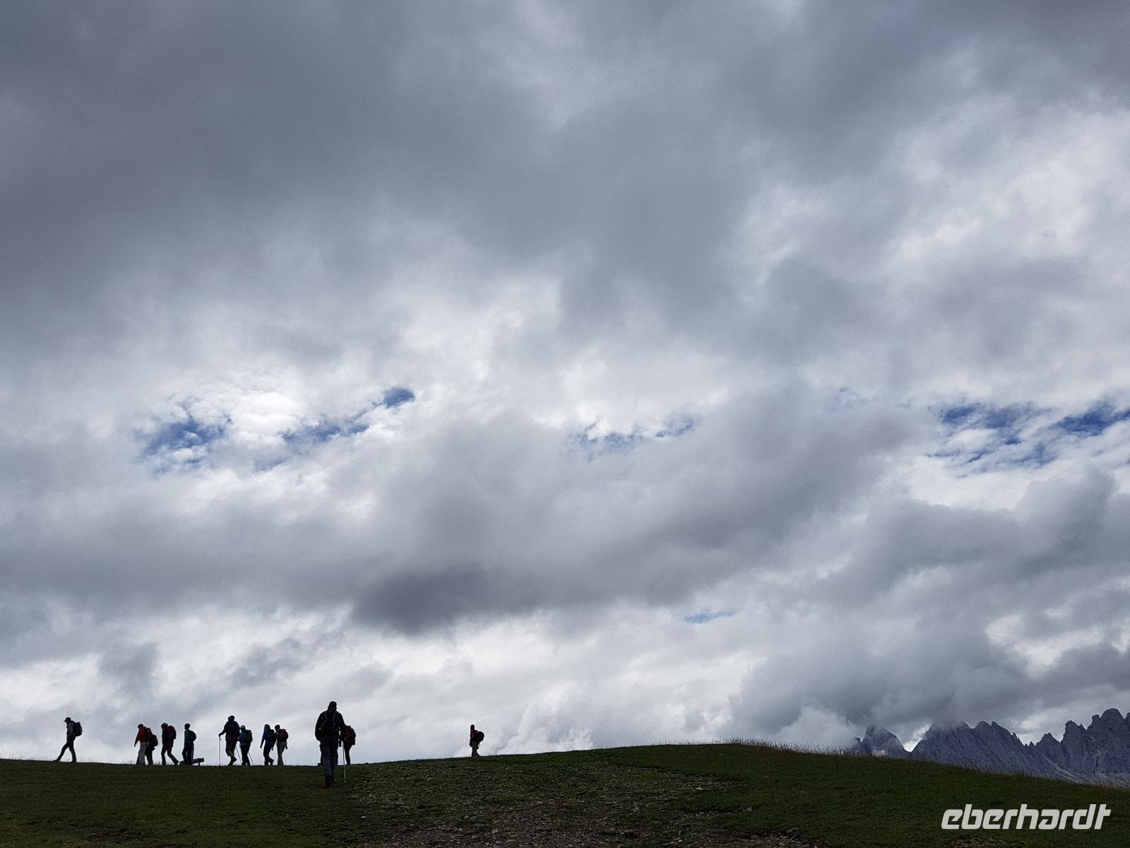 Weiter ging es über wunderschöne Almwiesen zur Schlüteralm in Richtung "Schlüterhütte" aber bevor wir es machten wanderten wir noch zu einem Gipfel nebenan. Nach einer weiteren halben Stunde erreichten wir die Gampenalm Rast, wo wir Toiletten Pause machen. Die Wolken ließen später ein paar Regentropfen fallen, aber der Tag war so schön, dass es uns nicht beim Abstieg gestört hat und wir gingen weiter das letzte Stück der Tagesetappe bis nach Zans im abgelegenen Villnösstal, wo Christoph und sein Rainer Bus auf uns warteten. Beim Abstieg beeindruckte uns der fantastische Blick auf die Villnösser Geisler Spitzen. So etwas Wundervolles. Wir hatten wieder Glück heute mit dem Wetter.