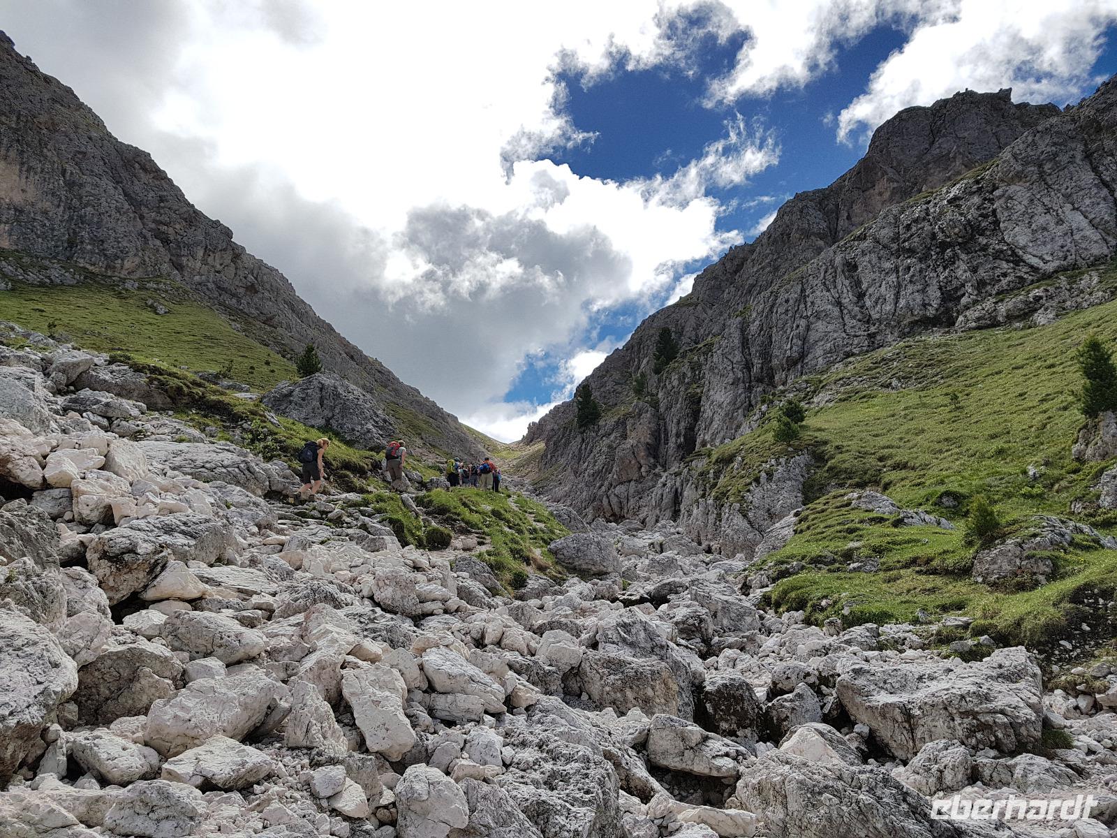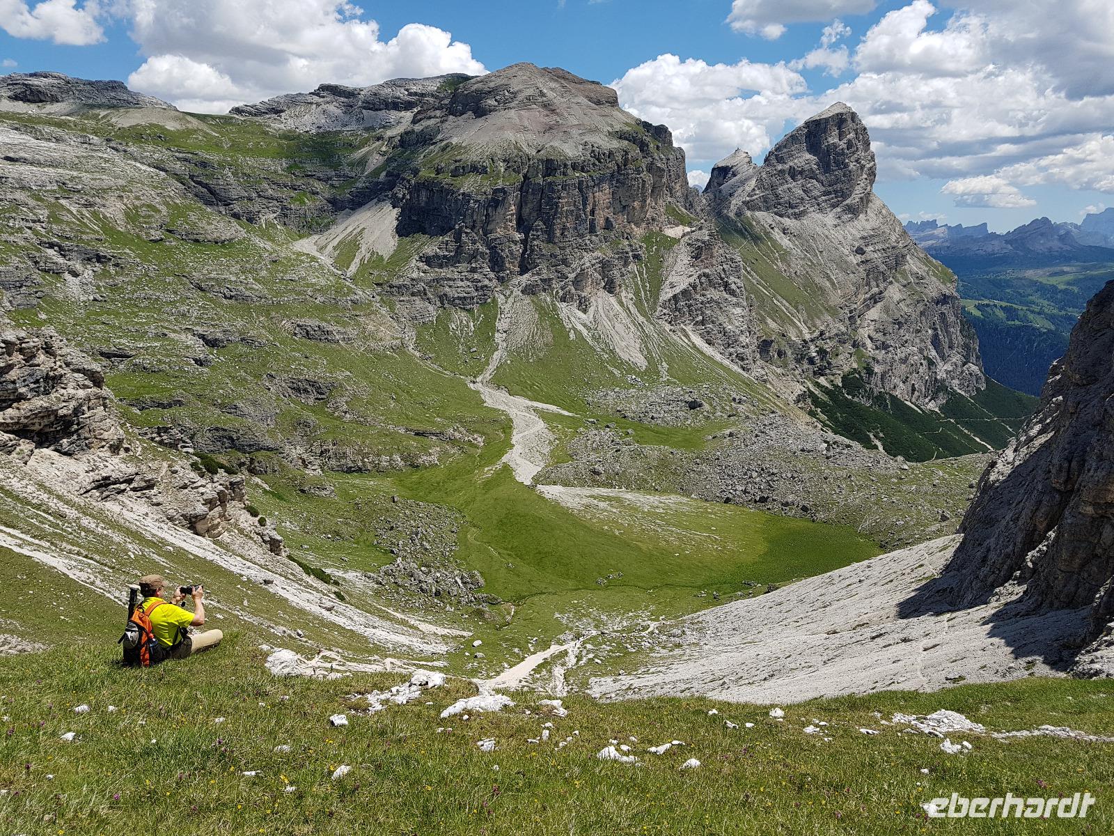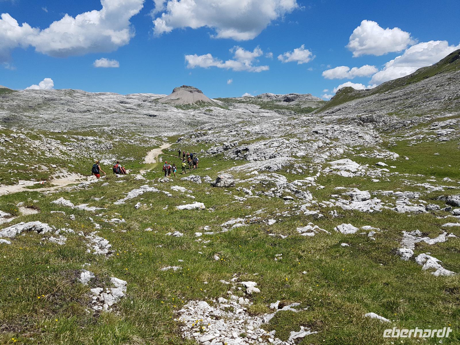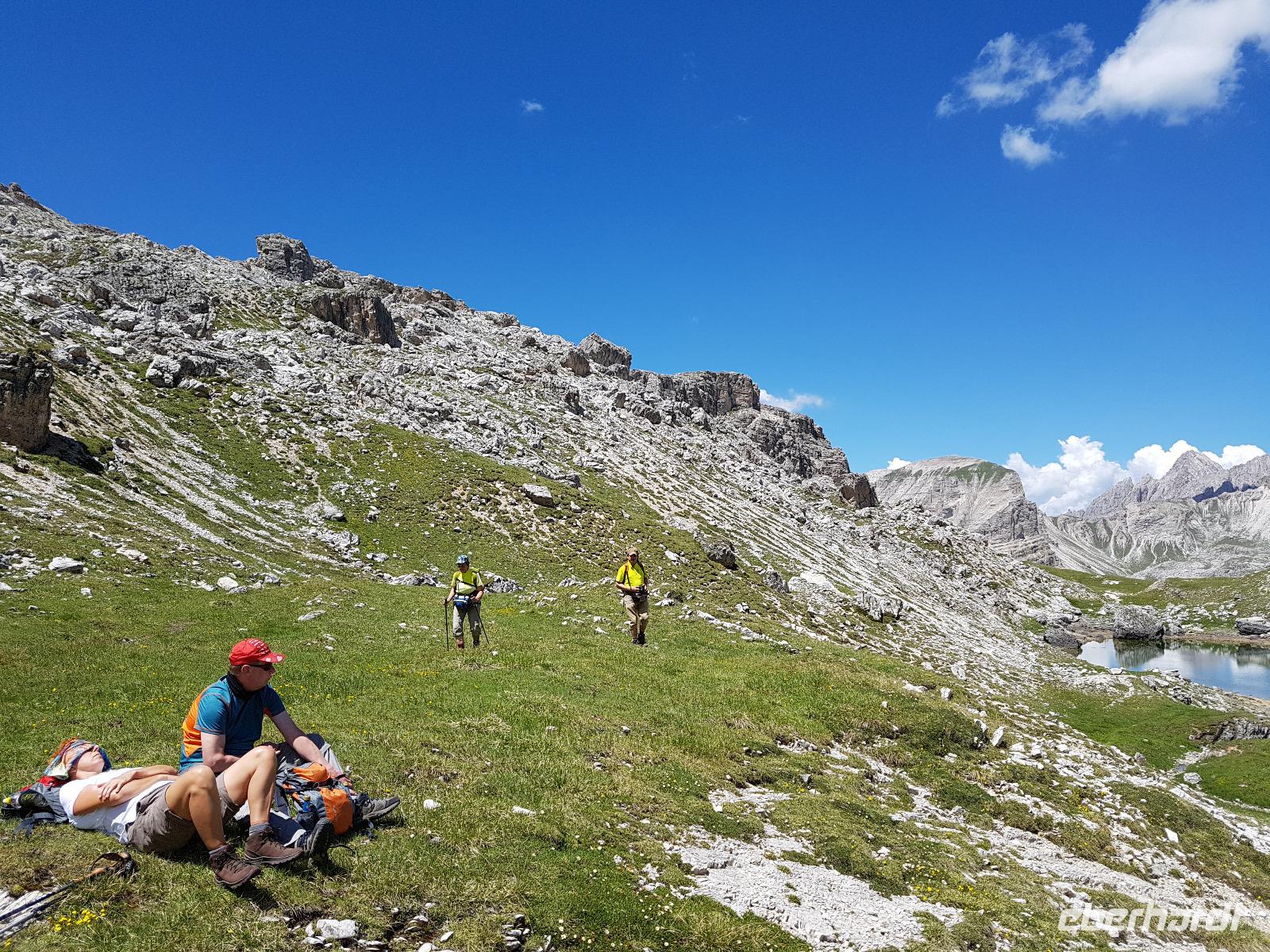 Wir stiegen erstmal über ein eher anspruchsvolleres, leicht schroffiges Gelände, über einen breiten Weg zwischen den Felsblöcken hinauf zum Cirjoch auf 2.466 Meter, wo wir einen von vielen Fotostopps machten. Von hier ging es weiter hinab ins Cedultal und dann wieder hinauf über mehrere Serpentinen zum Crespeinjoch in 2.528 m Höhe, dem höchsten Punkt der heutigen Wanderung. Als Entschädigung für die Anstrengung hatten wir vor uns einen fantastischen Ausblick über die Hochebene und Almwiesen, wo wir Mittagspause und sogar eine kurze spanische Siesta machten. Es gab hier einen See wo Benjamin schnell ging um zu schwimmen. Herrlich! Über eine Crespeinahochfläche erreichten wir das Ciampaijoch auf 2.366 m Höhe. Wir befanden uns auf der Hochfläche des Puez, die in ihrer Formengebung wie eine Mondlandschaft aussieht.