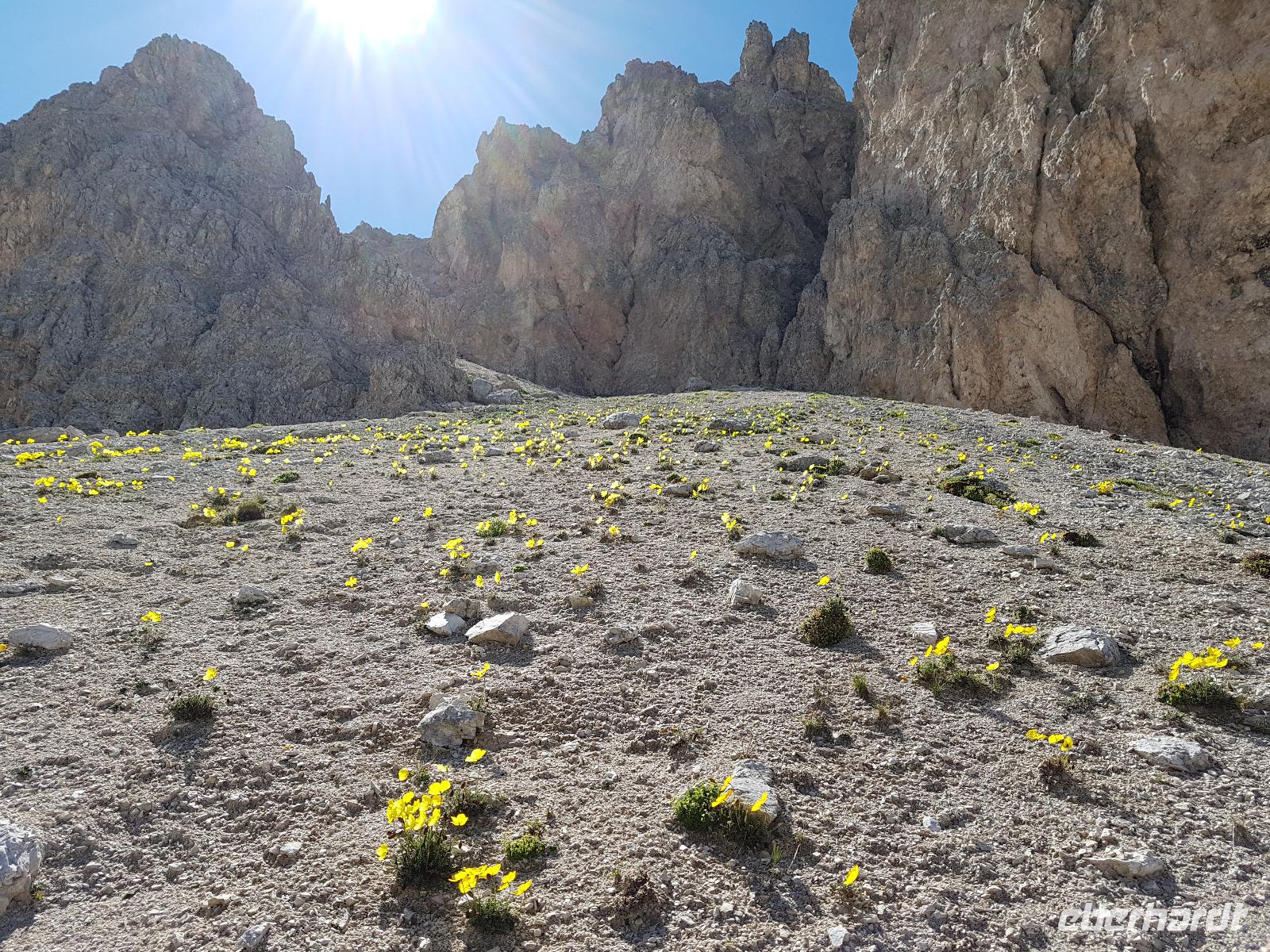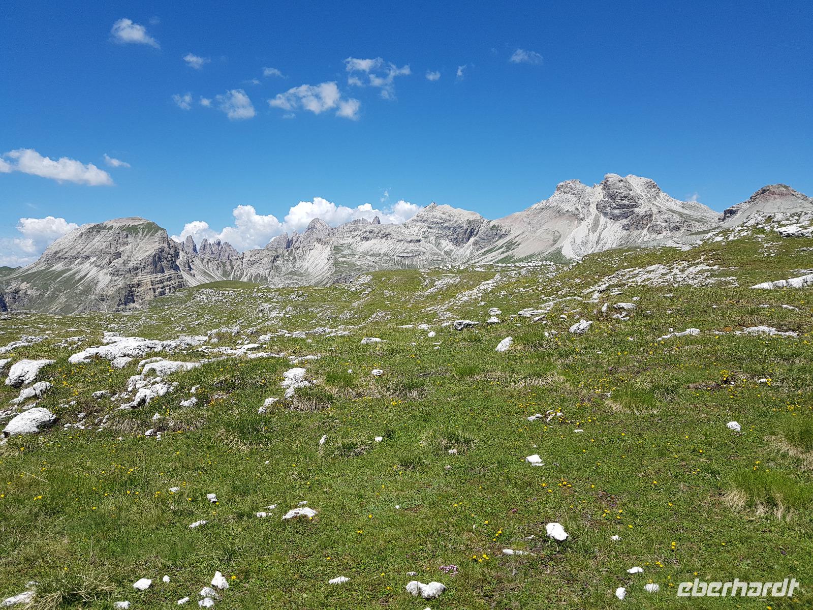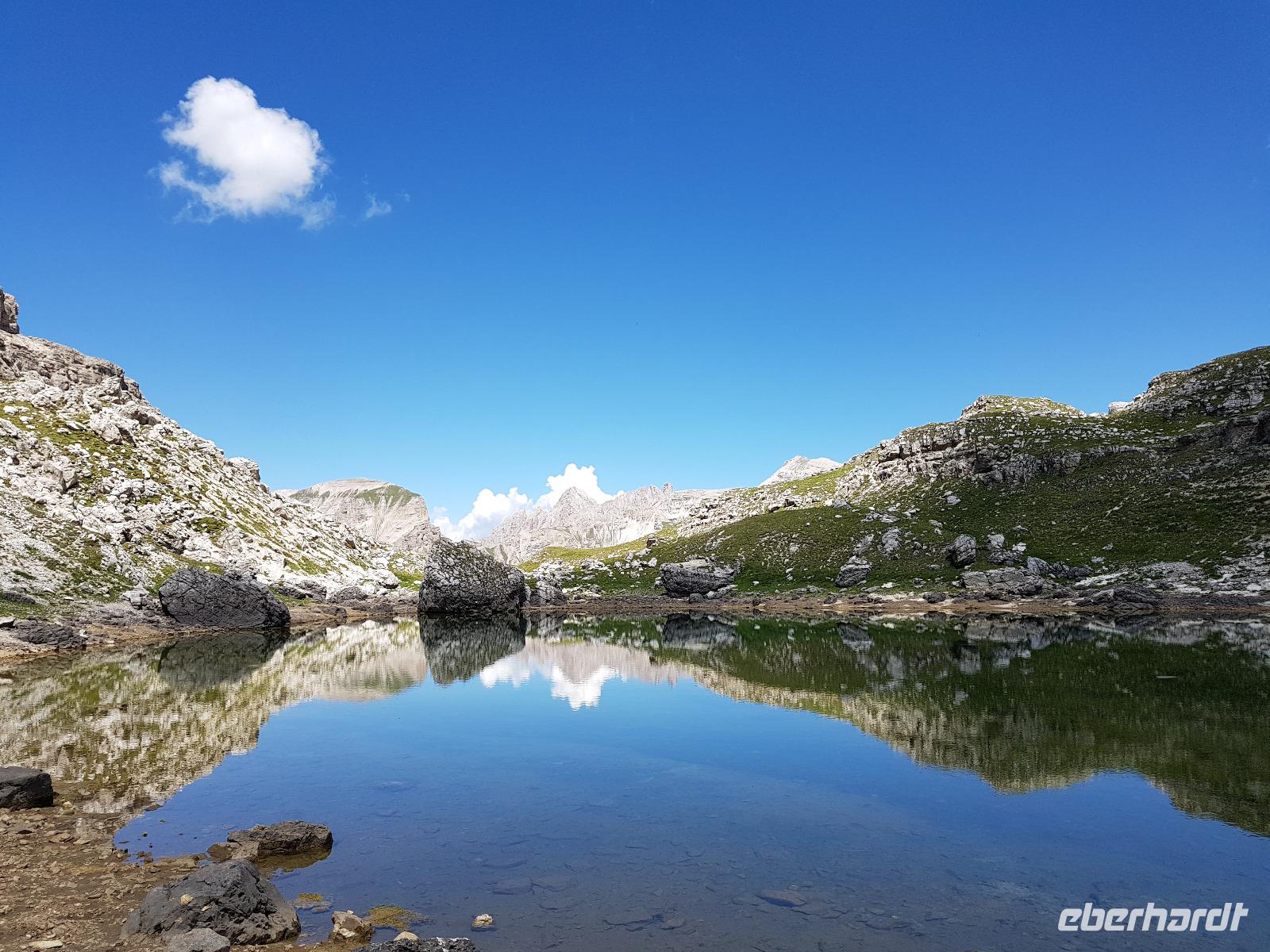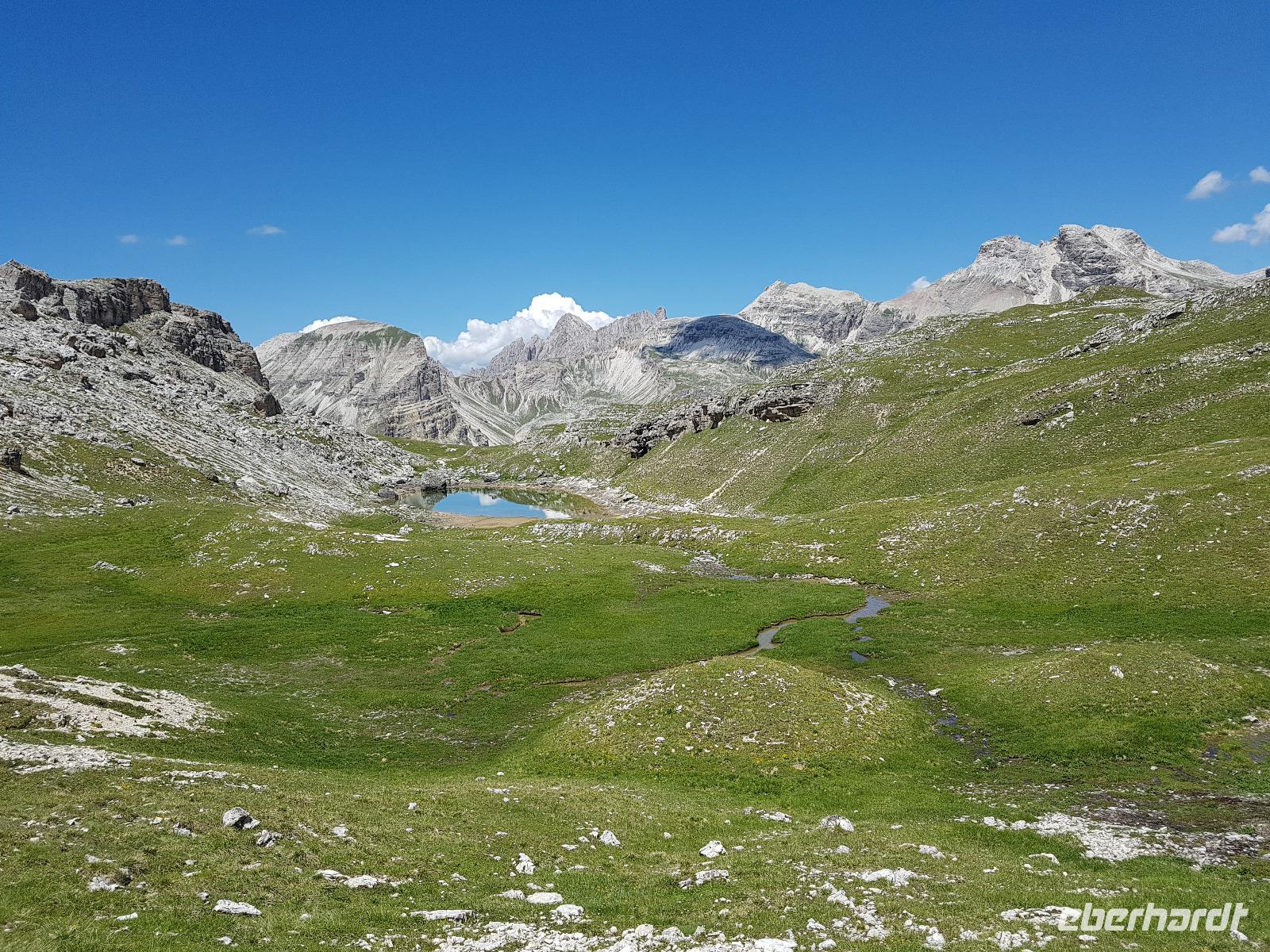 Wir stiegen erstmal über ein eher anspruchsvolleres, leicht schroffiges Gelände, über einen breiten Weg zwischen den Felsblöcken hinauf zum Cirjoch auf 2.466 Meter, wo wir einen von vielen Fotostopps machten. Von hier ging es weiter hinab ins Cedultal und dann wieder hinauf über mehrere Serpentinen zum Crespeinjoch in 2.528 m Höhe, dem höchsten Punkt der heutigen Wanderung. Als Entschädigung für die Anstrengung hatten wir vor uns einen fantastischen Ausblick über die Hochebene und Almwiesen, wo wir Mittagspause und sogar eine kurze spanische Siesta machten. Es gab hier einen See wo Benjamin schnell ging um zu schwimmen. Herrlich! Über eine Crespeinahochfläche erreichten wir das Ciampaijoch auf 2.366 m Höhe. Wir befanden uns auf der Hochfläche des Puez, die in ihrer Formengebung wie eine Mondlandschaft aussieht.