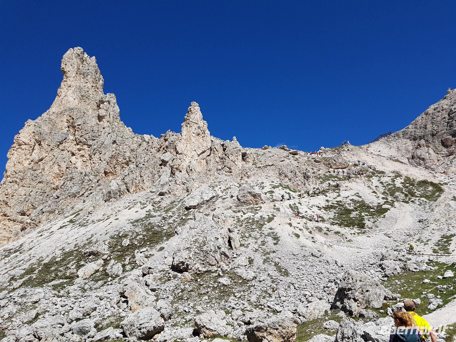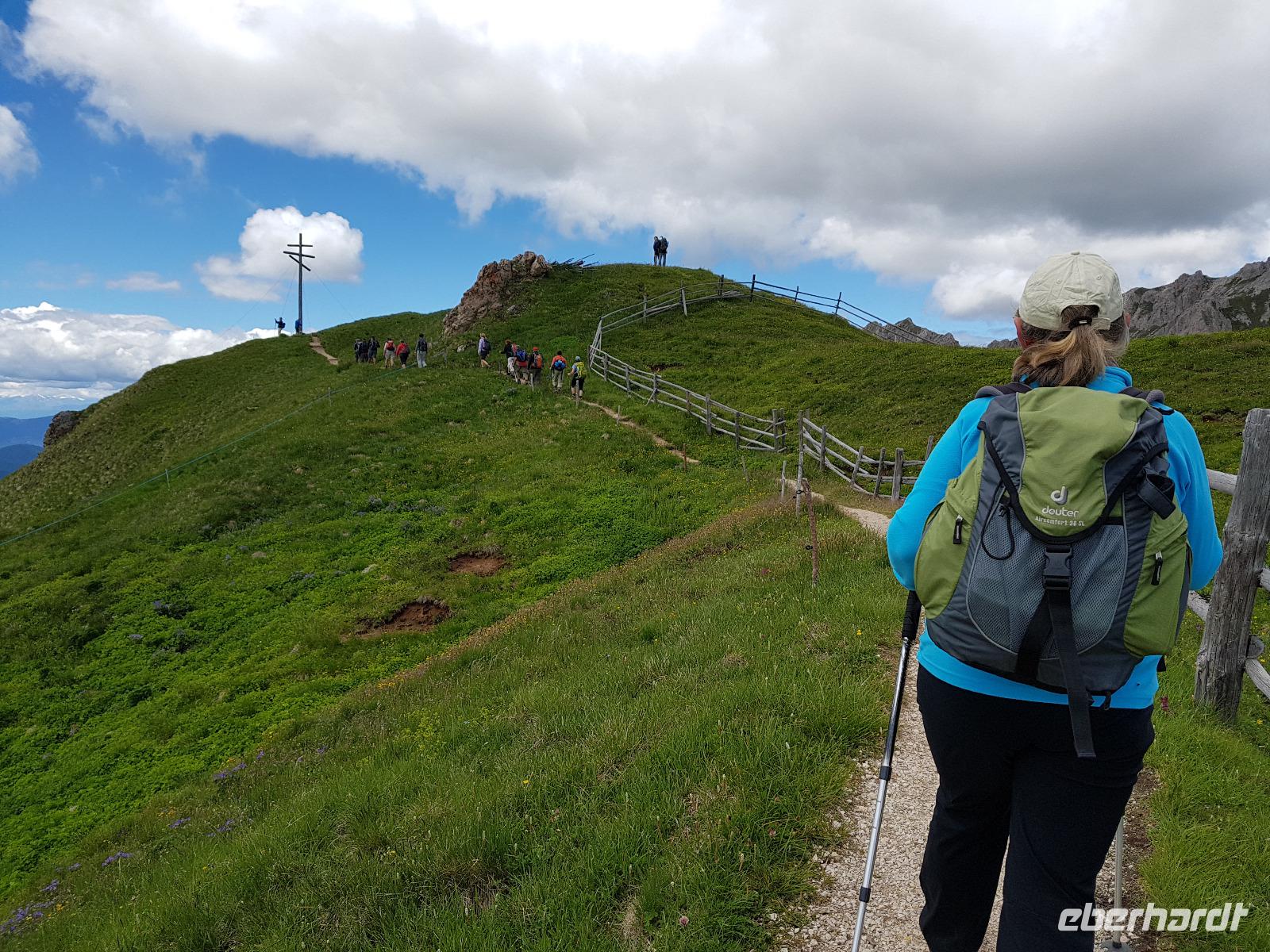Wir fuhren zuerst mit dem Busfahrer bis zur Seilbahnstation in Sterzing, wo wir die Auffahrt mit der Seilbahn-Gondel hinauf auf den Rosskopf (1.860 Meter) und weiter mit dem Sessellift auf 2.100 Meter Höhe machten, um dort oben die Wanderung entlang des lehrreichen Dolomieu Wanderweg Nr. 19 A zu starten. Erstmal den Gipfel vom Rosskopf nebenan besteigen. Weiter bestaunen wir die Schönheit der ungebändigten Natur und an verschiedenen Lehrtafeln, sowie mit Siegfried, lernten wir heute warum die Dolomiten so heißen: wegen des französischen Geologen Déodat de Dolomieu, der das Dolomitgestein beschrieben hat.