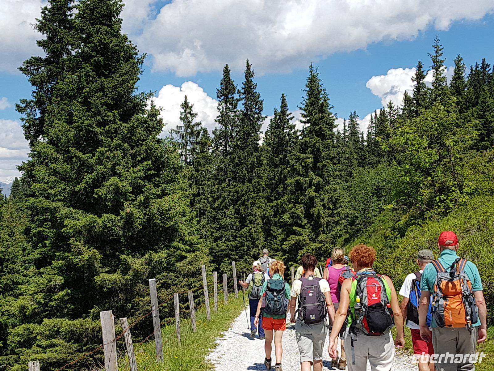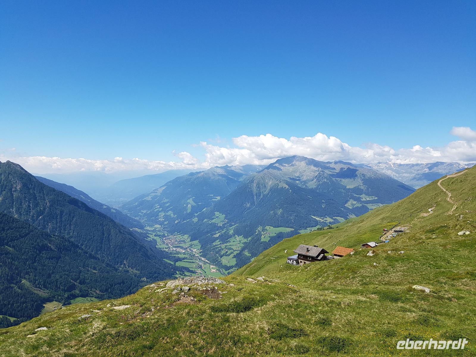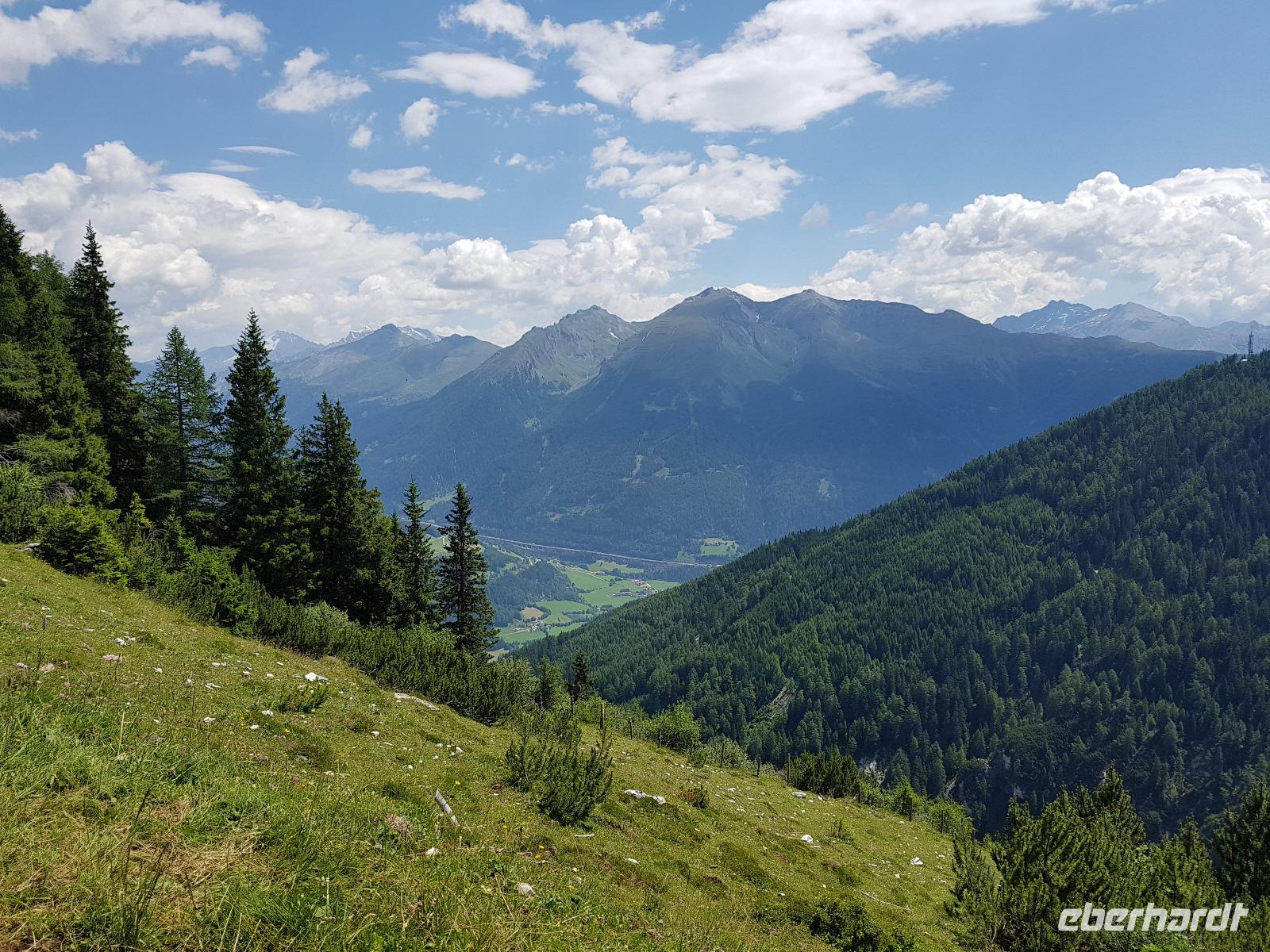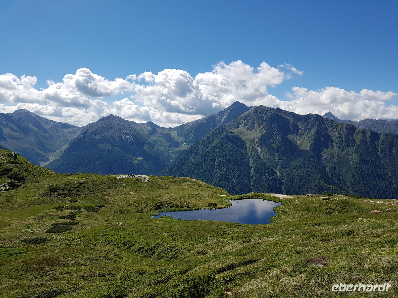 Unsere Wanderung führt uns über urige Almen an der Kastellacke vorbei. Wir gingen an der Natureiche und dem Bergsee Kastellacke vorbei. Wir hatten heute zahlreiche Ausblicke auf den mächtigen Alpenhauptkamm. Jeder Tag war einmalig schön und hatte nichts mit dem anderen zu tun. Eine große Vielfalt an Landschaft hier. An einem schattigen Plätzchen mit Blick auf den Pflerscher Gletscher, den Tribulaun und das Wipptal machten wir unsere Picknick-Pause. Wir erreichten über den guten ausgebauten Wanderweg die Vallminger Almen mit drei typischen Tiroler Almhütten. Hier bei der Ladurner Hütte auf 1.726 Meter Höhe machten wir ca. 13.30 Uhr eine Rast ohne Eile, um die einheimischen Gerichte oder selbstgemachten Käse zu verkosten. Wenn man heute nicht mehr laufen wollte, könnte hier noch bleiben und noch ein Weilchen hier oben und später direkt die Seilbahn zum Busparkplatz nehmen. Aber alle wollten weiter laufen. Um ca. 14 Uhr fingen wir unseren Abstieg über den Rodelbahnweg zur Talstation Ladurns an. Der Weg führt uns weiter durch traumhafte Wälder, über Wiesen und Geröllhalden mit Blick ab und zu ins Tal und immer wieder Ausblicke auf den Alpenhauptkamm. Wir gingen so eine gute Stunde lang den breiten Forstweg ins Tal hinab. Dort, an der Talstation in Ladurns, wartete der Busfahrer wieder auf uns und auf die anderen, die mit Sessellift hinunter gefahren sind, und gemeinsam fuhren wir zum Hotel Wieser, an dem wir heute so gegen 16.30 Uhr ankamen. Die 19,4 Kilometer Wanderung war eigentlich leicht - 27.184 Schritte in 5 Stunden - 220 Meter Aufstieg und 1.288 Meter Abstieg;)