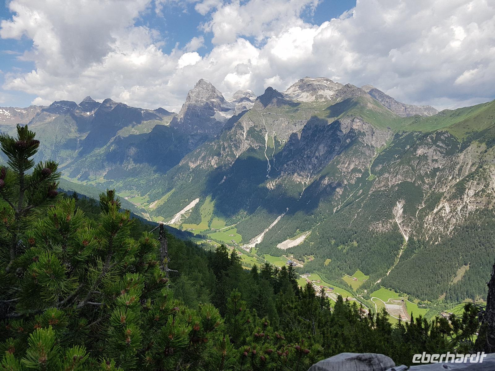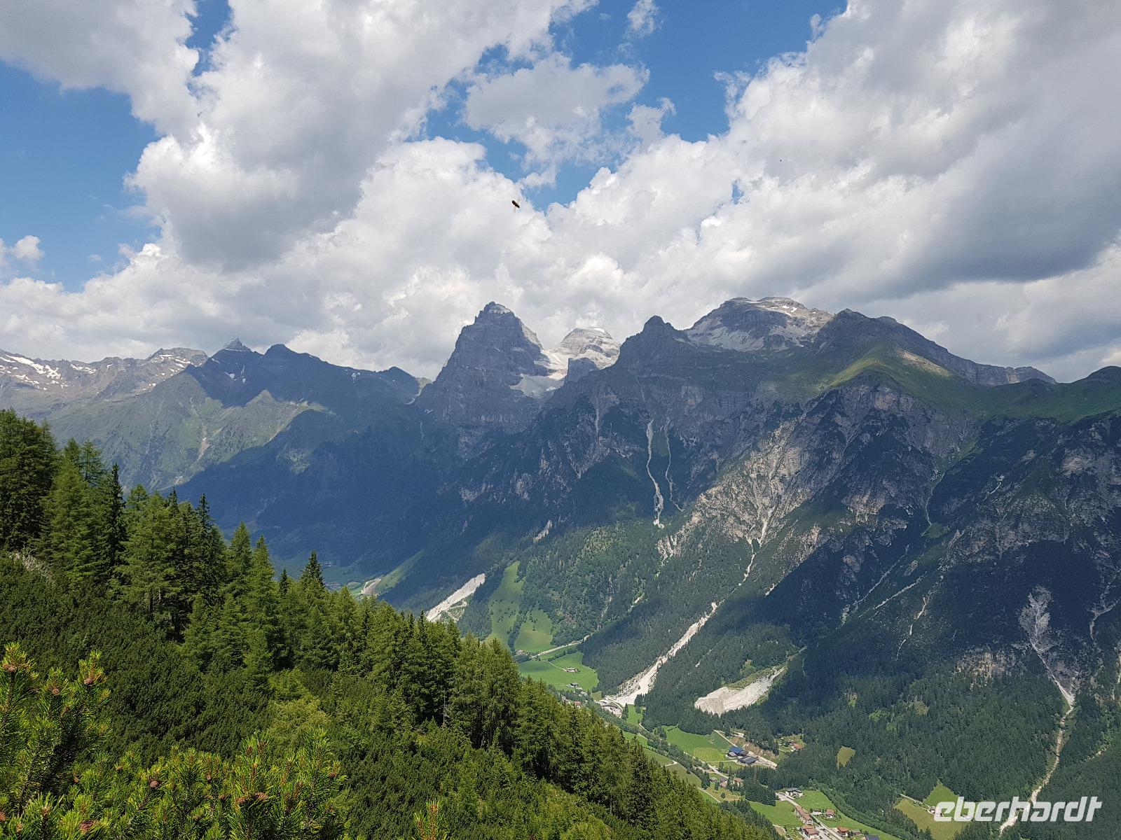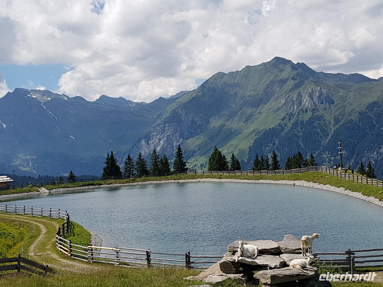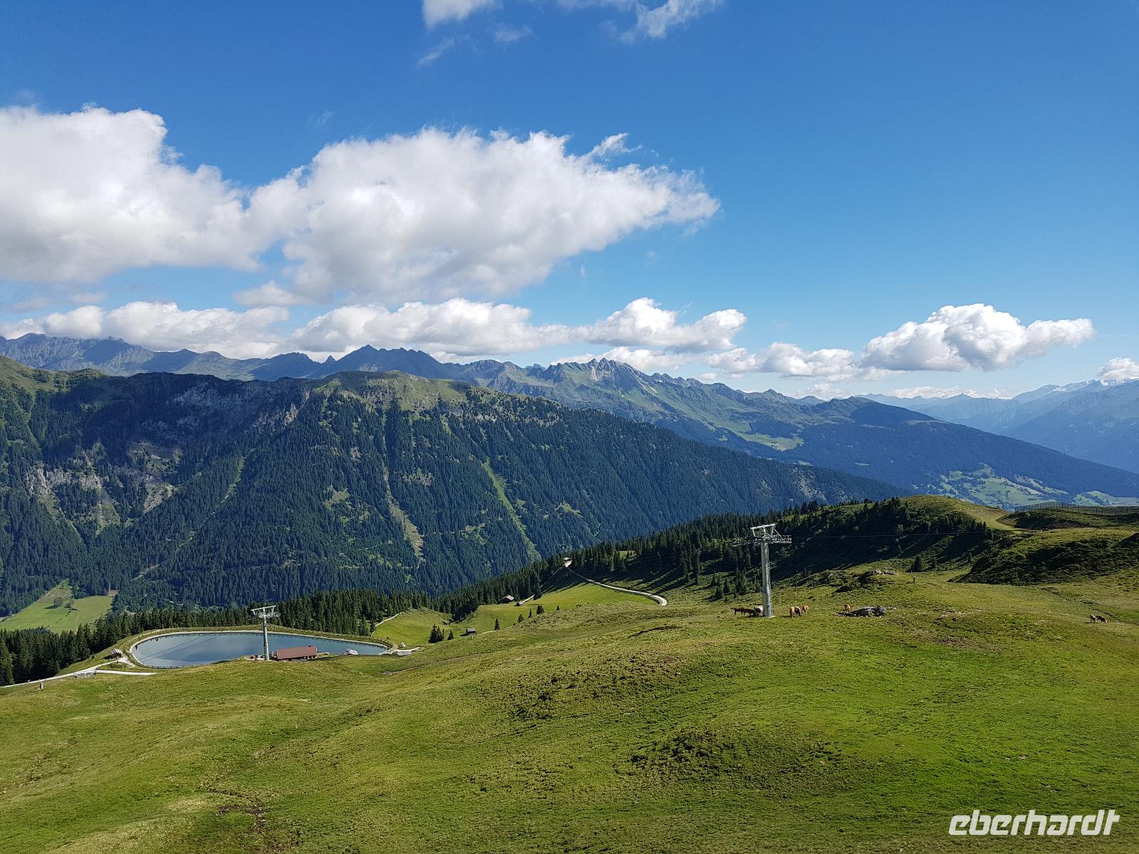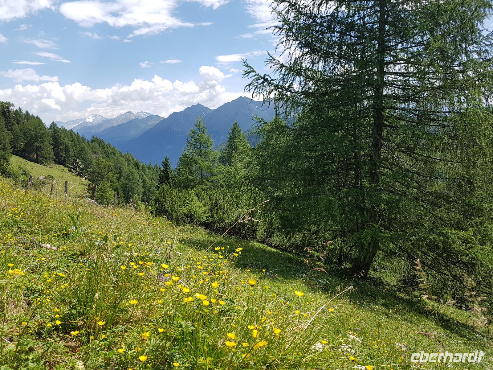 Unsere Wanderung führt uns über urige Almen an der Kastellacke vorbei. Wir gingen an der Natureiche und dem Bergsee Kastellacke vorbei. Wir hatten heute zahlreiche Ausblicke auf den mächtigen Alpenhauptkamm. Jeder Tag war einmalig schön und hatte nichts mit dem anderen zu tun. Eine große Vielfalt an Landschaft hier. An einem schattigen Plätzchen mit Blick auf den Pflerscher Gletscher, den Tribulaun und das Wipptal machten wir unsere Picknick-Pause. Wir erreichten über den guten ausgebauten Wanderweg die Vallminger Almen mit drei typischen Tiroler Almhütten. Hier bei der Ladurner Hütte auf 1.726 Meter Höhe machten wir ca. 13.30 Uhr eine Rast ohne Eile, um die einheimischen Gerichte oder selbstgemachten Käse zu verkosten. Wenn man heute nicht mehr laufen wollte, könnte hier noch bleiben und noch ein Weilchen hier oben und später direkt die Seilbahn zum Busparkplatz nehmen. Aber alle wollten weiter laufen. Um ca. 14 Uhr fingen wir unseren Abstieg über den Rodelbahnweg zur Talstation Ladurns an. Der Weg führt uns weiter durch traumhafte Wälder, über Wiesen und Geröllhalden mit Blick ab und zu ins Tal und immer wieder Ausblicke auf den Alpenhauptkamm. Wir gingen so eine gute Stunde lang den breiten Forstweg ins Tal hinab. Dort, an der Talstation in Ladurns, wartete der Busfahrer wieder auf uns und auf die anderen, die mit Sessellift hinunter gefahren sind, und gemeinsam fuhren wir zum Hotel Wieser, an dem wir heute so gegen 16.30 Uhr ankamen. Die 19,4 Kilometer Wanderung war eigentlich leicht - 27.184 Schritte in 5 Stunden - 220 Meter Aufstieg und 1.288 Meter Abstieg;)
