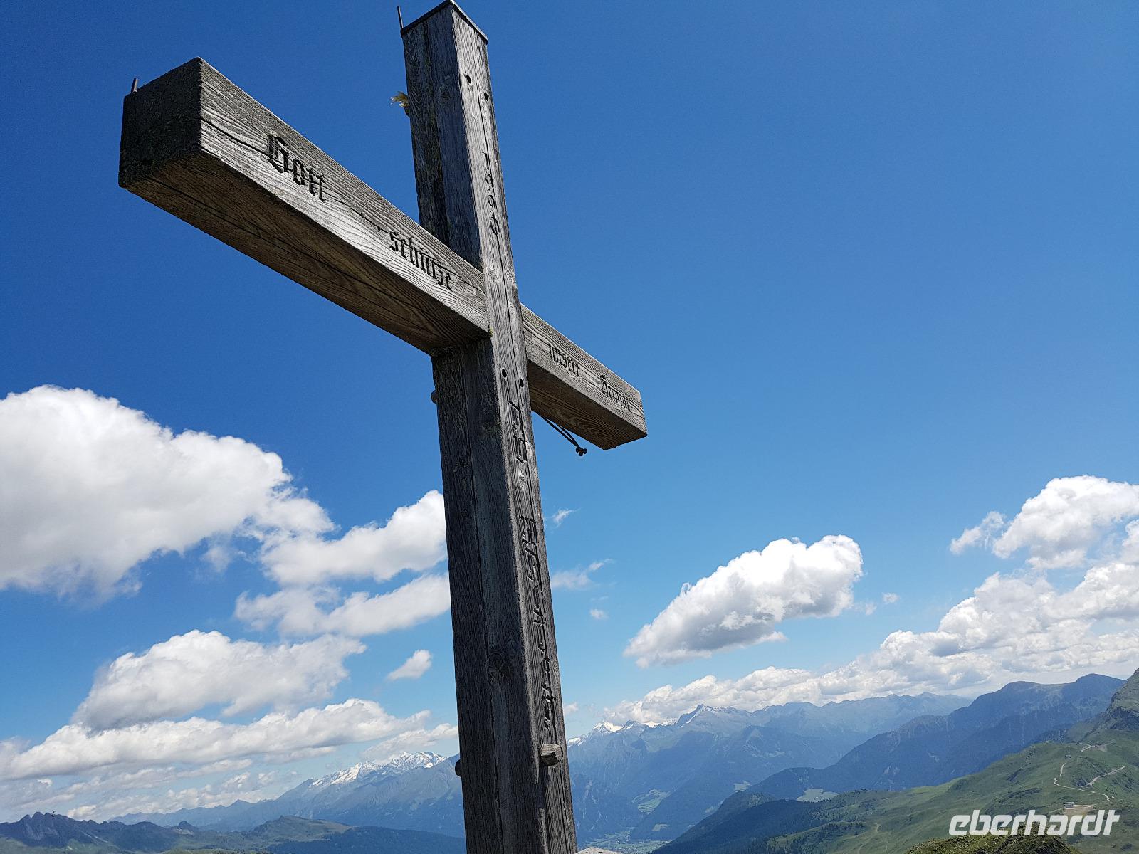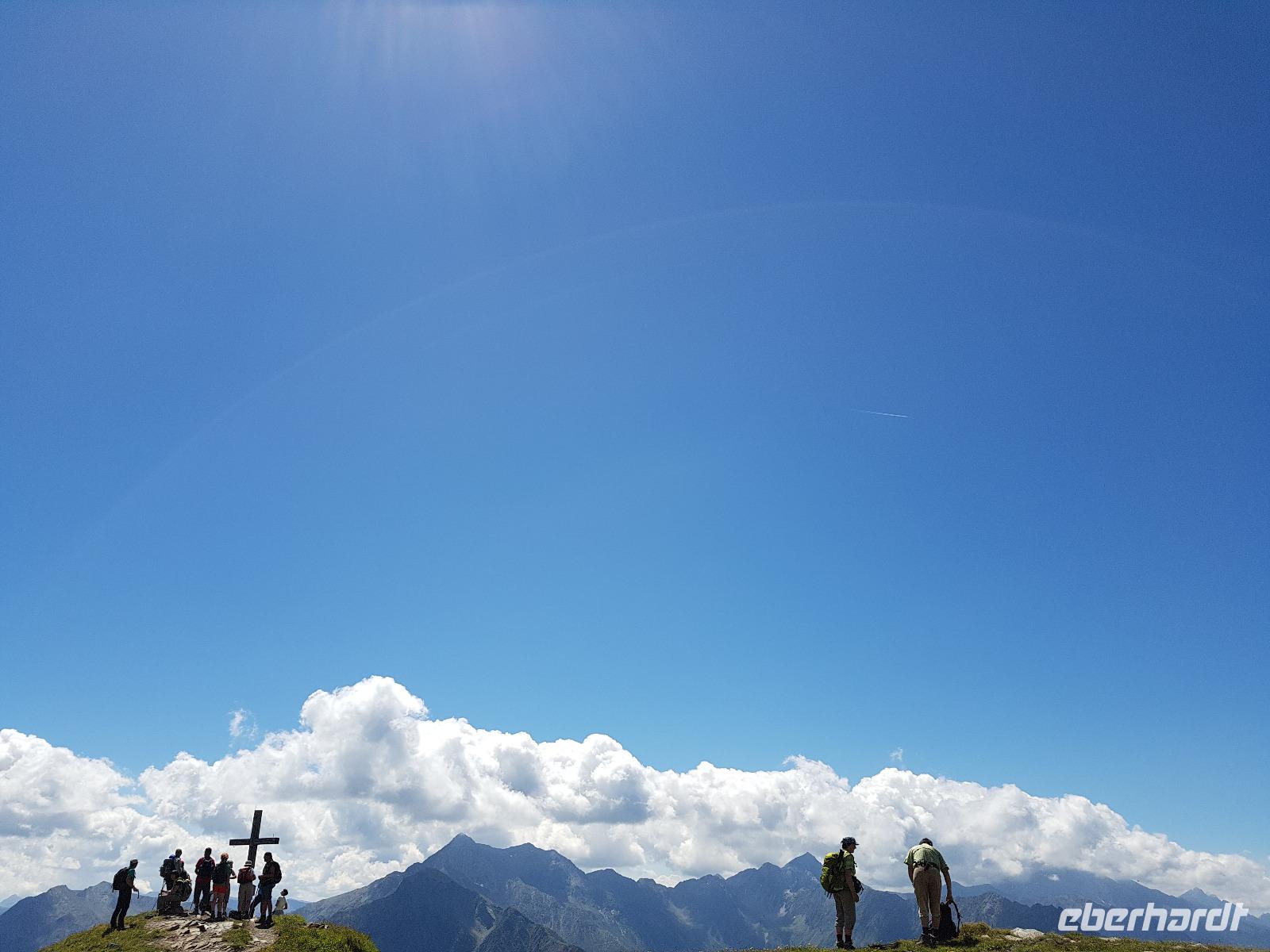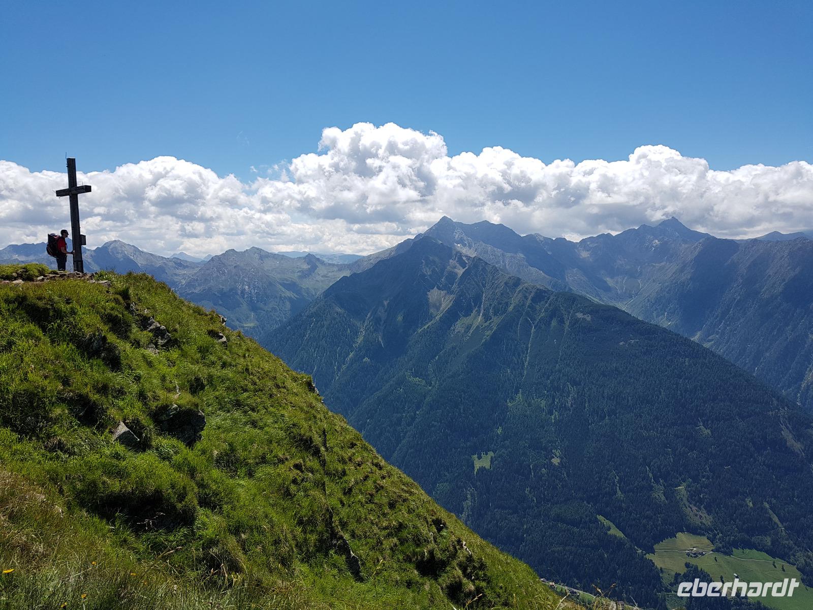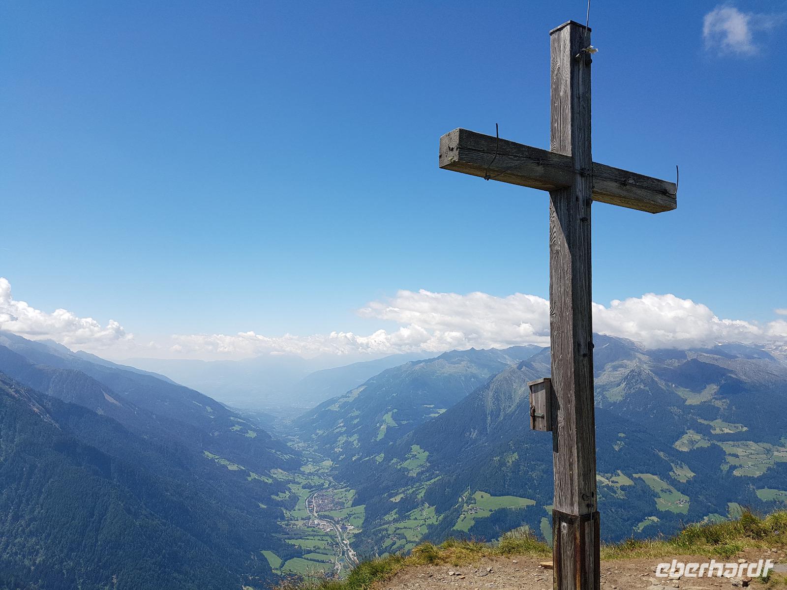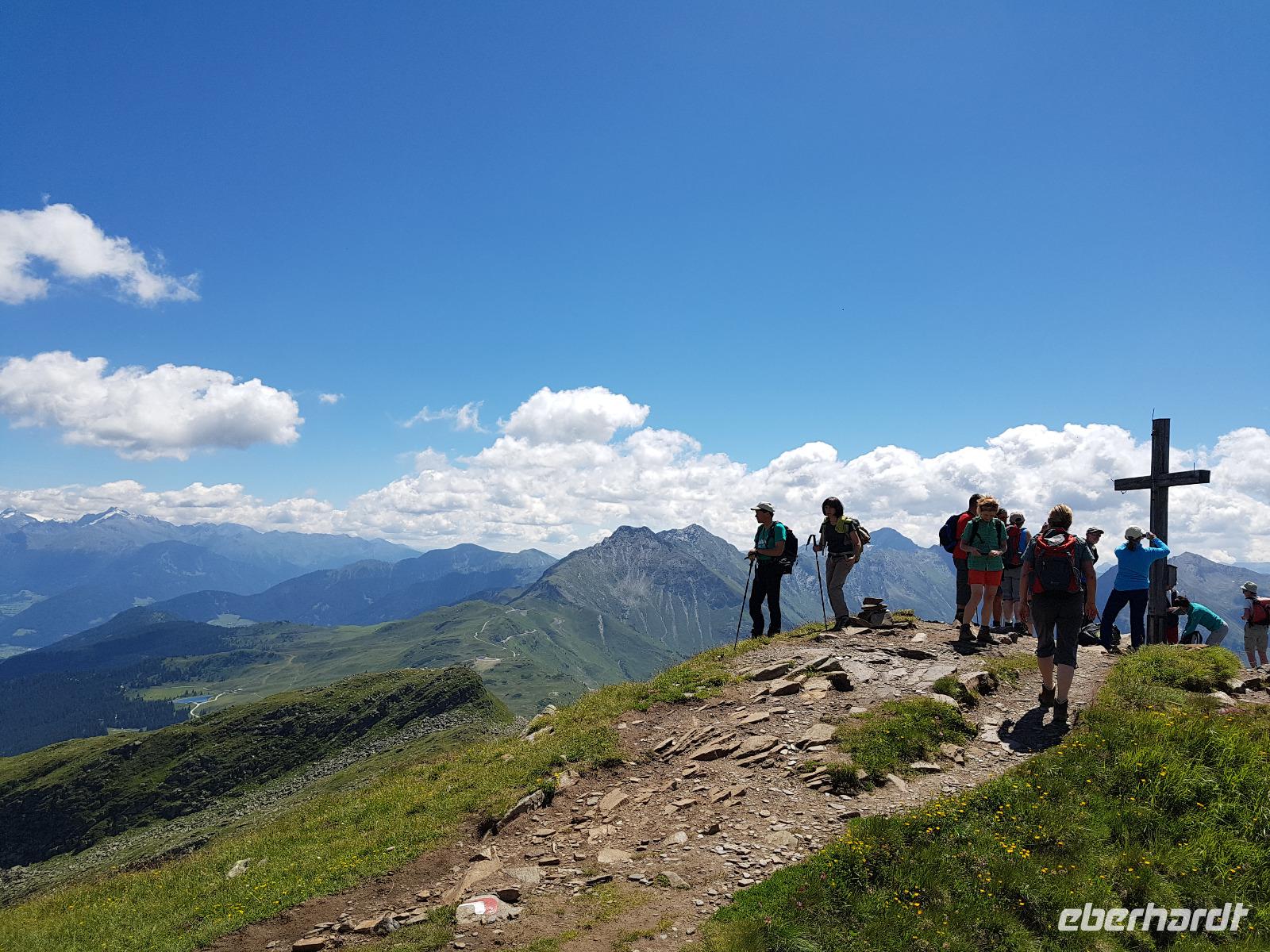 Zum Frühstück gab es immer alles: Schinken, Käse, Tomaten, Eier, Nutella, Brot, Butter und so weiter. Unser Ziel heute ist ein 2.331 Meter hoher Gipfel;) Wir fuhren heute ca. 45 Minuten in Richtung Jaufenpass, wo die Wanderung zur Flecknerspitze begann. Der Pfad über den Jaufenkamm ist ein prä-historischer Urweg schon vor der Zeitenwende und wurde auch von den Römern genutzt. Gemeinsam mit Siegfried wanderten wir über einen breiten Gratrücken immer dem Flecknerspitze-Gipfel entgegen. Wir bestaunten dabei einen imposanten Panoramaweg mit Blick ins 1000 Meter tiefer gelegene Passeiertal bis Meran und die Ötztaler Alpen. Es war wirklich atemberaubend. Im Hintergrund das eisfreie Gebirge der Sarntaler Alpen, sowie die vergletscherten Hochgipfel der Stubaier. Nach der Picnic-Pause auf einem Hochplateau setzten wir unsere Wanderung durch diese zauberhafte Landschaft auf dem Kammweg fort bis zum Gipfel der Flecknerspitze, wo wir die Aussicht über die Berge und Täler nur erstaunen konnten.