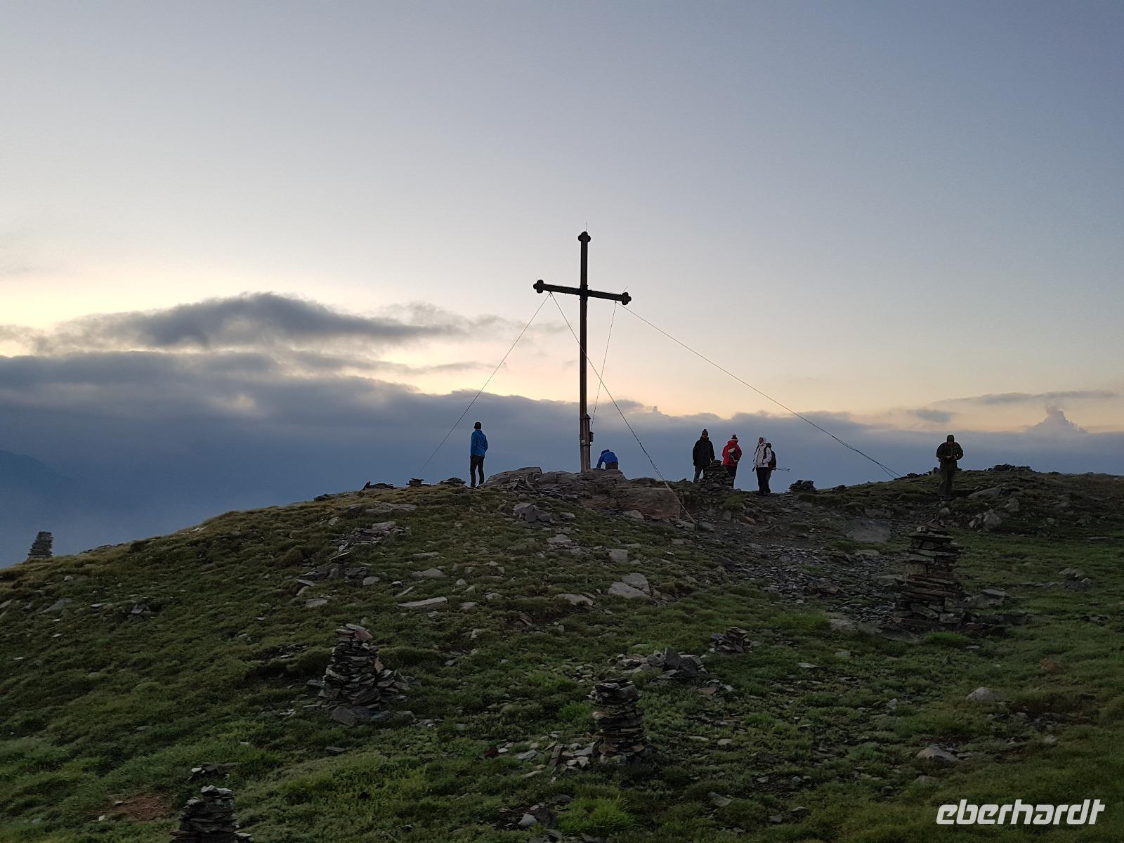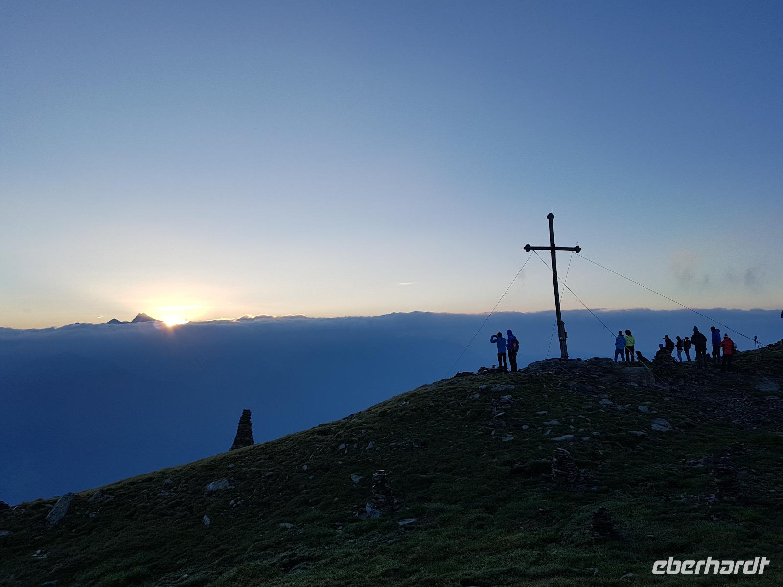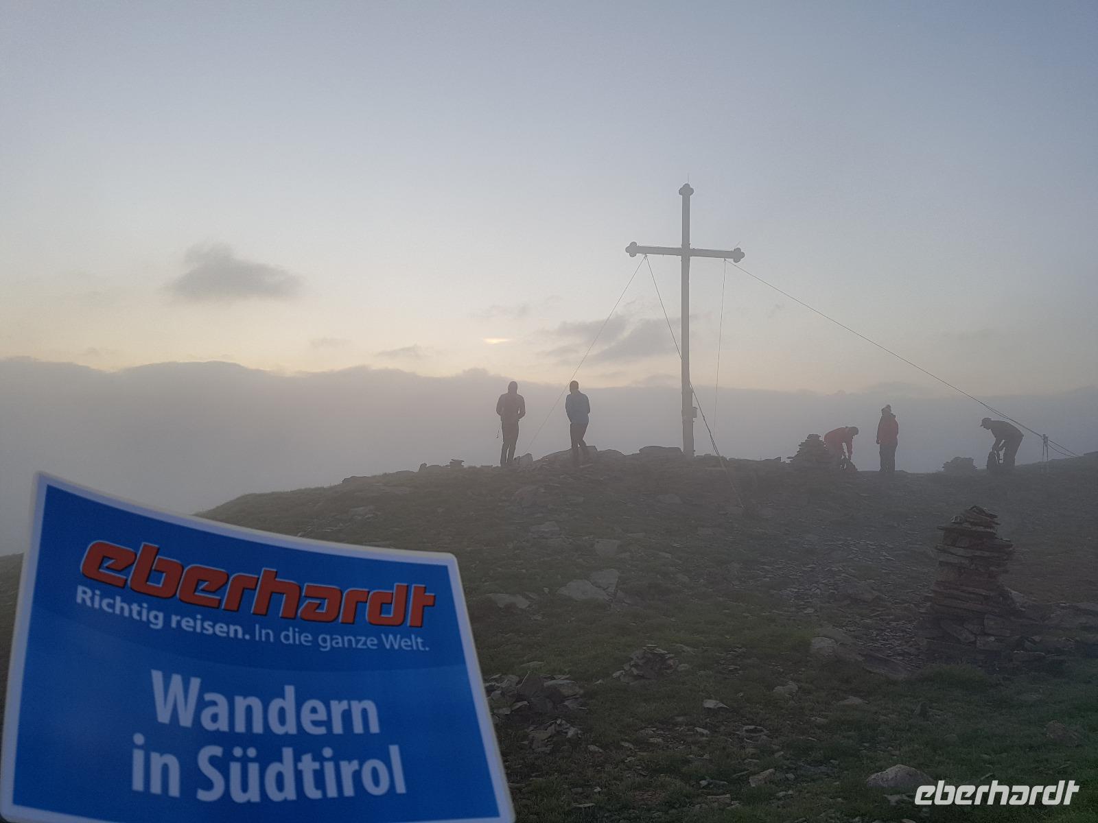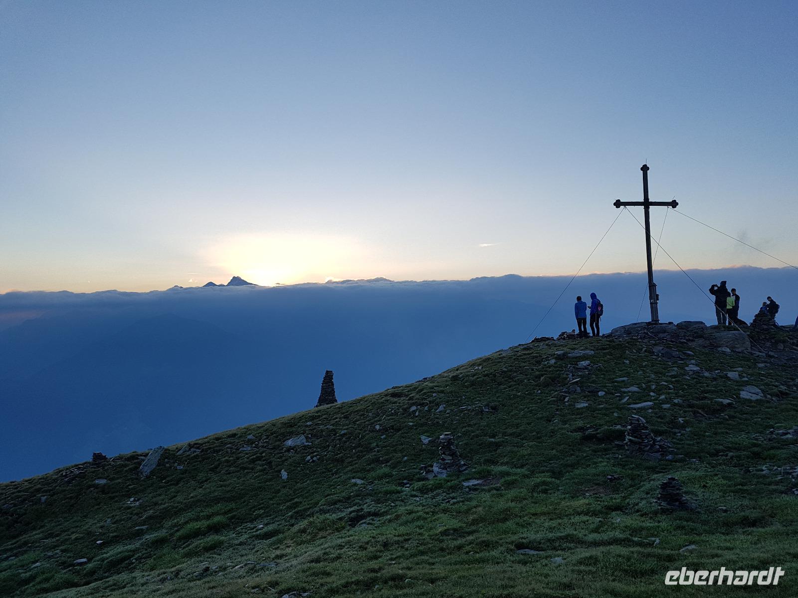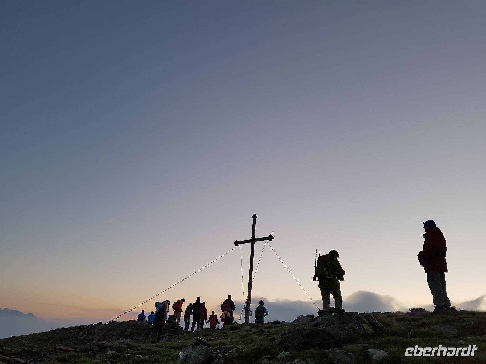 Der Wecker klingelte heute schon um 3:00 Uhr, da wir nämlich heute den Sonnenaufgang auf dem Hausberg von Stilfes, dem Zinseler, gern anschauen wollen. Da Morgenstund Gold im Mund hat und da der frühe Vogel den Wurm fängt waren wir uns sicher, dass unser zeitiges Aufstehen um 3.30 belohnt wird. Wir zogen uns warme Sache an und nahmen Taschenlampen mit. Um 10 Minuten vor 4 Uhr fuhren wir mehr als eine Stunde vom Hotel zum Penser Joch und dort stiegen wir aus und wanderten mit Stirn- und Taschenlampen zum Gipfel. Auf unserem Weg trafen wir dieses Jahr aber keie Kühe. Sonst hätten wir von weitem durch das Leuten ihrer Glocken in der Dunkelheit gehört. Es war noch dunkel, aber der Mond begleitete uns auf dem Aufstieg zum Zinseler (auf 2.422 Meter). Um 5.05 Uhr waren wir da, richtig zum Sonnenaufgang.