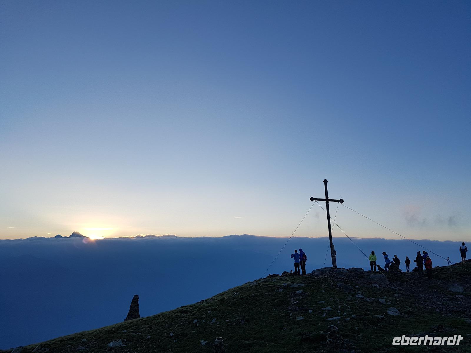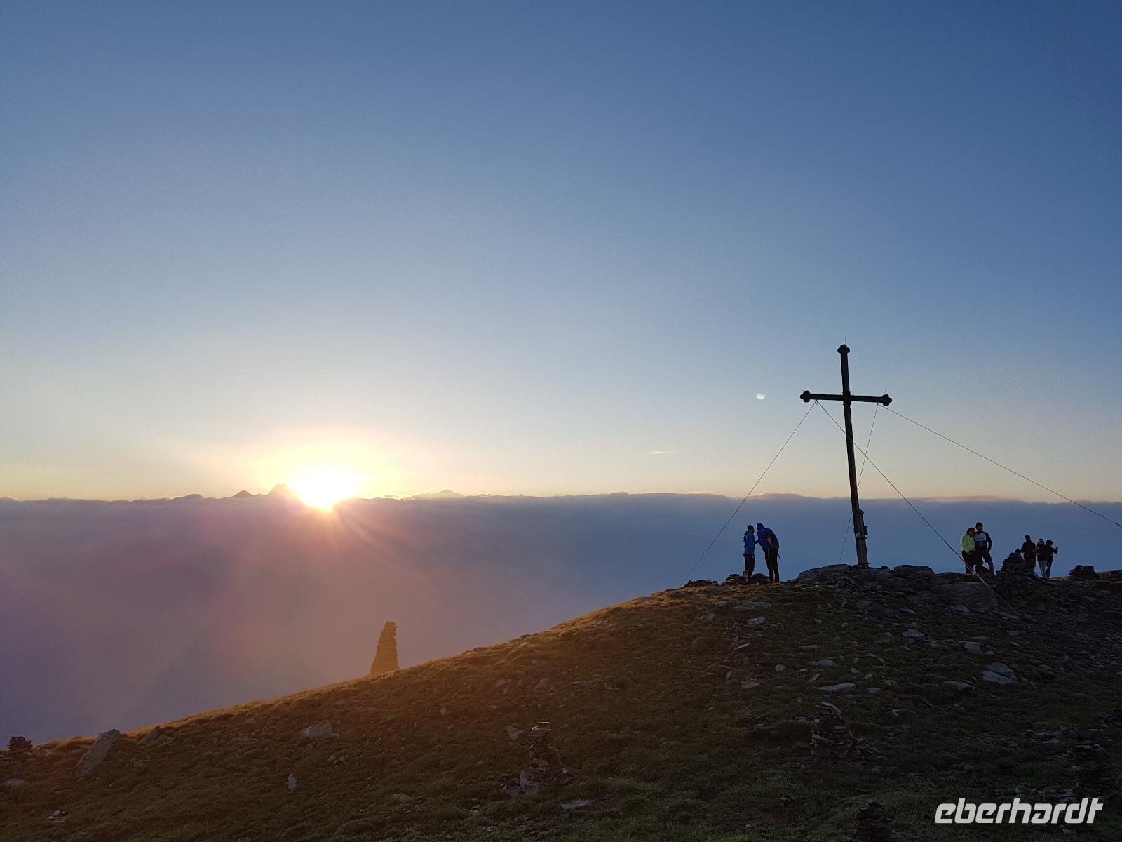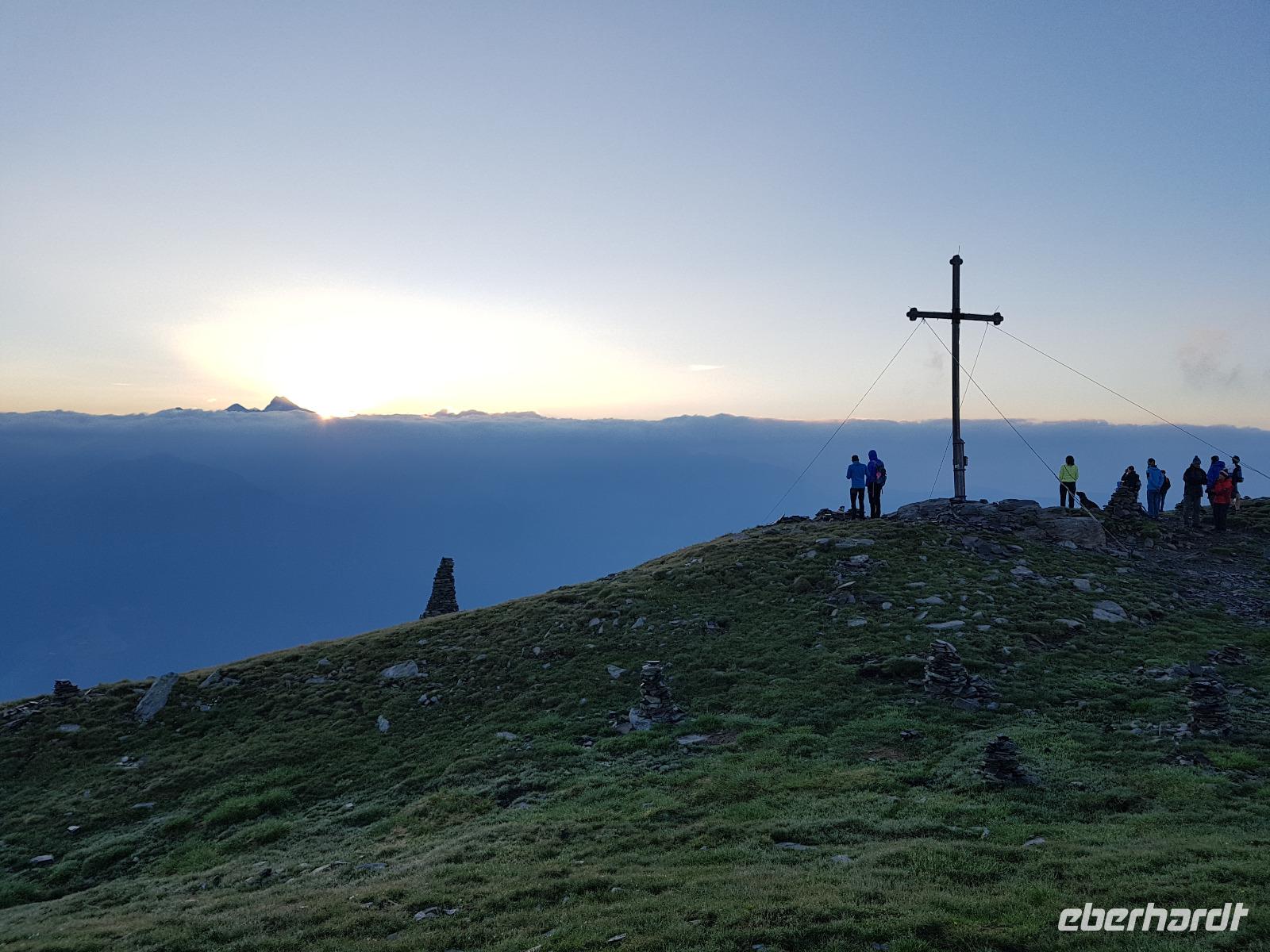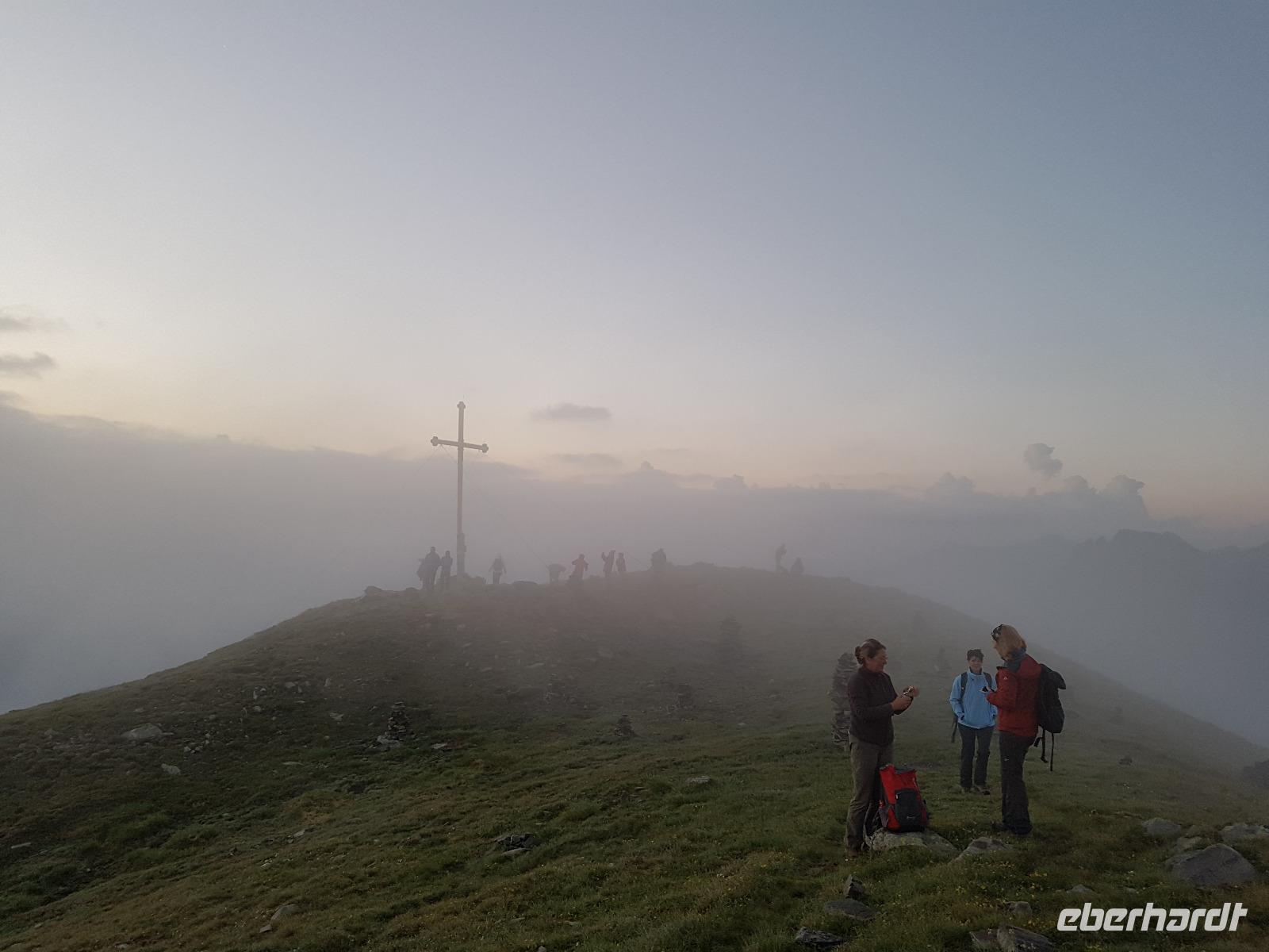 Der Wecker klingelte heute schon um 3:00 Uhr, da wir nämlich heute den Sonnenaufgang auf dem Hausberg von Stilfes, dem Zinseler, gern anschauen wollen. Da Morgenstund Gold im Mund hat und da der frühe Vogel den Wurm fängt waren wir uns sicher, dass unser zeitiges Aufstehen um 3.30 belohnt wird. Wir zogen uns warme Sache an und nahmen Taschenlampen mit. Um 10 Minuten vor 4 Uhr fuhren wir mehr als eine Stunde vom Hotel zum Penser Joch und dort stiegen wir aus und wanderten mit Stirn- und Taschenlampen zum Gipfel. Auf unserem Weg trafen wir dieses Jahr aber keie Kühe. Sonst hätten wir von weitem durch das Leuten ihrer Glocken in der Dunkelheit gehört. Es war noch dunkel, aber der Mond begleitete uns auf dem Aufstieg zum Zinseler (auf 2.422 Meter). Um 5.05 Uhr waren wir da, richtig zum Sonnenaufgang.