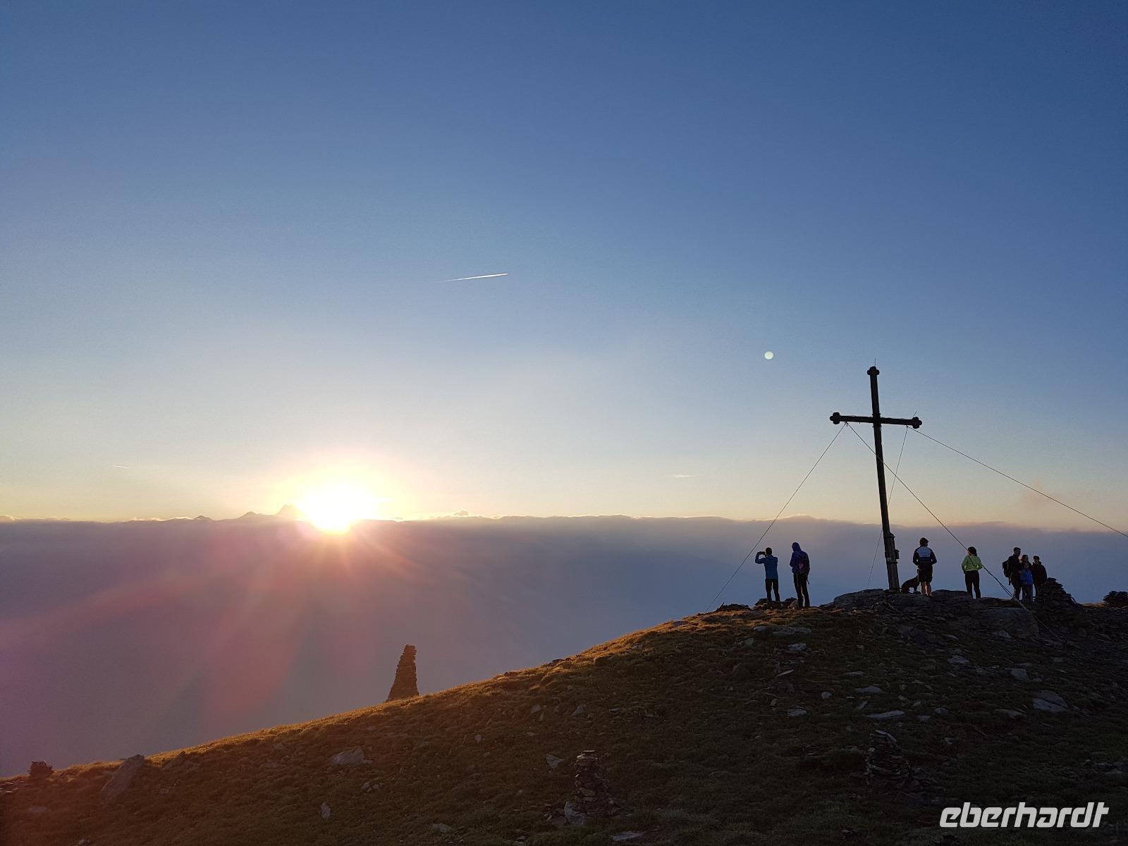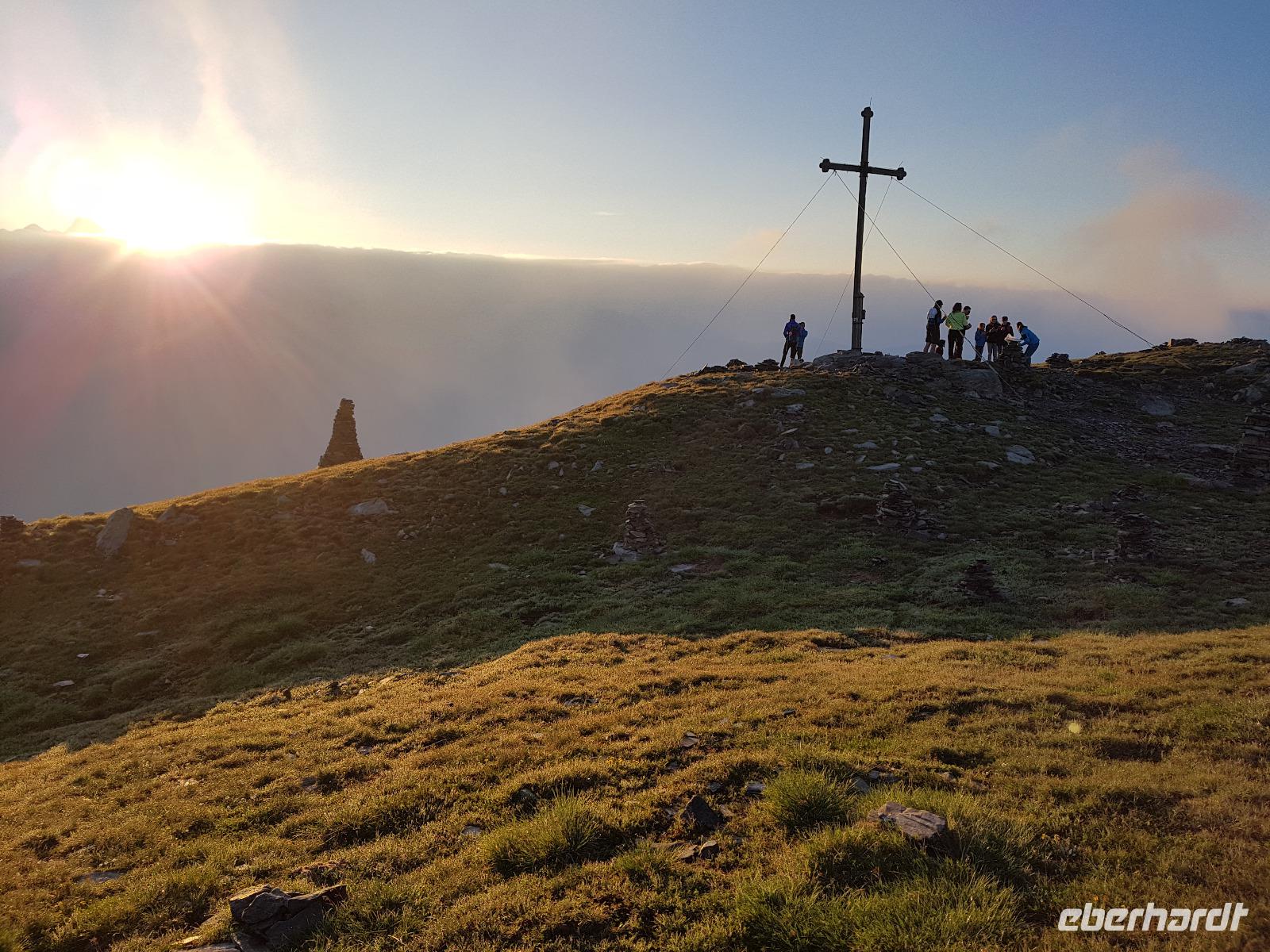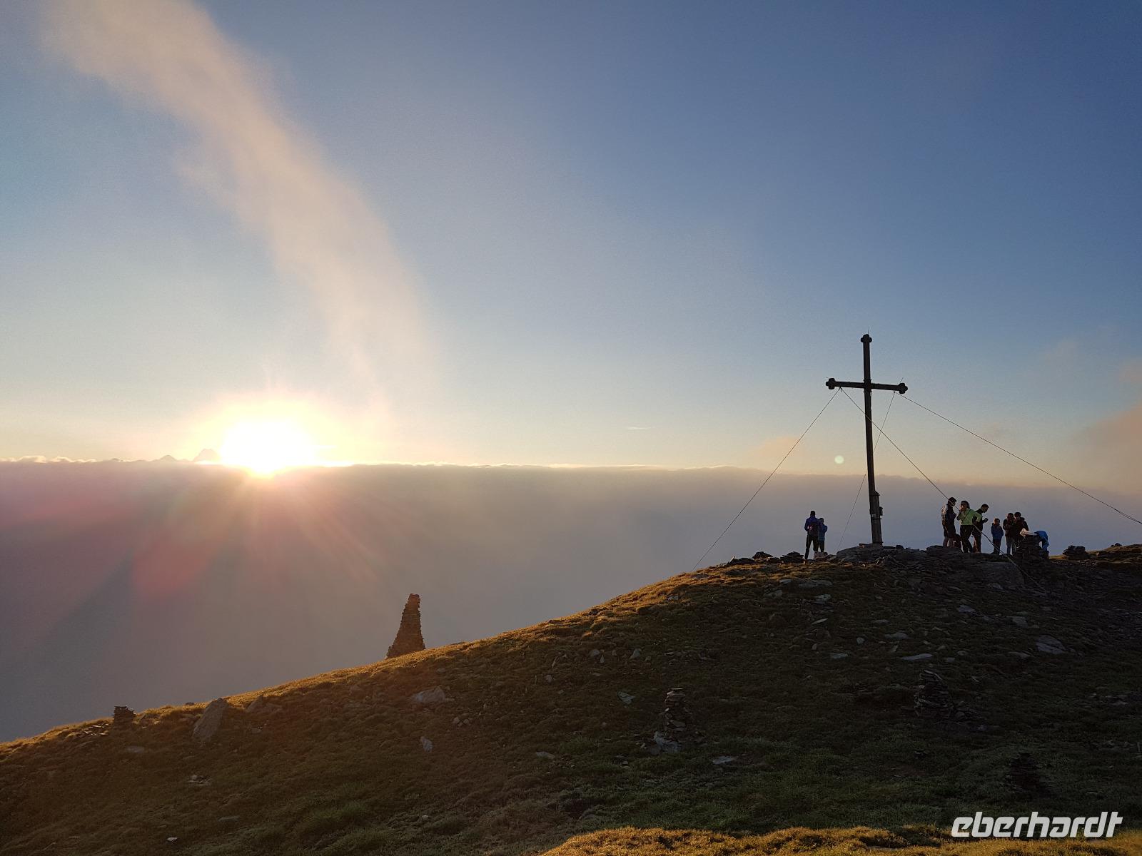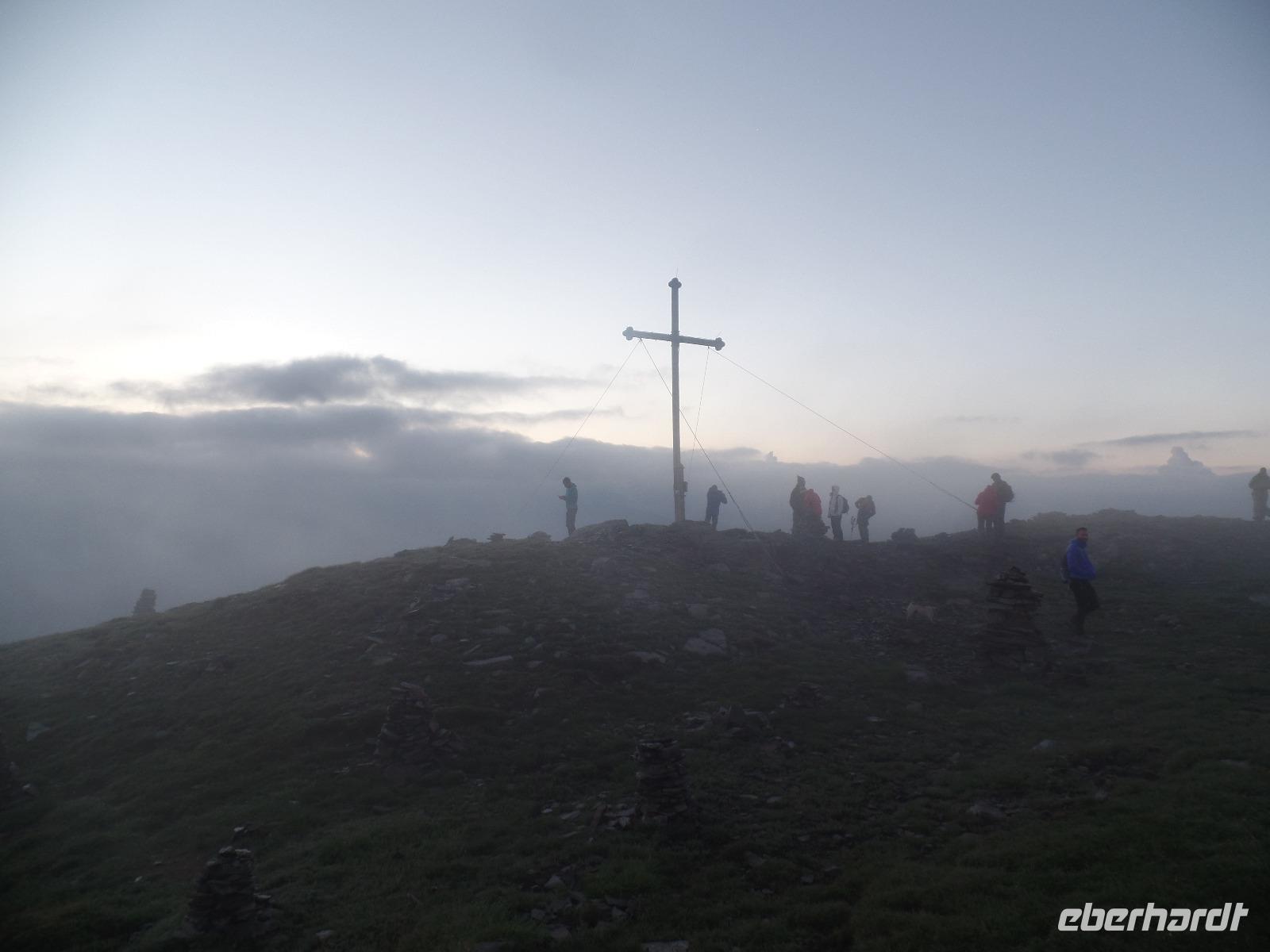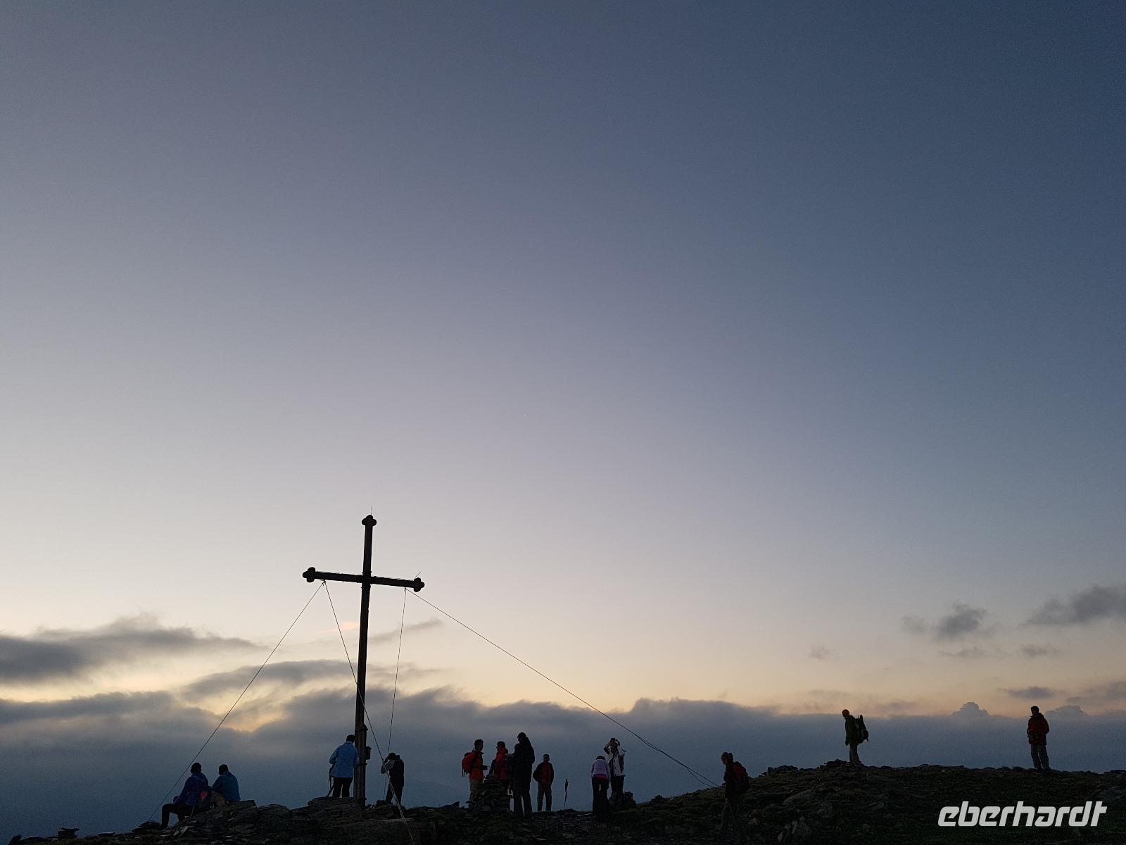 Der Wecker klingelte heute schon um 3:00 Uhr, da wir nämlich heute den Sonnenaufgang auf dem Hausberg von Stilfes, dem Zinseler, gern anschauen wollen. Da Morgenstund Gold im Mund hat und da der frühe Vogel den Wurm fängt waren wir uns sicher, dass unser zeitiges Aufstehen um 3.30 belohnt wird. Wir zogen uns warme Sache an und nahmen Taschenlampen mit. Um 10 Minuten vor 4 Uhr fuhren wir mehr als eine Stunde vom Hotel zum Penser Joch und dort stiegen wir aus und wanderten mit Stirn- und Taschenlampen zum Gipfel. Auf unserem Weg trafen wir dieses Jahr aber keie Kühe. Sonst hätten wir von weitem durch das Leuten ihrer Glocken in der Dunkelheit gehört. Es war noch dunkel, aber der Mond begleitete uns auf dem Aufstieg zum Zinseler (auf 2.422 Meter). Um 5.05 Uhr waren wir da, richtig zum Sonnenaufgang.
