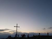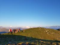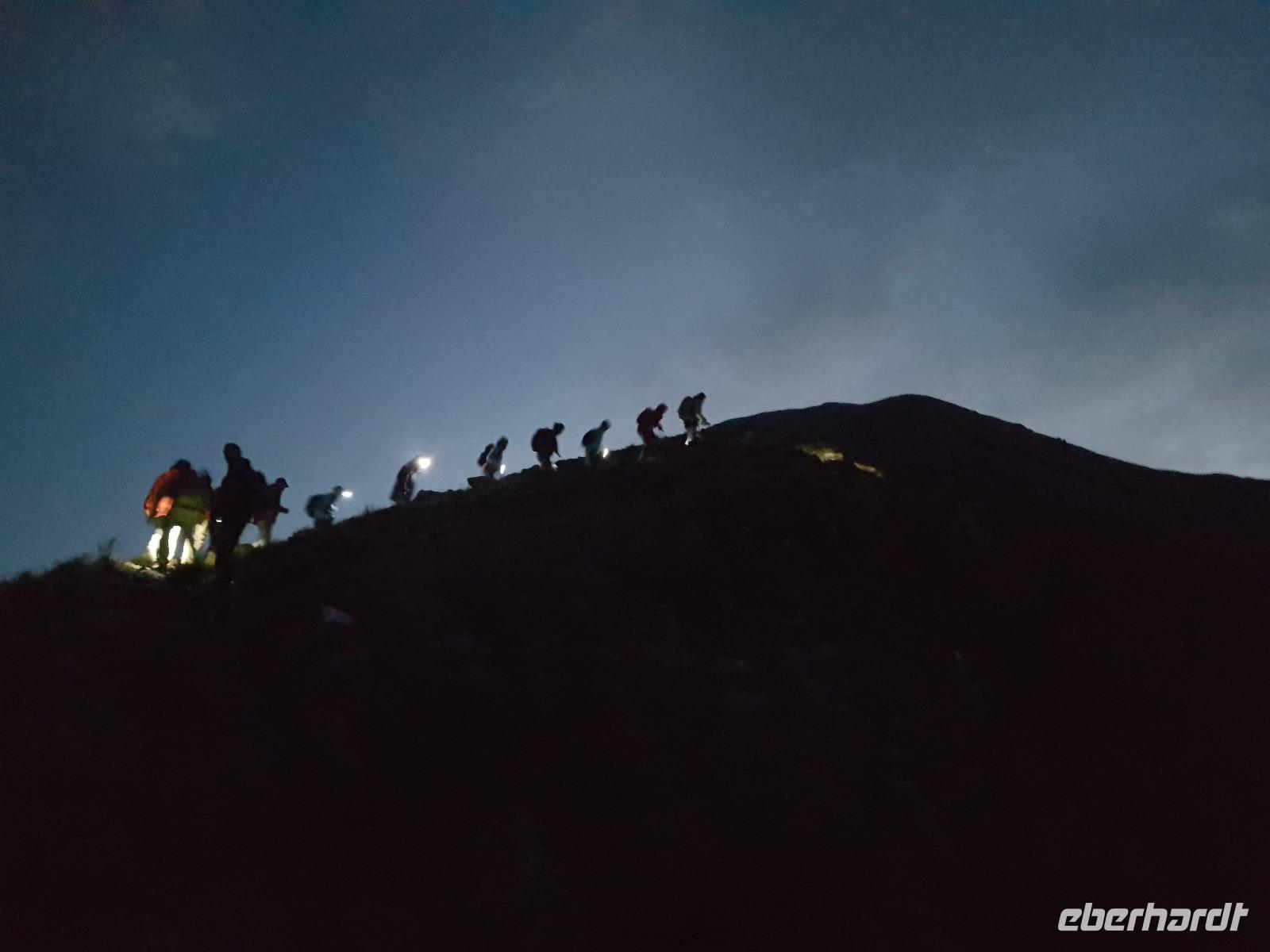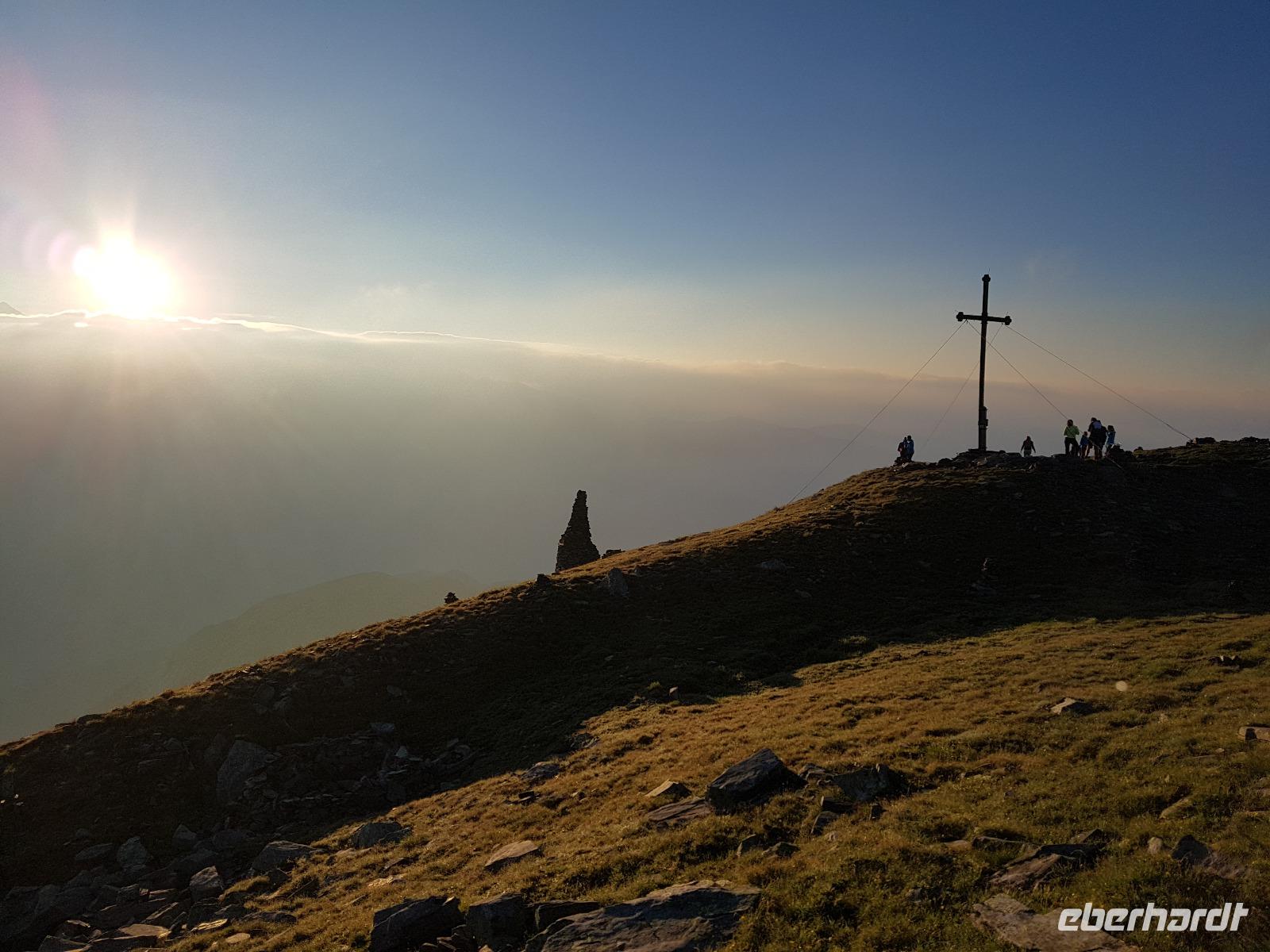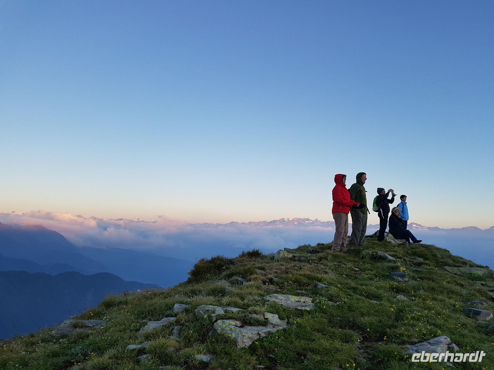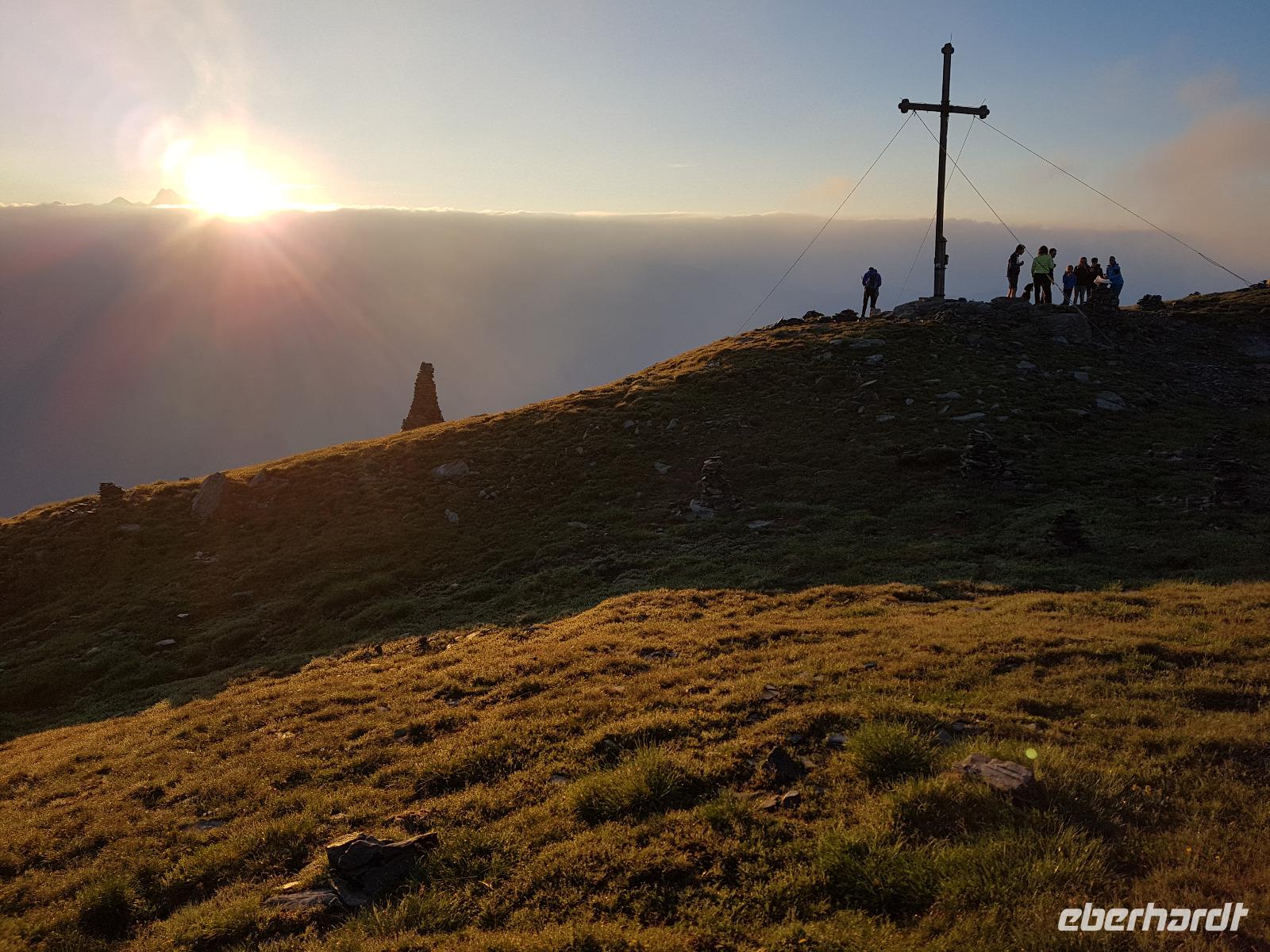 Der Wecker klingelte heute schon um 3:00 Uhr, da wir nämlich heute den Sonnenaufgang auf dem Hausberg von Stilfes, dem Zinseler, gern anschauen wollen. Da Morgenstund Gold im Mund hat und da der frühe Vogel den Wurm fängt waren wir uns sicher, dass unser zeitiges Aufstehen um 3.30 belohnt wird. Wir zogen uns warme Sache an und nahmen Taschenlampen mit. Um 10 Minuten vor 4 Uhr fuhren wir mehr als eine Stunde vom Hotel zum Penser Joch und dort stiegen wir aus und wanderten mit Stirn- und Taschenlampen zum Gipfel. Auf unserem Weg trafen wir dieses Jahr aber keie Kühe. Sonst hätten wir von weitem durch das Leuten ihrer Glocken in der Dunkelheit gehört. Es war noch dunkel, aber der Mond begleitete uns auf dem Aufstieg zum Zinseler (auf 2.422 Meter). Um 5.05 Uhr waren wir da, richtig zum Sonnenaufgang.