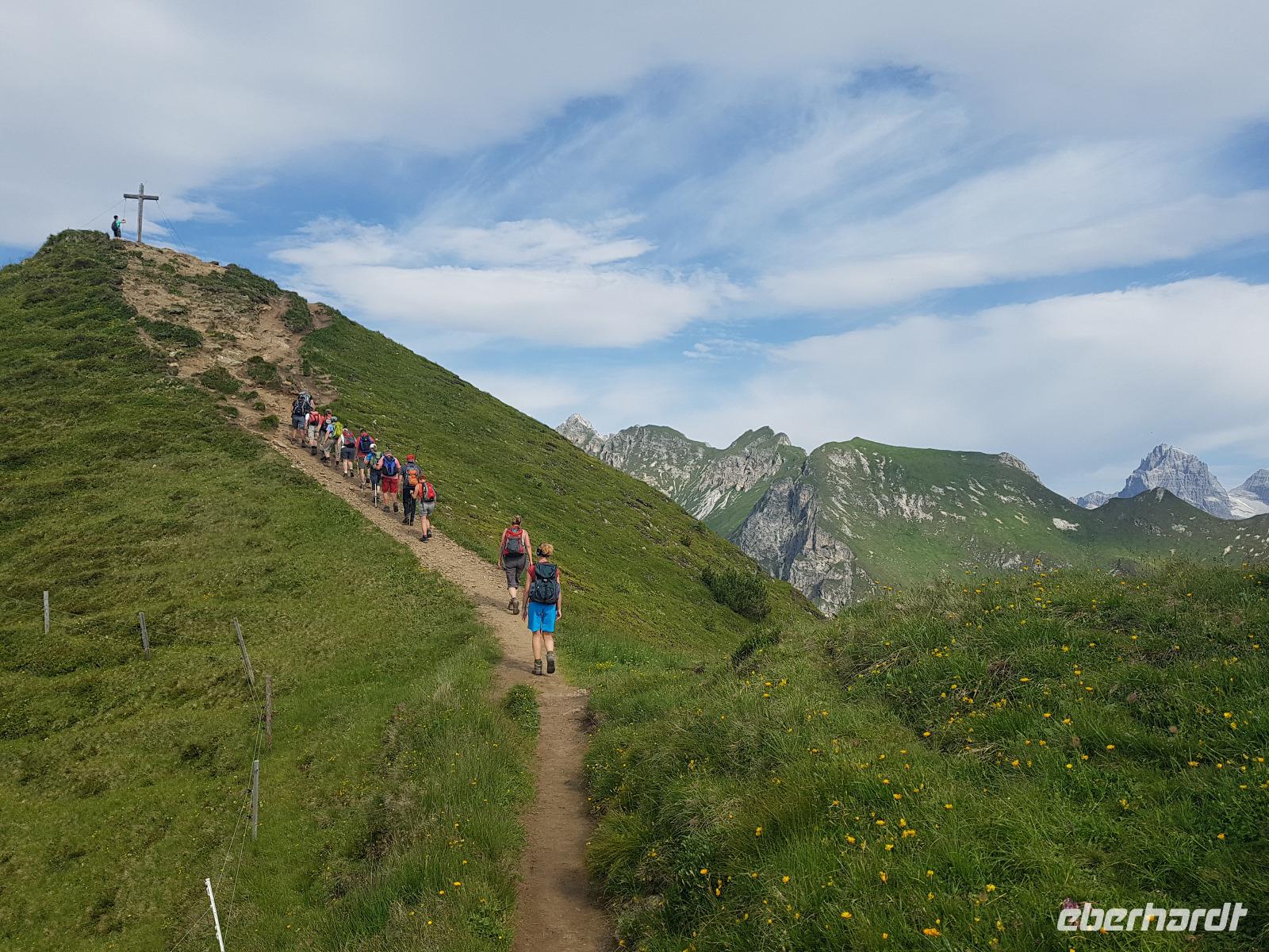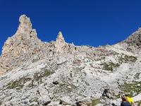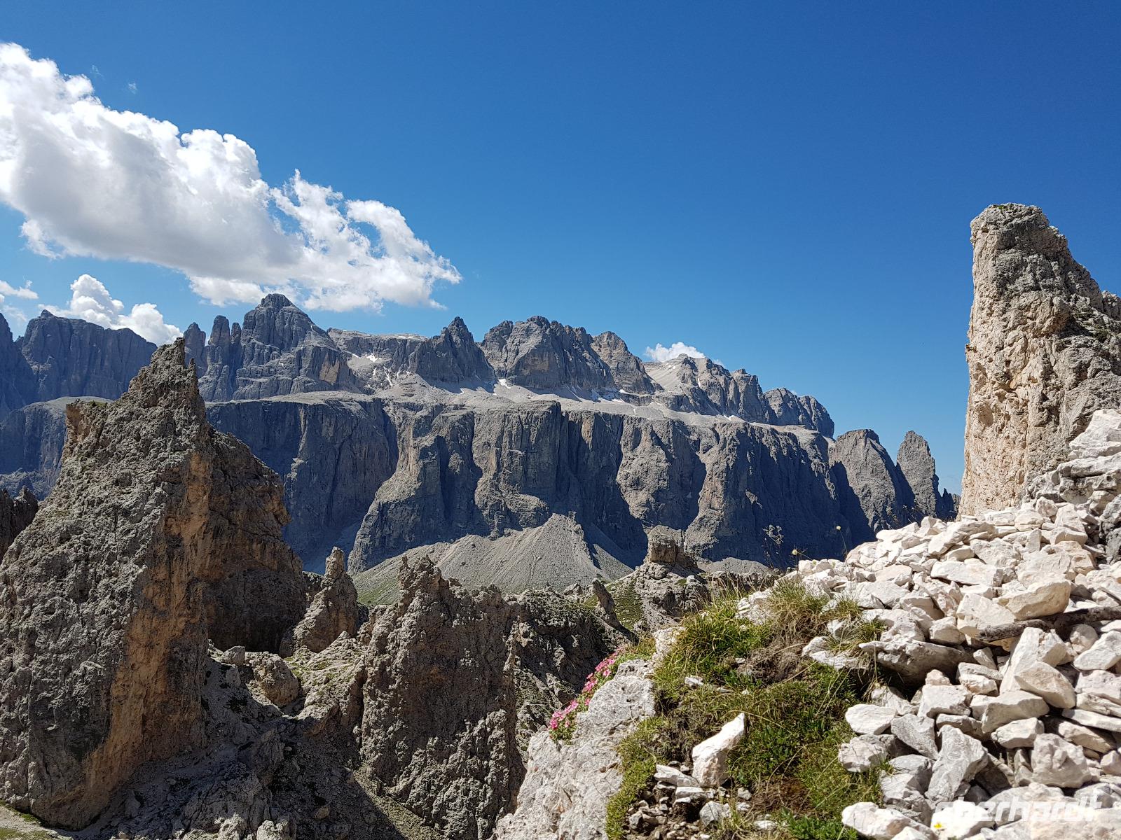 Vor uns haben wir einen sagenhaften Blick auf die majestätische und imposante Nordwand des Pleitlerkofels. Dieses Massiv zählt zum UNESCO-Weltnaturerbe und weist Vorkommnisse aller typischen Gesteinsschichten der Dolomiten auf. Erstmal wanderten wir auf einem gemütlicheren, leicht ansteigenden Weg entlang über eine bunte blühende Alm-, und Peitlerwiesen mit unbeschreibliche Blumenvielfalt und Alpenrosen. Es erwartete uns wieder eine tolle Wanderung mit sogar hochalpiner Landschaft am Fuß des Peitlerkofels mit Blick zur Plose und den Aferer Geisler Spitzen. Vor uns hatten wir nun den Einstieg in die Peitlerscharte. Ca. eine Stunde hinauf über Geröll. Wir genossen diesen leicht anspruchsvollen Anstieg hinauf zur Peitlerscharte auf 2.357 Meter. Es war ein ziemlich sportlicher Anstieg, aber zur Belohnung öffnete sich für uns auf der anderen Seite des Peitler Joch Passes ein unendlicher Blick über Täler und Berge und wir sahen Edelweiß-Pflanzen! Wunderschön! Auf dem erreichten höchsten Punkt der Wanderung stärkten wir uns bei einer Mittagspause und sangen einige Berglieder. Wir genossen vor allem die tolle Aussicht, die sich von hier oben bietet. Gemütlich und nicht mehr so anstrengend ohne nennenwerte Höhenunterschiede ging es weiter über den Dolomiten-Höhenweg 2 zum Kreuzkofeljoch. Am Wegesrand überraschten uns unbekannte neue Pflanzen und tolle Aussichten. Einige von uns sahen Murmeltieren.