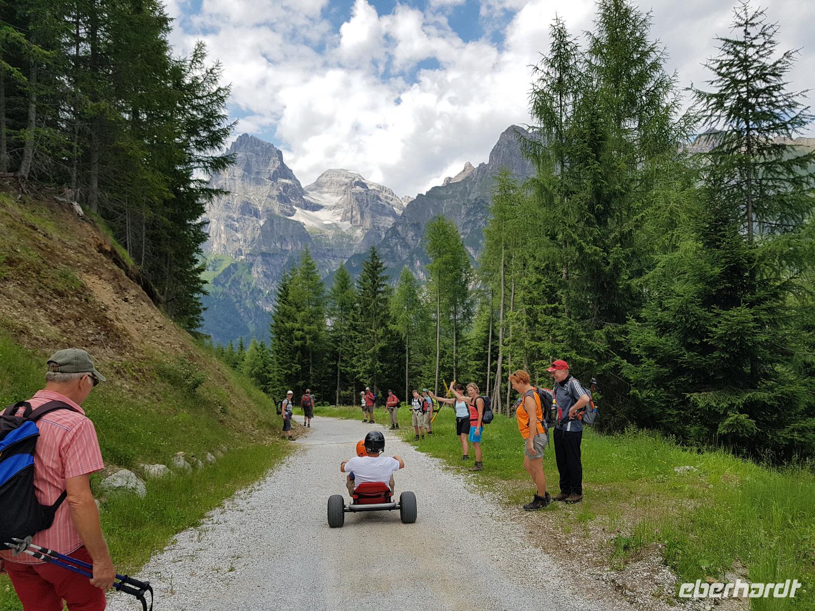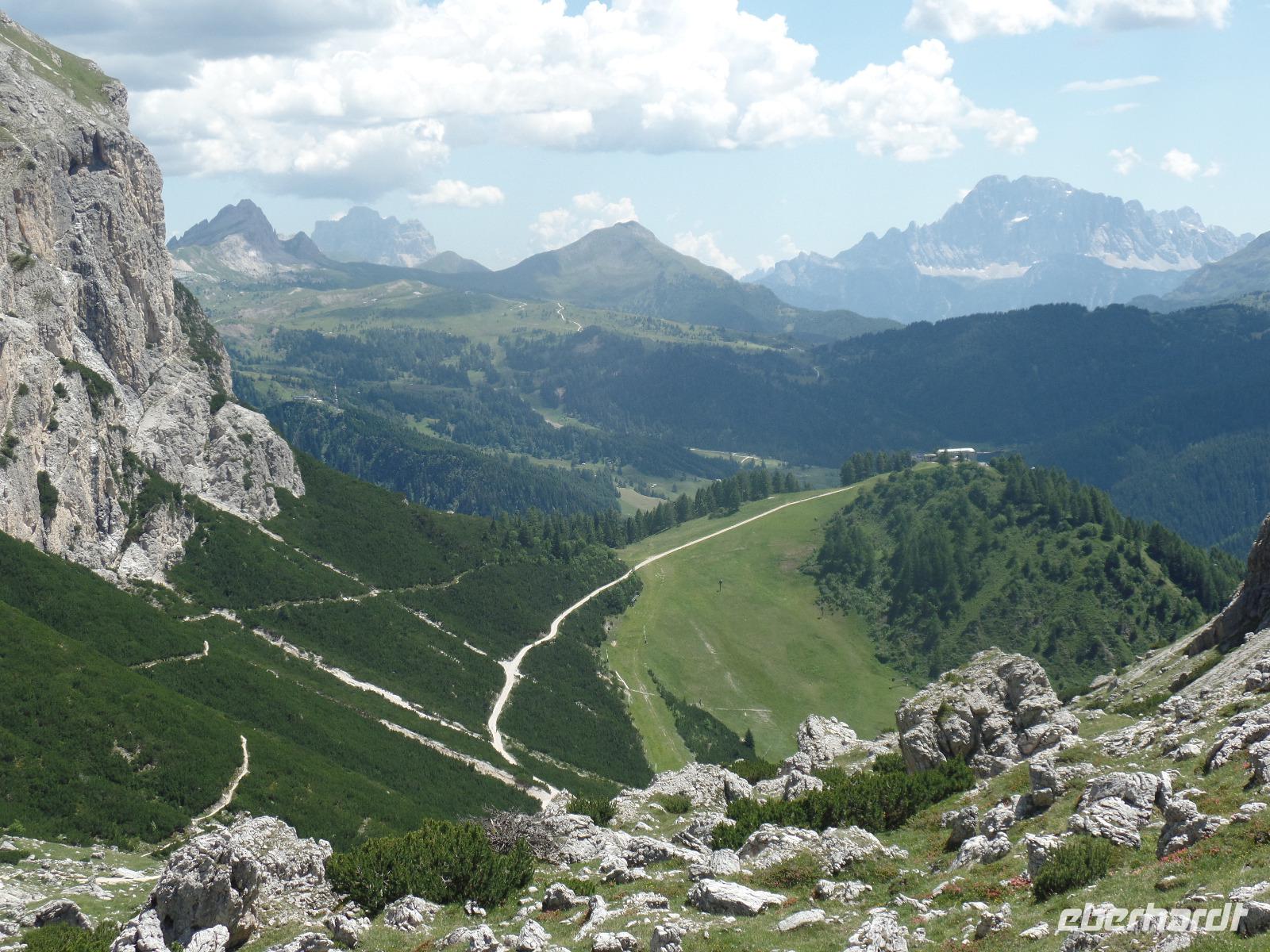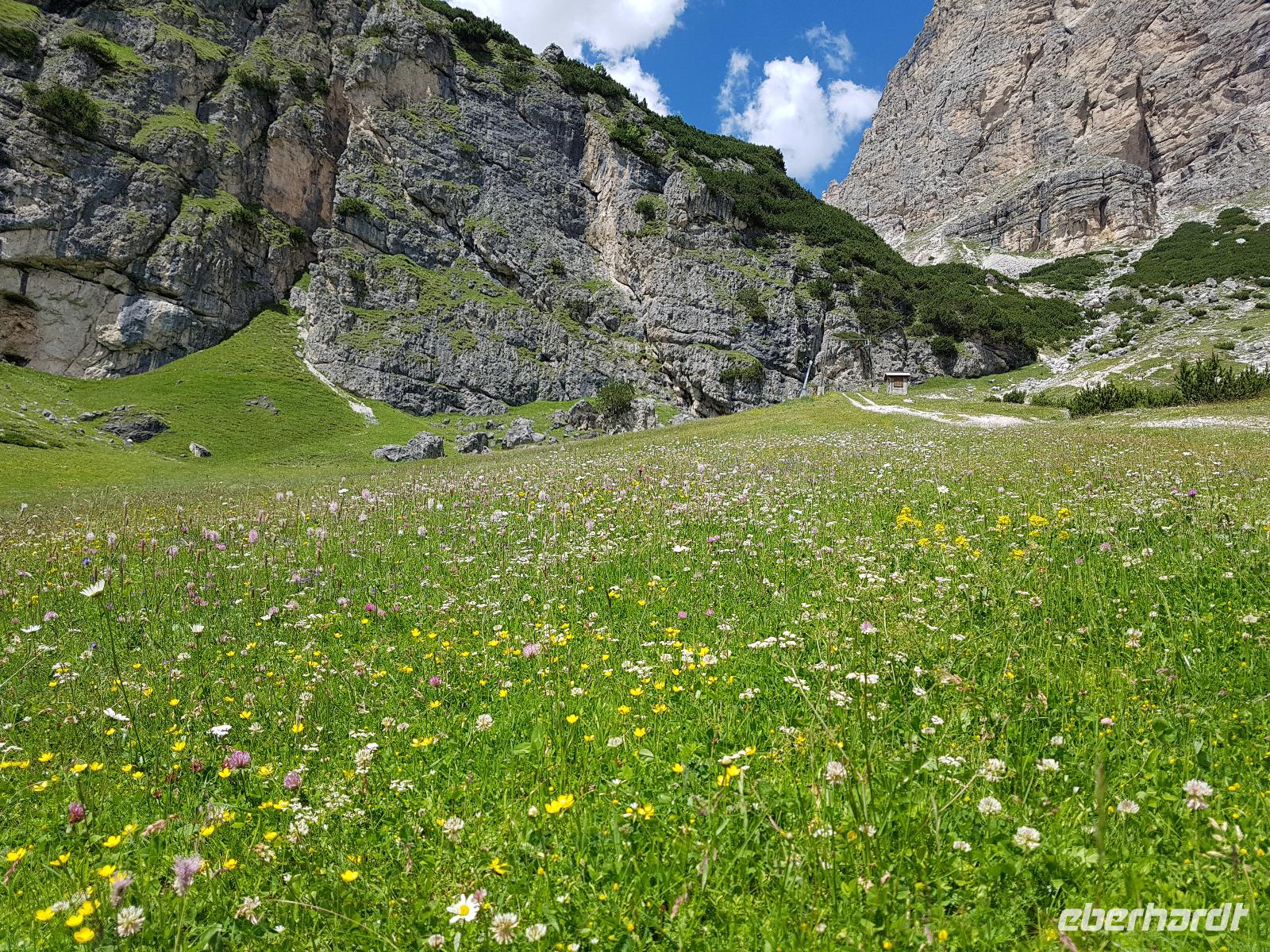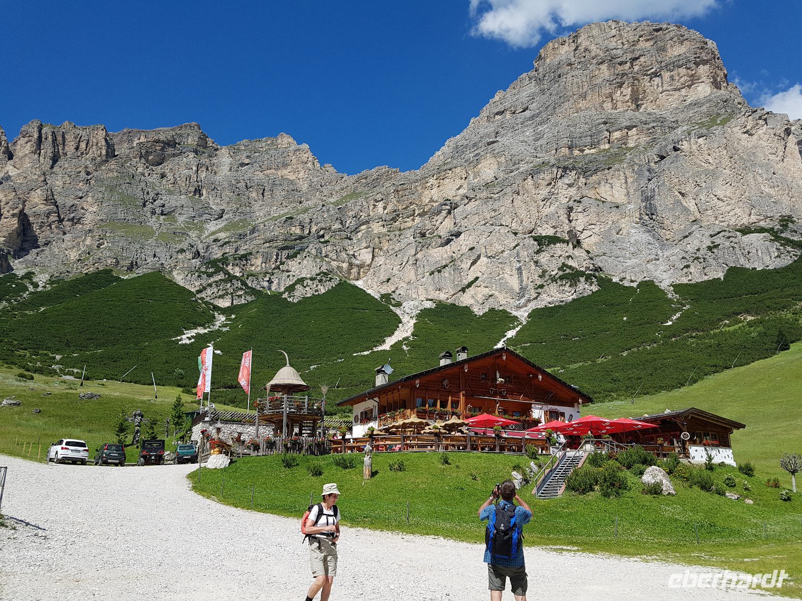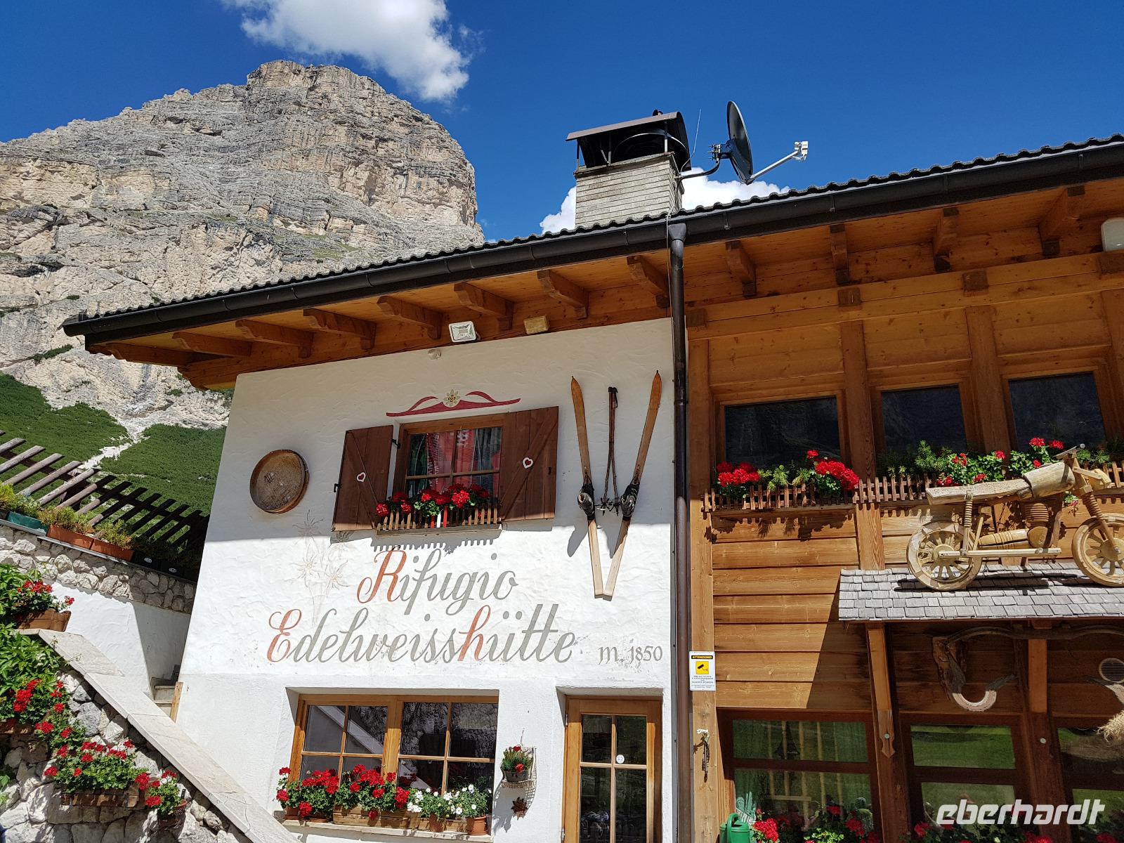 Von hier aus stiegen wir über viele Kehren durch das Edelweißtal hinab zur Alm und danach bis nach Kolfuschg. Ca. 15 Uhr erreichten wir die Edelweißhütte, wo wir eine kleine Nachmittagsrast machten. In Ruhe hier und ohne Eile an der Edelweiß-Hütte genossen wir die Landschaft mit einem Capuccino oder Bier. Hier gab es eine Gruppe von Österreicher und eine Frau mit Gitarre. Die Frau erfuhr dass ich aus Spanien bin und fragte mich ob ich spanische Lieder singen könnte. Ich sagte ja aber erstmal alle gemeinsam auf deutch „Wenn wir erklimmen...", ein tolles Berglied. Dann kam die spanische Musik und glaube dass es gut war da ich mein Getränk nicht bezahlen müsste;) Später ging es weiter noch kurz hinab in den malerischen Ort Kolfuschg, wo Christoph auf uns um 16.30 Uhr wartete.