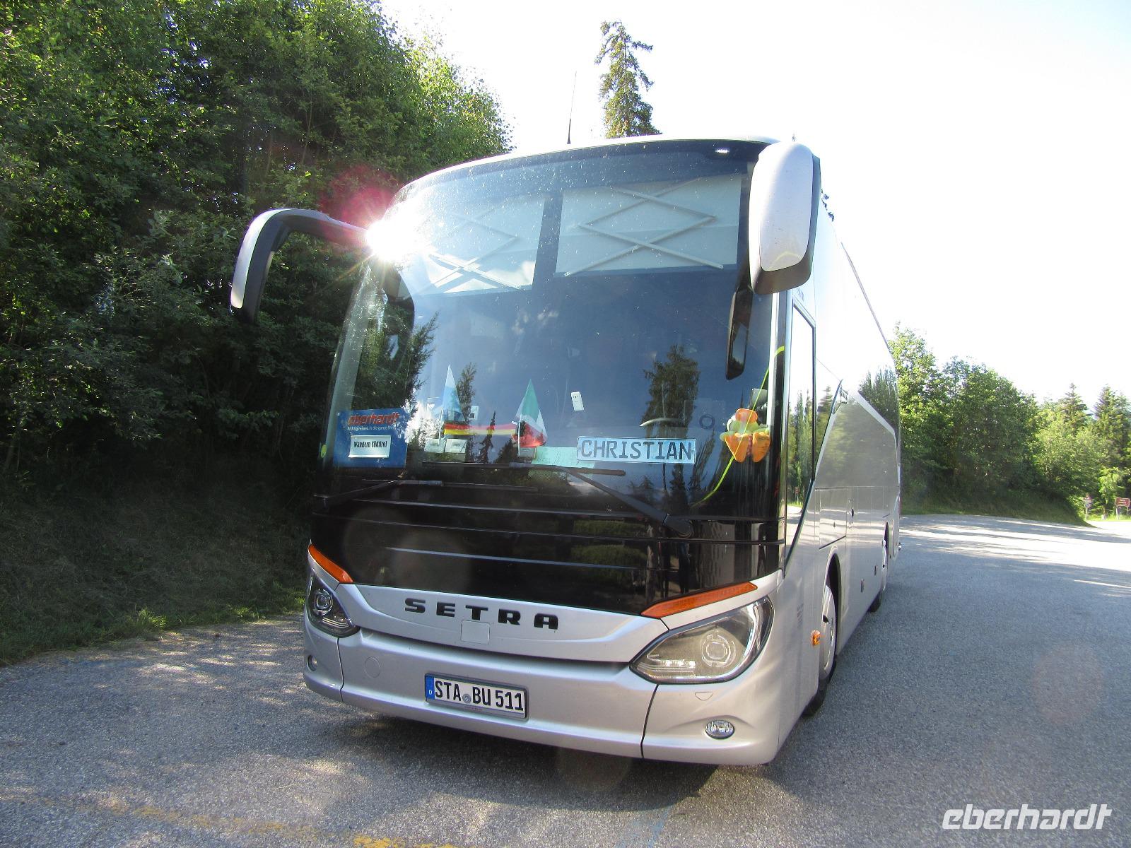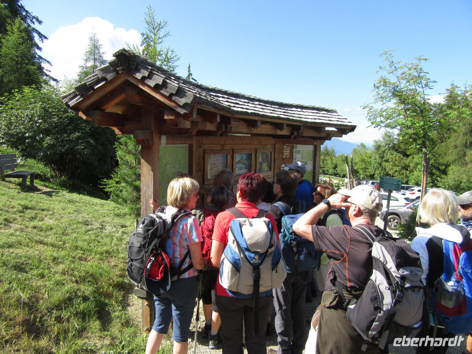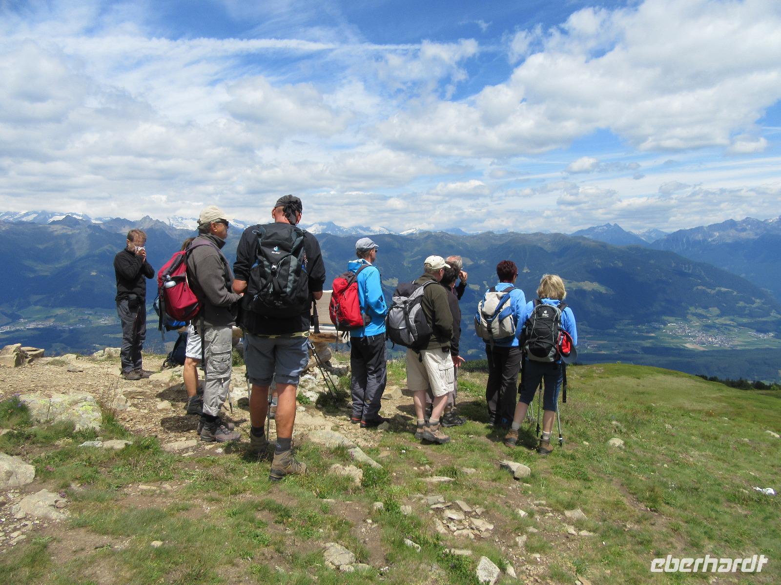 Nach einen fantastischen Frühstück rüsteten wir uns mit Wanderschuhen, Rucksack und Wanderstöcken um mit Toni unsere erste Wanderung in Angriff zu nehmen. Mit dem Bus fahren wir nun weiter südlich über Mauls, Franzensfeste und Mühlbach nach Rodeneck - unserem Ausgangspunkt der Wanderung. Toni gibt uns während der Fahrt eine ganze Menge interessante Informationen zu Land und Leuten. Bevor wir unseren Startpunkt erreichen, müssen wir noch einige Serpentinen nach oben per Bus zurücklegen, denn der Parkplatz Zumis liegt noch einige Höhenmeter weiter oben. Das ist gar nicht so leicht, aber unser versierter Fahrer Christian bringt uns sicher ans Ziel. Nun aber gehen wir zu Fuß weiter in Richtung Ronerhütte und zur Starkenfeldhütte. Von dem breiten, gemütlichen Weg können wir immer wieder den tollen Blick in die grandiose Bergwelt Südtirols genießen. Zum Astjoch selbst überwinden wir dann den mäßig bis steilen Anstieg zum Gipfelkreuz - und waren geschafft, aber mächtig stolz den 2194m hohen Berg erklommen zu haben. Mit einem traumhaften Blick verzehren wir nun unser selbst zusammengestelltes Lunchpaket. Der Abstieg geht nun über denselben Weg zurück, aber dieses Mal kehren wir als Belohnung noch in die Starkenfeldhütte ein und stärken uns bei Radler, Kaffee oder Apfelstrudel. Glücklich erreichen wir nun wieder den Parkplatz, auf dem Christian uns schon erwartet. Auf dem Rückweg ins Hotel lauschen wir dann noch einmal gespannt den umfangreichen Ausführungen von unserem Toni, den wir kurzerhand unseren „Tiroler Erklärbär" getauft haben.