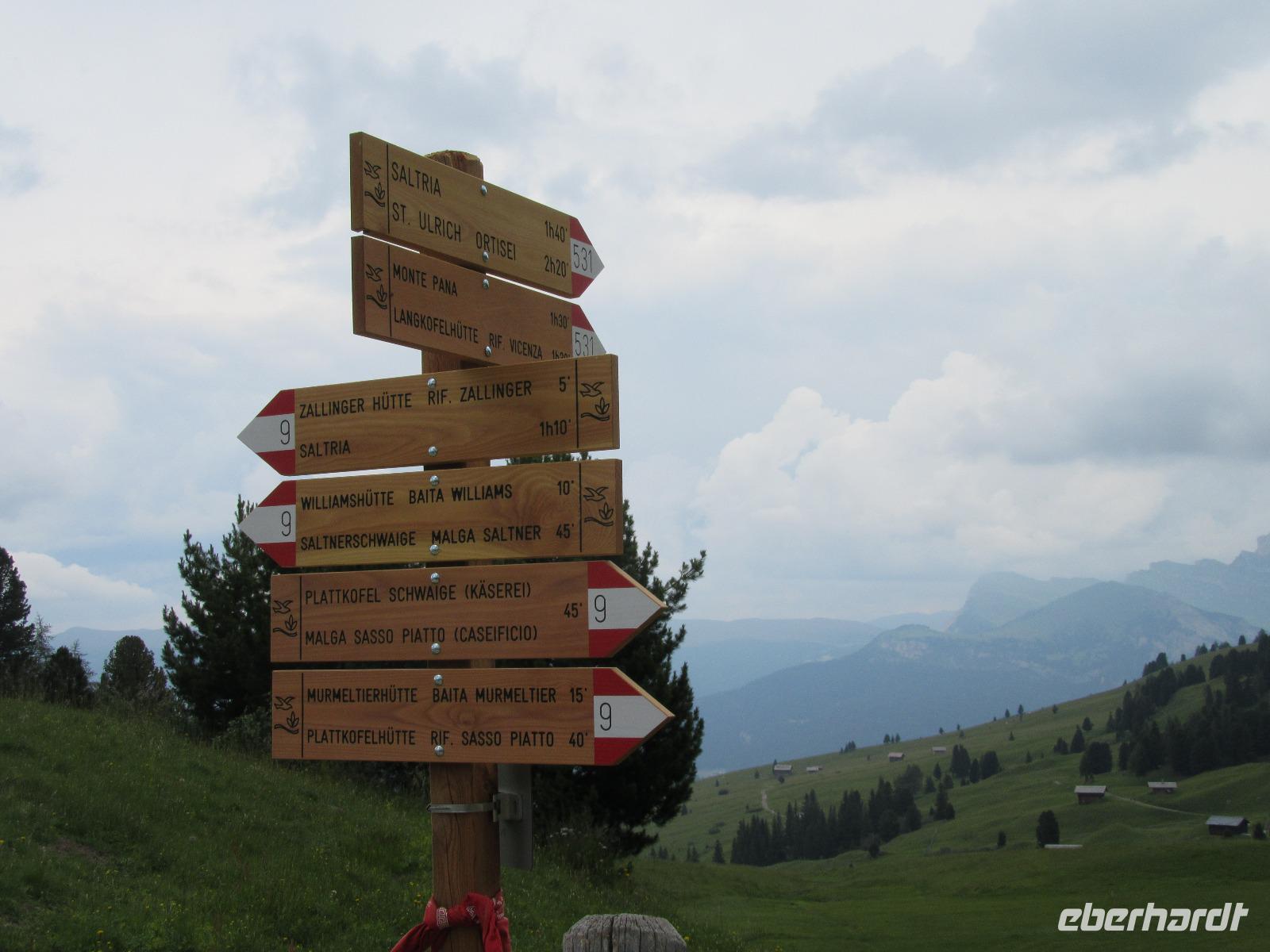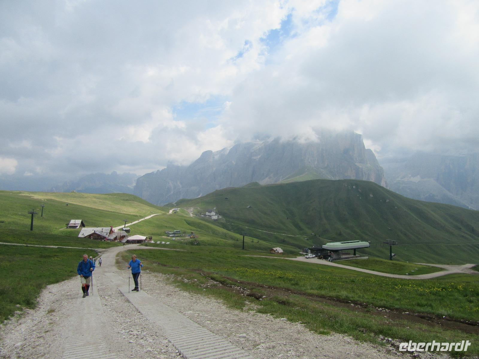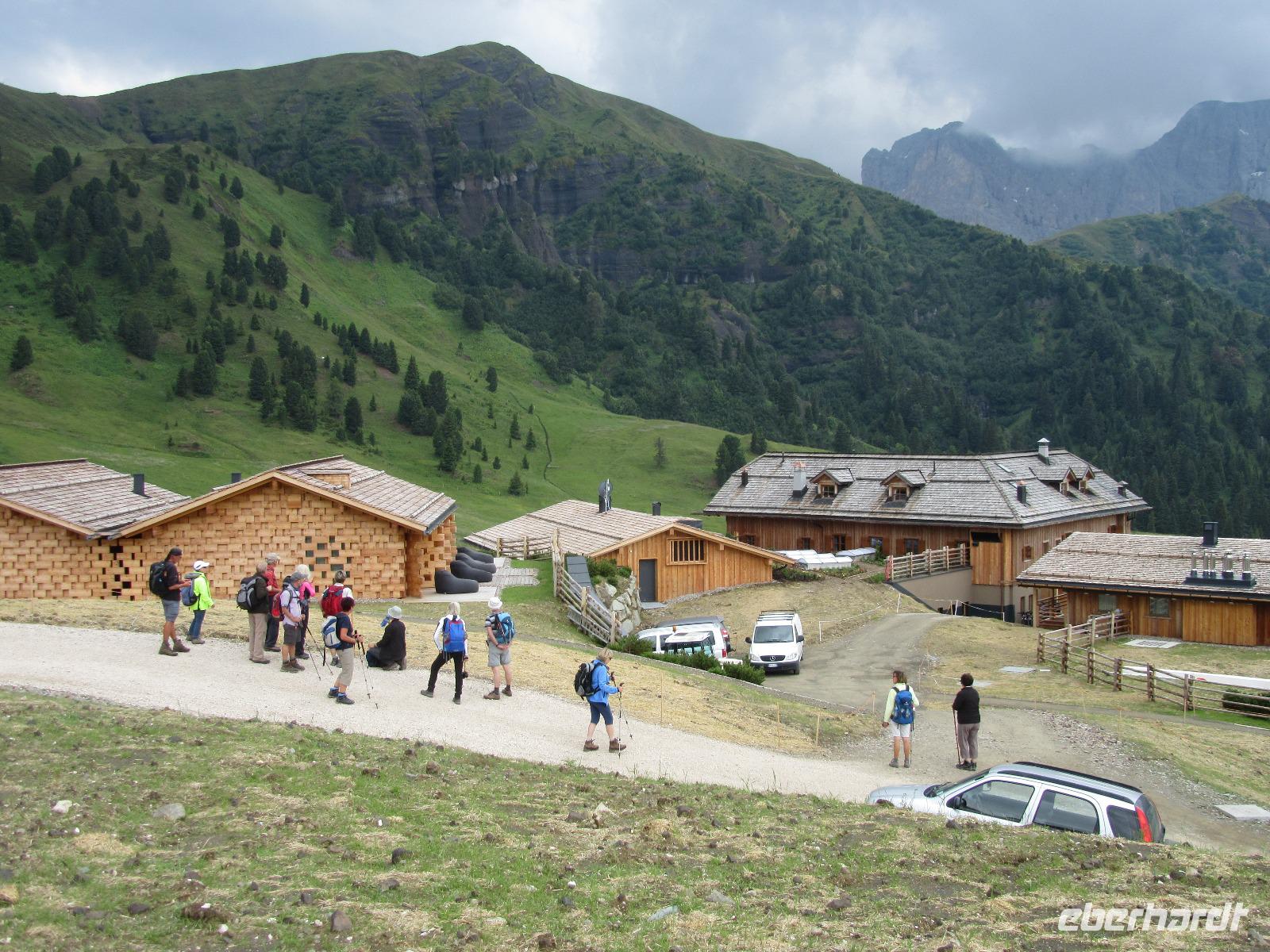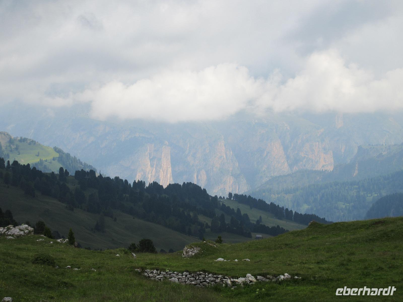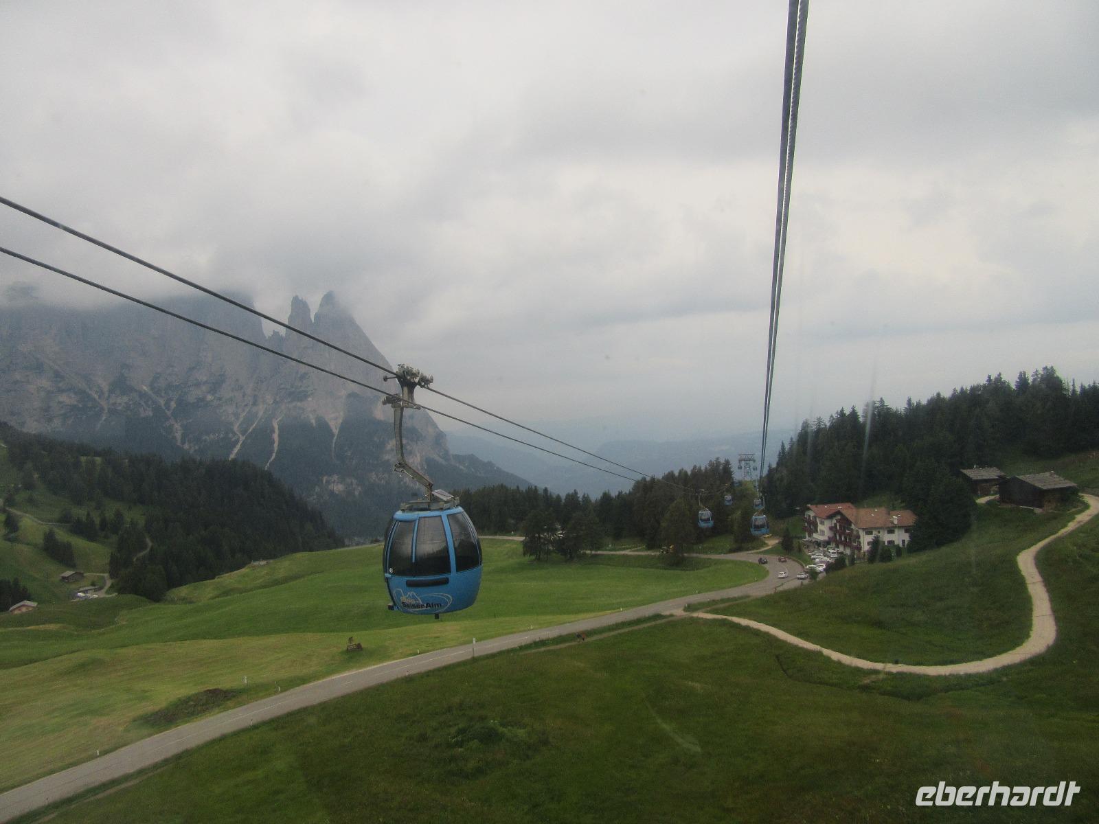 Gut gestärkt von Wieser´s reichhaltigem Frühstück chauffiert uns Christian heute ins imposante Grödnertal. Auf der fast anderthalb stündigen Strecke dahin erklärt uns Toni wieder allerlei Wissenswertes aus der Geschichte und Gegenwart Südtirols. Er ist wirklich ein Lexikon auf zwei Beinen! Ehe man es sich versieht, sind wir schon angekommen, kurz nach Wolkenstein, einem typisch touristischen Ort in dem gefühlt mehr Hotelgäste als Einwohner nächtigen, starten wir unsere heutige Tour. Oberhalb vom Sellajochhaus wandern wir auf breitem Weg mit leichtem Auf- und Abstiegen am Südhang der eindrucksvollen Langkofelgruppe zur Plattkofelhütte auf 2300m. Dort legen wir eine ausgiebige Rast ein - ein Teil verspeist die liebevoll zubereiteten Schnittchen, der andere Teil ließ sich von der Südtiroler Küche bei Speckknödl und Radler verwöhnen. Fröhlich geht es nun weiter über die Murmeltier-Hütte zur Almgaststätte Zallinger Scheige. Der Weg verläuft nun gemütlich hinunter bis Saltria, von wo aus wir mit dem Almenbus weiter nach Compatsch transferiert werden. Mit der Kabinenumlaufbahn überwinden wir nun die letzten Höhenmeter nach unten und erreichen Seis am Schlern. Ein letztes Mal können wir noch das beeindruckende Panorama auf den Schlern und die anderen Berge genießen.