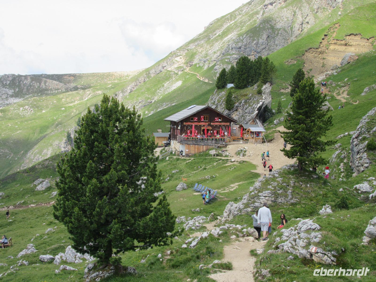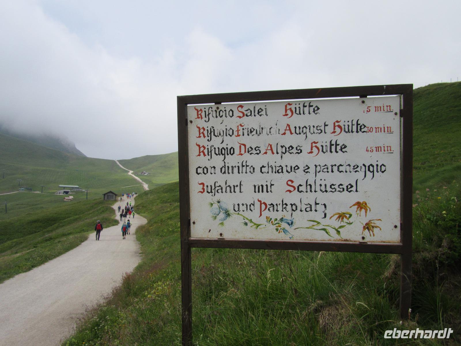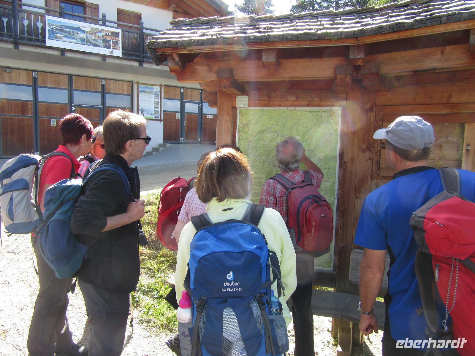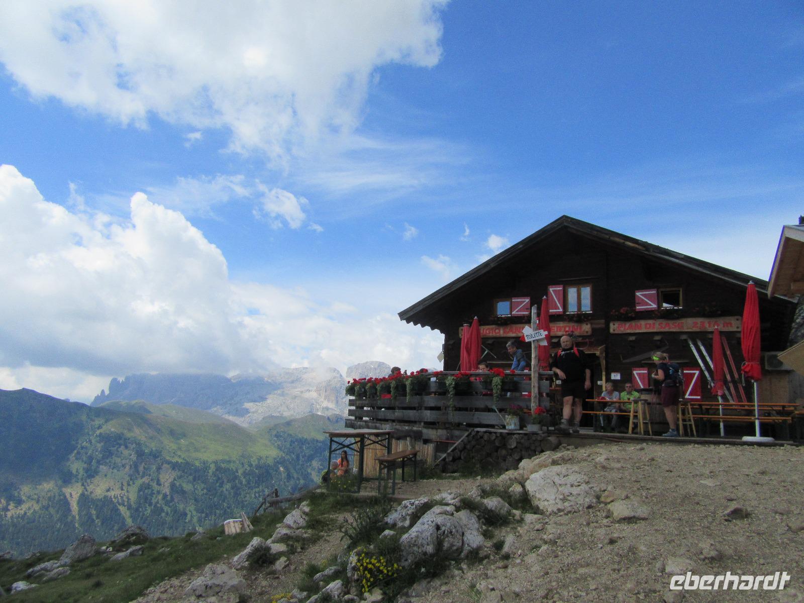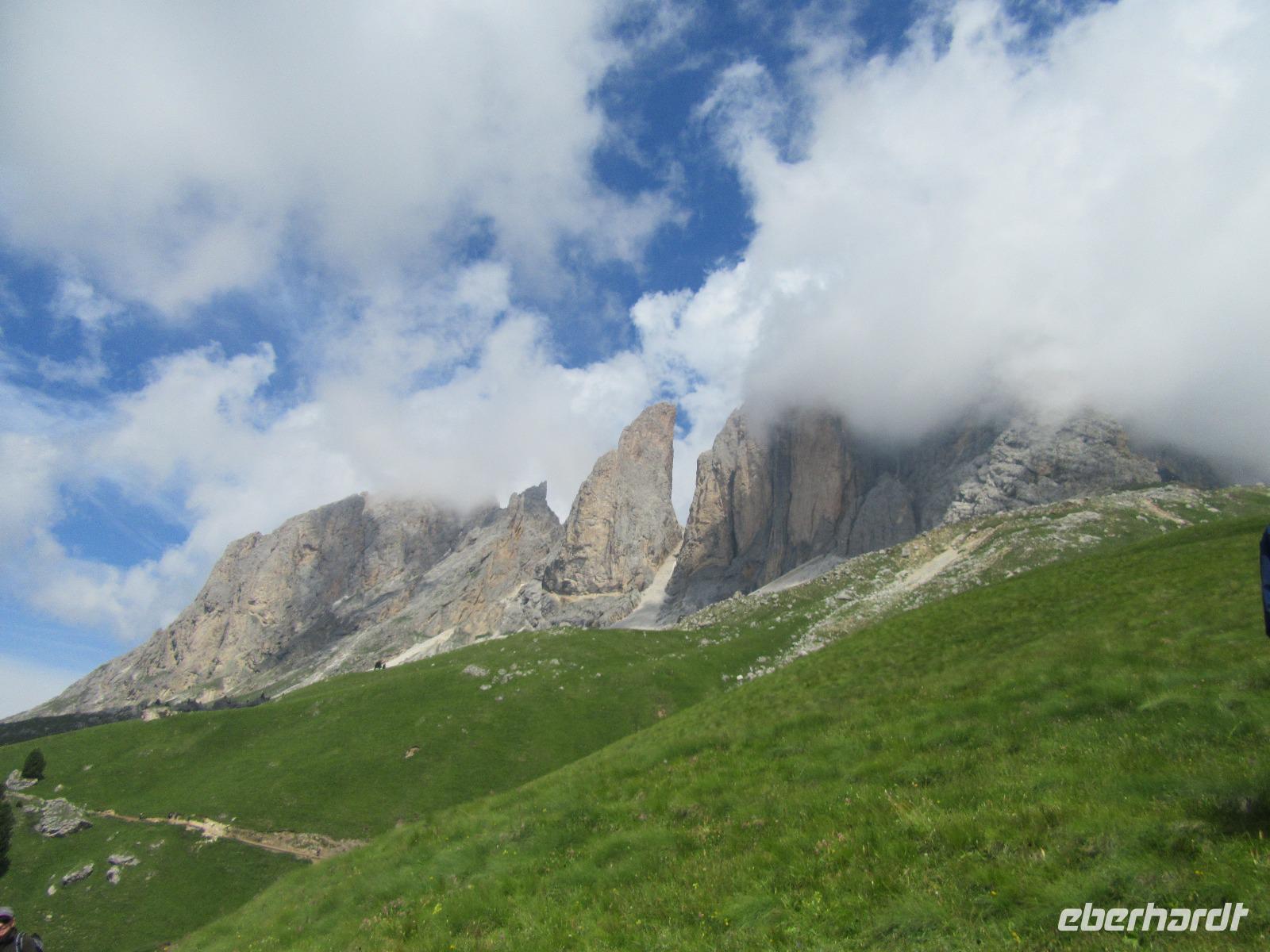 Gut gestärkt von Wieser´s reichhaltigem Frühstück chauffiert uns Christian heute ins imposante Grödnertal. Auf der fast anderthalb stündigen Strecke dahin erklärt uns Toni wieder allerlei Wissenswertes aus der Geschichte und Gegenwart Südtirols. Er ist wirklich ein Lexikon auf zwei Beinen! Ehe man es sich versieht, sind wir schon angekommen, kurz nach Wolkenstein, einem typisch touristischen Ort in dem gefühlt mehr Hotelgäste als Einwohner nächtigen, starten wir unsere heutige Tour. Oberhalb vom Sellajochhaus wandern wir auf breitem Weg mit leichtem Auf- und Abstiegen am Südhang der eindrucksvollen Langkofelgruppe zur Plattkofelhütte auf 2300m. Dort legen wir eine ausgiebige Rast ein - ein Teil verspeist die liebevoll zubereiteten Schnittchen, der andere Teil ließ sich von der Südtiroler Küche bei Speckknödl und Radler verwöhnen. Fröhlich geht es nun weiter über die Murmeltier-Hütte zur Almgaststätte Zallinger Scheige. Der Weg verläuft nun gemütlich hinunter bis Saltria, von wo aus wir mit dem Almenbus weiter nach Compatsch transferiert werden. Mit der Kabinenumlaufbahn überwinden wir nun die letzten Höhenmeter nach unten und erreichen Seis am Schlern. Ein letztes Mal können wir noch das beeindruckende Panorama auf den Schlern und die anderen Berge genießen.