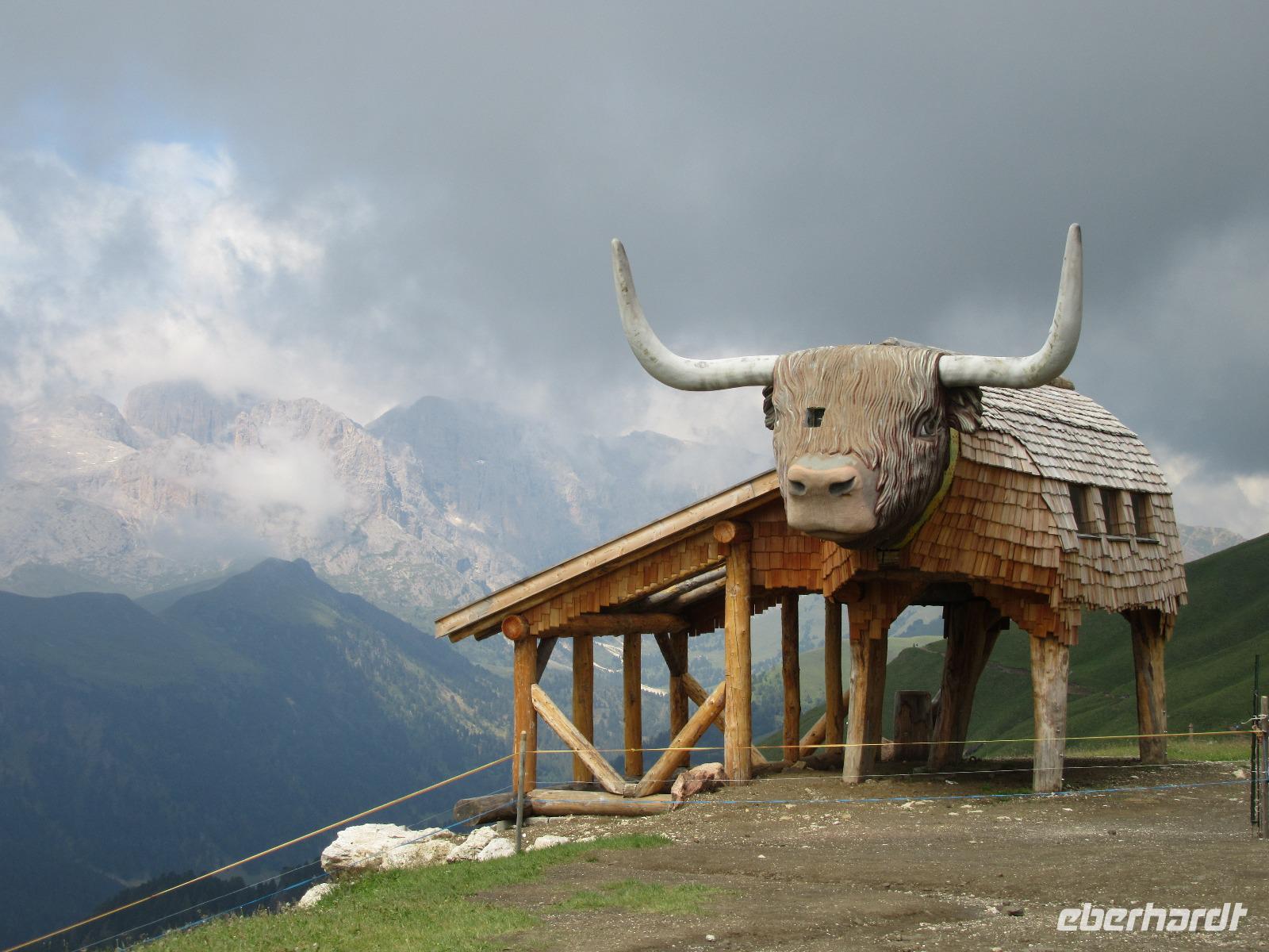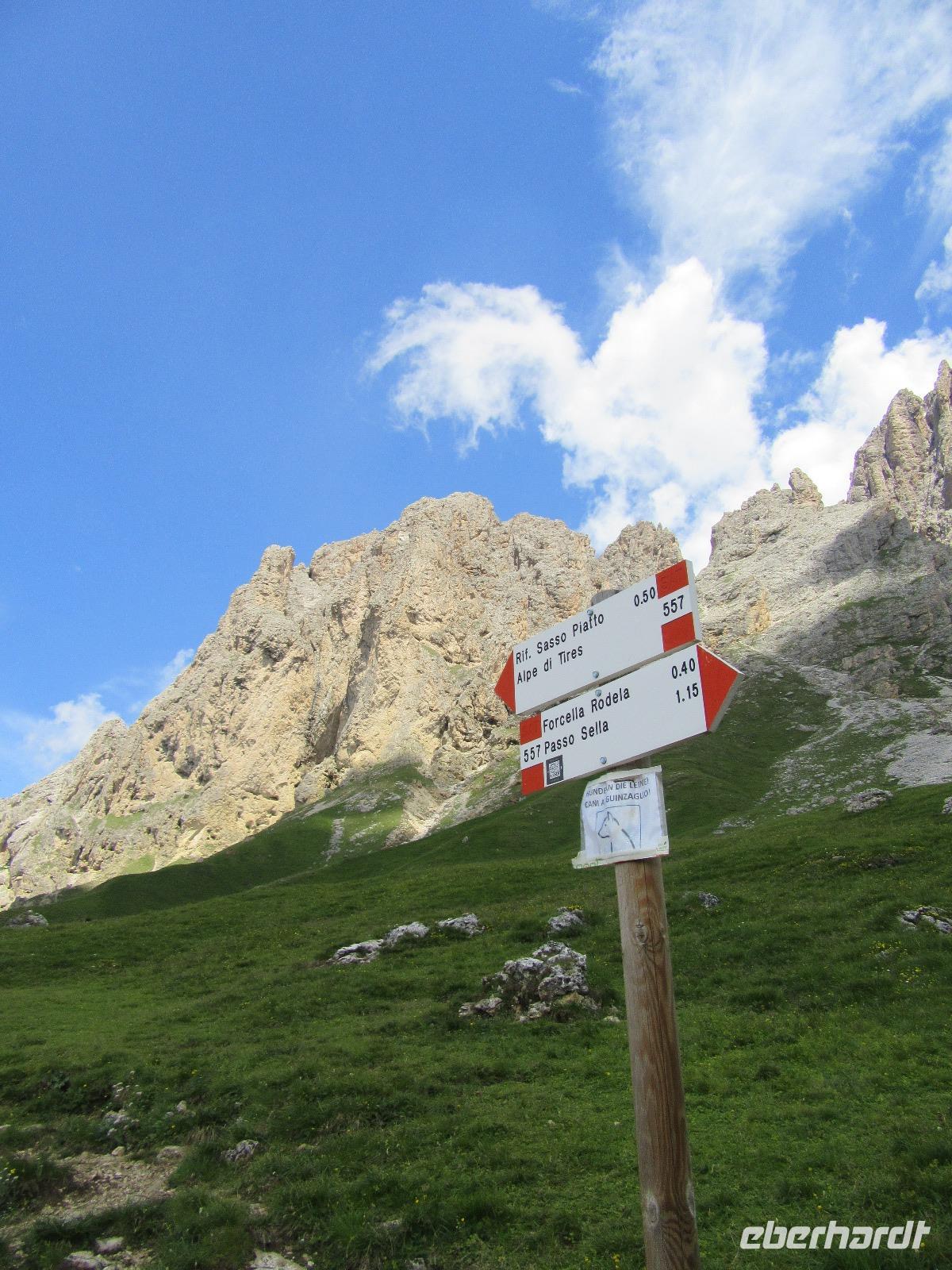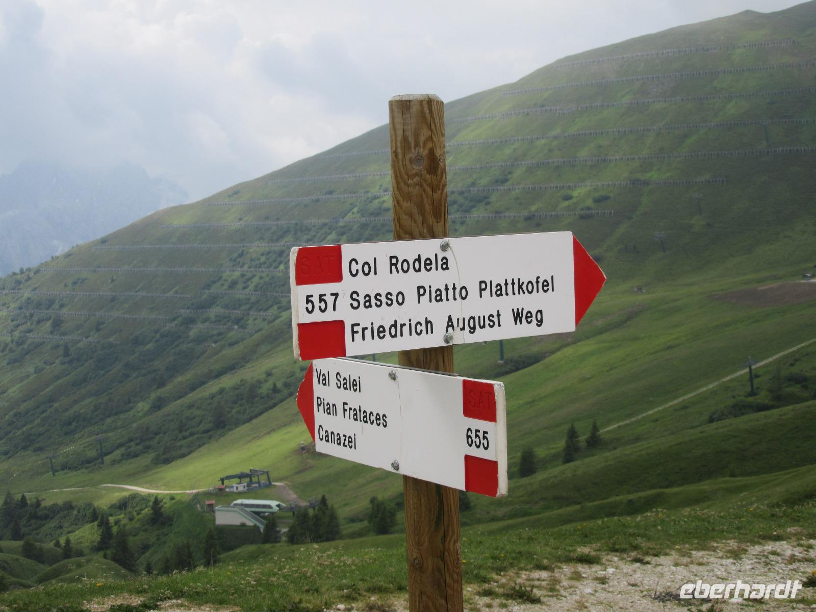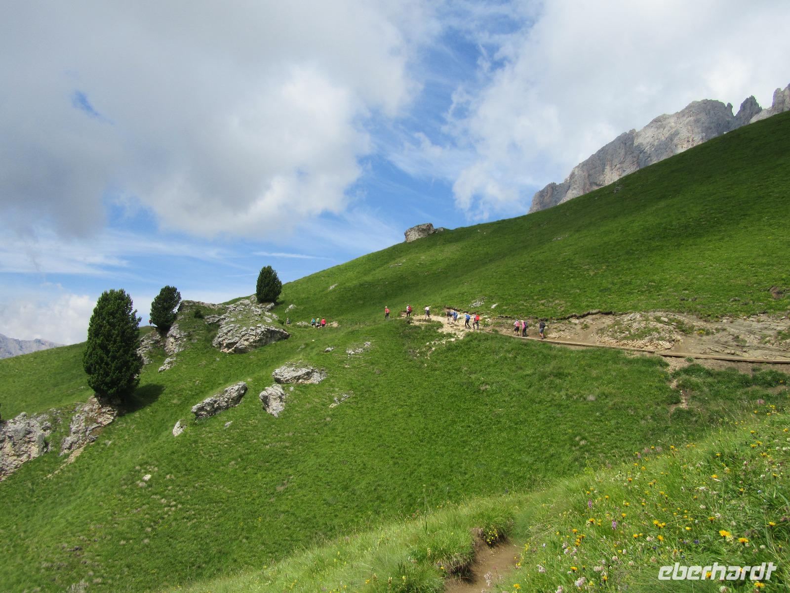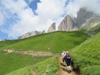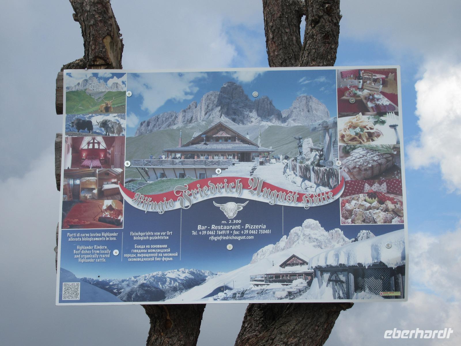 Gut gestärkt von Wieser´s reichhaltigem Frühstück chauffiert uns Christian heute ins imposante Grödnertal. Auf der fast anderthalb stündigen Strecke dahin erklärt uns Toni wieder allerlei Wissenswertes aus der Geschichte und Gegenwart Südtirols. Er ist wirklich ein Lexikon auf zwei Beinen! Ehe man es sich versieht, sind wir schon angekommen, kurz nach Wolkenstein, einem typisch touristischen Ort in dem gefühlt mehr Hotelgäste als Einwohner nächtigen, starten wir unsere heutige Tour. Oberhalb vom Sellajochhaus wandern wir auf breitem Weg mit leichtem Auf- und Abstiegen am Südhang der eindrucksvollen Langkofelgruppe zur Plattkofelhütte auf 2300m. Dort legen wir eine ausgiebige Rast ein - ein Teil verspeist die liebevoll zubereiteten Schnittchen, der andere Teil ließ sich von der Südtiroler Küche bei Speckknödl und Radler verwöhnen. Fröhlich geht es nun weiter über die Murmeltier-Hütte zur Almgaststätte Zallinger Scheige. Der Weg verläuft nun gemütlich hinunter bis Saltria, von wo aus wir mit dem Almenbus weiter nach Compatsch transferiert werden. Mit der Kabinenumlaufbahn überwinden wir nun die letzten Höhenmeter nach unten und erreichen Seis am Schlern. Ein letztes Mal können wir noch das beeindruckende Panorama auf den Schlern und die anderen Berge genießen.