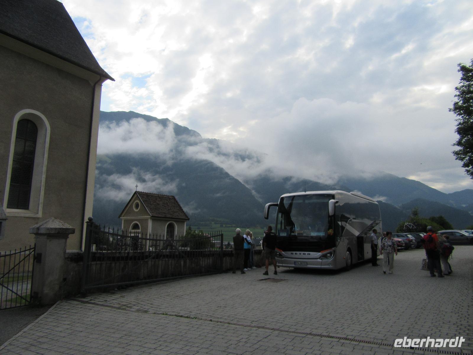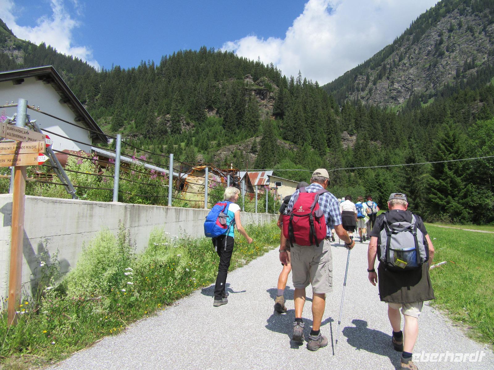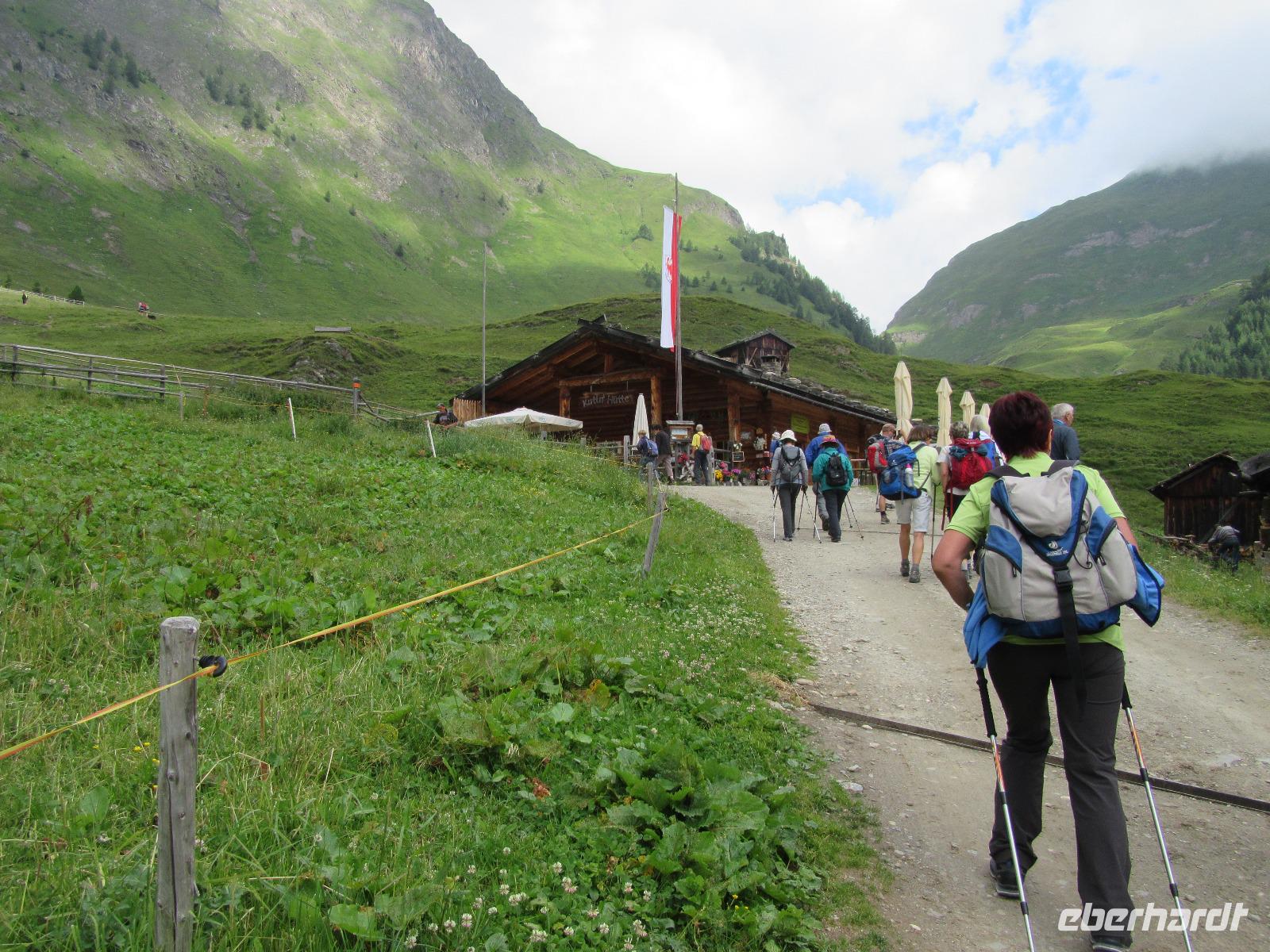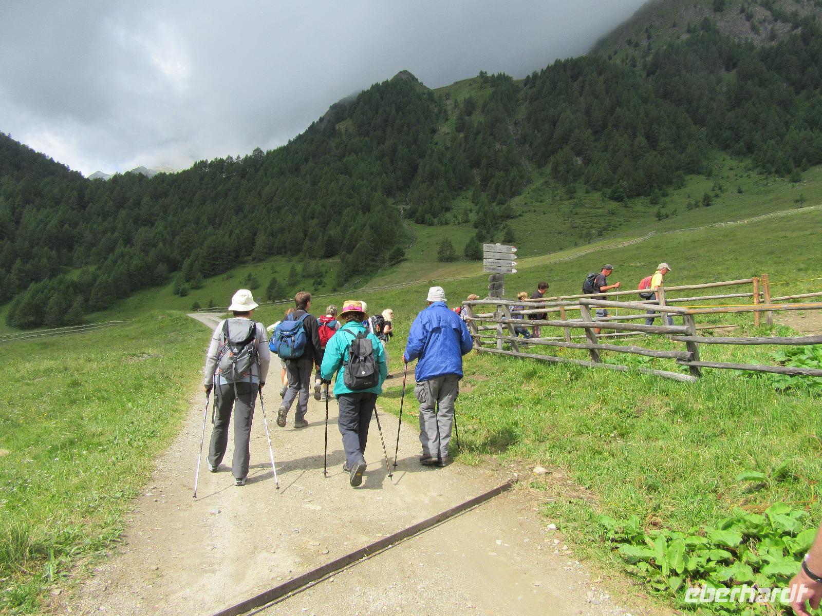 Heute geht es hoch hinaus, erst einmal mit dem Bus über den Jaufenpass zum Jaufenhaus auf 2000 Meter Höhe zum Ausgangspunkt der Wanderung. Uns erwartet eine Tour, die an sechs Almen vorbeiführt und uns die eine oder andere Einkehrmöglichkeit bietet. Als erstes laufen wir mit Toni zur Rinneralm, von dort geht es weiter zur Wasserfalleralm und Saxnerhütte. Immer wieder können wir fantastische Ausblicke zurück zum Jaufenhaus oder zur nahgelegenen Flecknerspitze genießen, bevor wir weiter marschieren über die Äußere und Innere Wumblsalm und schließlich zur Klammalm. Wir sind beeindruckt von der vielseitigen Landschaft und den vielen verschiedenen Blumen. Wir nutzen die Möglichkeit und verbringen unsere Mittagspause fast schon traditionell bei Brettljause oder Apfelstrudel in luftiger Höhe. Gestärkt und etwas regeneriert wandern wir nun talabwärts, erst einmal sprichwörtlich über Stock und Stein und mit großer Vorsicht. Die Anstrengungen werden nun von Doreen belohnt mit einem regionalen Kräuterschnaps. Da geht es gleich viel besser zum letzten Entspurt nach Flading und anschließend über den Barfußweg zu unserem Bus. Etwas geschafft machen wir uns nun auf den Rückweg. Doch Toni wäre nicht Toni, wenn er nicht noch einen kleinen Zusatzabstecher in die Kirche Maria Moos, um uns noch mit ein paar Informationen dazu zu versorgen. Nun aber geht es wieder zurück ins Hotel, damit sich Jeder noch etwas erholen kann, bevor uns Wiesers Küchenteam wieder Gaumenfreuden bereitet.