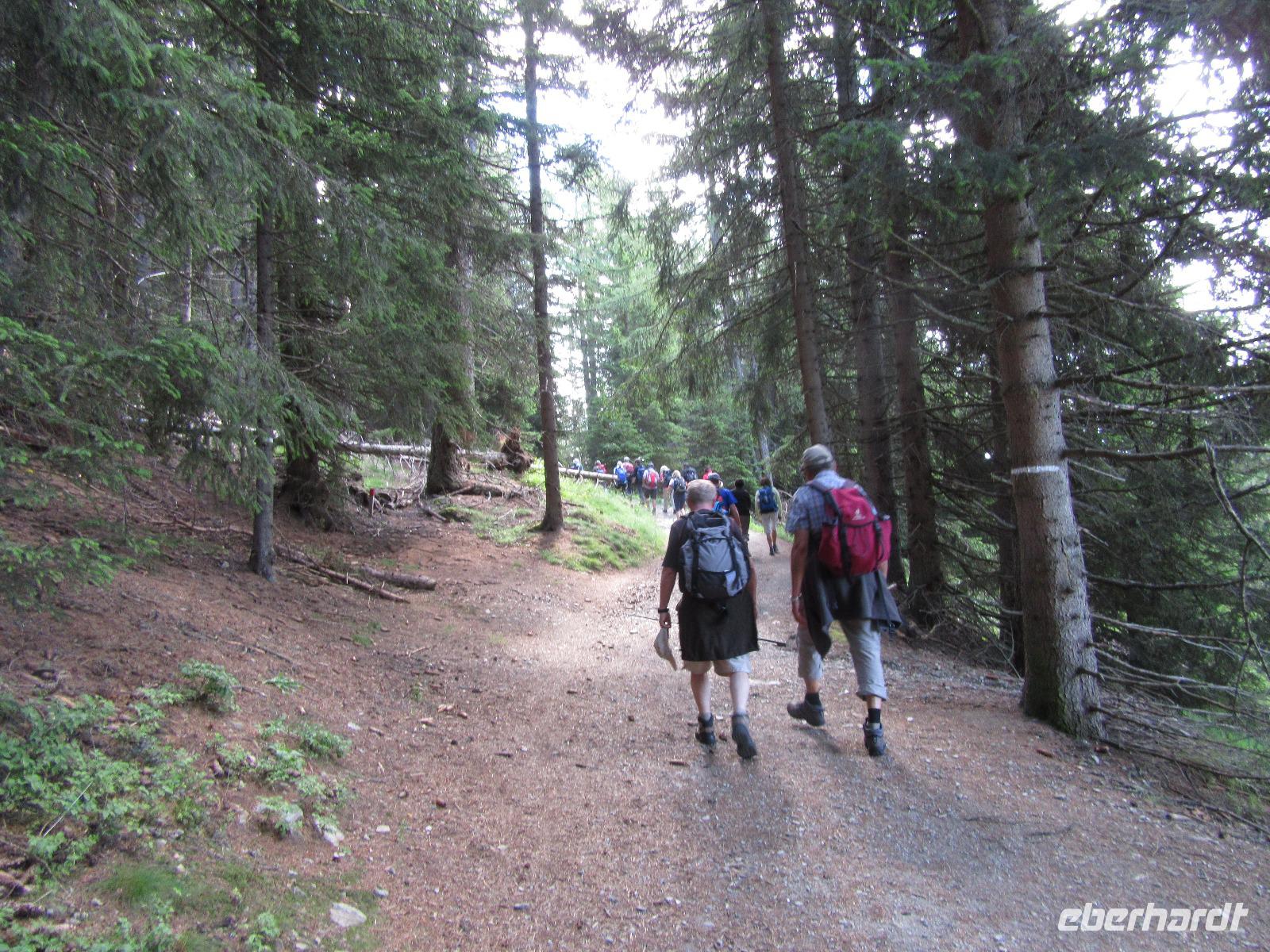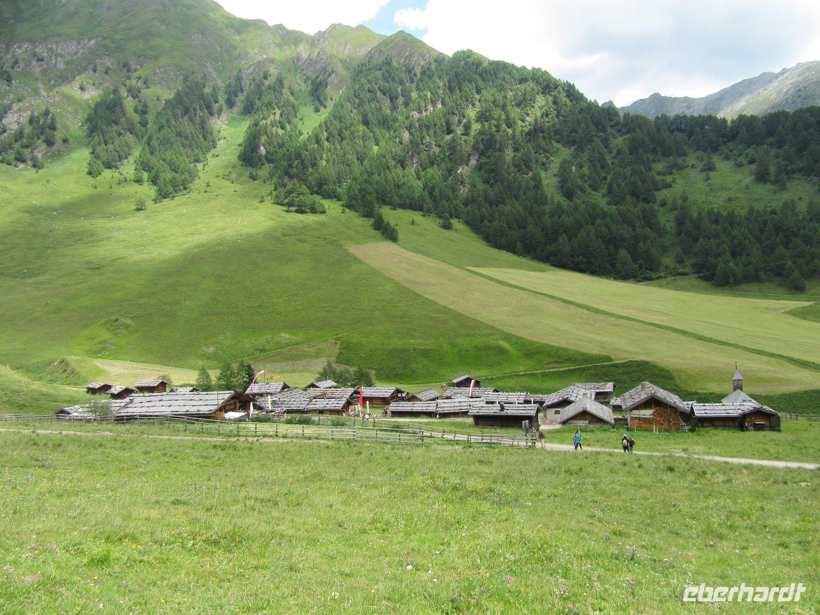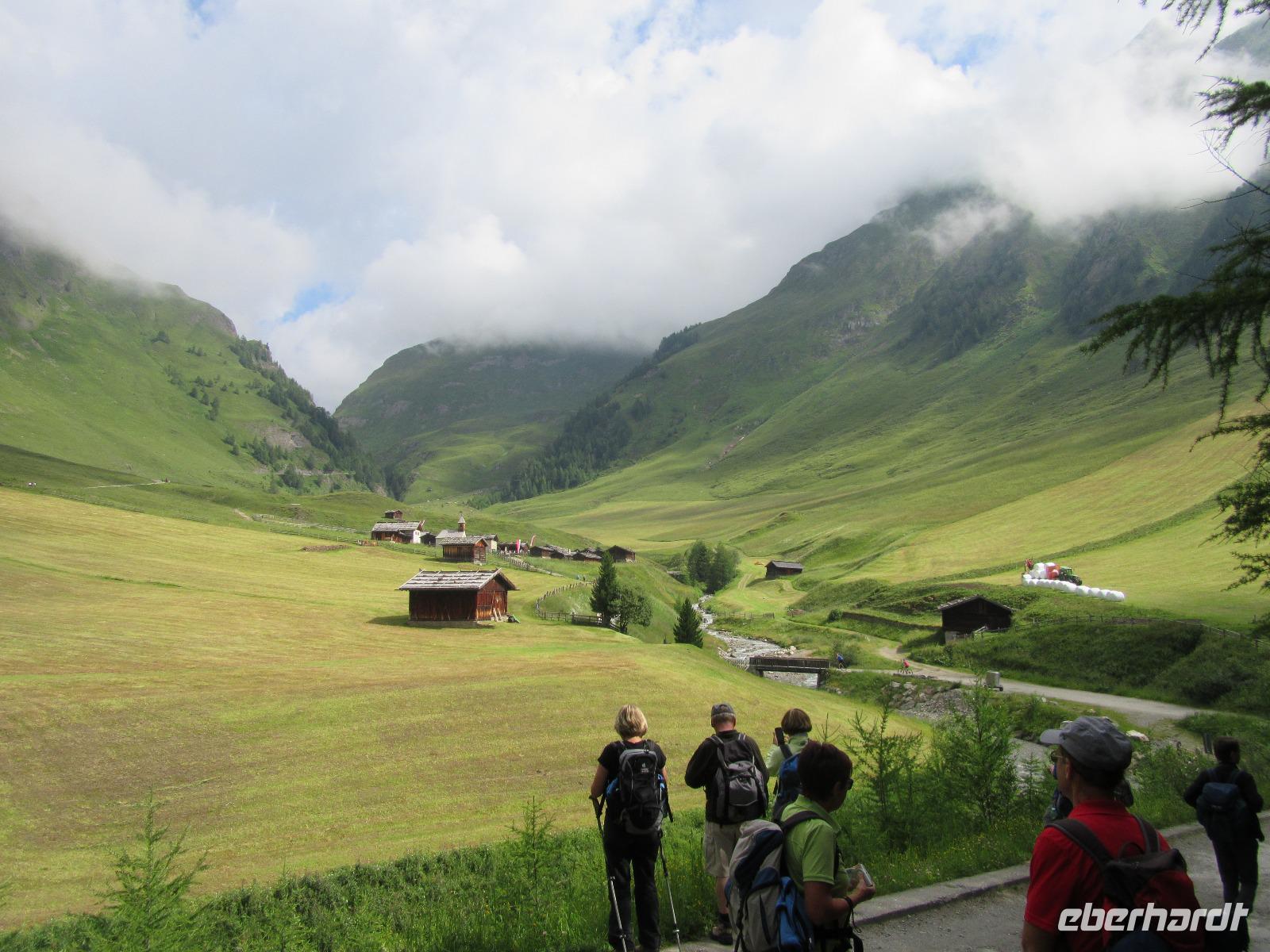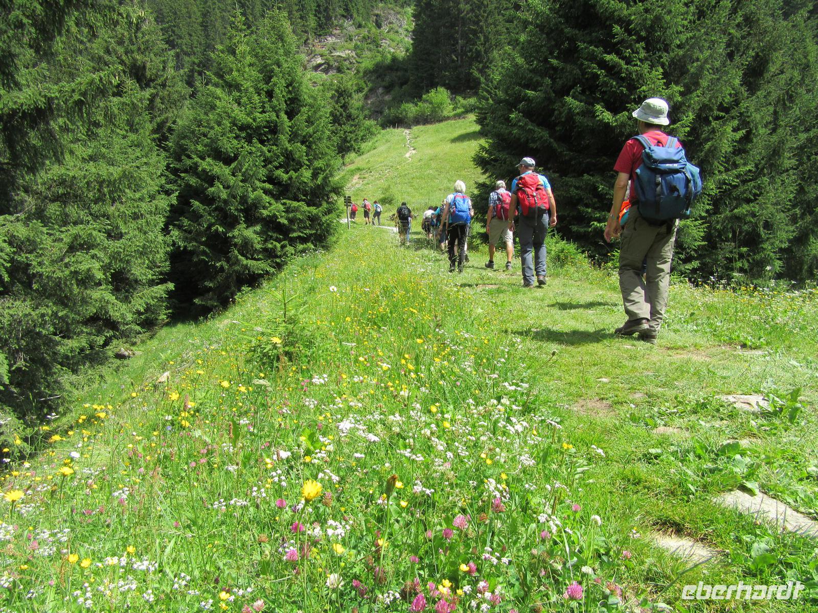 Heute geht es hoch hinaus, erst einmal mit dem Bus über den Jaufenpass zum Jaufenhaus auf 2000 Meter Höhe zum Ausgangspunkt der Wanderung. Uns erwartet eine Tour, die an sechs Almen vorbeiführt und uns die eine oder andere Einkehrmöglichkeit bietet. Als erstes laufen wir mit Toni zur Rinneralm, von dort geht es weiter zur Wasserfalleralm und Saxnerhütte. Immer wieder können wir fantastische Ausblicke zurück zum Jaufenhaus oder zur nahgelegenen Flecknerspitze genießen, bevor wir weiter marschieren über die Äußere und Innere Wumblsalm und schließlich zur Klammalm. Wir sind beeindruckt von der vielseitigen Landschaft und den vielen verschiedenen Blumen. Wir nutzen die Möglichkeit und verbringen unsere Mittagspause fast schon traditionell bei Brettljause oder Apfelstrudel in luftiger Höhe. Gestärkt und etwas regeneriert wandern wir nun talabwärts, erst einmal sprichwörtlich über Stock und Stein und mit großer Vorsicht. Die Anstrengungen werden nun von Doreen belohnt mit einem regionalen Kräuterschnaps. Da geht es gleich viel besser zum letzten Entspurt nach Flading und anschließend über den Barfußweg zu unserem Bus. Etwas geschafft machen wir uns nun auf den Rückweg. Doch Toni wäre nicht Toni, wenn er nicht noch einen kleinen Zusatzabstecher in die Kirche Maria Moos, um uns noch mit ein paar Informationen dazu zu versorgen. Nun aber geht es wieder zurück ins Hotel, damit sich Jeder noch etwas erholen kann, bevor uns Wiesers Küchenteam wieder Gaumenfreuden bereitet.