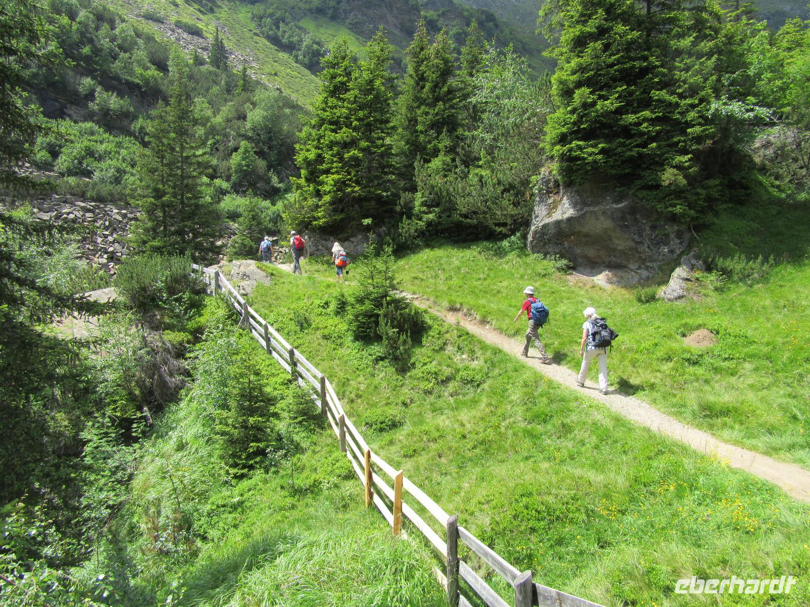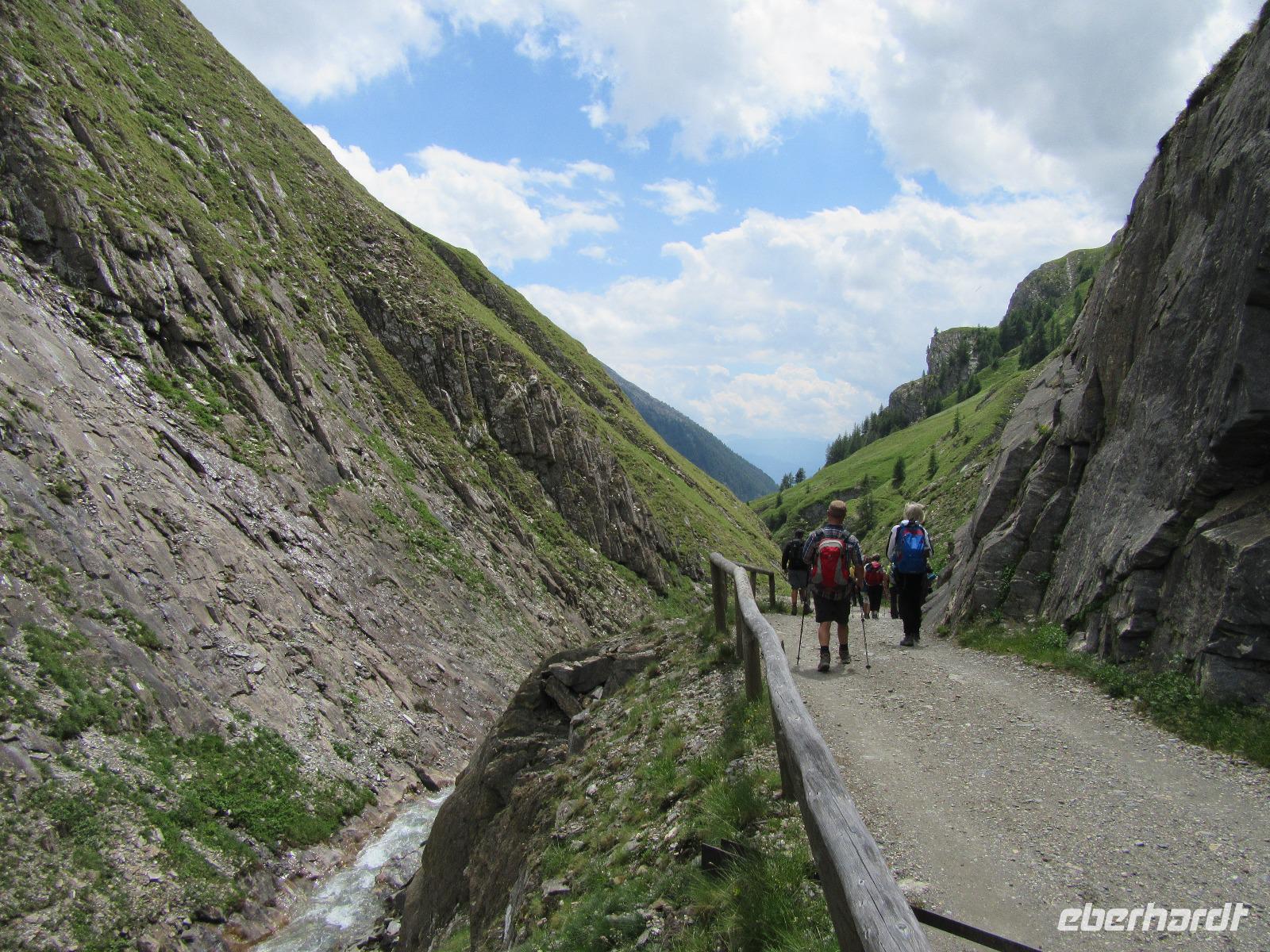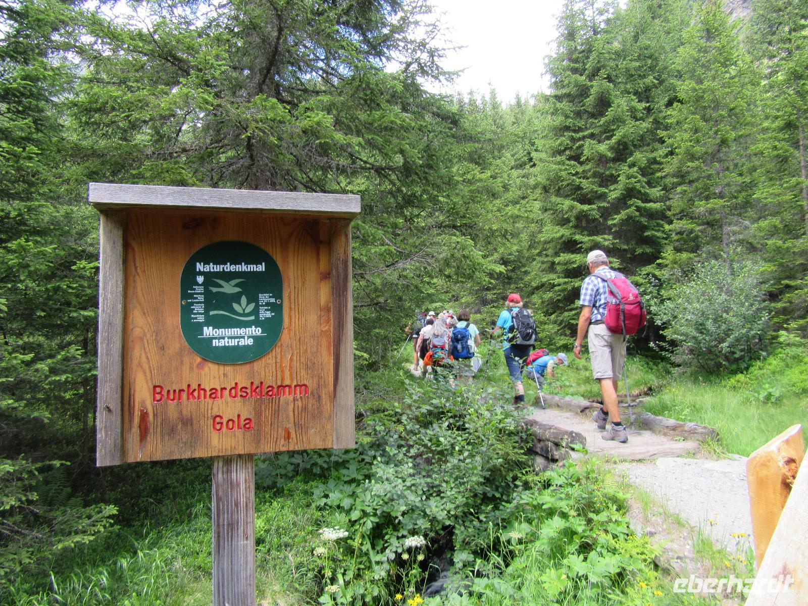 Wieder am Bus angekommen, fahren wir weiter nach Maiern, in das hinterste Ridnauntal bis zum Museumsbereich Erzaufbereitung. Nach einem Anstieg hinauf zum Furthboden erreichen wir den Eingang der Burkhardklamm. Wir können eindrucksvoll erleben, wie der Fernerbach tosend in die Tiefe stürzt und uns stellenweise eine gelungene Abkühlung beschert. Unsere Mittagspause legen wir in der Aglsalm, auf 1700m ein, bevor wir wieder zurückwandern. Aber was ist das? Toni führt uns abseits des Weges über einen Fluss, etwas abenteuerlich aber zugleich auch sehr amüsant, wie wir über das Wasser und die Steine gewankt sind. Alle haben es bravorös gemeisert und sich das Tapferkeitsabzeichen verdient ;-). Nun geht es stetig bergab hinunter zum Ausgangspunkt unserer Wanderung. Als ob wir nicht schon genug verwöhnt wurden, dürfen wir bei Wiesers Platz nehmen und bei lecker Kaffee und Kuchen den Tag Revue passieren lassen. Bis zum Abend hat nun jeder noch Zeit das kleine, beschauliche Örtchen zu erkunden oder die Annehmlichkeiten des Hotels zu genießen.