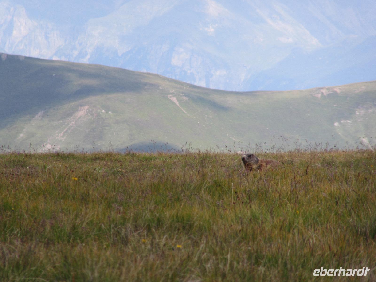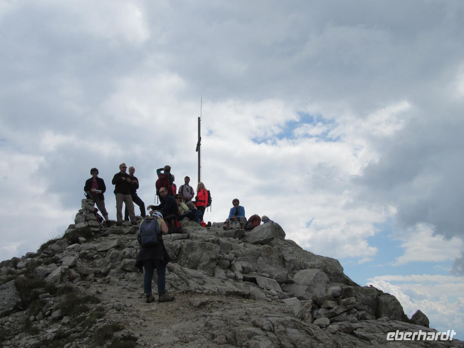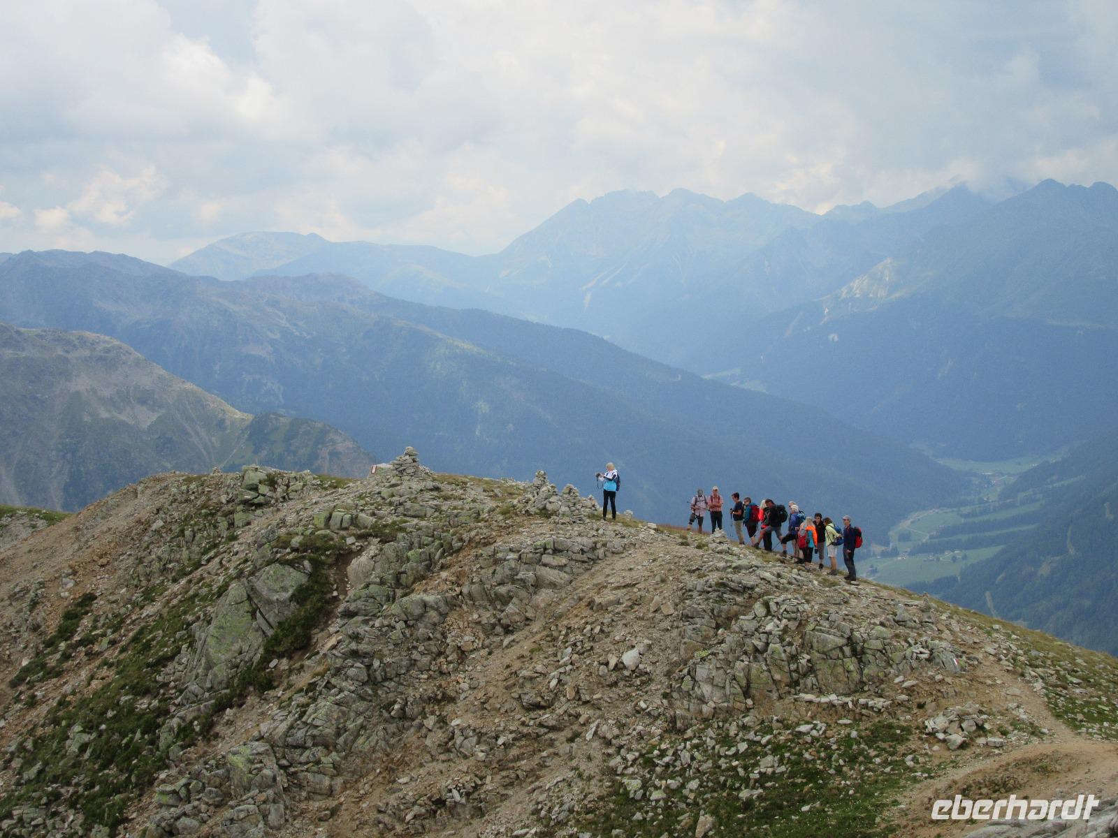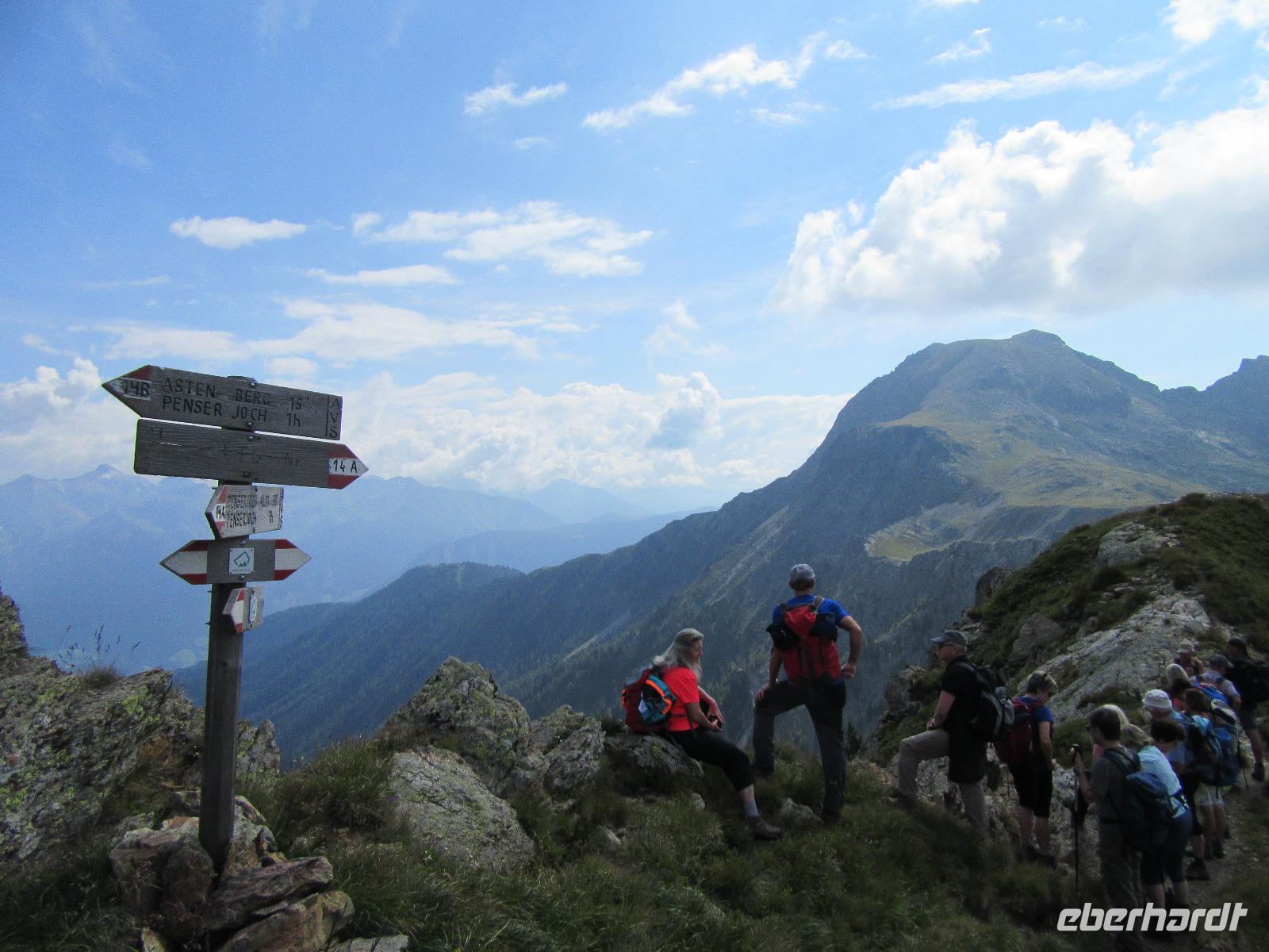 Unsere letzte gemeinsame Tour in diesem Wanderparadies führt uns heute auf die Tatschspitze, auf 2522m. Doch zuerst „erklimmen" wir das Penser Joch, mit dem Bus eine ganz schön kurvige Angelegenheit, aber unser Chauffeur Christian meistert auch diese Hürde sehr gut. Etwas unterhalb vom Penser Jochhaus rüsten wir uns nun für unsere Bergtour. Der Weg bietet eine Menge Abwechslung und immer wieder eine grandiose Aussicht in das Sterzinger Talbecken, aber auch die umliegenden Gipfel sind bei wieder traumhaftem Wetter bestens zu sehen. Toni kennt sie wie seine eigene Westentasche und lässt keine Frage unbeantwortet. Alle sind hoch motiviert und gehen vergnügt den Höhenweg entlang. Kurz vor dem Aufstieg können wir sogar noch zwei Murmeltiere beim Fangerspielen beobachten. Nun aber geht es hinauf, etwas steiler und in mehreren Serpentinen und sehr gerölligem Weg. Aber Alle erreichen das heutige Tagesziel und genießen einen fantastischen Rundumblick auf die Stubaier-, Zillertaler- und Sarntaler Alpen. Bei einer Gipfelrast lassen wir dies auf uns wirken und sammeln Kraft für den Abstieg. Wir wünschen „Berg Heil" und begießen bei einem kleinen Schnapserl von Toni unsere Leistung. Der Rückweg steht ganz im Zeichen „Auf den Spuren der Bergziegen", denn eine ganze Herde davon begleitet uns mit lautem Glockengeläut ins Tal hinunter - ein köstliches und amüsantes Erlebnis. In der Seebergalm finden wir etwas Schutz vor der Herde und rasten kurz, bevor wir allerdings von einem besonders wütenden Alm-Öhi und seiner Bergzicke vertrieben werden. Wir lassen uns aber die gute Laune nicht verderben und gehen hinunter nach Asten zum Gasthof Elisabeth. Dort sind wir herzlich Willkommen und genießen die Tiroler Gastfreundlichkeit. Bevor wir zurück ins Hotel fahren, legen wir noch einen kleinen Fotostopp am Penser Joch ein und lassen die tolle Aussicht nochmal auf uns wirken.