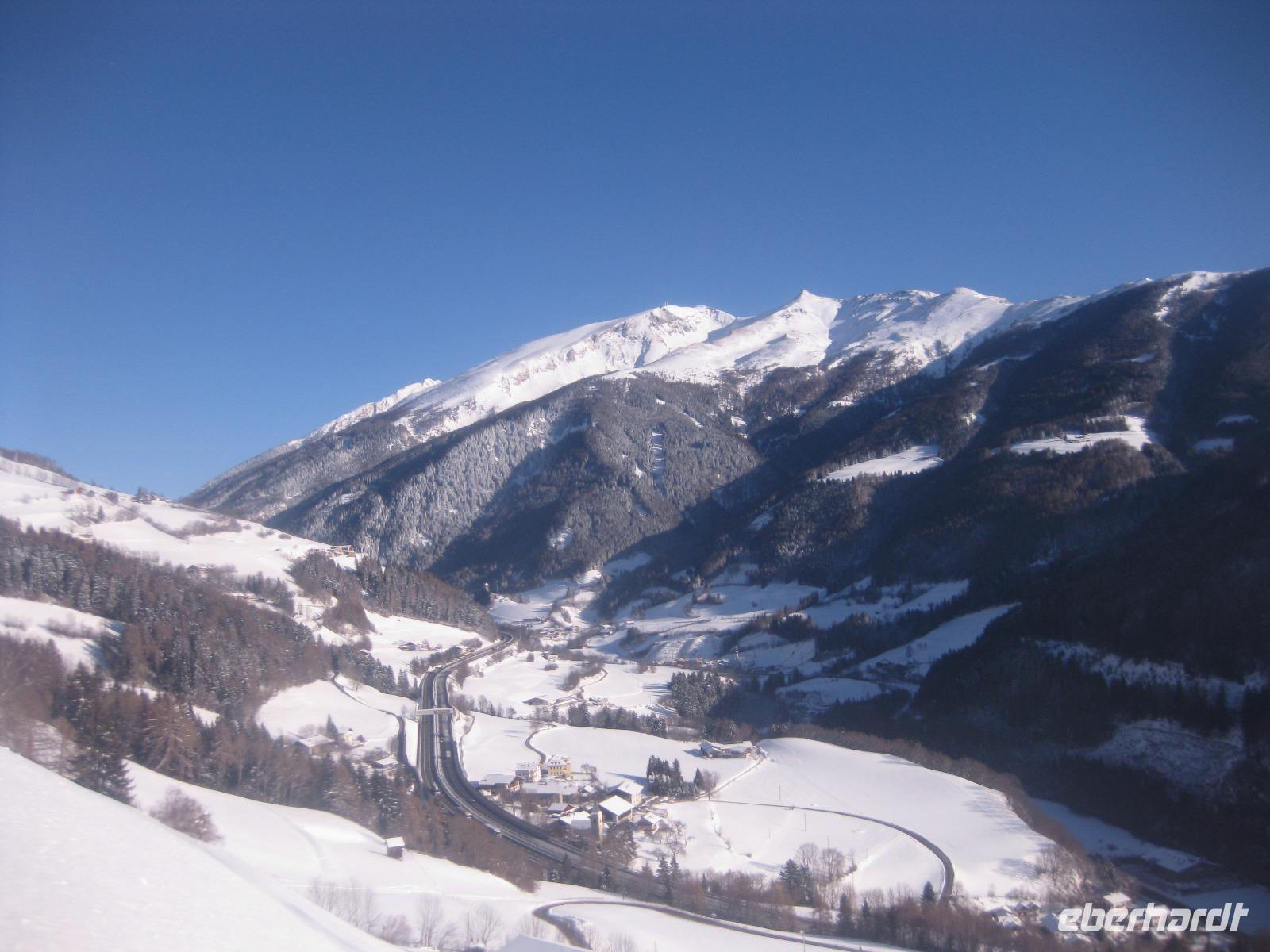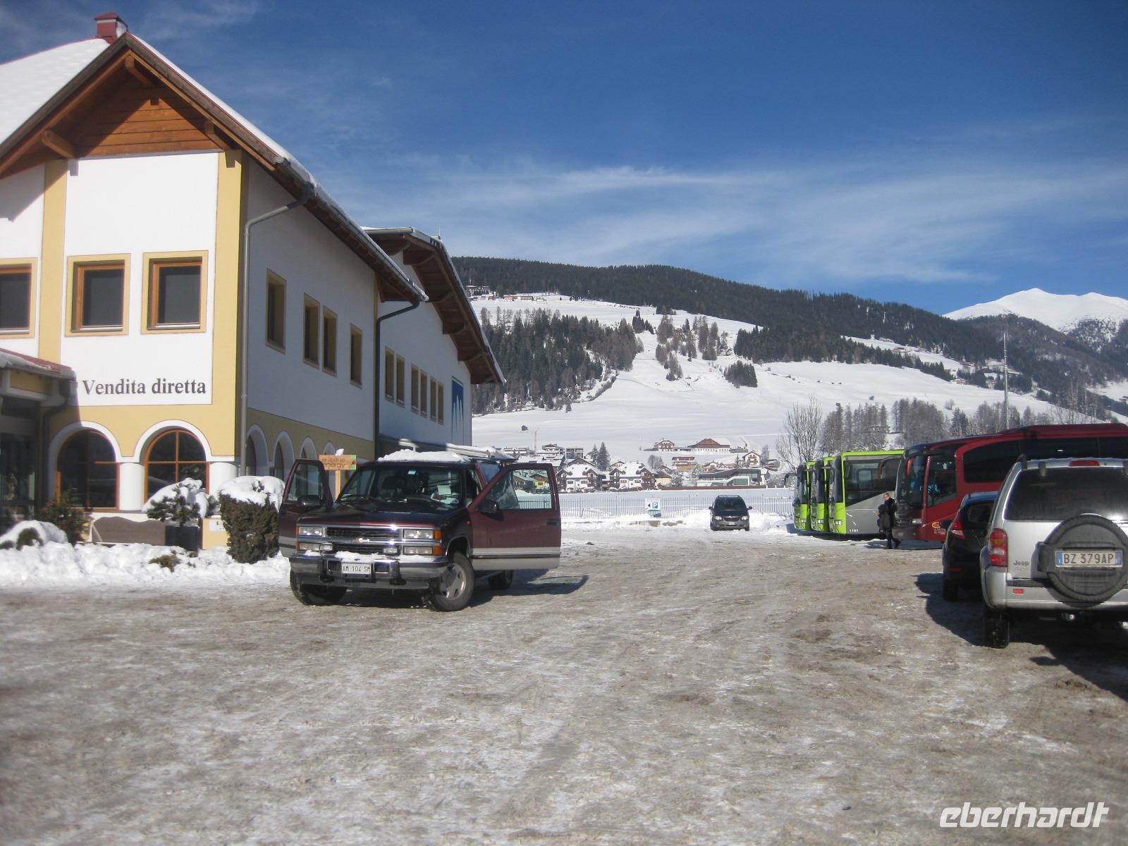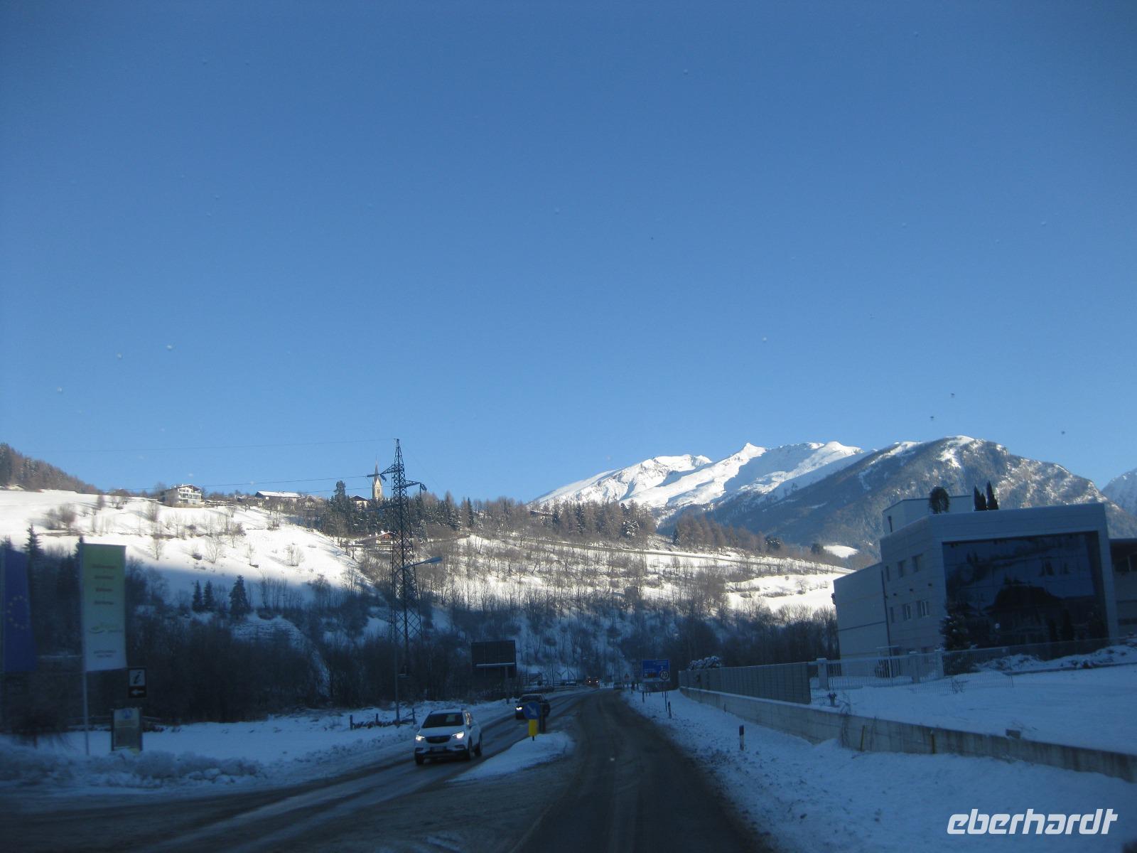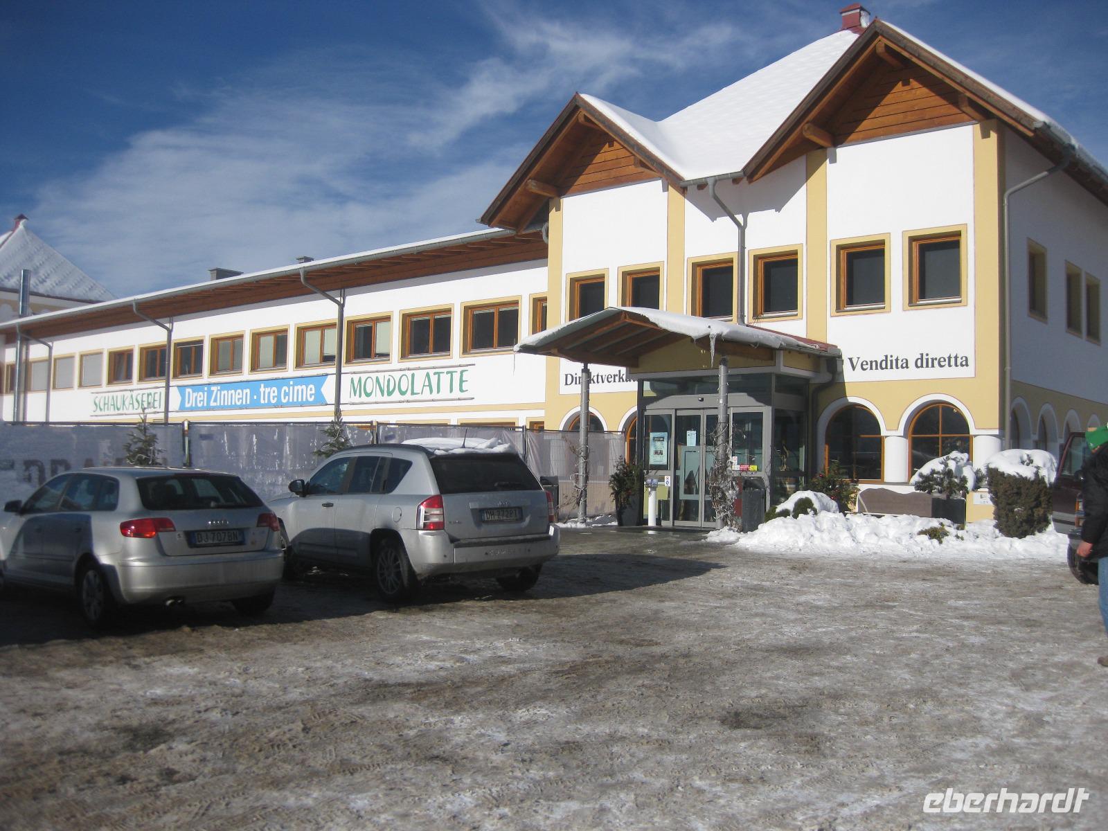 Heute haben wir wieder super Wetter mit blauem Himmel und Sonnenschein. Wir fahren wieder nach Sterzing und auf der Autobahn bis zur Abfahrt Brixen. Dort fahren wir in das Pustertal hinein. Auf der Pustertalstraße fahren wir vorbei an Bruneck und Olang mit dem Kronplatz bis nach Toblach zur Schaukäserei "Drei Zinnen". Unterwegs wechseln sich strahlend blauer Himmel und Sonnenschein mit Nebelbänken im Tal ab. Wir können dabei die spektakuläre Winterlandschaft mit viel Schnee und Rauhreif bewundern - wie im Märchen.