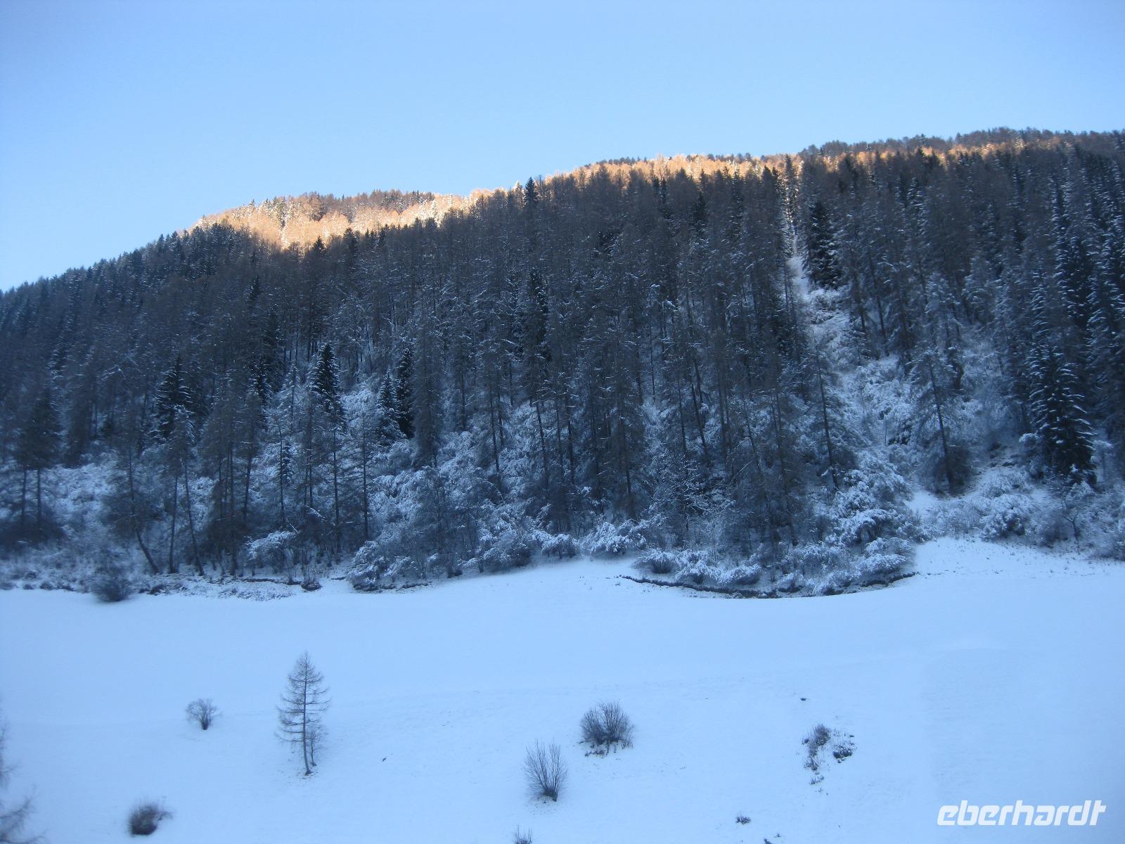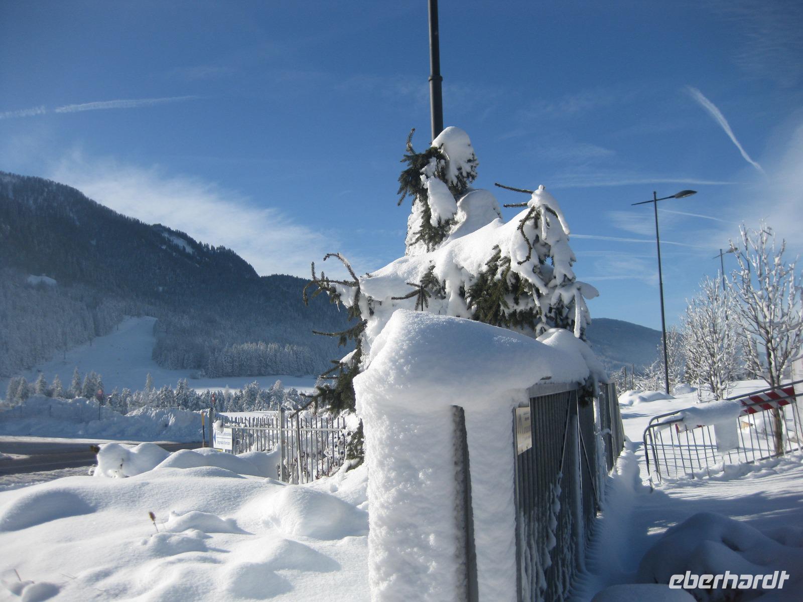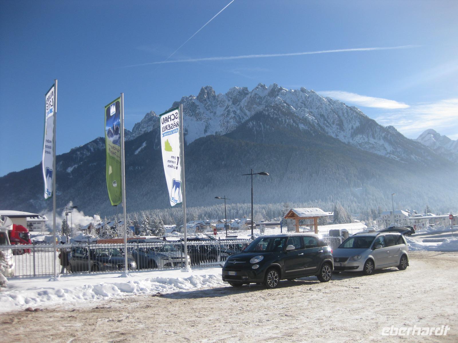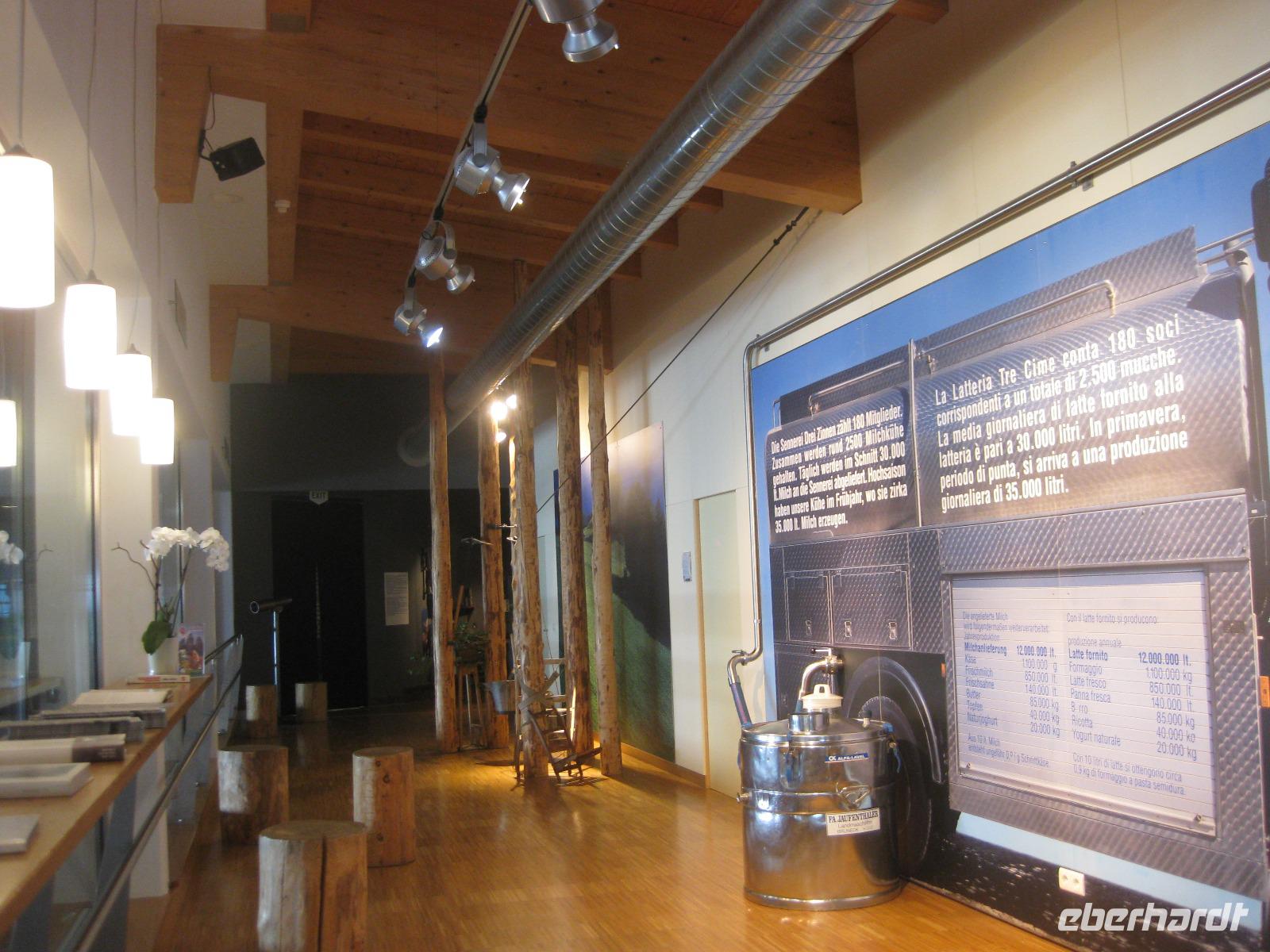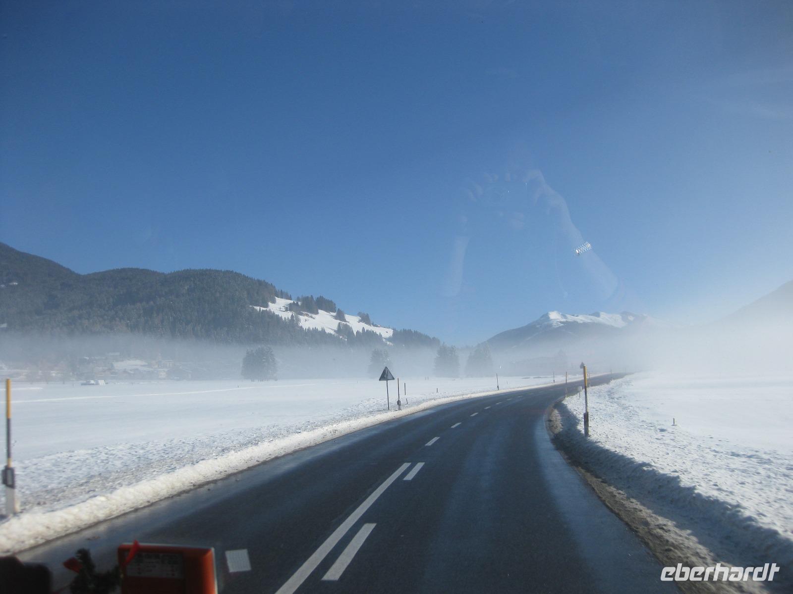 Heute haben wir wieder super Wetter mit blauem Himmel und Sonnenschein. Wir fahren wieder nach Sterzing und auf der Autobahn bis zur Abfahrt Brixen. Dort fahren wir in das Pustertal hinein. Auf der Pustertalstraße fahren wir vorbei an Bruneck und Olang mit dem Kronplatz bis nach Toblach zur Schaukäserei "Drei Zinnen". Unterwegs wechseln sich strahlend blauer Himmel und Sonnenschein mit Nebelbänken im Tal ab. Wir können dabei die spektakuläre Winterlandschaft mit viel Schnee und Rauhreif bewundern - wie im Märchen.