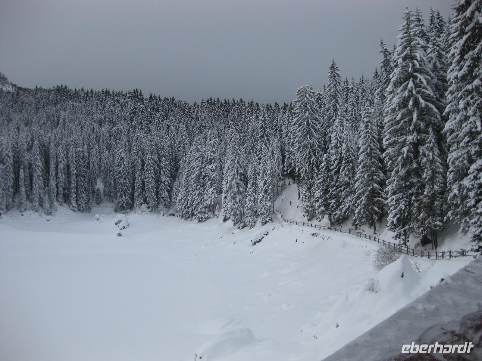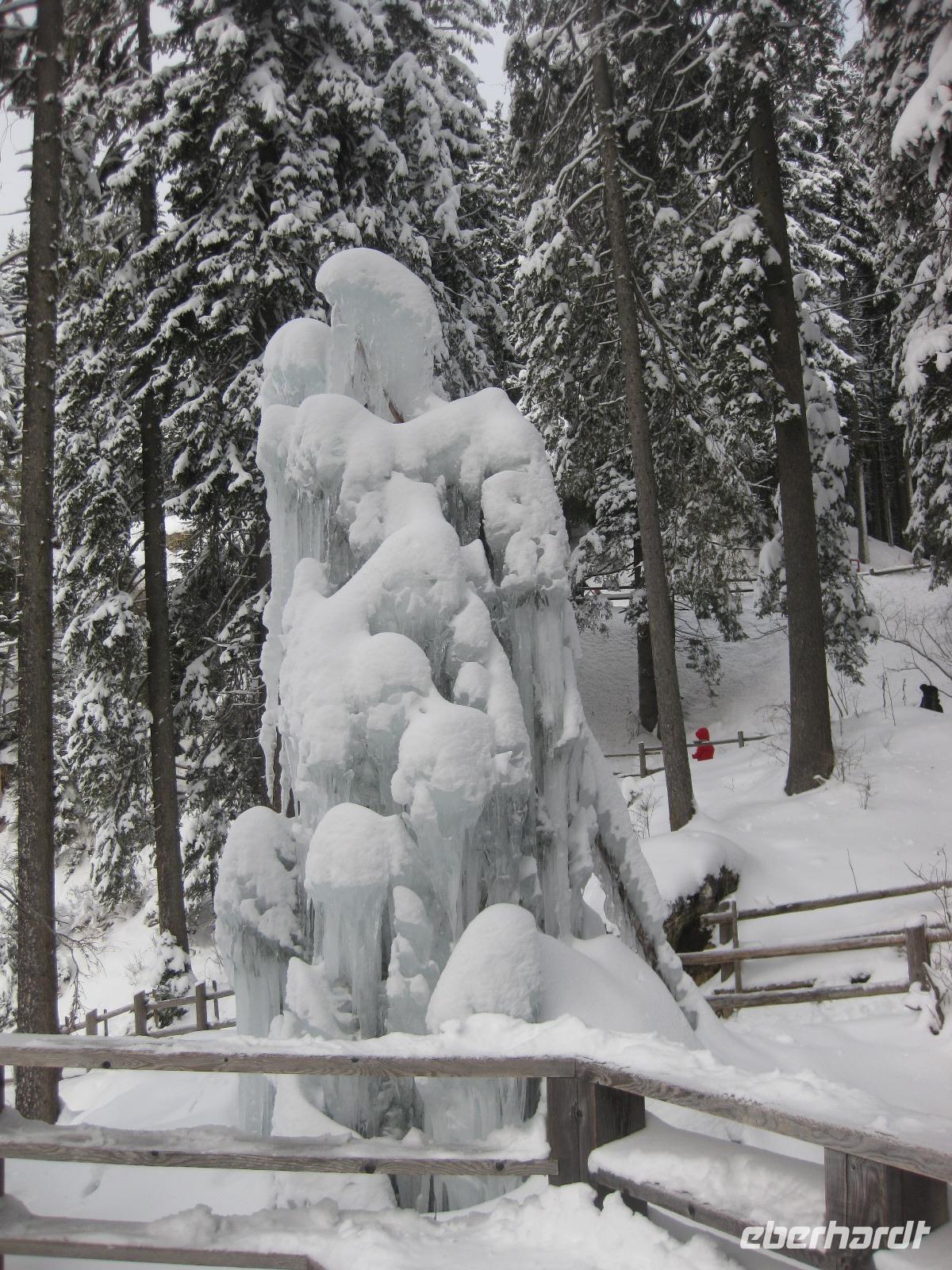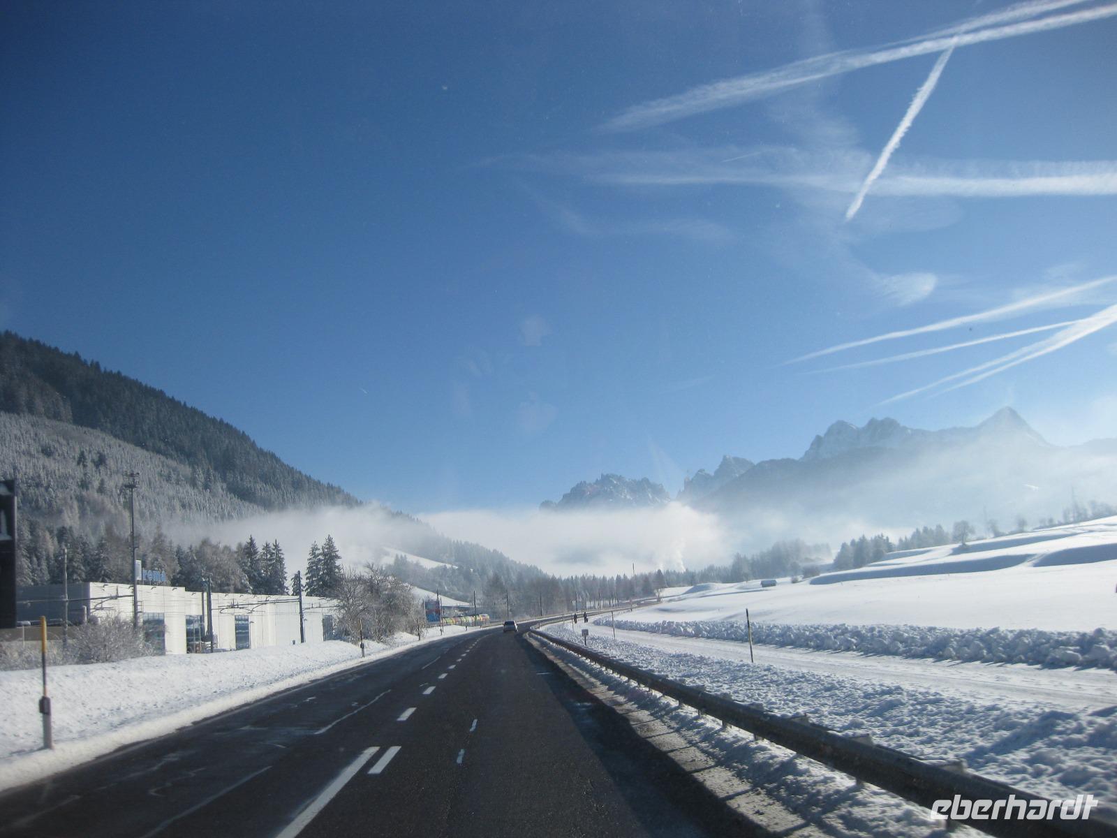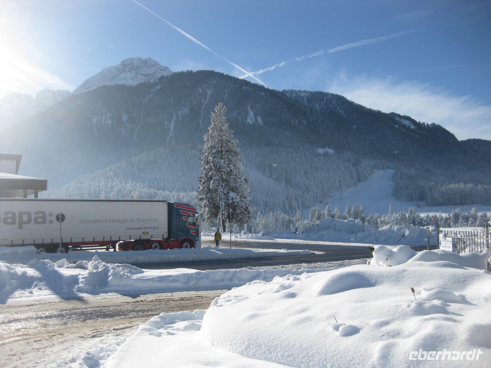 Heute haben wir wieder super Wetter mit blauem Himmel und Sonnenschein. Wir fahren wieder nach Sterzing und auf der Autobahn bis zur Abfahrt Brixen. Dort fahren wir in das Pustertal hinein. Auf der Pustertalstraße fahren wir vorbei an Bruneck und Olang mit dem Kronplatz bis nach Toblach zur Schaukäserei "Drei Zinnen". Unterwegs wechseln sich strahlend blauer Himmel und Sonnenschein mit Nebelbänken im Tal ab. Wir können dabei die spektakuläre Winterlandschaft mit viel Schnee und Rauhreif bewundern - wie im Märchen.