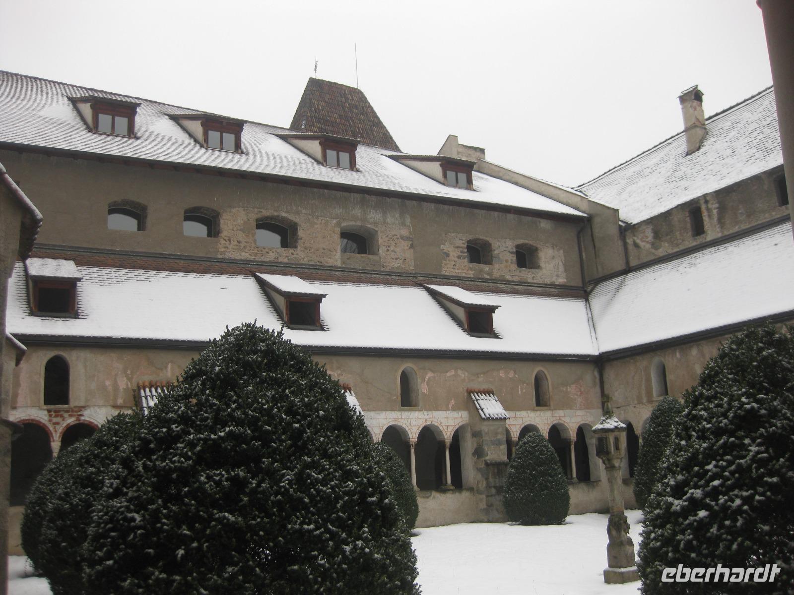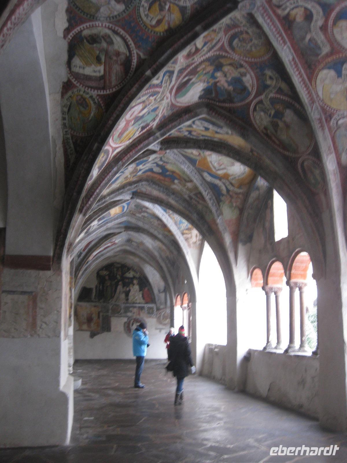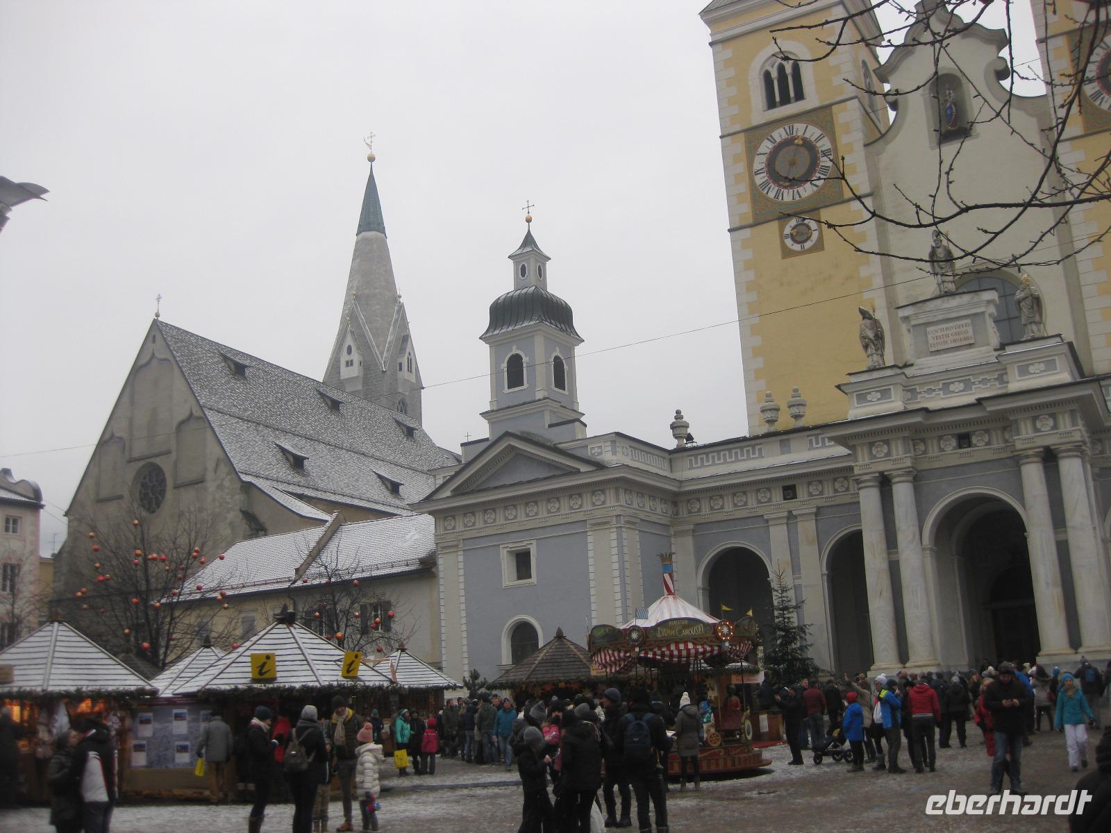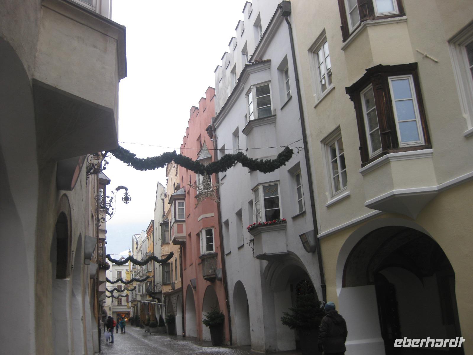 Brixen war über viele Jahrhunderte Bischofssitz und kirchliches Zentrum Südtirols. Unser Weg führt uns zuerst zur Hofburg, Residenz der Bischöfe. Heute ist hier das Diözesanmuseum mit vielen kirchlichen Schätzen untergebracht. Auch das Krippenmuseum befindet sich in den Räumlichkeiten der Hofburg. Wir besichtigen die Hofburg aber nur von außen. Ein Besuch der Museen wäre zu umfangreich. Gleich neben der Hofburg befindet sich die Jahrtausendsäule, die anläßlich des 1000-jährigen Jubiläums der Stadt Brixen im Jahr 1909 errichtet wurde. Dann führt uns der Rundgang auf den Domplatz. Dort ist noch der Weihnachtsmarkt bis zum 06. Januar aufgebaut und geöffnet. Der Dom Mariä Himmelfahrt ist offen, so dass wir hinein schauen können. Gleich neben dem Dom geht es durch eine Pforte in den Kreuzgang. Hier können wir das größte Denkmal alpenländischer Wandmalerei bewundern. Dann führt uns der Weg in den Hof zwischen Dom und Pfarrkirche St. Michael. Von hier aus können wir den "Weißen Turm" der Pfarrkirche bewundern. Dann spazieren wir durch die Ladenstraßen "Große Lauben" und "Kleine Lauben" und gelangen durch die Domgasse wieder auf den Domplatz. Die Ladenstraßen locken die Besucher an. Charakteristisch sind die Laubengänge mit ihren Läden und Restaurants, in denen man wunderbar einkaufen und gemütlich sitzen, essen und trinken kann. Wieder auf dem Domplatz angekommen kann nun jeder selbst noch über den Weihnachtsmarkt bummeln und sich von den angebotenen Speisen und Getränken verführen lassen oder ein Mitbringsel für Daheim auswählen. Dann geht es zurück in's Hotel.