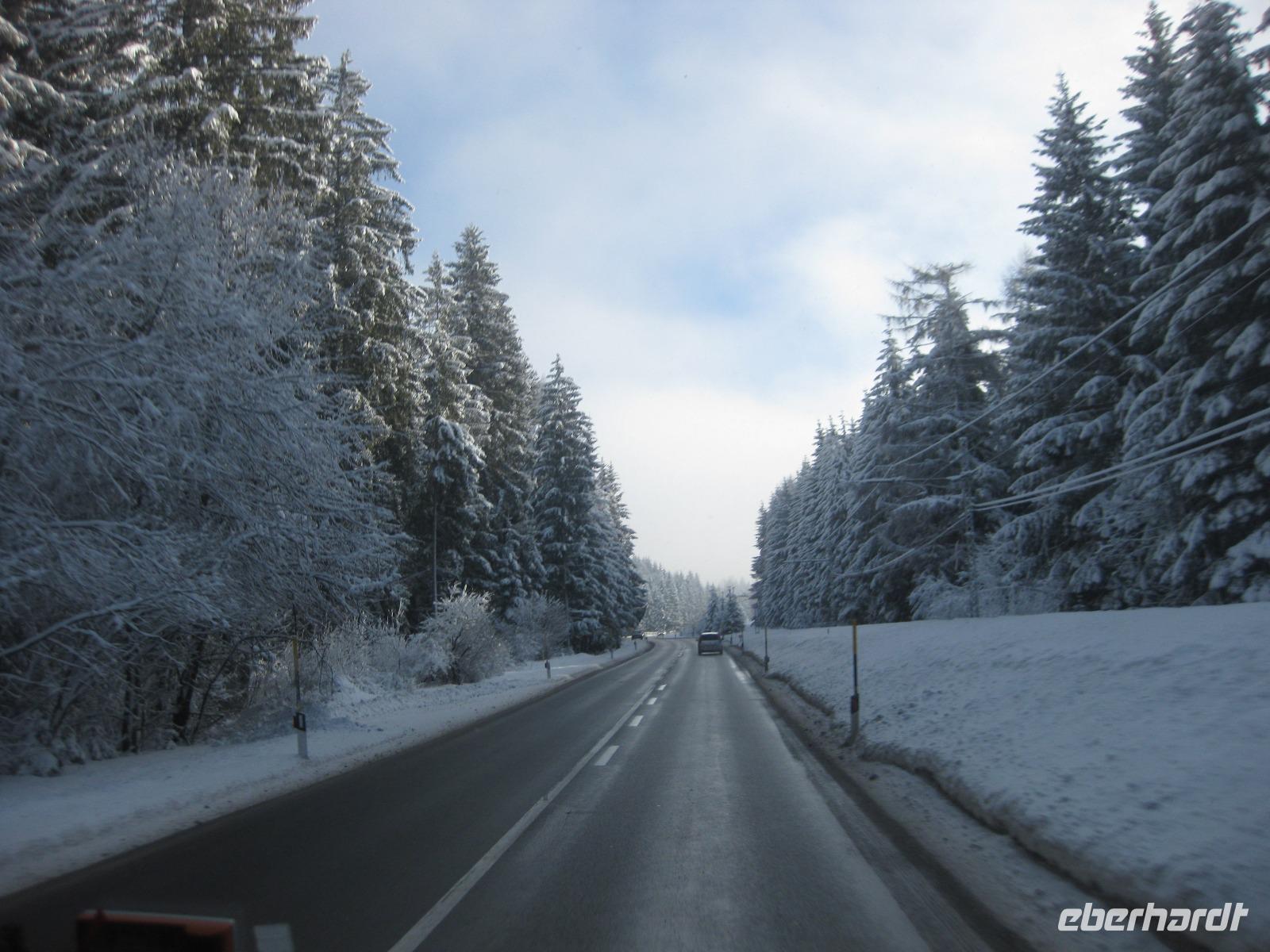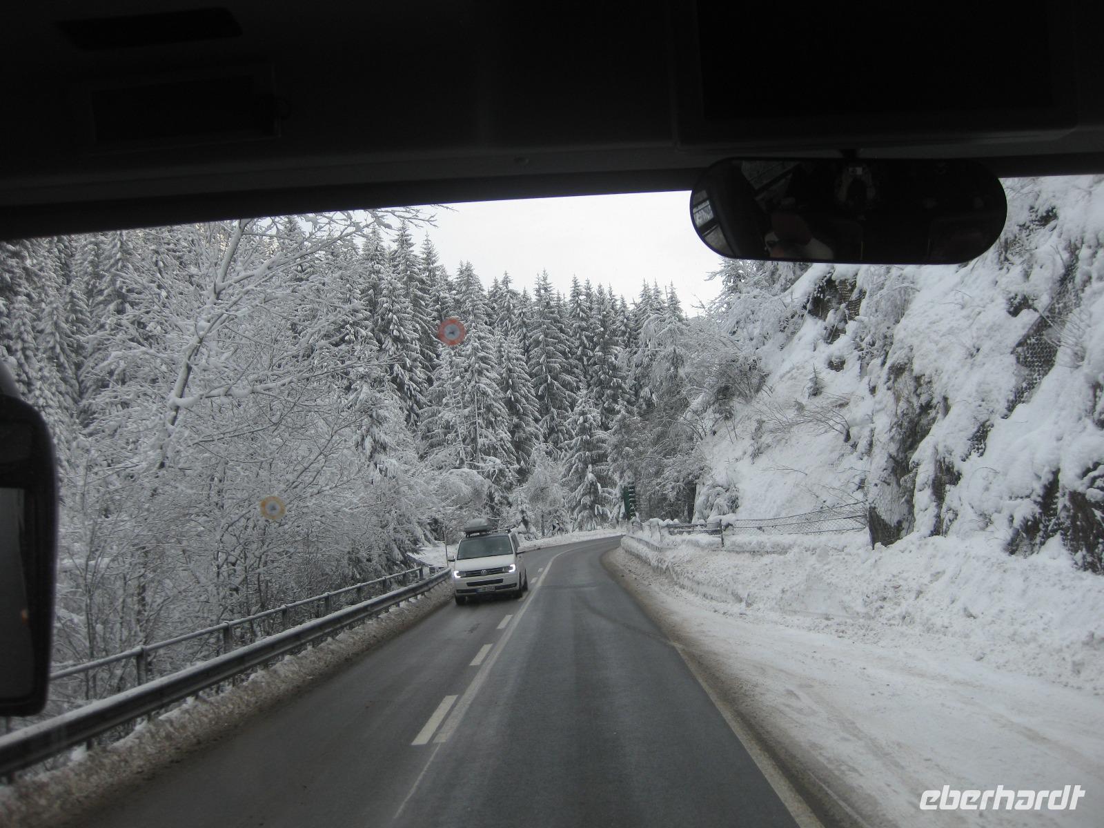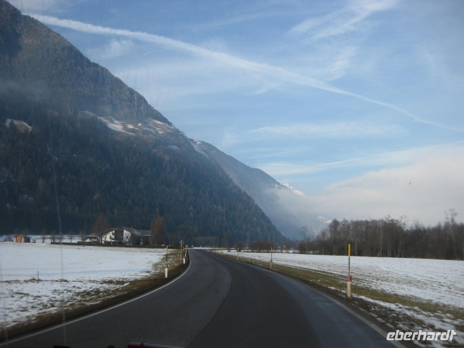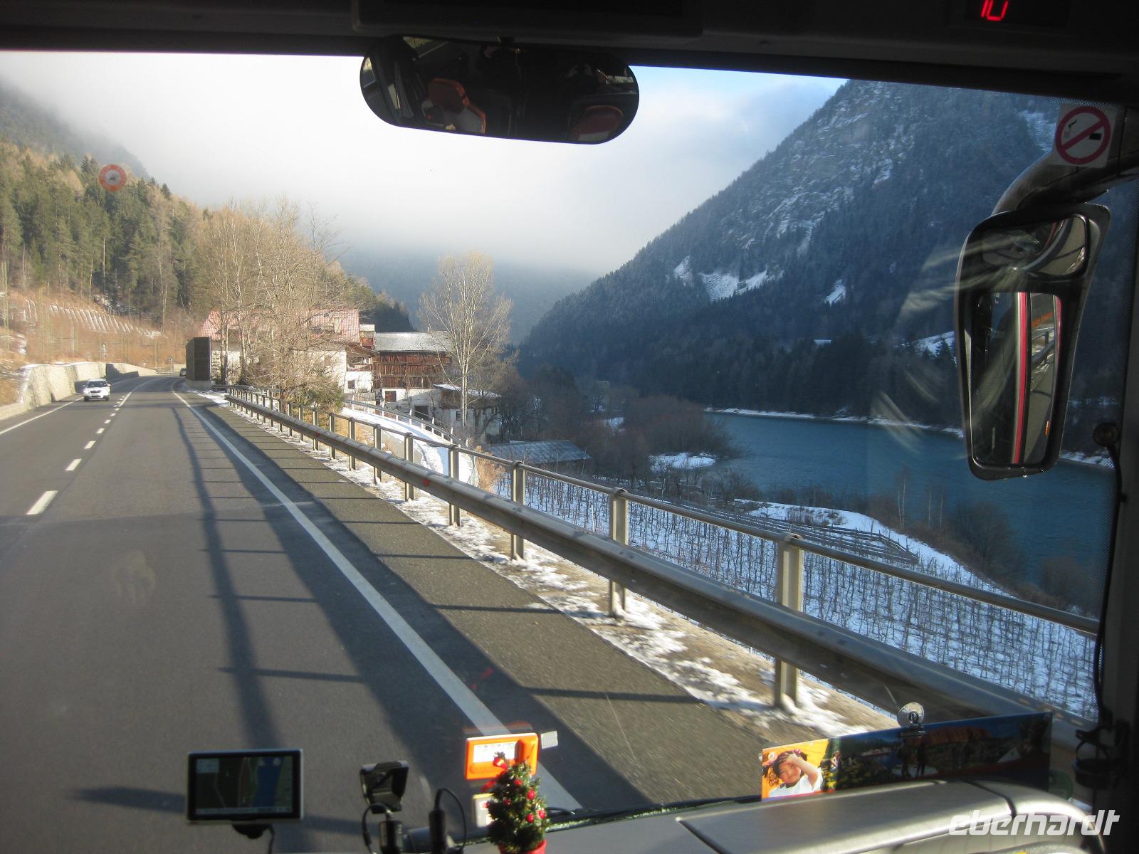 Deshalb starten wir heute morgen in Dresden, leider bei Regen. Frank von der Firma Reichelt holt uns mit dem Bus am Flughafen Dresden ab. Wir fahren auf der Autobahn in Richtung Süden. Unterwegs steigen noch Gäste zu. In Zwickau übergibt Frank das Lenkrad an Ingo, der uns ab jetzt während der ganzen Reise chauffieren wird. In Hof verlassen wir die A 72 und fahren auf die A 9. Wir passieren Bayreuth und Nürnberg. In Ingolstadt steigen die letzten Gäste zu. Weiter geht es vorbei an München und dann fahren wir auf der Inntal-Autobahn durch Österreich. Die Berge grüßen uns schon, aber meist verstecken sie sich in den Wolken. Unterwegs schneit es auch mal. Bei Innsbruck fahren wir auf die Brenner-Autobahn, passieren die Grenze zwischen Österreich und Italien und sind schon in Südtirol.