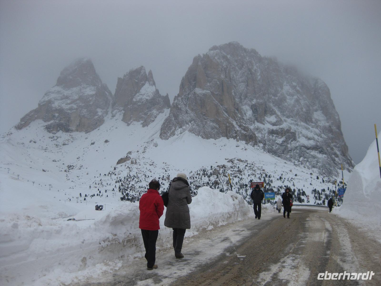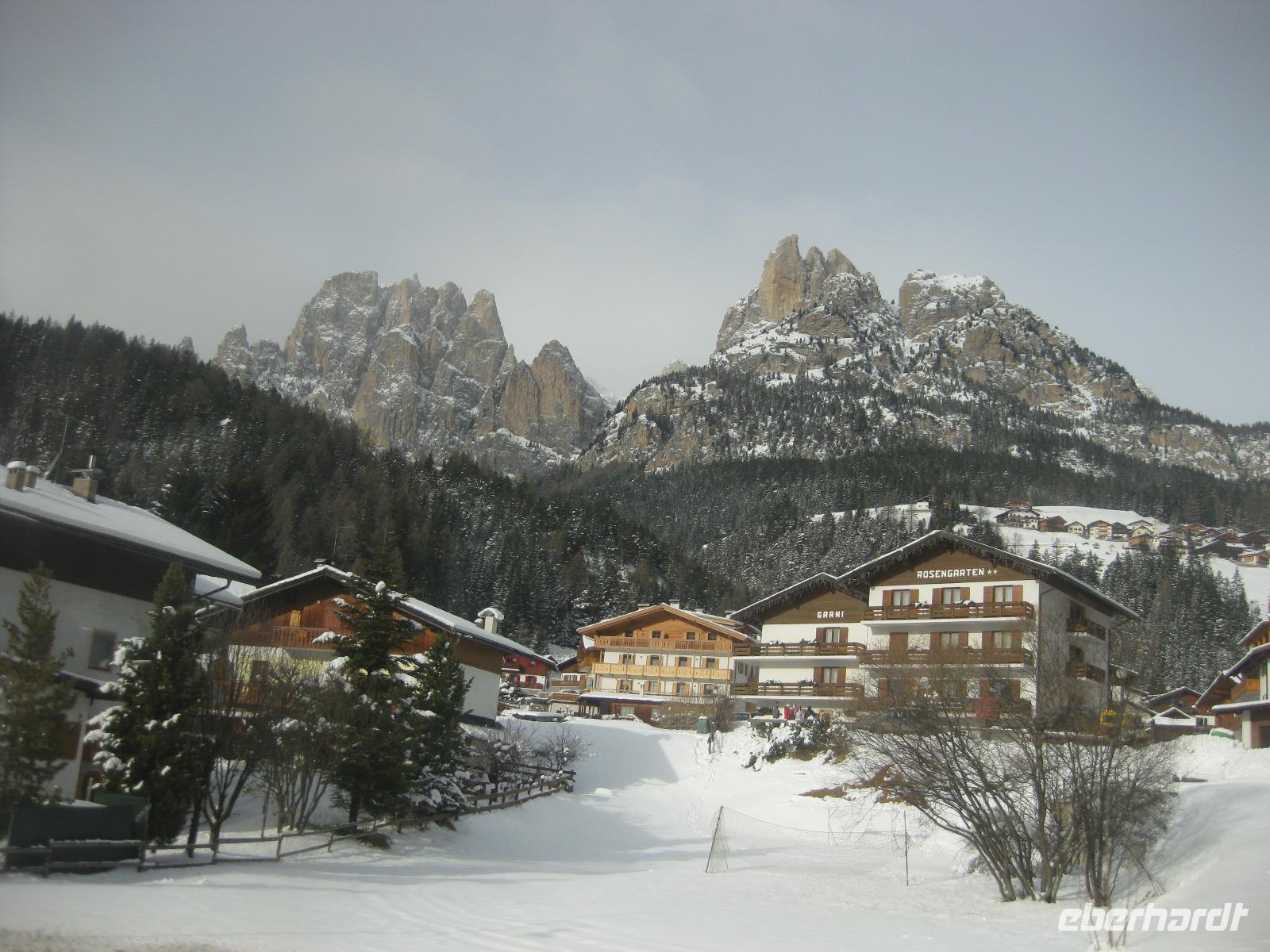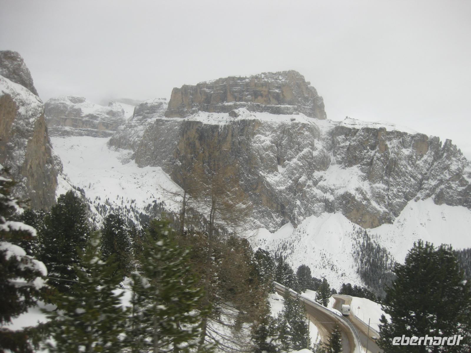 Wir fahren nach Sterzing, dort auf die Autobahn in Richtung Süden / Bozen. An der Abfahrt Bozen-Nord verlassen wir die Autobahn und fahren in das Eggental. Wir fahren jetzt auf der Großen Dolomitenstraße. Es wird winterlicher. Die Landschaft sieht märchenhaft aus - alles ist mit Schnee bedeckt. Wir fahren durch Welschnofen bis zum Karersee. Dort machen wir einen Stopp. Im Winter ist der See nicht so attraktiv, weil er zugefroren und mit Schnee bedeckt ist. Im Sommer spiegelt sich der Latemar-Bergstock im Wasser des Karersees. Wir können die Schönheit ahnen! Weiter geht die Fahrt über den Karerpass bis hinunter in's Fassatal und damit haben wir Südtirol verlassen und sind jetzt im Trentino. Unterwegs grüßen uns immer wieder die Felsen des Rosengarten. Siegfried erzählt uns die Sage vom Zwergenkönig Laurin, die sich um den Rosengarten rangt. Wir fahren durch das Fassatal mit den Orten Vigo di Fassa, Campitello di Fassa und schließlich Canazei, dem Hauptort des Fassatals. Hier verlassen wir die Große Dolomitenstraße und fahren hinauf zum Sellajoch. Wir haben Glück, die Straße über das Sellajoch ist offen. In 2.240 Meter Höhe auf dem Sellajoch machen wir einen kurzen Stopp. Hier oben spüren wir kurz das raue Klima der Berge. Wir befinden uns genau zwischen Langkofel und Sellastock. Weiter geht es hinunter ins Grödnertal und wir sind wieder in Südtirol. Im Grödner Tal sind die drei Orte Wolkenstein, St. Christina und St. Ulrich. In St. Christina besuchen wir die größte handgeschnitzte Krippe der Welt. Zum Abschluss unserer Dolomitenrundfahrt erwartet uns noch eine "Jause" im Unterfinser Hof bei Klausen. Wir werden mit hausgemachtem Tiroler Speck, Kaminwurzn und Käse, leckerem frischem Brot und natürlich auch Wein verwöhnt, alles sehr lecker. Am Nachmittag geht es auf der Autobahn wieder zurück in's Hotel. Wir bedanken uns bei Siegfried für den schönen Tag. Er hat uns auf der Rrundfahrt viel von seiner Heimat gezeigt und erzählt.